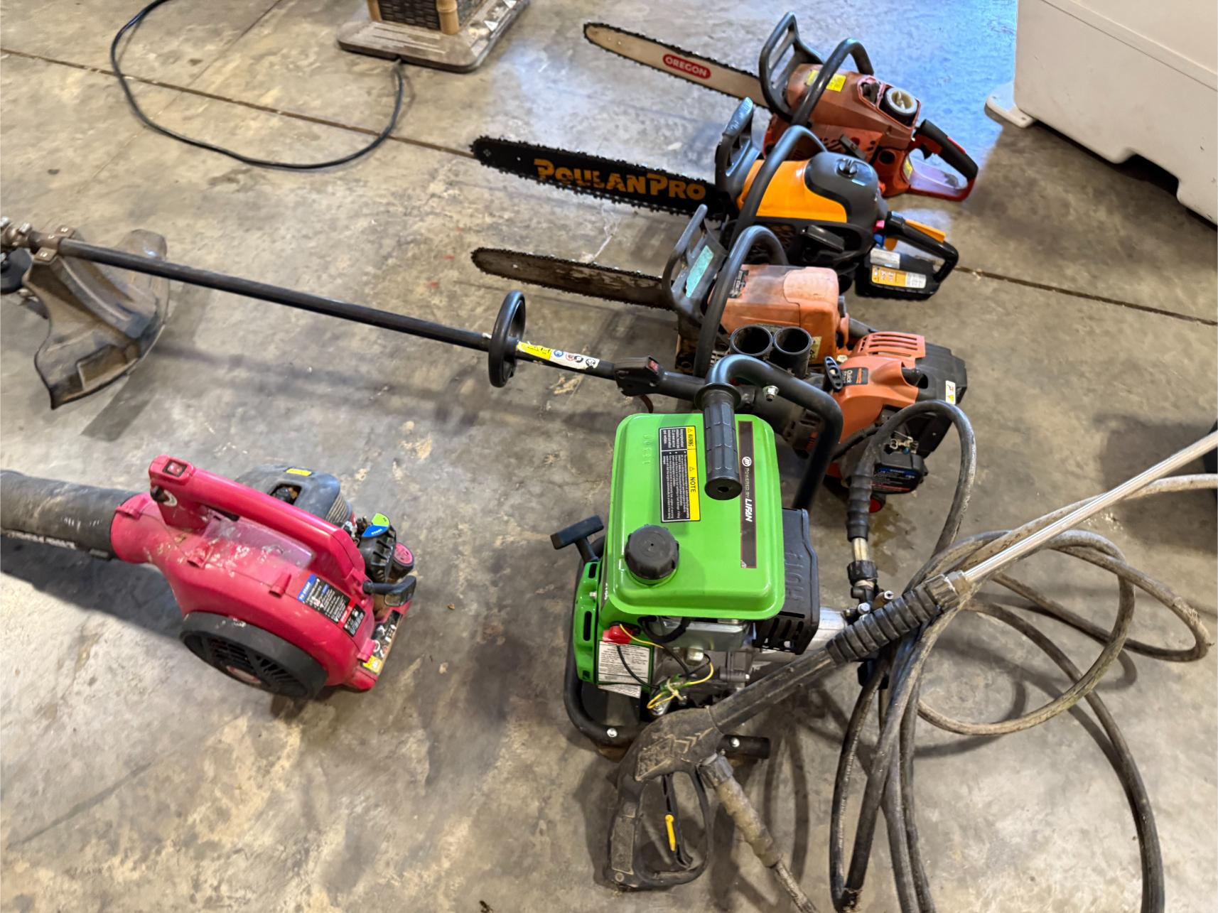 Shop Items: Wells RCP 7300 Drop-in Refrigerator – Coleman Vertex 7500-Watt Generator – Champion 3500-Watt Generator – Chain Saws (Poulan Pro, etc) – Weed Eater – Blower – Lifan Power Washer – Roll Around Cart – Yard Trailer – Spray Tanks – Tennant 1510 Floor Extractor – Dewalt Generator – Hand Tools – Coleman Lanterns – Heaters – Ladders – (6) Dumpsters
