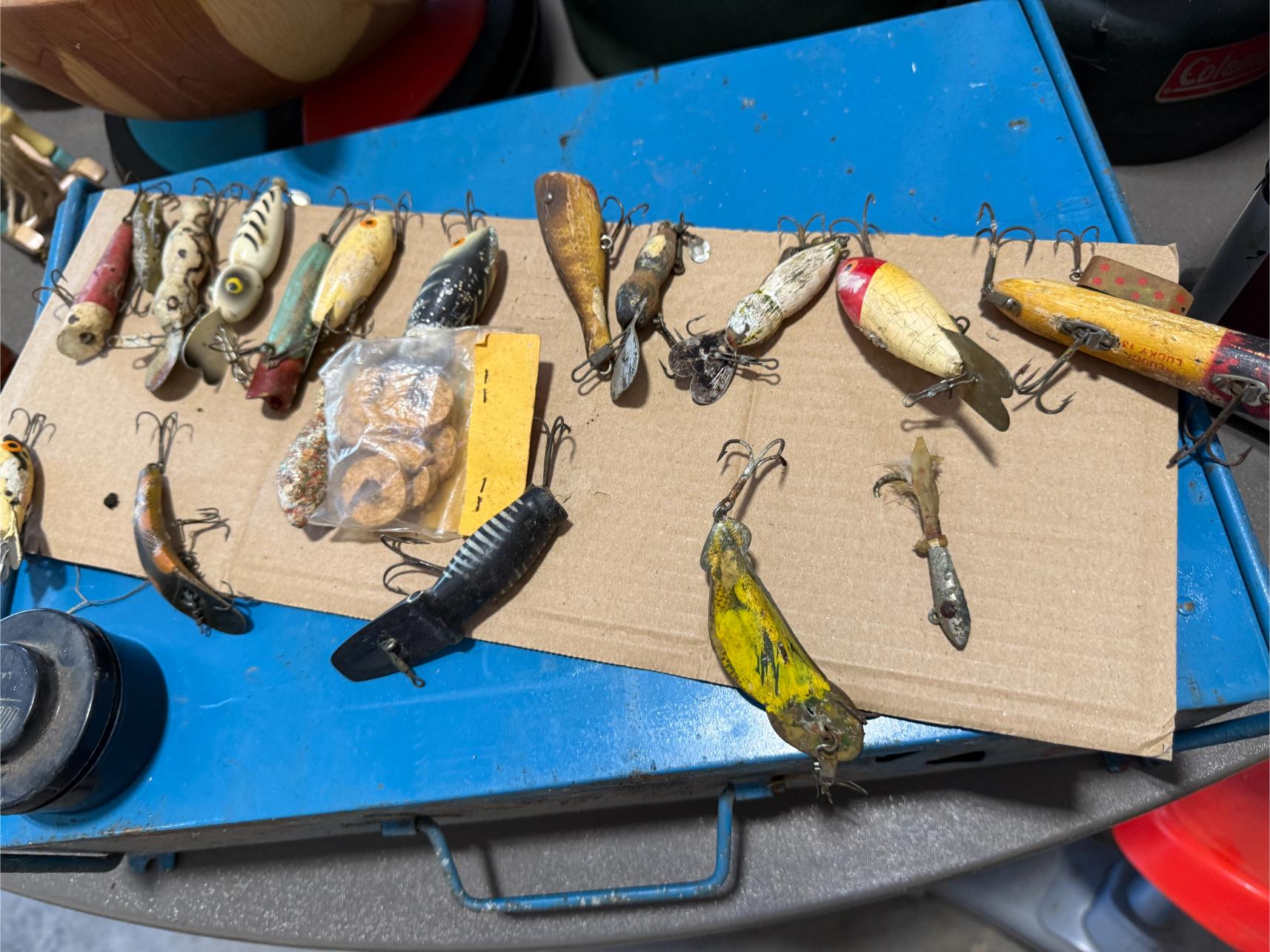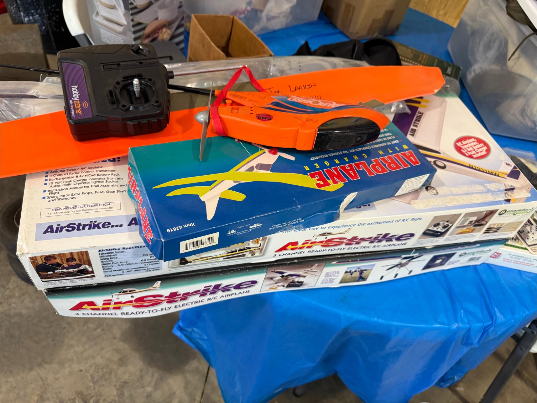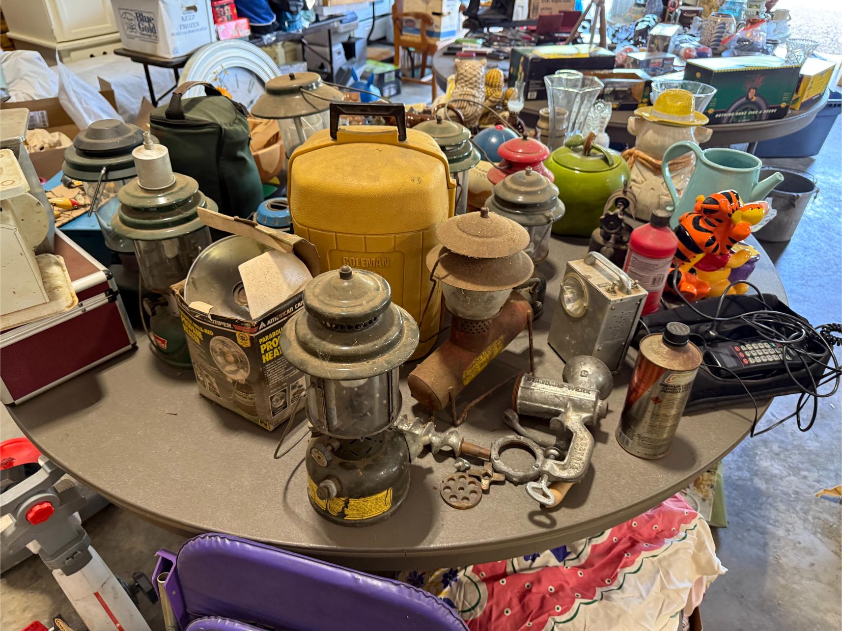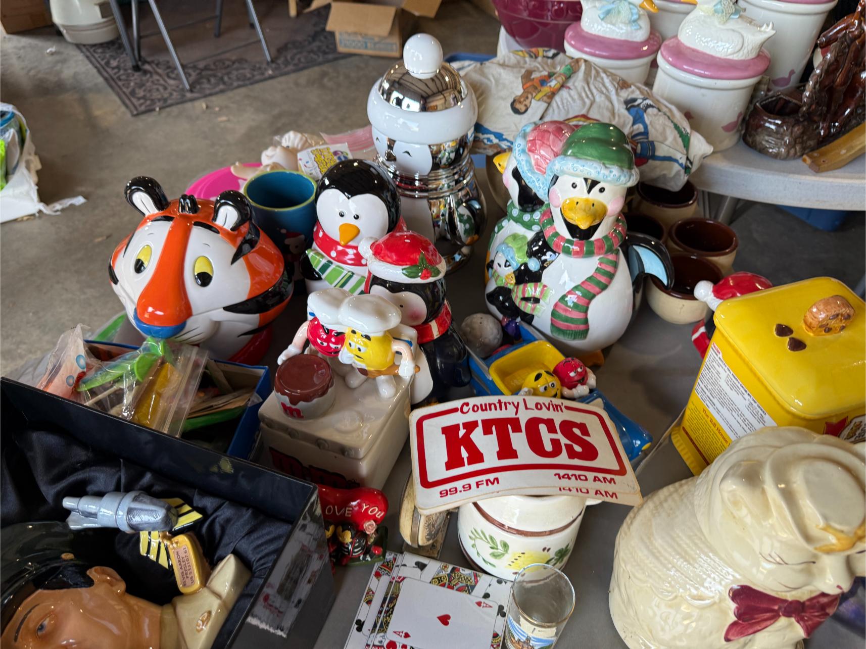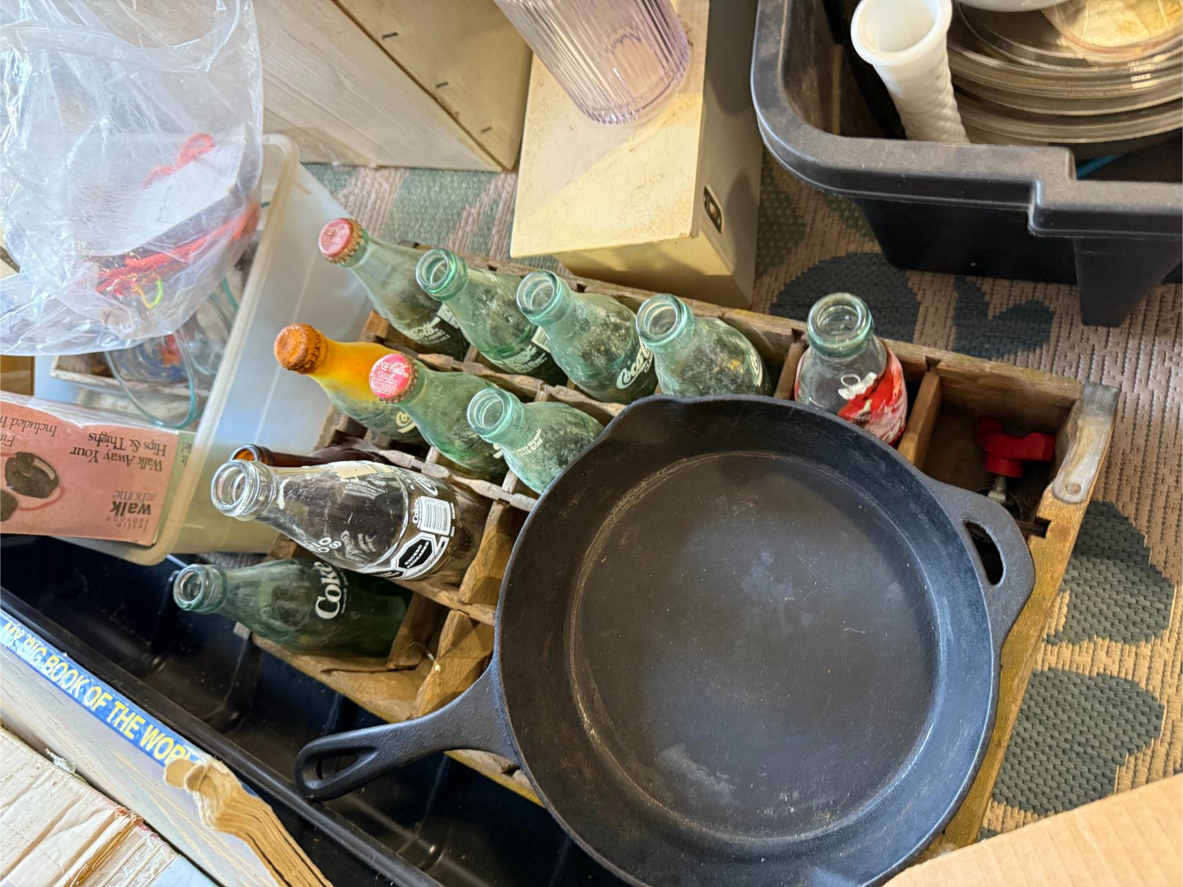 Collectibles & Household: Trumpet – Cookie Jars – Die Cast Cars – Kay-ee Sew Master Toy Sewing Machine – Air Strike RC Planes – Pyrex Mixing Bowls – Misc Glassware – Mantle Clock – Smoke Stands – John Deere Collectibles – M&M Collectibles – Old Fishing Lures – Zippo Lighters – Iron Skillet – Pocket Watches – Jewelry – Silverplated Flatware – Iron Wheels – Small Appliances – Corningware – Toys – Misc Electronics