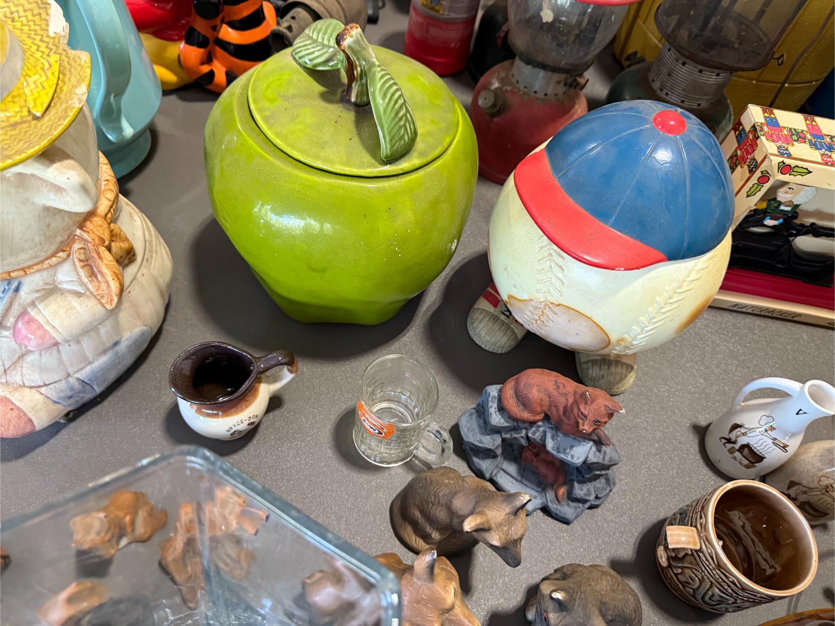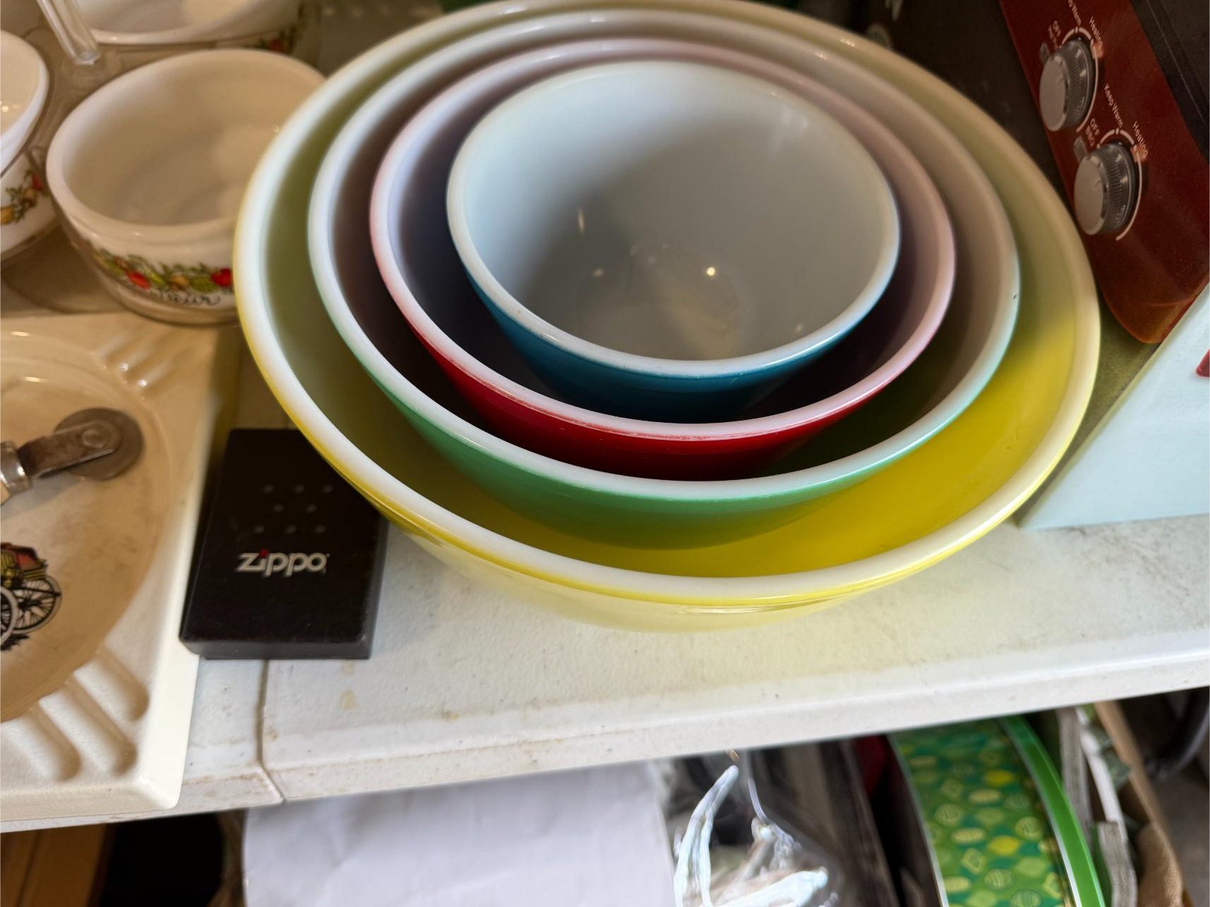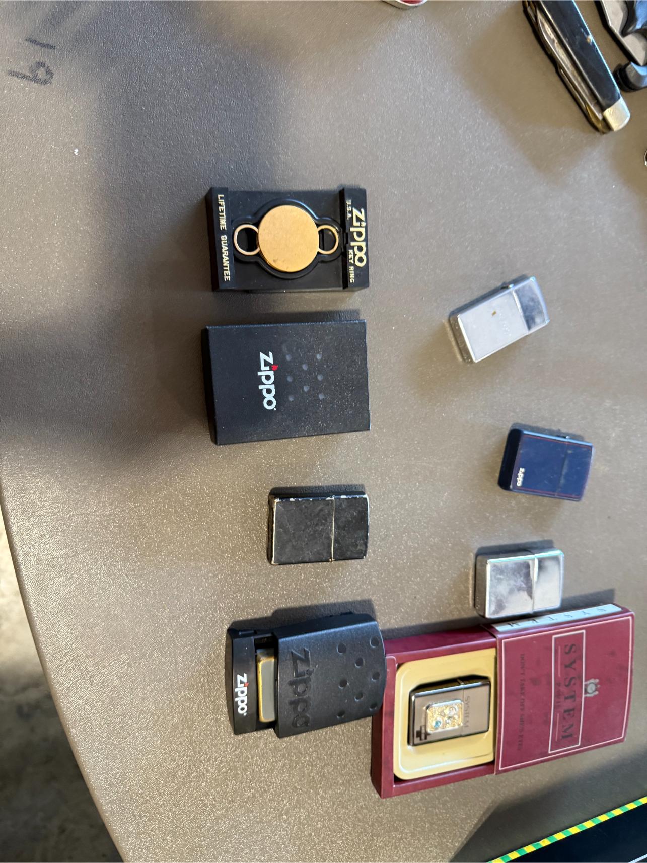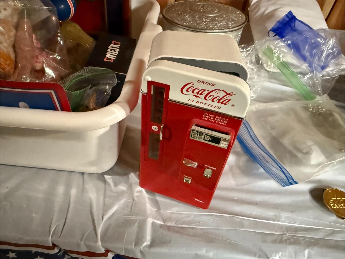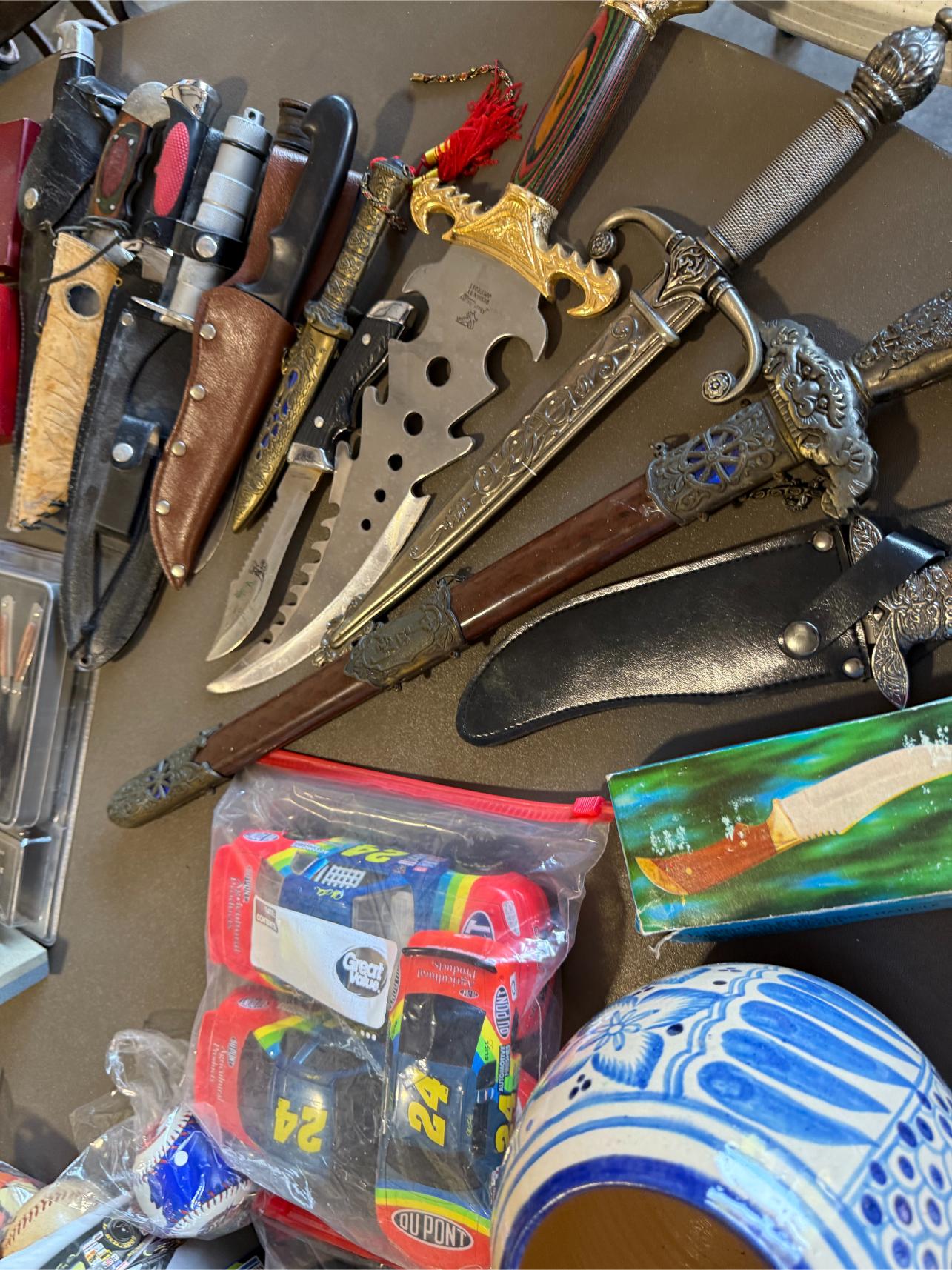 Collectibles & Household: Trumpet – Cookie Jars – Die Cast Cars – Kay-ee Sew Master Toy Sewing Machine – Air Strike RC Planes – Pyrex Mixing Bowls – Misc Glassware – Mantle Clock – Smoke Stands – John Deere Collectibles – M&M Collectibles – Old Fishing Lures – Zippo Lighters – Iron Skillet – Pocket Watches – Jewelry – Silverplated Flatware – Iron Wheels – Small Appliances – Corningware – Toys – Misc Electronics