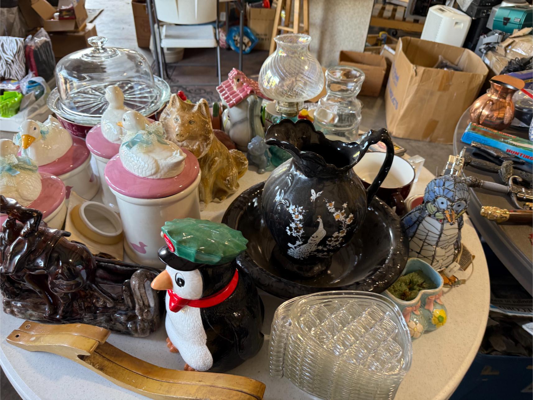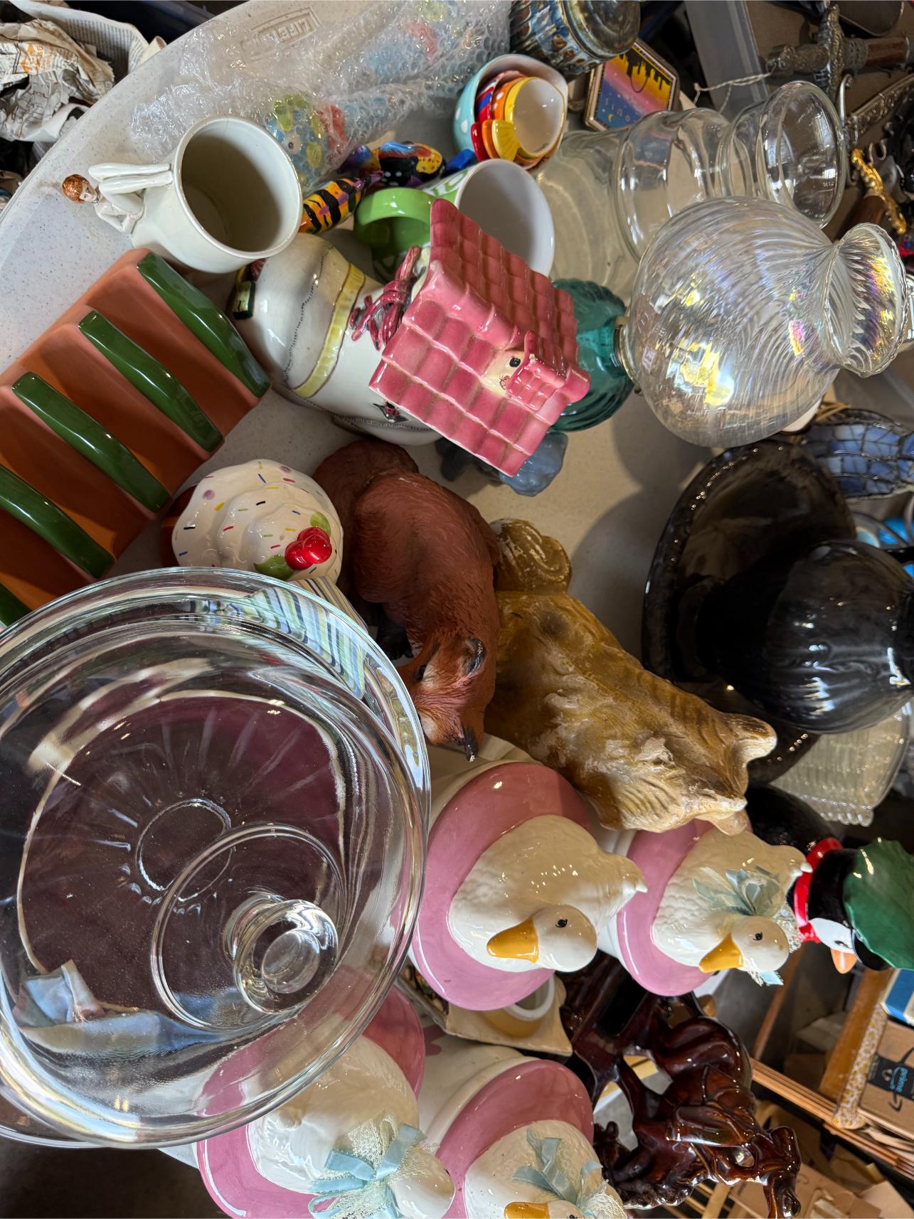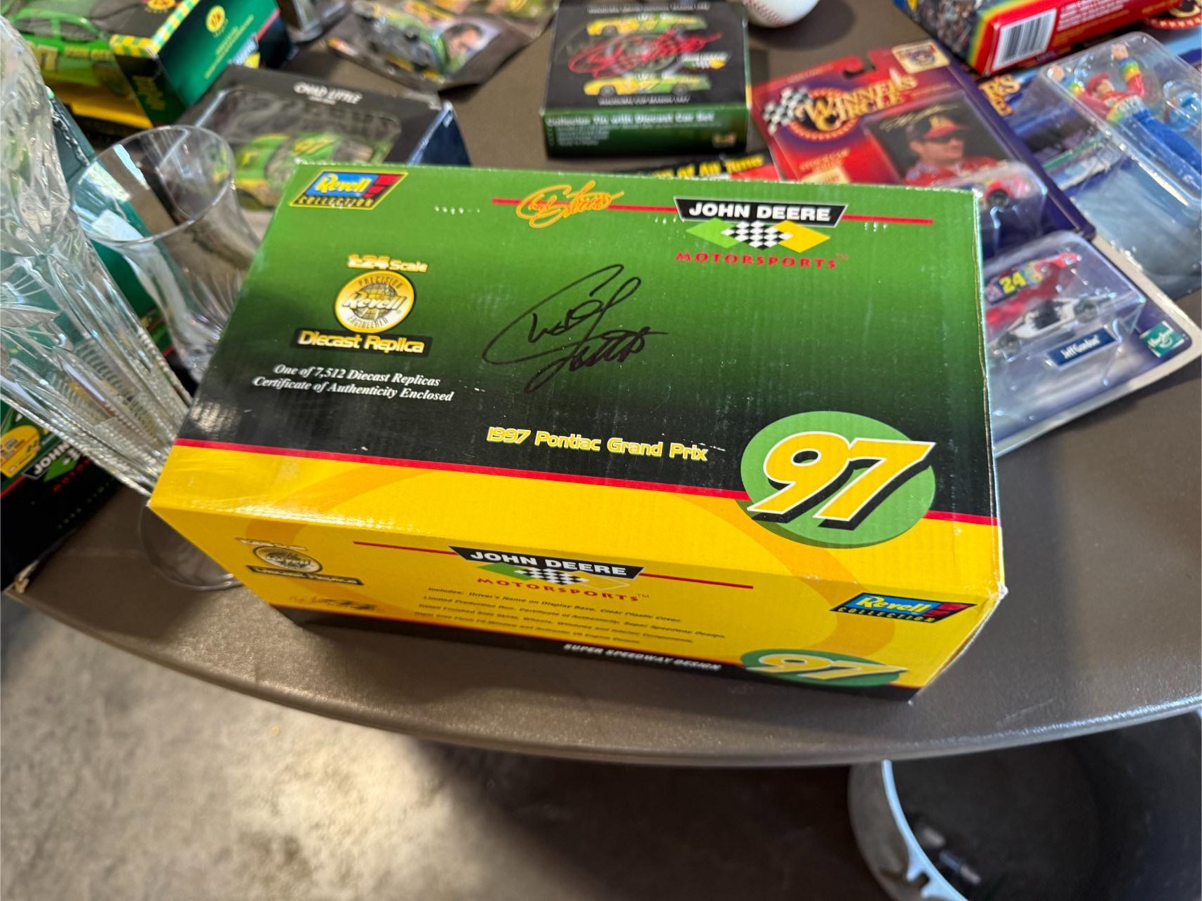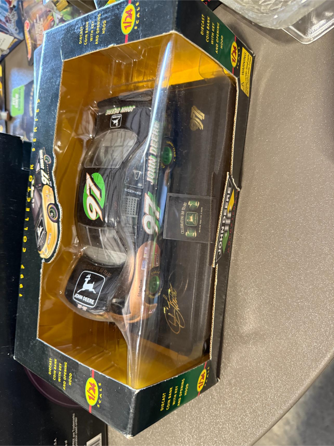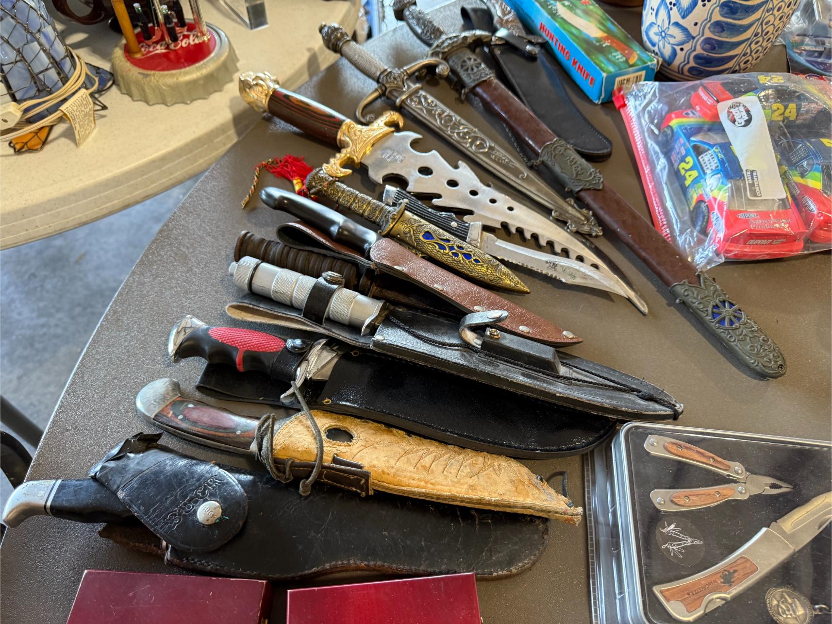 Collectibles & Household: Trumpet – Cookie Jars – Die Cast Cars – Kay-ee Sew Master Toy Sewing Machine – Air Strike RC Planes – Pyrex Mixing Bowls – Misc Glassware – Mantle Clock – Smoke Stands – John Deere Collectibles – M&M Collectibles – Old Fishing Lures – Zippo Lighters – Iron Skillet – Pocket Watches – Jewelry – Silverplated Flatware – Iron Wheels – Small Appliances – Corningware – Toys – Misc Electronics
