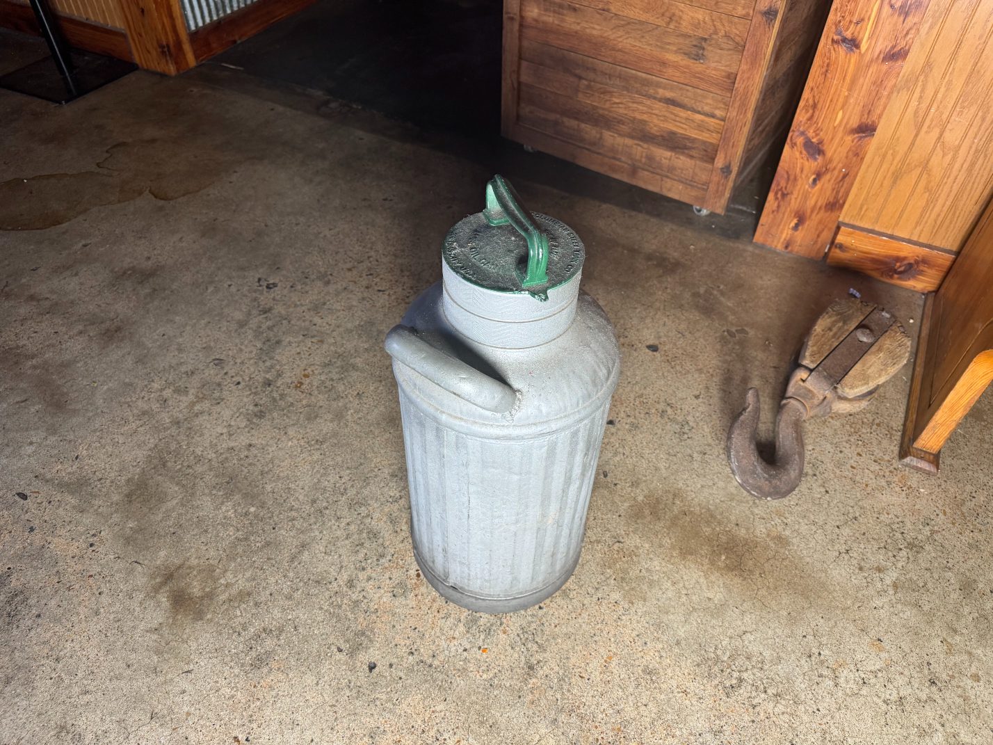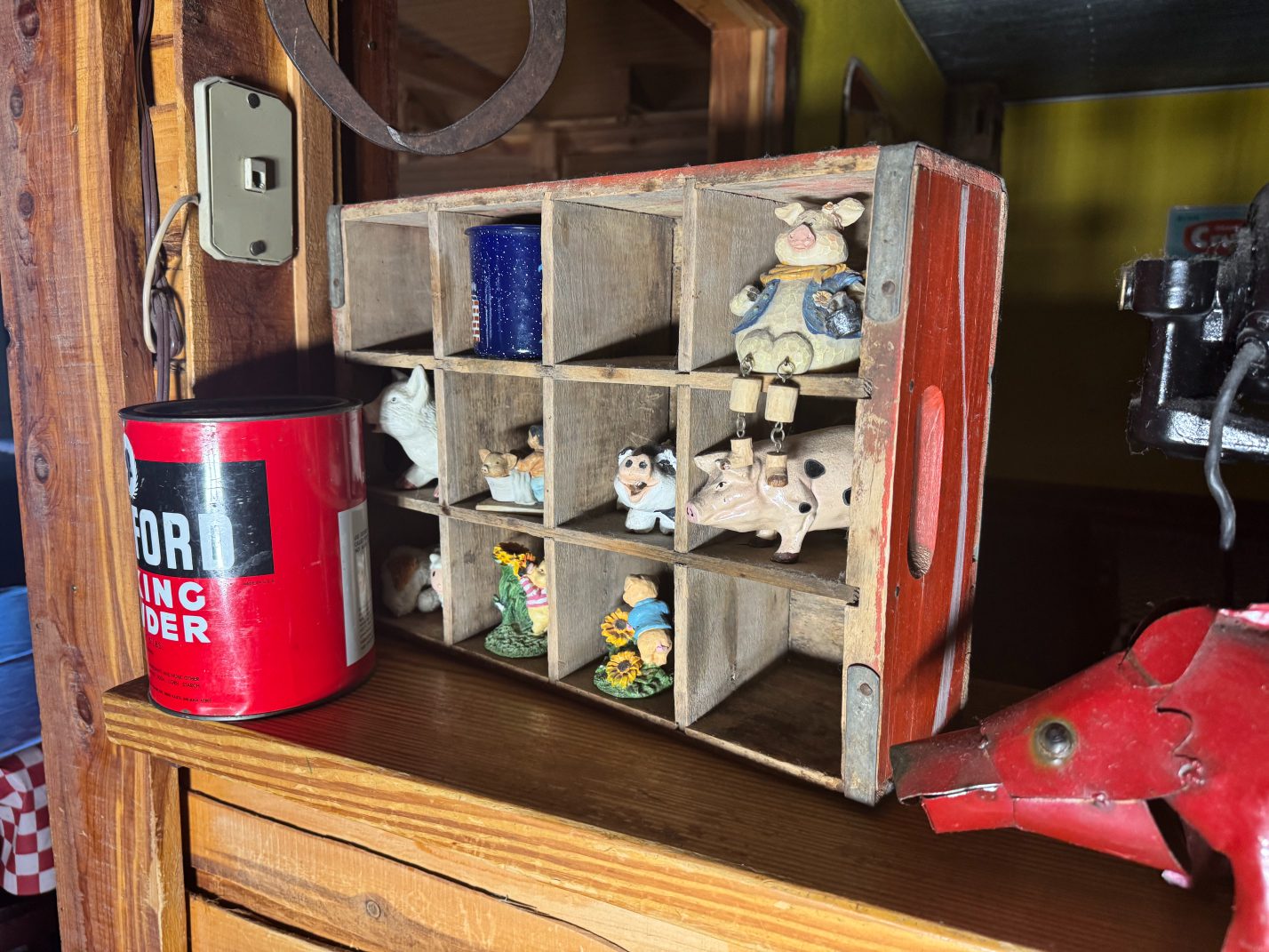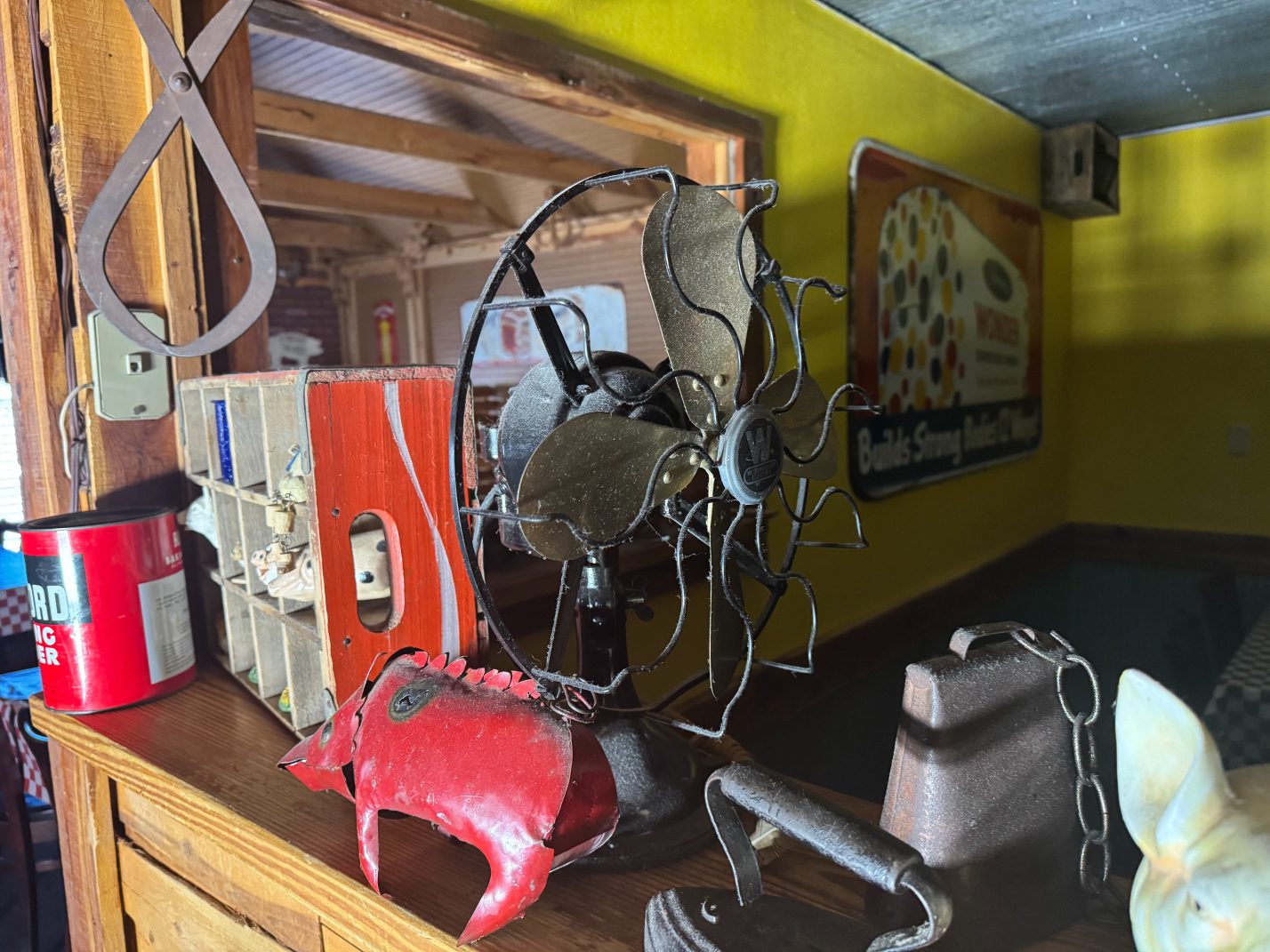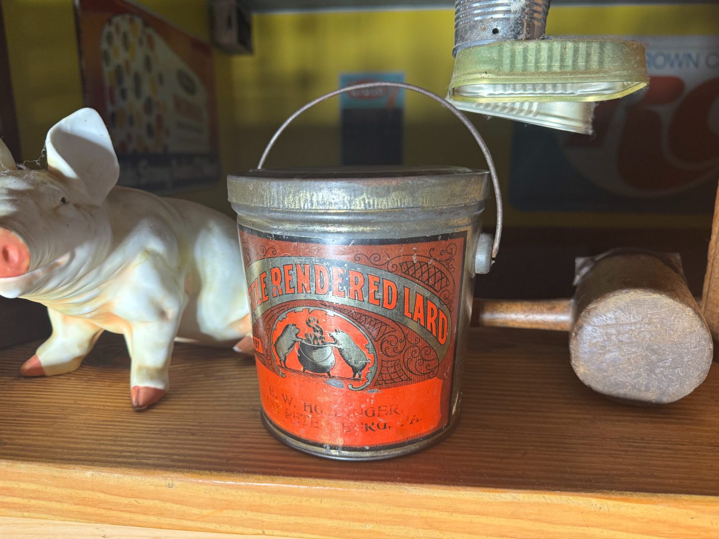 Antiques & Collectibles: 3′ Tall Metal Pig Statue – Jackalope – Dickson Egg Crate – (2) Hires Wood Crates – Campbell’s Beans Wood Crate – RC Cola Wood Crate – Metal Coke Carrier & Bottles – Lard, Potato Chip & Coffee Tins – Ice Tongs – RR Lantern – Lanterns – Fans – Meat Cleaver – Oil Can – Nail Keg – Whiskey Barrel – 8′ & 9′ Wood Church Pews – Typewriter