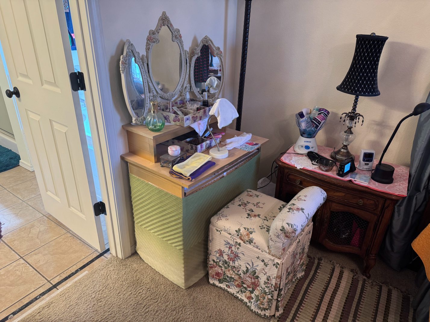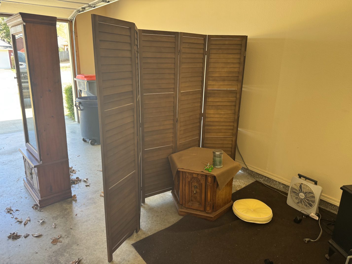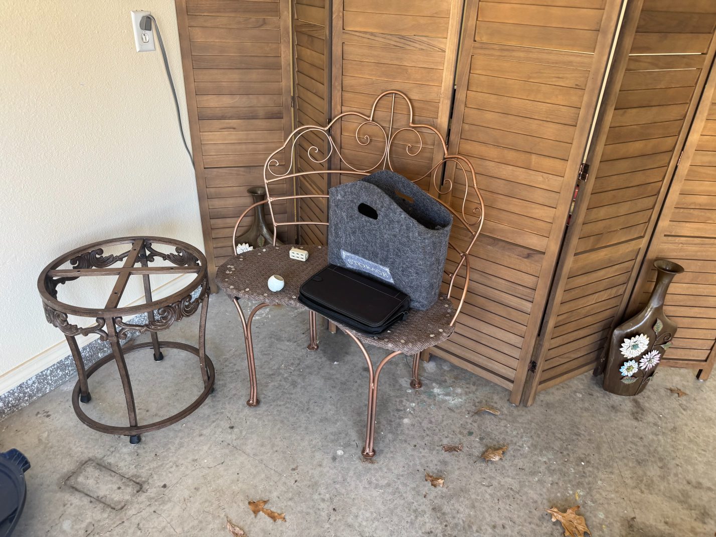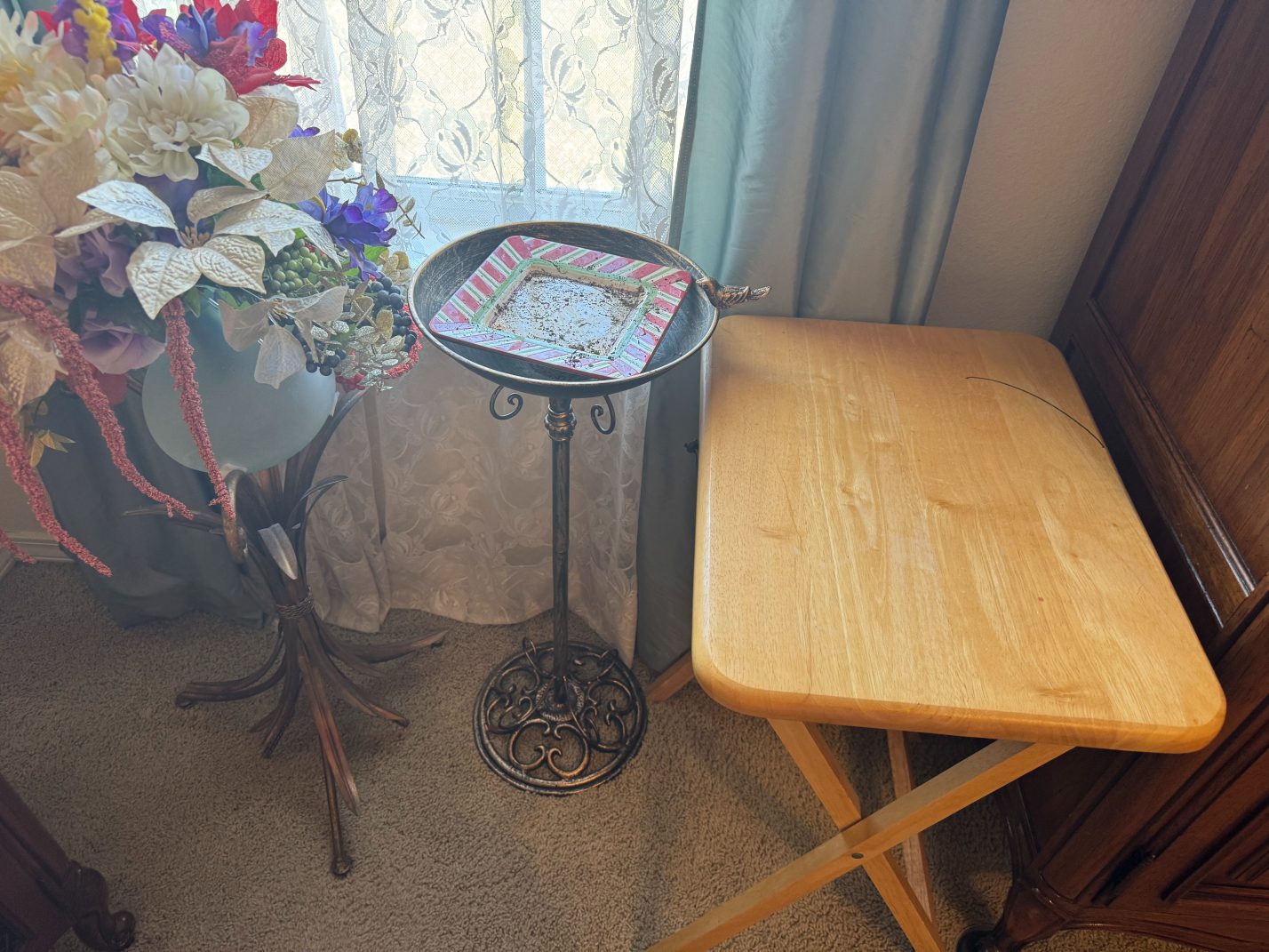 Furniture: Couch – Round Coffee Table – Wooden Folding Chairs – Foot Stool – Recliner Sofa – Ornate Round Mirrored Table – Console Table – Mobile Rolling Laptop Desk – Wurlitzer Piano – Vintage Dresser – Metal Bed – Vintage Sally Eckman Roberts Butterfly Stool – Storage Bench – Oak Nightstand – Office Chair – 6-Drawer Cart Rolling Cabinet – Folding Table – Thomasville Oak Nightstand – Queen Bed – 2-Drawer Filing Cabinet – Patchwork Upholster – Round Table With Cloth – Rolling Kitchen Cart – Kitchen Cabinet – Dining Chair – Bookshelf – Bamboo Tray Table – Folding Bamboo Side Table – Bamboo Bar Stool – Patio Chairs And Table – Iron Corner Shelf – Plant Stand – Hanging Swing – Ladies Clothing Armoire – Wooden Bed – Bench Ottoman – Drawer Dresser – Wooden Arched Mirror – Jewelry Box – Standing Jewelry Chest – Dresser Vanity – Slipper Chair – Vintage End Table – Bird Feeder – Filing Cabinet – Shoe & Bag Display Stand – Gun Cabinet – Wooden Room Divider – Garden Chair – Cast Iron Plant Stand – Hexagon End Table