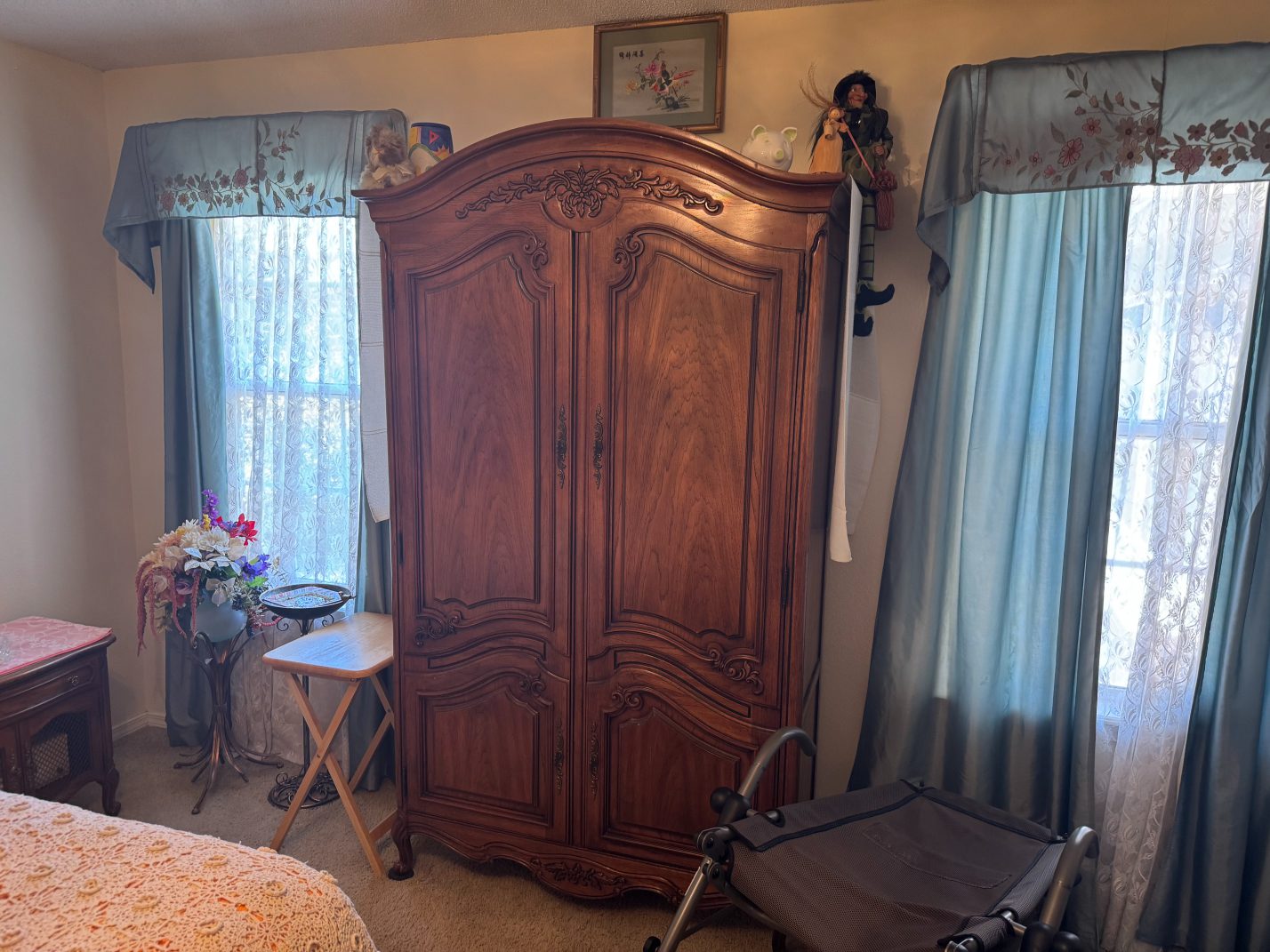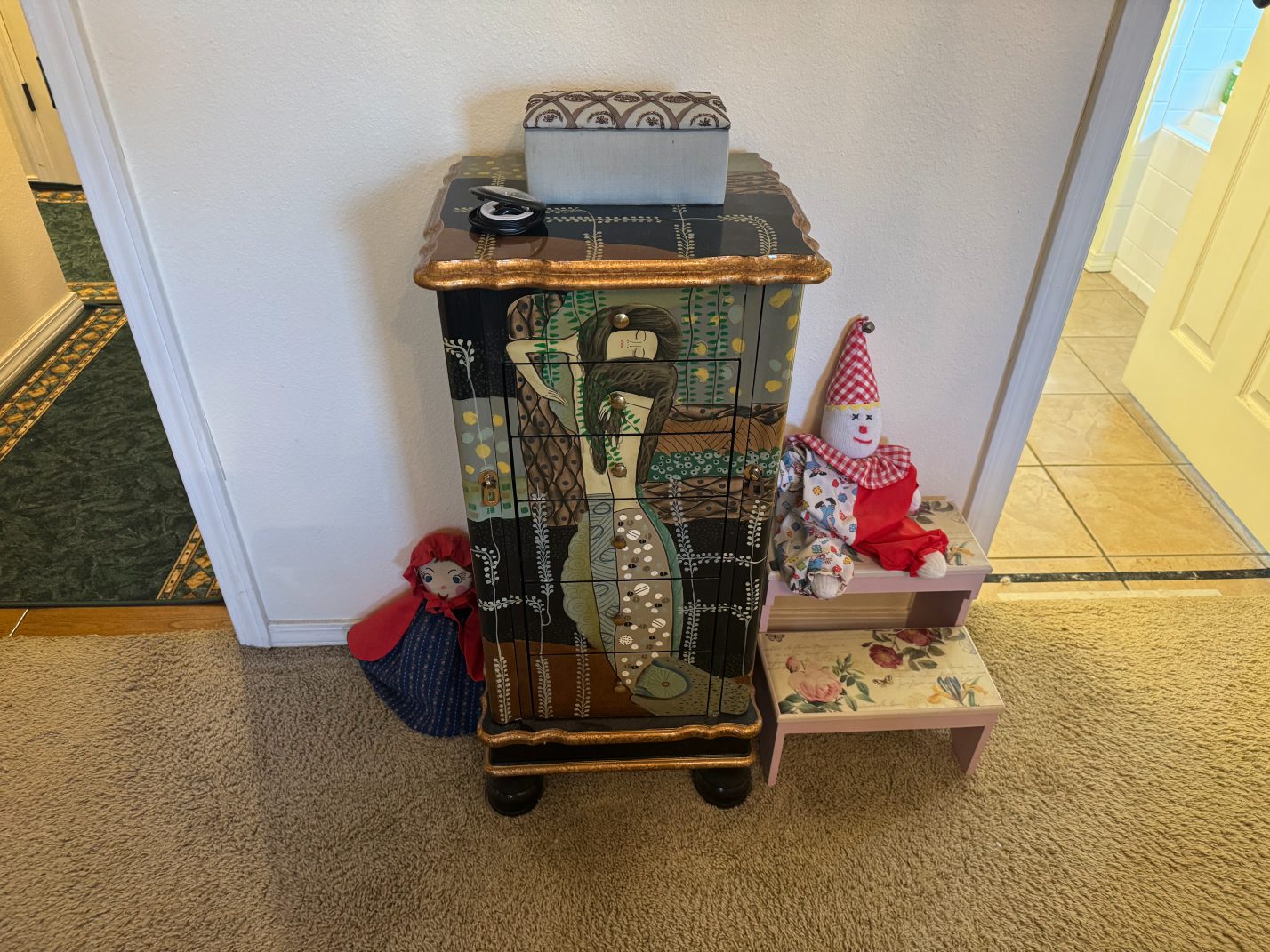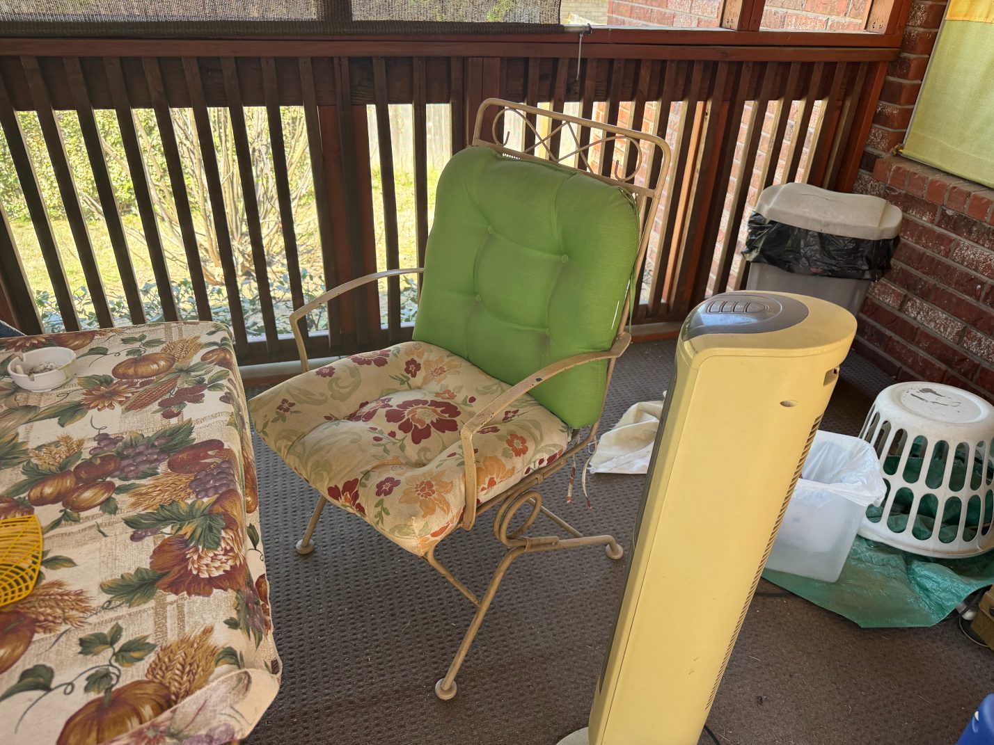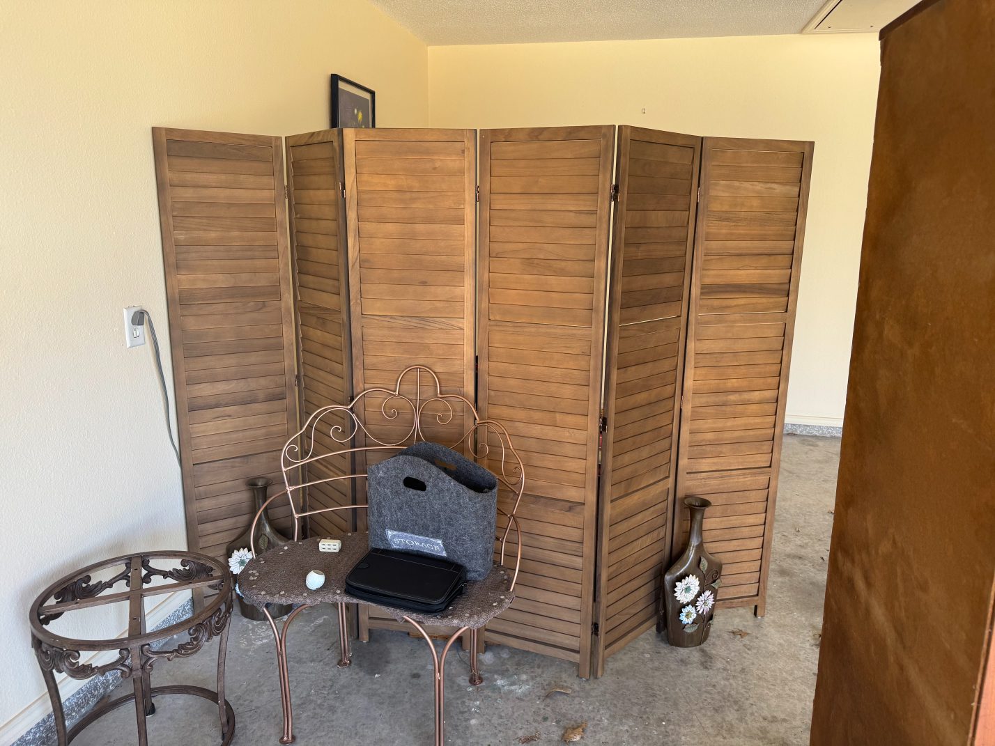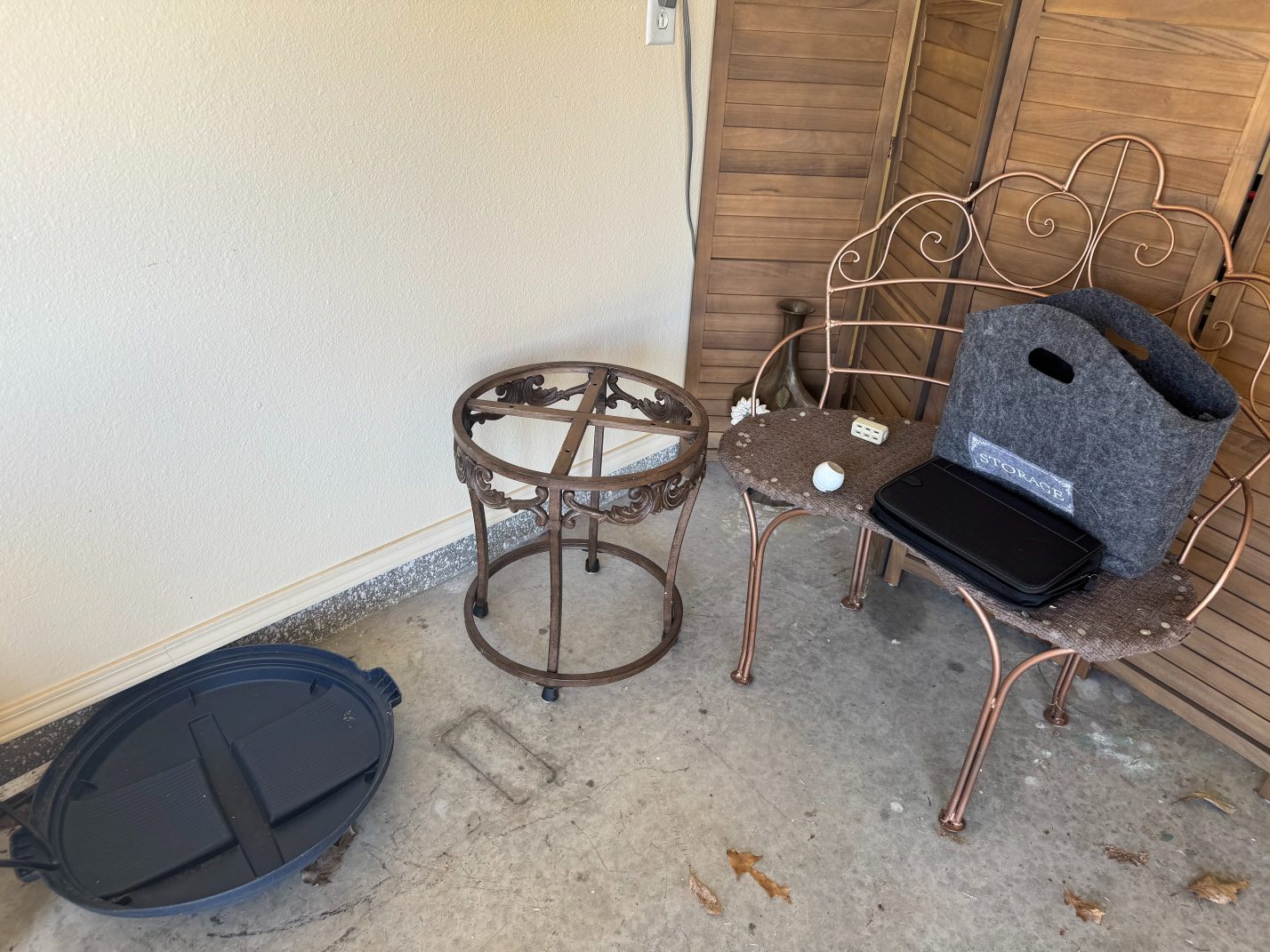 Furniture: Couch – Round Coffee Table – Wooden Folding Chairs – Foot Stool – Recliner Sofa – Ornate Round Mirrored Table – Console Table – Mobile Rolling Laptop Desk – Wurlitzer Piano – Vintage Dresser – Metal Bed – Vintage Sally Eckman Roberts Butterfly Stool – Storage Bench – Oak Nightstand – Office Chair – 6-Drawer Cart Rolling Cabinet – Folding Table – Thomasville Oak Nightstand – Queen Bed – 2-Drawer Filing Cabinet – Patchwork Upholster – Round Table With Cloth – Rolling Kitchen Cart – Kitchen Cabinet – Dining Chair – Bookshelf – Bamboo Tray Table – Folding Bamboo Side Table – Bamboo Bar Stool – Patio Chairs And Table – Iron Corner Shelf – Plant Stand – Hanging Swing – Ladies Clothing Armoire – Wooden Bed – Bench Ottoman – Drawer Dresser – Wooden Arched Mirror – Jewelry Box – Standing Jewelry Chest – Dresser Vanity – Slipper Chair – Vintage End Table – Bird Feeder – Filing Cabinet – Shoe & Bag Display Stand – Gun Cabinet – Wooden Room Divider – Garden Chair – Cast Iron Plant Stand – Hexagon End Table