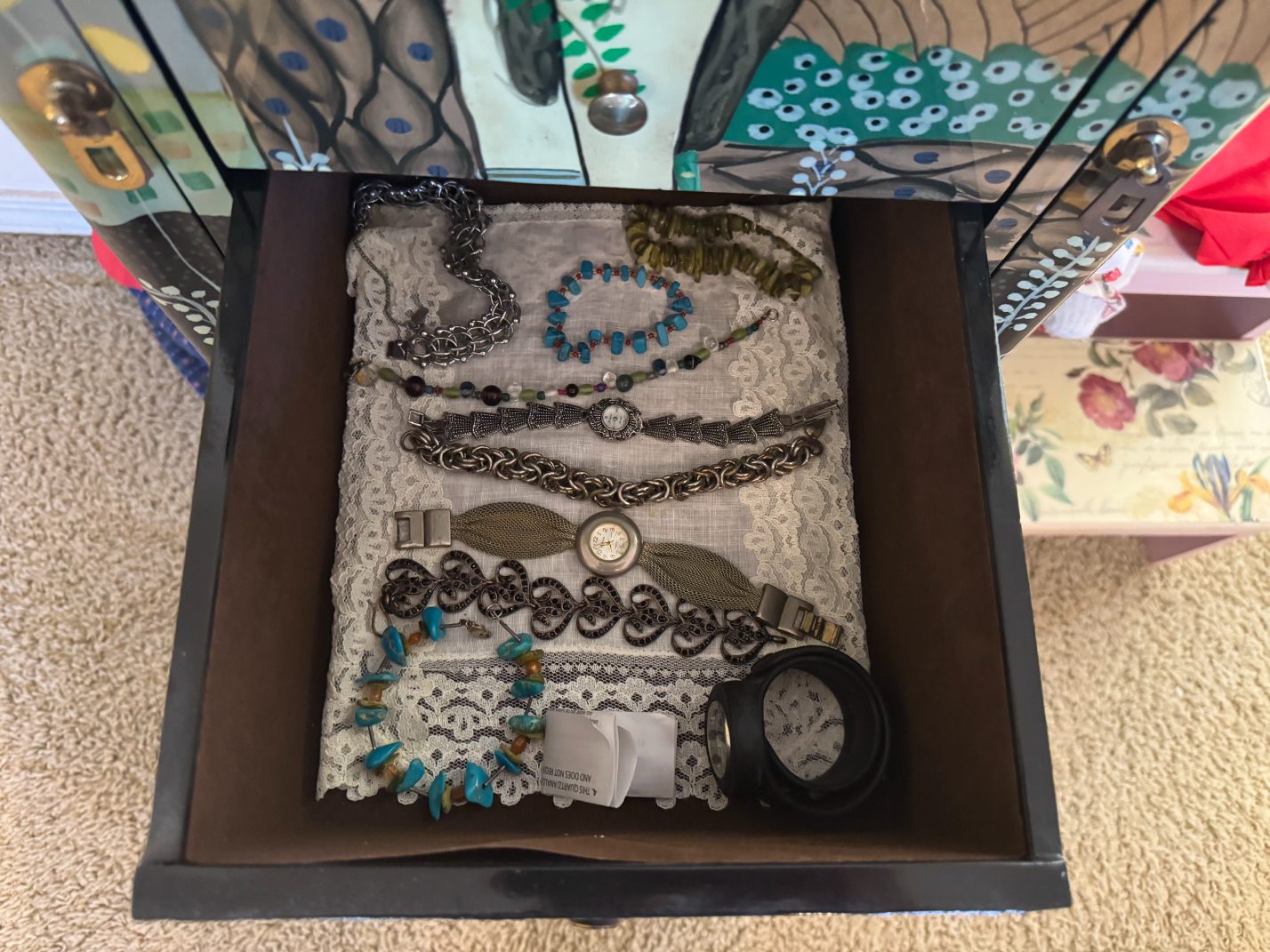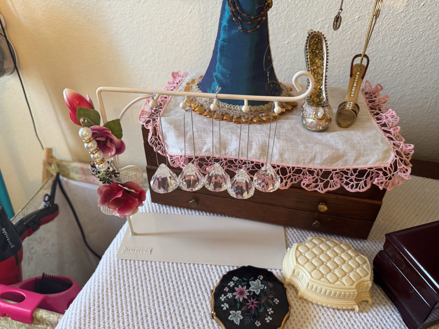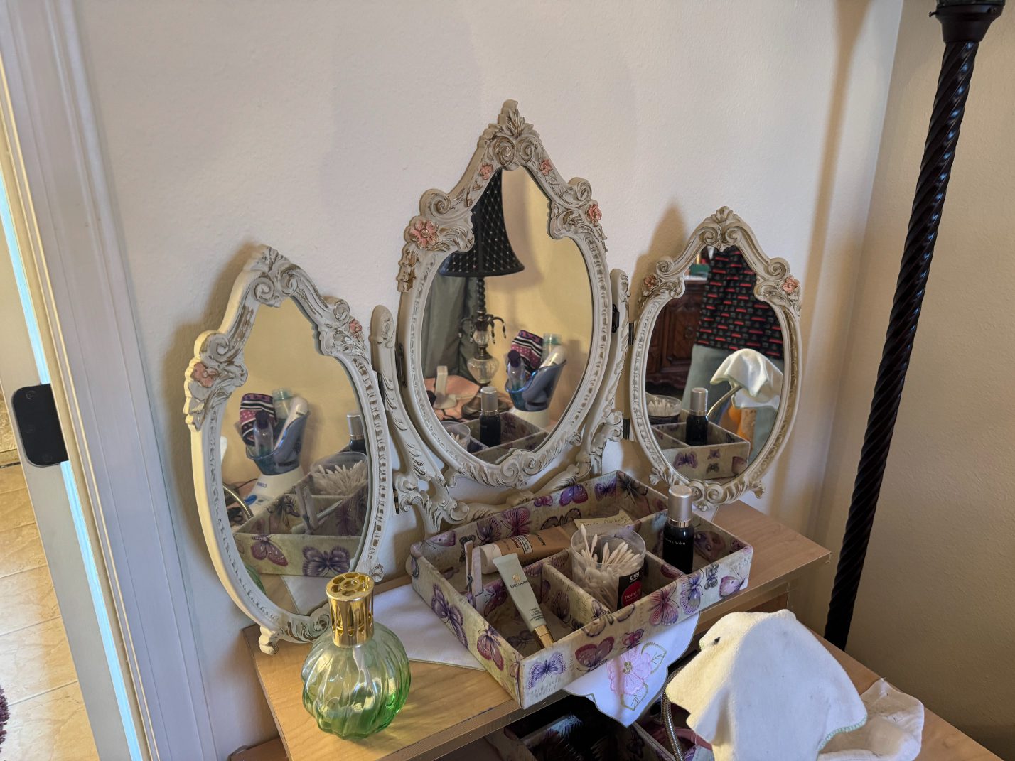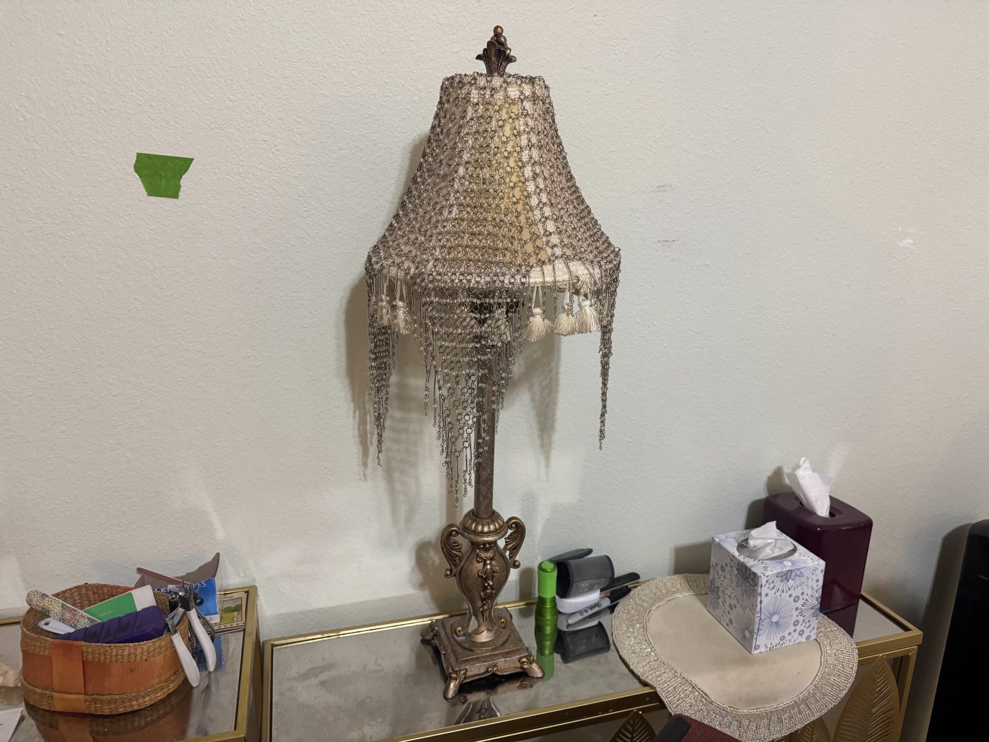 Household Items: Kenmore Washer & Dryer – Mirror – Claude Monet “Lunch In The Garden” Painting – Vintage Lamp – Framed Tapestry – Tifanny Style Floor Lamp – Wall Mirror – Peacok Feather Floral Arrangement – Candlestick – Ceramic Flower Collection – Picture Frames – Vintage Chinese Porcelain Oriental Lamp – Wall Decor – Peacock Feather Mask – Peaceful Road Painting – Capiz Shell Floor Lamp – Glass Octopus Sculpture Figurine – Gator Figurine – Puffer Fish Display – Shells Display – Fragrance Lamp – Porcelain Flower Diffuser – Candle Holder – Tropical Fish Art Print – Ceramic Clam Shell Wall Art – Santa Head Figurine – Decorative Vegetable Basket – Soda Stream Bundle – Hamilton Beach Electric Can Opener – Casserole – Felicity Plate – Glass Bowl – Glass Jar – Ceramic Canister – Ceramic Jungle Animal Mug And Plates – Ceramic Bamboo Floral Salad Plate – ‘Ode To Spring II’ Painting – Toaster Oven – Chafing Dishes Food Warmer – Glass Fruit Bowl – Blender – Automatic Rice Steamer – Sprouting Jars – Flower Vases – Measuring Glass Cup – Plates and Bowls – Tupperware – Television – Cookware – Cutlery – Mini Fridge – Metal Rose Wall Art – Stone Freestanding Corded Garden & Patio Fountains – Baby Wooden Safety Gate – Cement Crocodile Statue – Plant Painting Decor – Amber Colored Pitcher and Glasses – Wine Glasses – Vintage Anchor Hocking Wexford – Core Lounge – Vintage Perfume Bottles – Victorian Vintage Mannequin Jewelry Holder – Fenton Hand Painted Pink Ladies Hat Sculpture – Vintage Wooden Jewelry Container Box – Miss Mignon Speidel Gold Tone Expansion Bracelet Locket – Vintage Hummel Music Box – Faux Crystal Lotus Flower Trinket Box Ring Holder – China Bell – Crystal Clear Bell – Porcelain Trinket Box – Clown Doll – Chunky Gold-tone Infinity Necklace – Bangle Bracelets – Bracelet Watches – Pearl Hand Fan – Fashion Necklaces – Gold-tone Class Ring – Rooster Art Painting – Black Table Lamp – Solid Wood Folding Table Desk – Vintage Chinese Silk Hand Embroidered Picture – Stoneware Vase – Assorted Tote Bags – Clothes – Bath Towels – Crocs Skin Shoulder Bag – Jute Bag – Soulder Bags – Trash Cans – Electric Fireplace – Cordless Cyclone Vacuum Cleaner – Robot Vacuum – Fireplace Screen – Sewing Machine – Hoover Max – Vacuum –