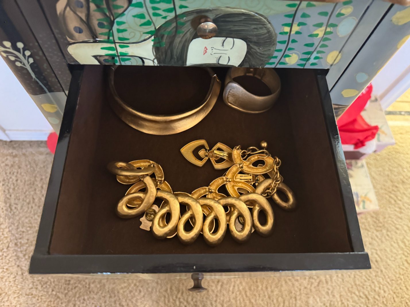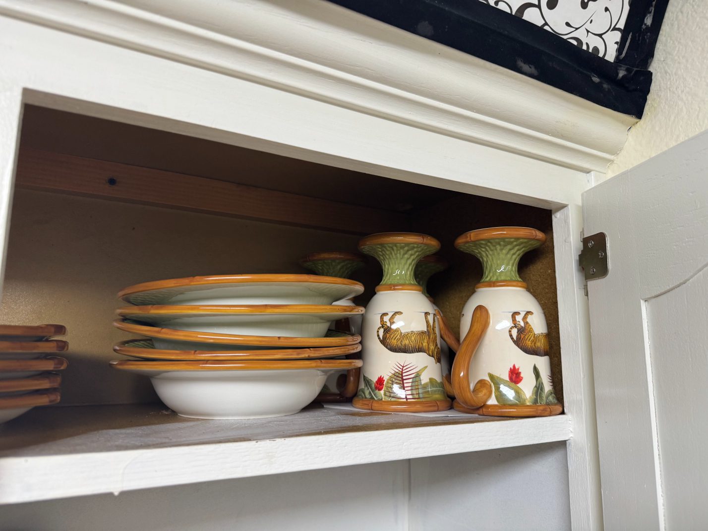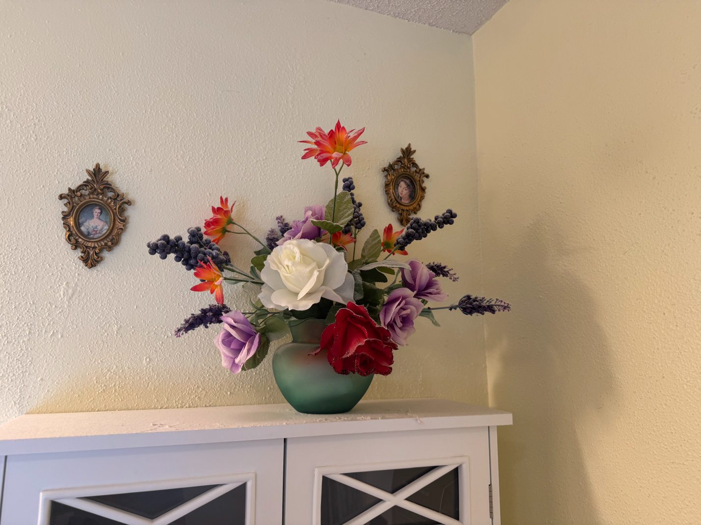 Household Items: Kenmore Washer & Dryer – Mirror – Claude Monet “Lunch In The Garden” Painting – Vintage Lamp – Framed Tapestry – Tifanny Style Floor Lamp – Wall Mirror – Peacok Feather Floral Arrangement – Candlestick – Ceramic Flower Collection – Picture Frames – Vintage Chinese Porcelain Oriental Lamp – Wall Decor – Peacock Feather Mask – Peaceful Road Painting – Capiz Shell Floor Lamp – Glass Octopus Sculpture Figurine – Gator Figurine – Puffer Fish Display – Shells Display – Fragrance Lamp – Porcelain Flower Diffuser – Candle Holder – Tropical Fish Art Print – Ceramic Clam Shell Wall Art – Santa Head Figurine – Decorative Vegetable Basket – Soda Stream Bundle – Hamilton Beach Electric Can Opener – Casserole – Felicity Plate – Glass Bowl – Glass Jar – Ceramic Canister – Ceramic Jungle Animal Mug And Plates – Ceramic Bamboo Floral Salad Plate – ‘Ode To Spring II’ Painting – Toaster Oven – Chafing Dishes Food Warmer – Glass Fruit Bowl – Blender – Automatic Rice Steamer – Sprouting Jars – Flower Vases – Measuring Glass Cup – Plates and Bowls – Tupperware – Television – Cookware – Cutlery – Mini Fridge – Metal Rose Wall Art – Stone Freestanding Corded Garden & Patio Fountains – Baby Wooden Safety Gate – Cement Crocodile Statue – Plant Painting Decor – Amber Colored Pitcher and Glasses – Wine Glasses – Vintage Anchor Hocking Wexford – Core Lounge – Vintage Perfume Bottles – Victorian Vintage Mannequin Jewelry Holder – Fenton Hand Painted Pink Ladies Hat Sculpture – Vintage Wooden Jewelry Container Box – Miss Mignon Speidel Gold Tone Expansion Bracelet Locket – Vintage Hummel Music Box – Faux Crystal Lotus Flower Trinket Box Ring Holder – China Bell – Crystal Clear Bell – Porcelain Trinket Box – Clown Doll – Chunky Gold-tone Infinity Necklace – Bangle Bracelets – Bracelet Watches – Pearl Hand Fan – Fashion Necklaces – Gold-tone Class Ring – Rooster Art Painting – Black Table Lamp – Solid Wood Folding Table Desk – Vintage Chinese Silk Hand Embroidered Picture – Stoneware Vase – Assorted Tote Bags – Clothes – Bath Towels – Crocs Skin Shoulder Bag – Jute Bag – Soulder Bags – Trash Cans – Electric Fireplace – Cordless Cyclone Vacuum Cleaner – Robot Vacuum – Fireplace Screen – Sewing Machine – Hoover Max – Vacuum –