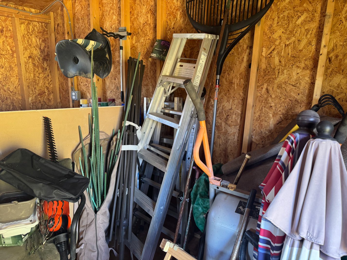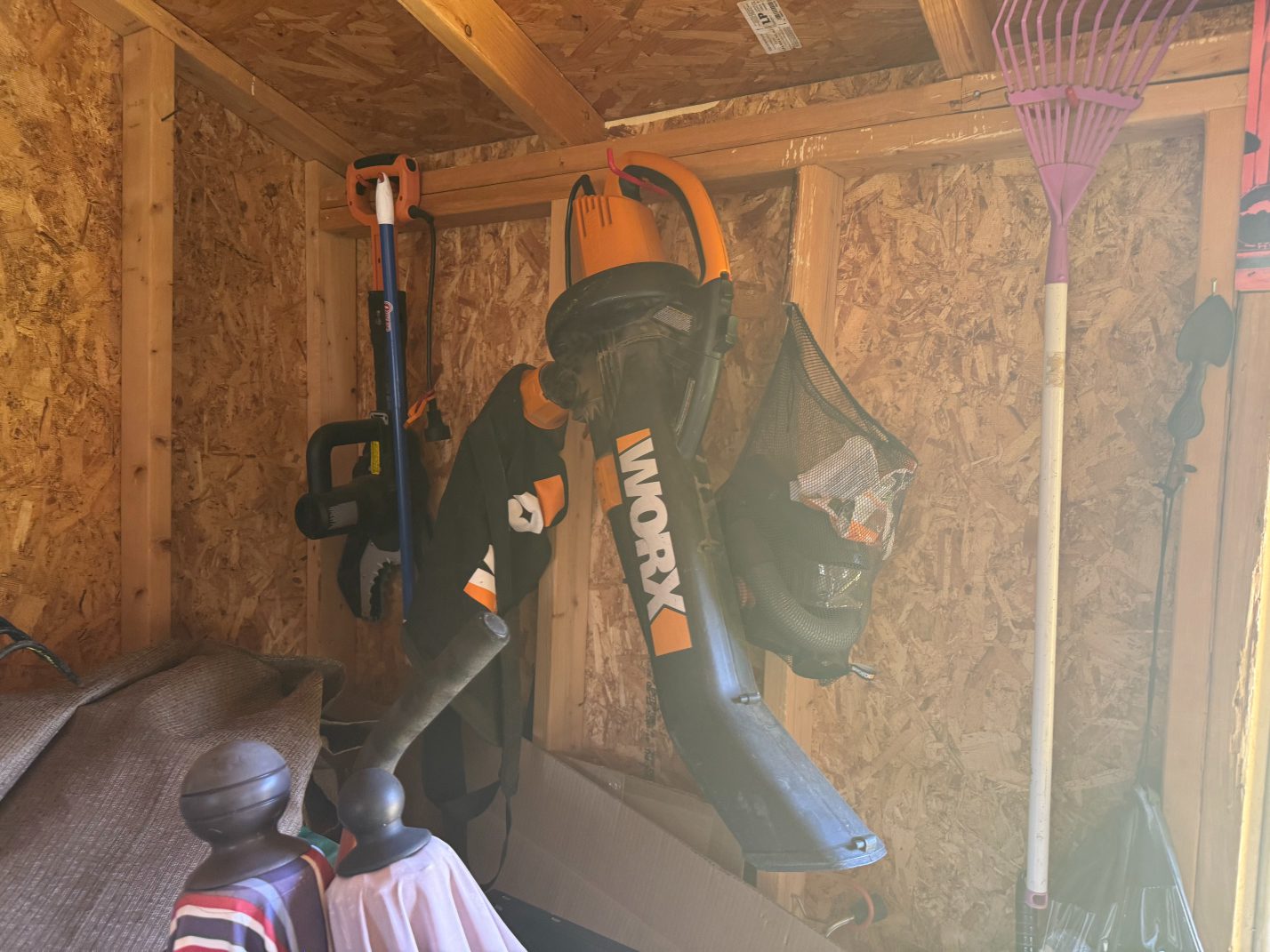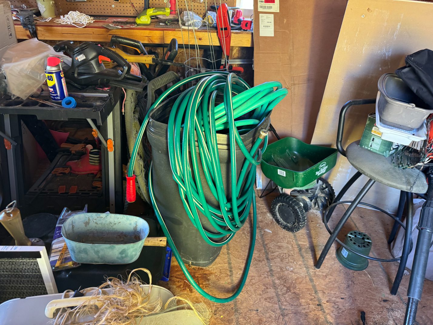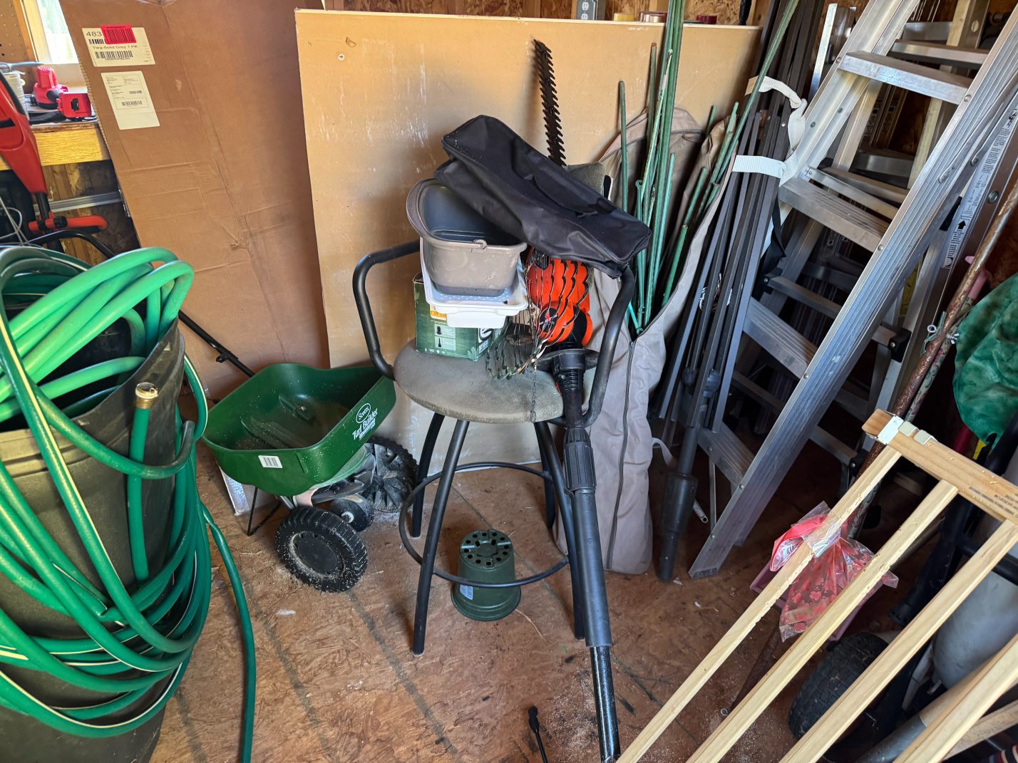Tools/Shop Items: 4-Step Ladder – Step Ladder – Printer – Shoulder Handbag – Step Stool – Plastic Urn Planter – Garden Hose – Scotts Broadcast Spreader – Ladder – DeWalt Chainsaw – Black and Decker Sander – Cordless Grass Shear – Hand Saw – Black & Decker Corded Jigsaw – Hand Tools – Clamps – Spray Bottles – Scotts Handheld Turf Builder Spreader – Weed Wacker – Electric Leaf Blower – Rake – Electric Pole Saw – Paint – Paint Brush – Hatchet – Hammers – Lawn and Garden Sprayer – Chapin Garden Sprayer – Extension Cords
