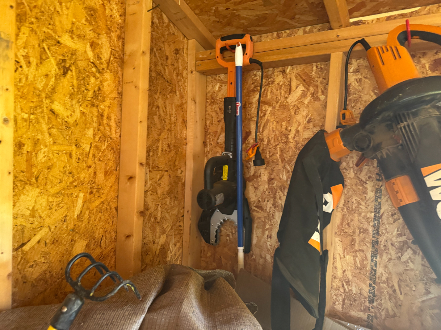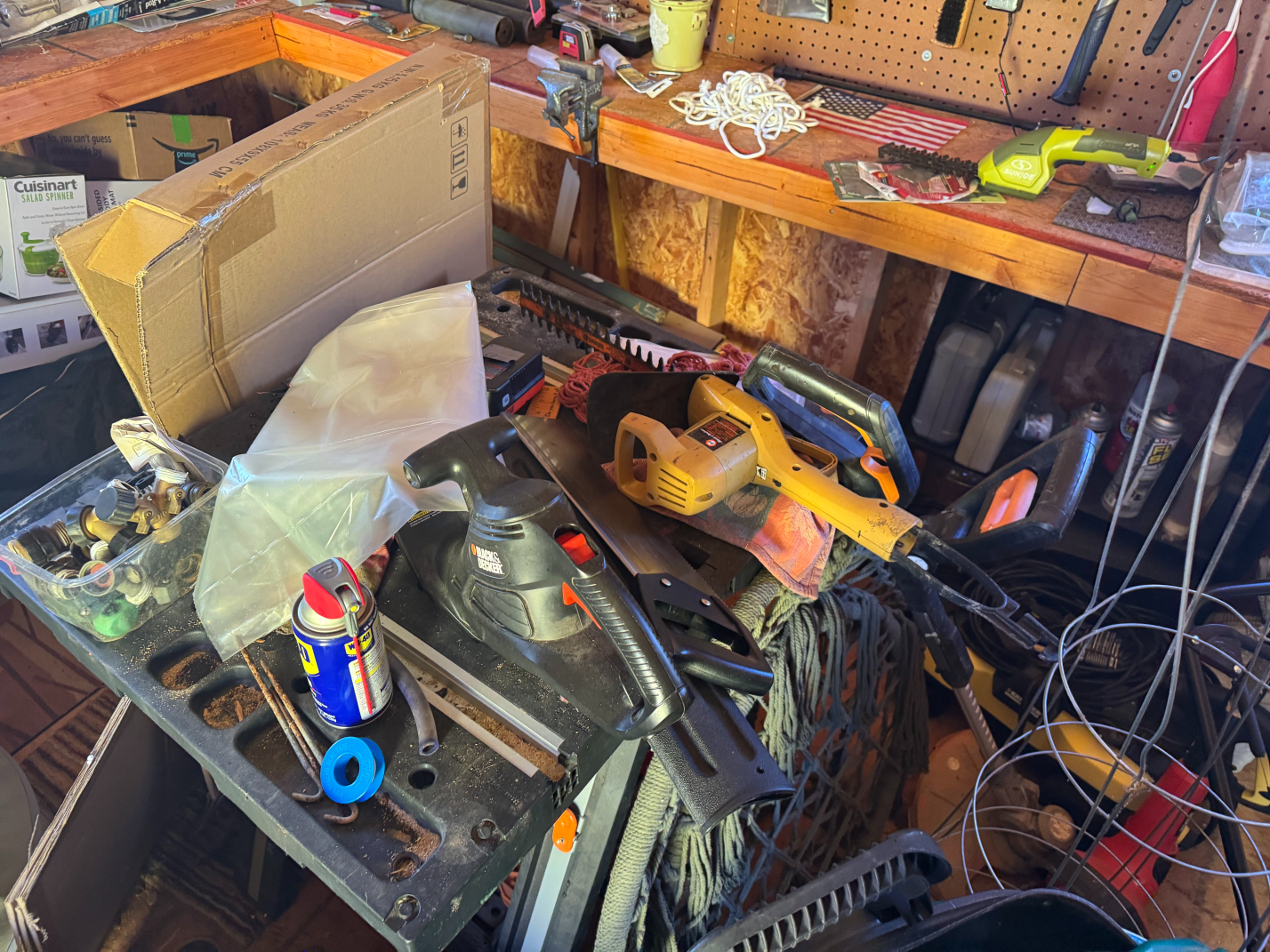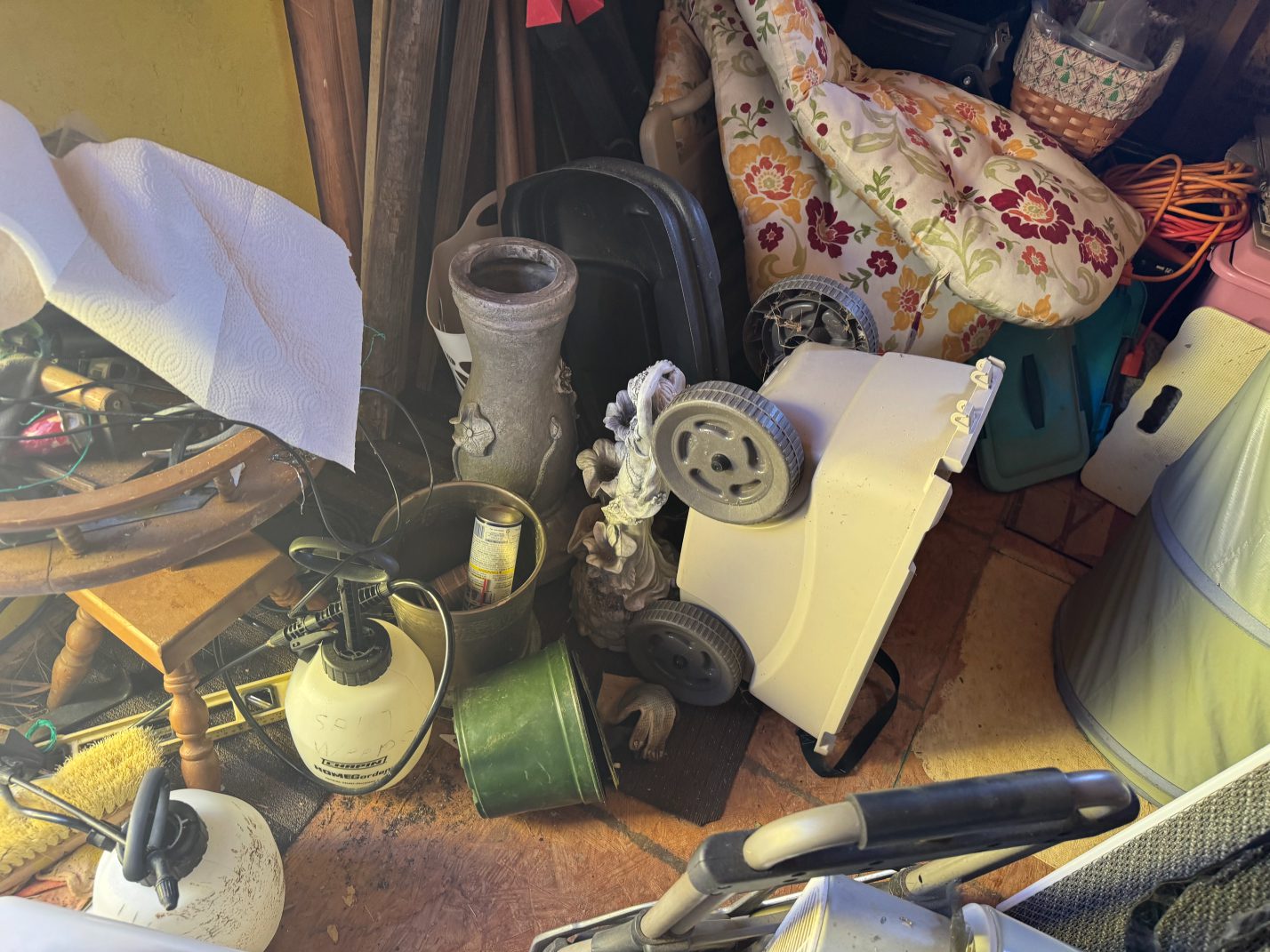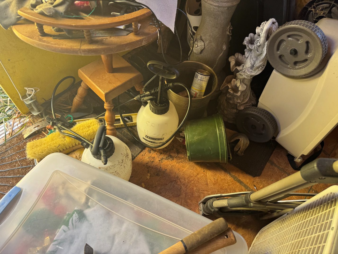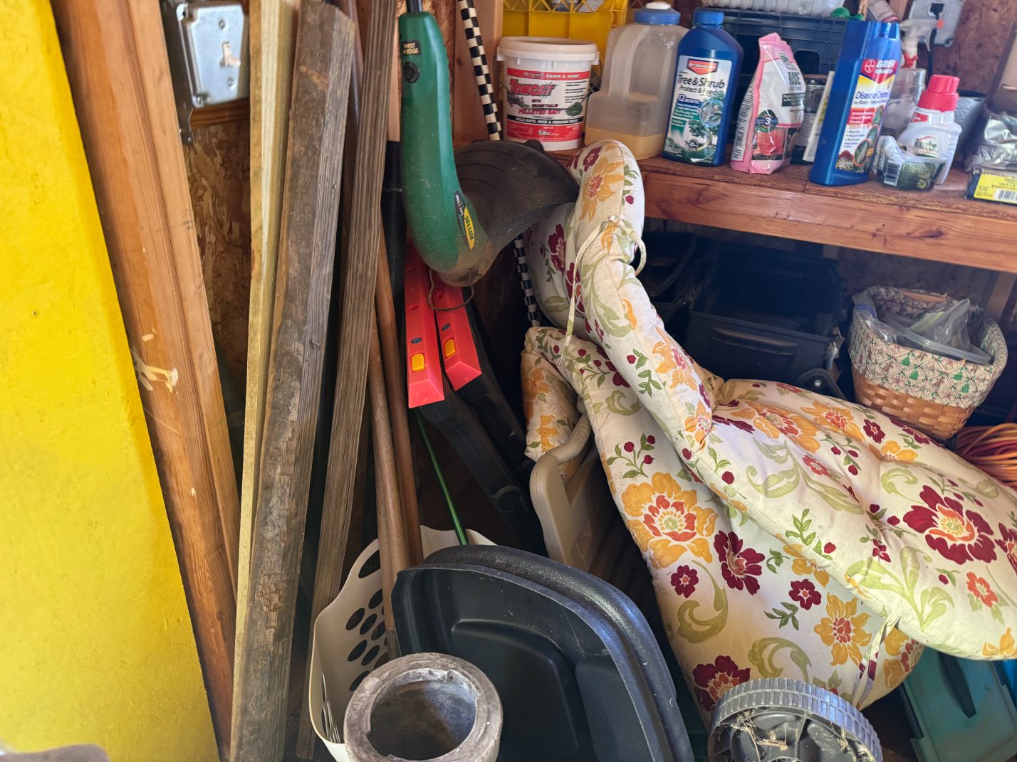 Tools/Shop Items: 4-Step Ladder – Step Ladder – Printer – Shoulder Handbag – Step Stool – Plastic Urn Planter – Garden Hose – Scotts Broadcast Spreader – Ladder – DeWalt Chainsaw – Black and Decker Sander – Cordless Grass Shear – Hand Saw – Black & Decker Corded Jigsaw – Hand Tools – Clamps – Spray Bottles – Scotts Handheld Turf Builder Spreader – Weed Wacker – Electric Leaf Blower – Rake – Electric Pole Saw – Paint – Paint Brush – Hatchet – Hammers – Lawn and Garden Sprayer – Chapin Garden Sprayer – Extension Cords