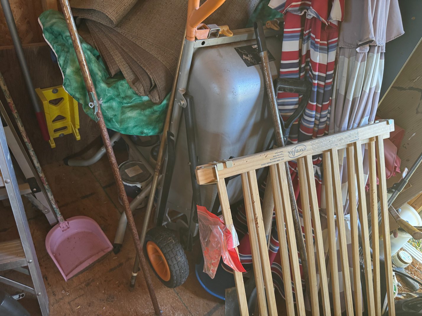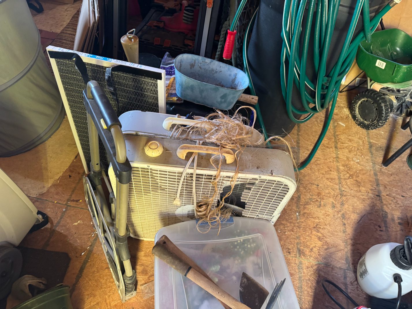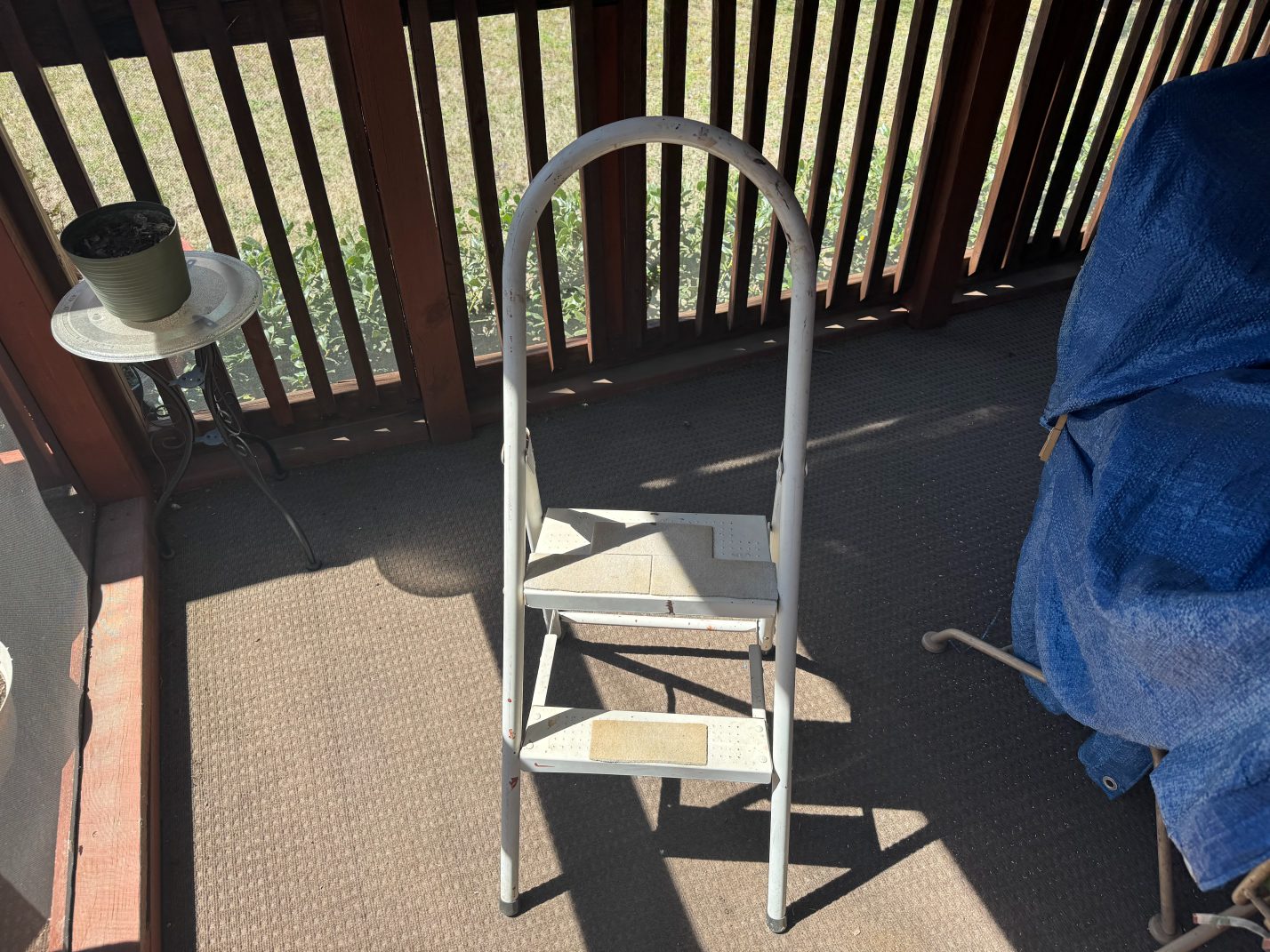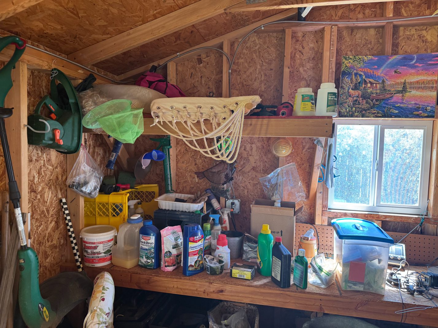 Tools/Shop Items: 4-Step Ladder – Step Ladder – Printer – Shoulder Handbag – Step Stool – Plastic Urn Planter – Garden Hose – Scotts Broadcast Spreader – Ladder – DeWalt Chainsaw – Black and Decker Sander – Cordless Grass Shear – Hand Saw – Black & Decker Corded Jigsaw – Hand Tools – Clamps – Spray Bottles – Scotts Handheld Turf Builder Spreader – Weed Wacker – Electric Leaf Blower – Rake – Electric Pole Saw – Paint – Paint Brush – Hatchet – Hammers – Lawn and Garden Sprayer – Chapin Garden Sprayer – Extension Cords