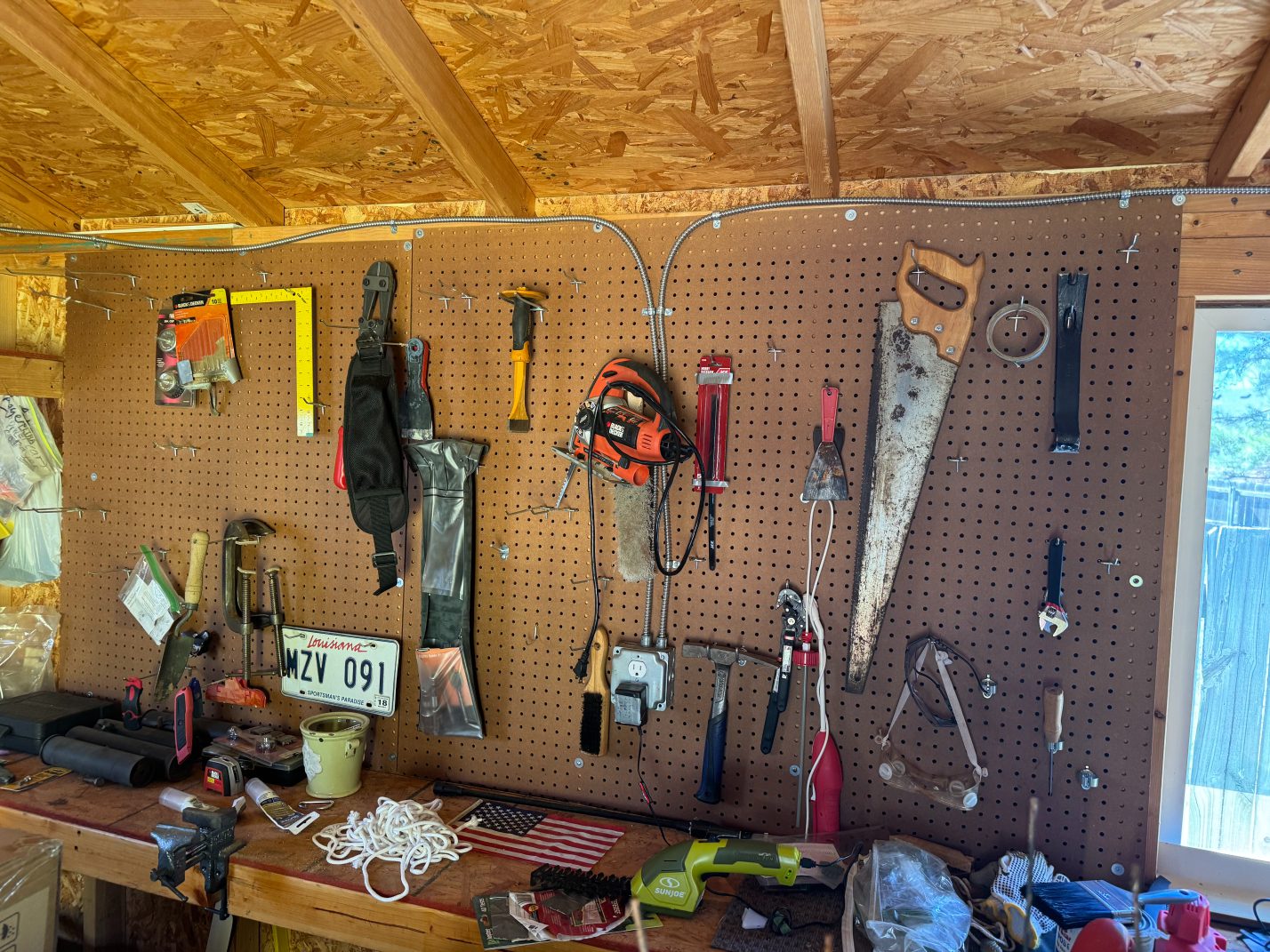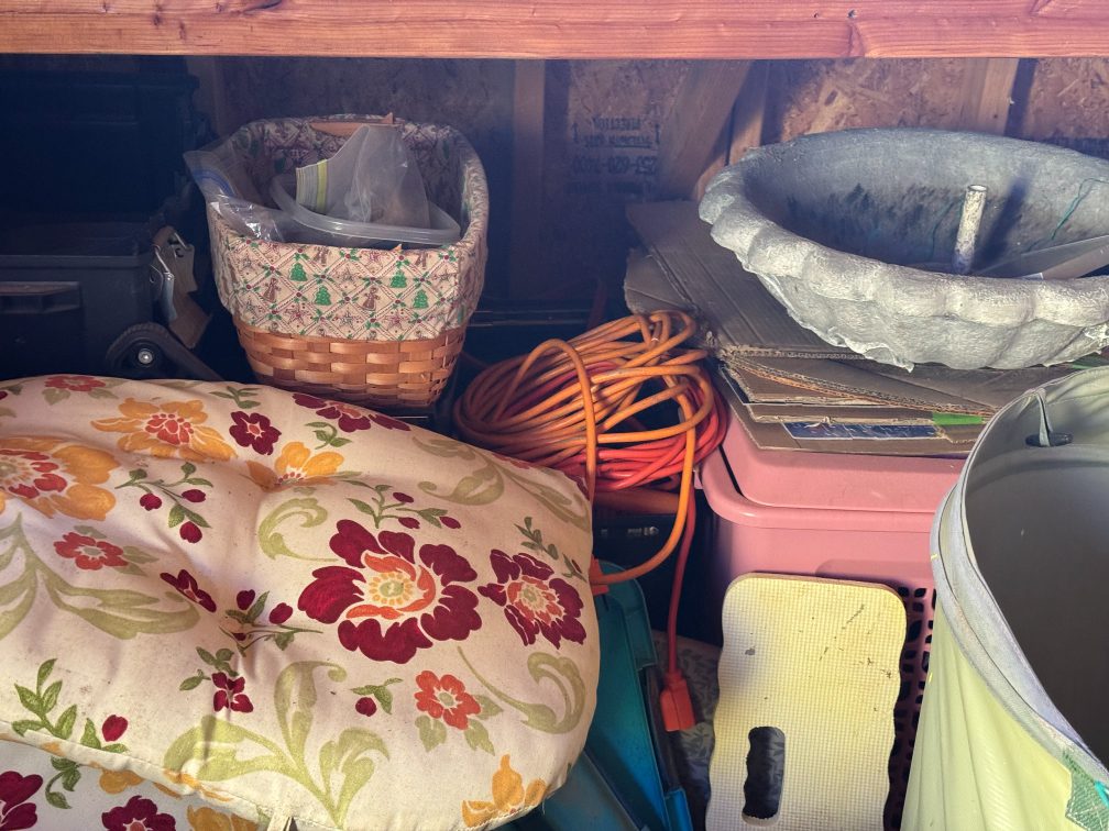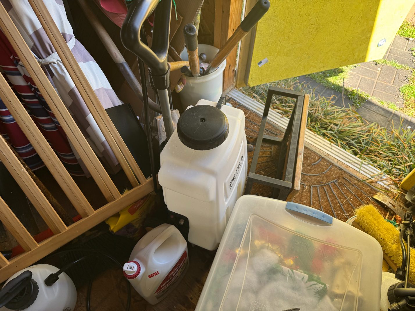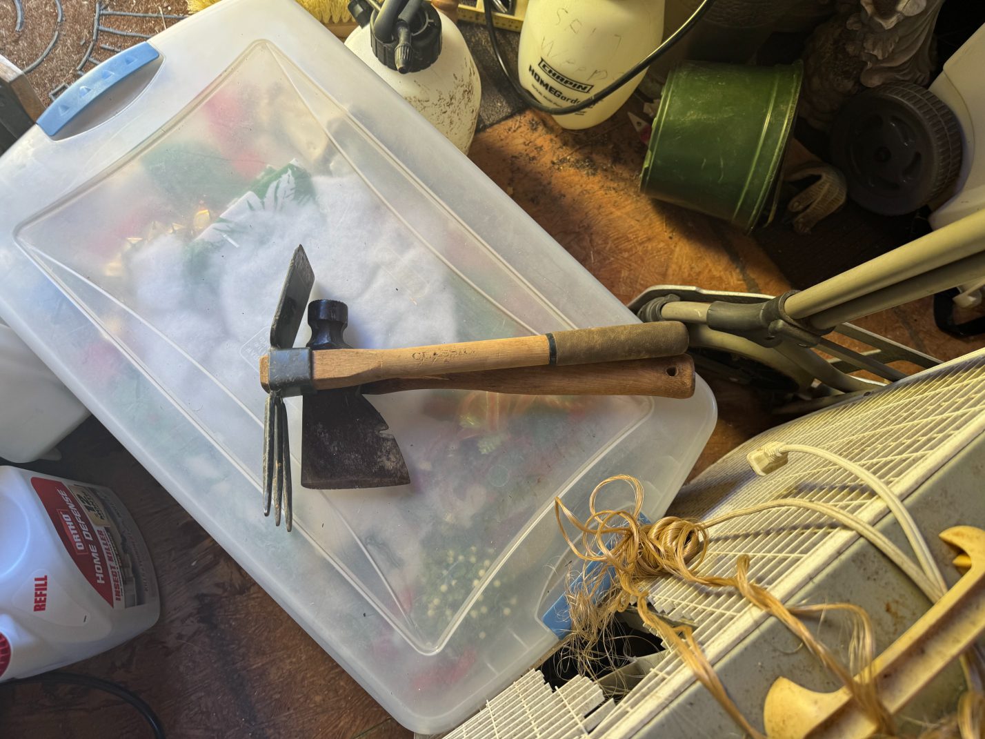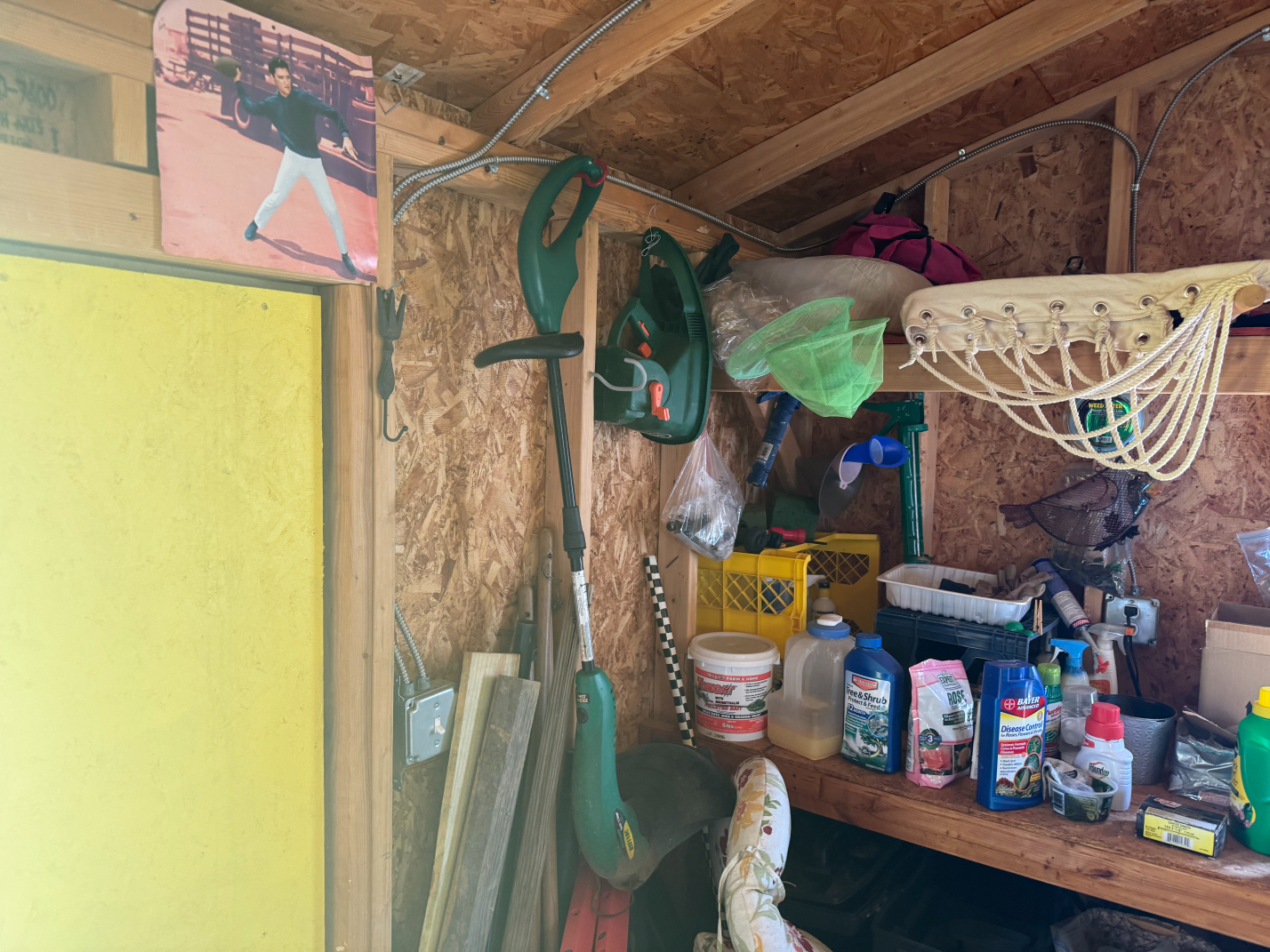 Tools/Shop Items: 4-Step Ladder – Step Ladder – Printer – Shoulder Handbag – Step Stool – Plastic Urn Planter – Garden Hose – Scotts Broadcast Spreader – Ladder – DeWalt Chainsaw – Black and Decker Sander – Cordless Grass Shear – Hand Saw – Black & Decker Corded Jigsaw – Hand Tools – Clamps – Spray Bottles – Scotts Handheld Turf Builder Spreader – Weed Wacker – Electric Leaf Blower – Rake – Electric Pole Saw – Paint – Paint Brush – Hatchet – Hammers – Lawn and Garden Sprayer – Chapin Garden Sprayer – Extension Cords