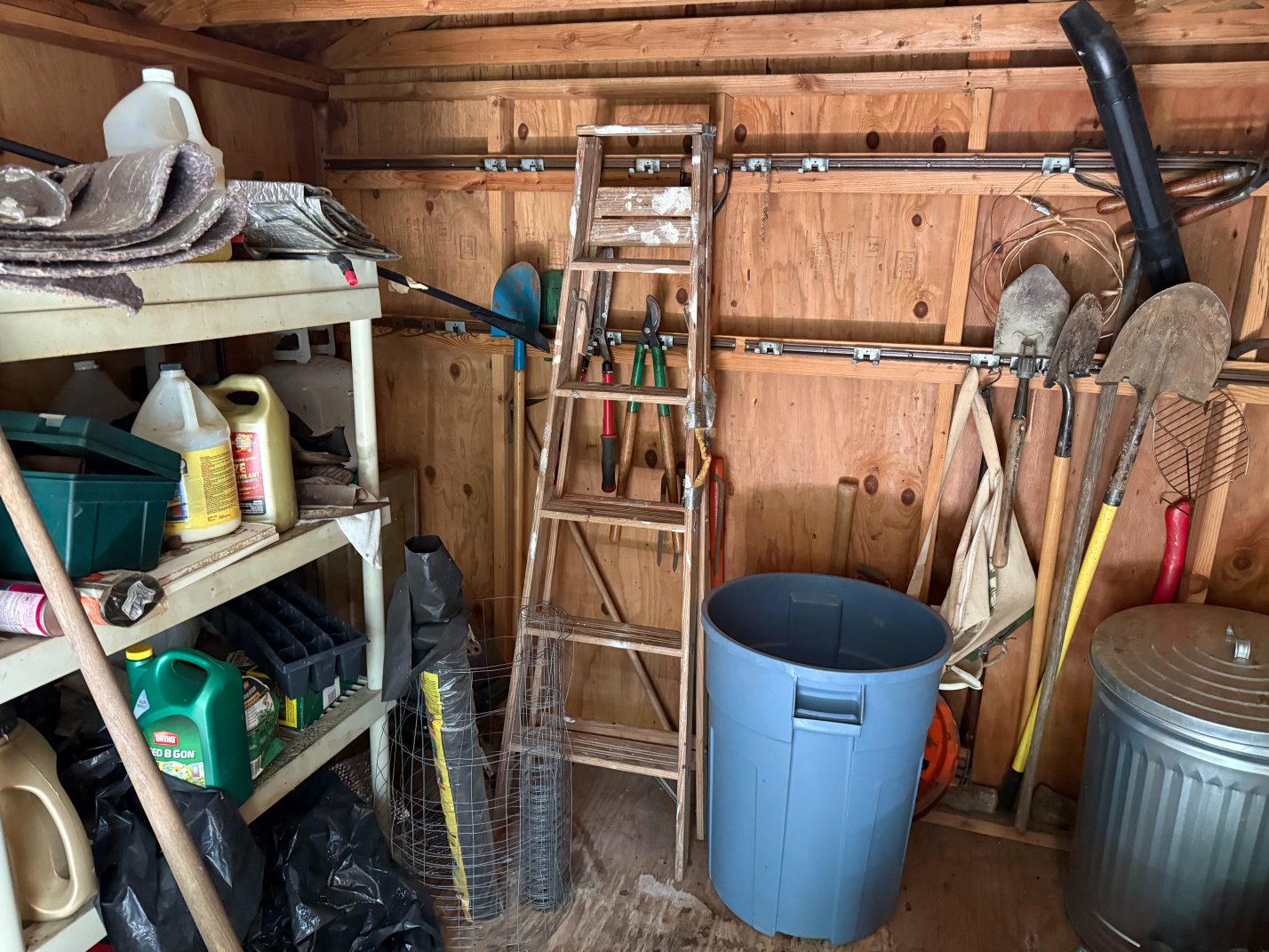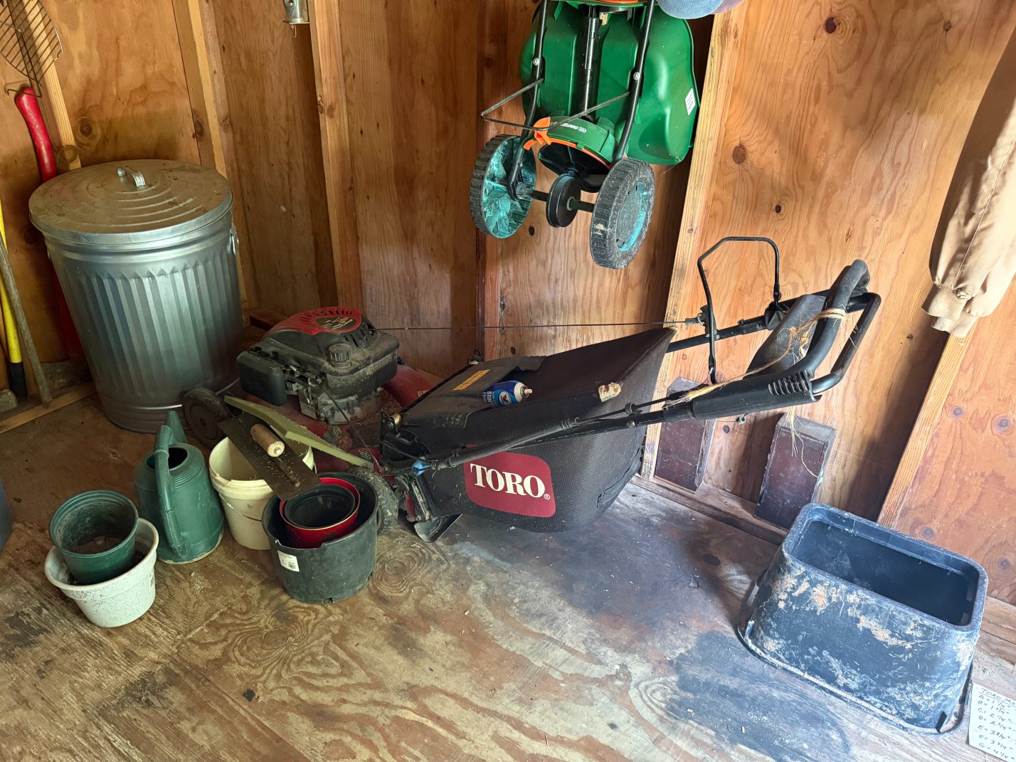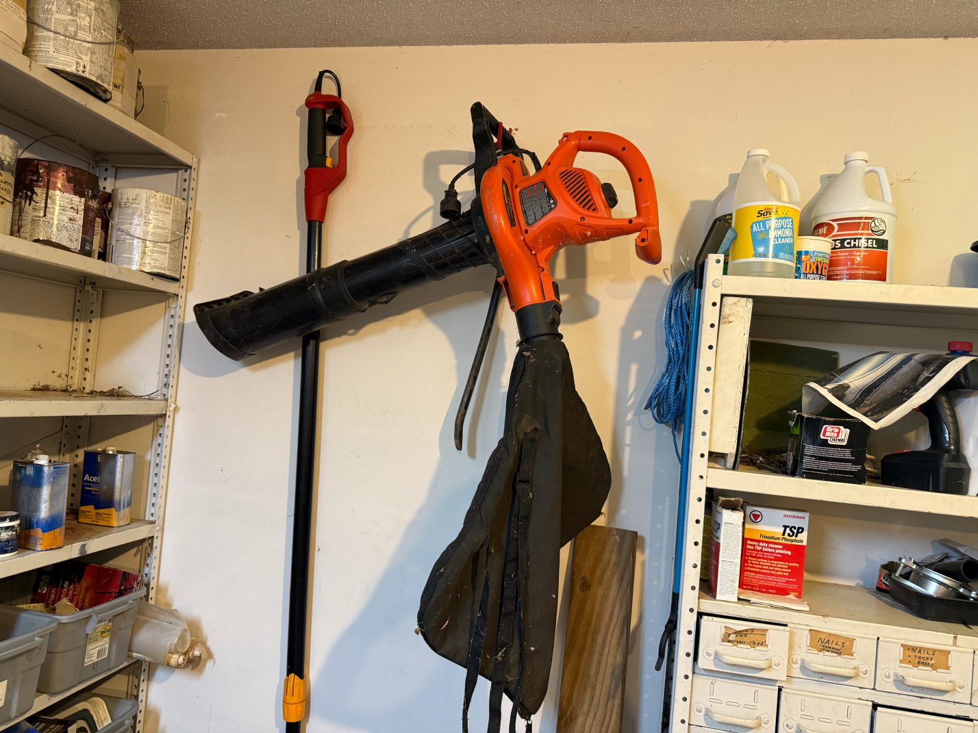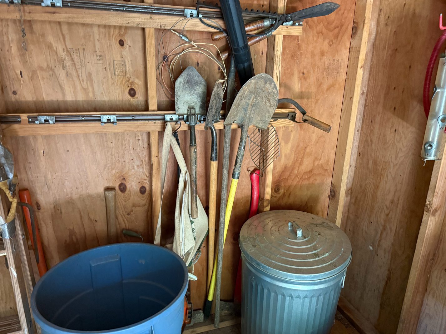 Craftsman Vise – Screwdrivers – Black and Decker Leaf Vacuum – Homelite Limb Saw – Shop Vac – Gas Cans – Files – Chisels – Bolt Bin – Nails – Bolts – DeWalt Drill – Rakes – Shovels – Hack Saws – Cable – Toro Pushmower – Seeder Spreader – Black and Decker Hedger – Ladder – Metal Shelving