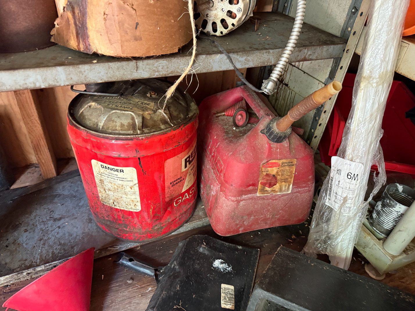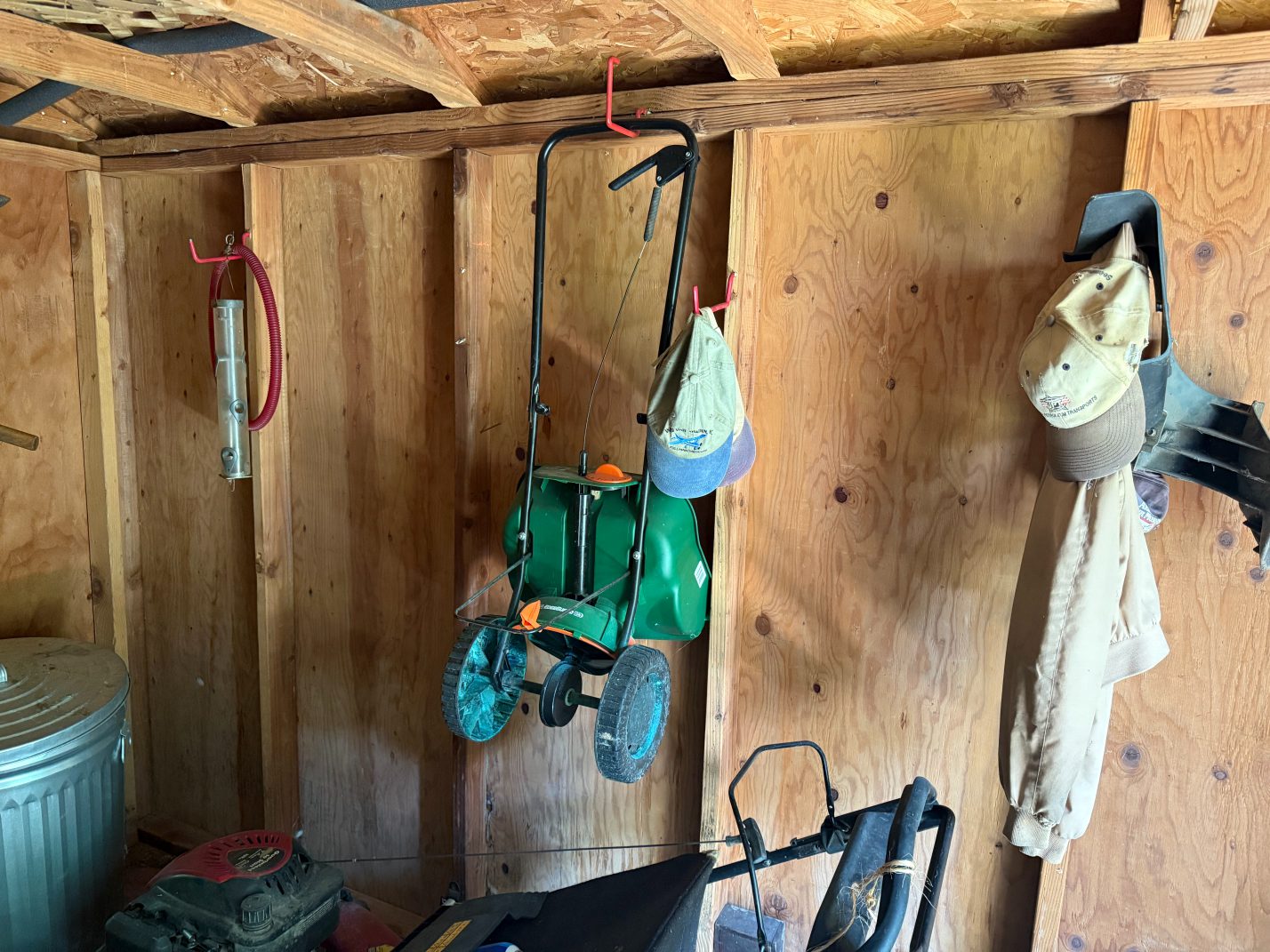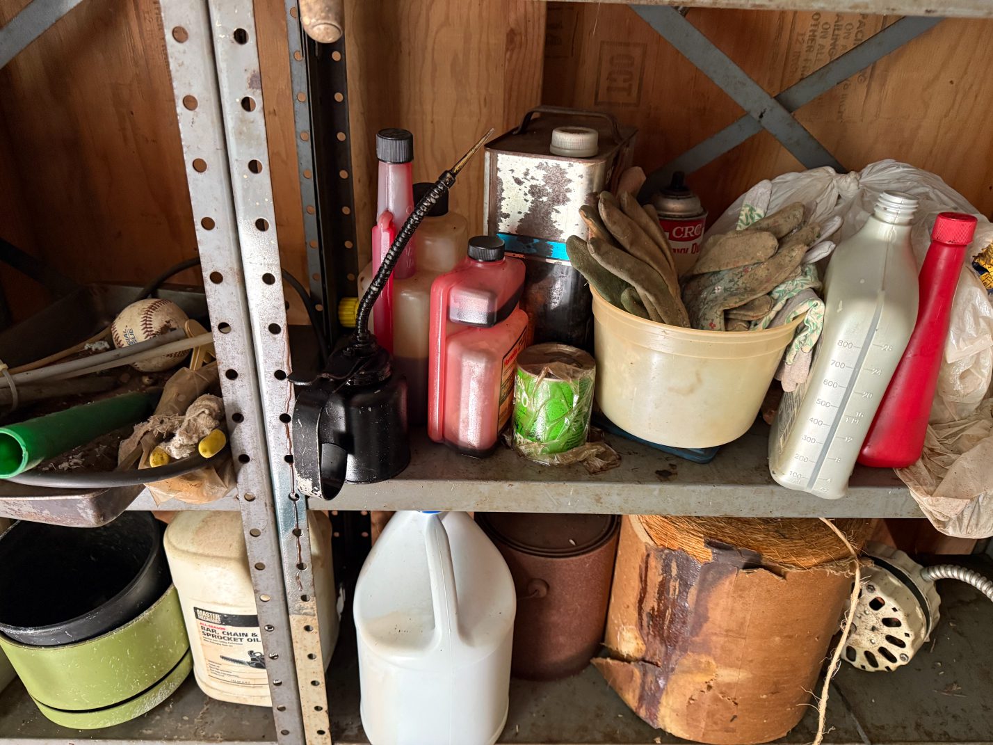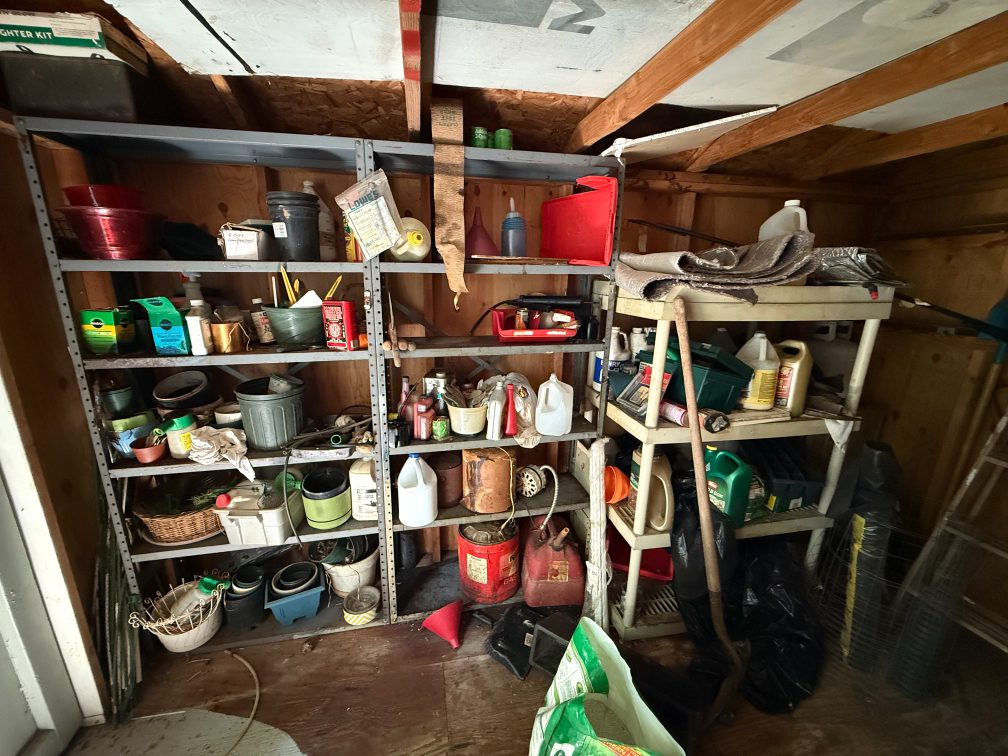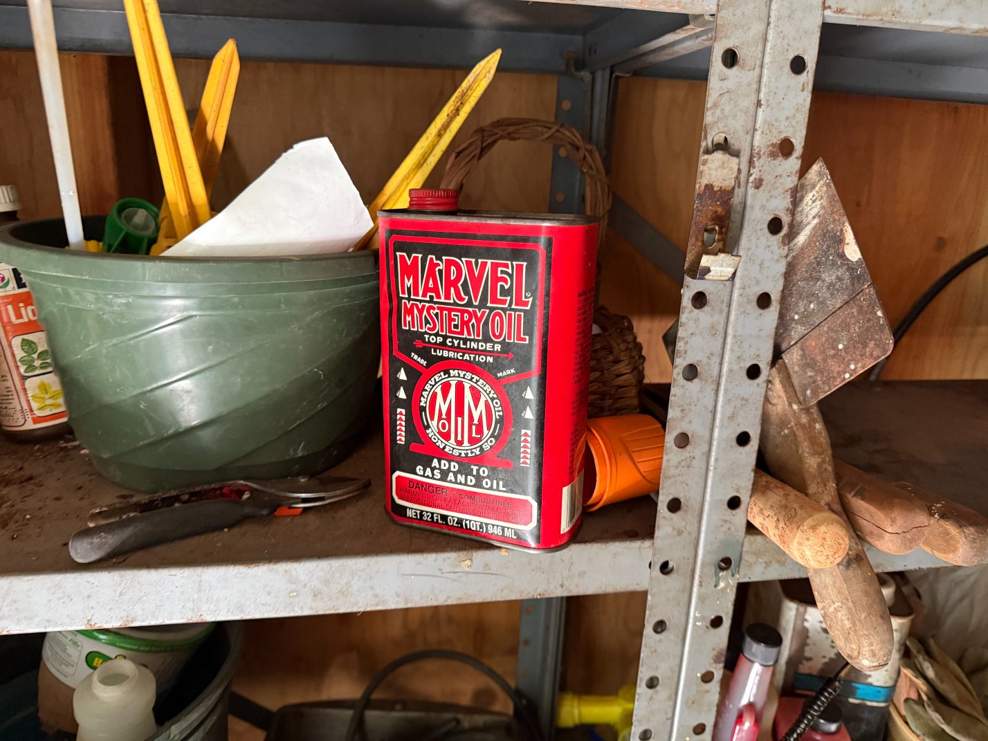 Craftsman Vise – Screwdrivers – Black and Decker Leaf Vacuum – Homelite Limb Saw – Shop Vac – Gas Cans – Files – Chisels – Bolt Bin – Nails – Bolts – DeWalt Drill – Rakes – Shovels – Hack Saws – Cable – Toro Pushmower – Seeder Spreader – Black and Decker Hedger – Ladder – Metal Shelving