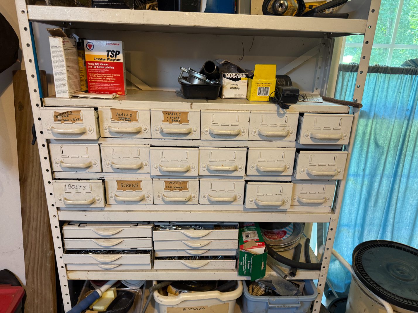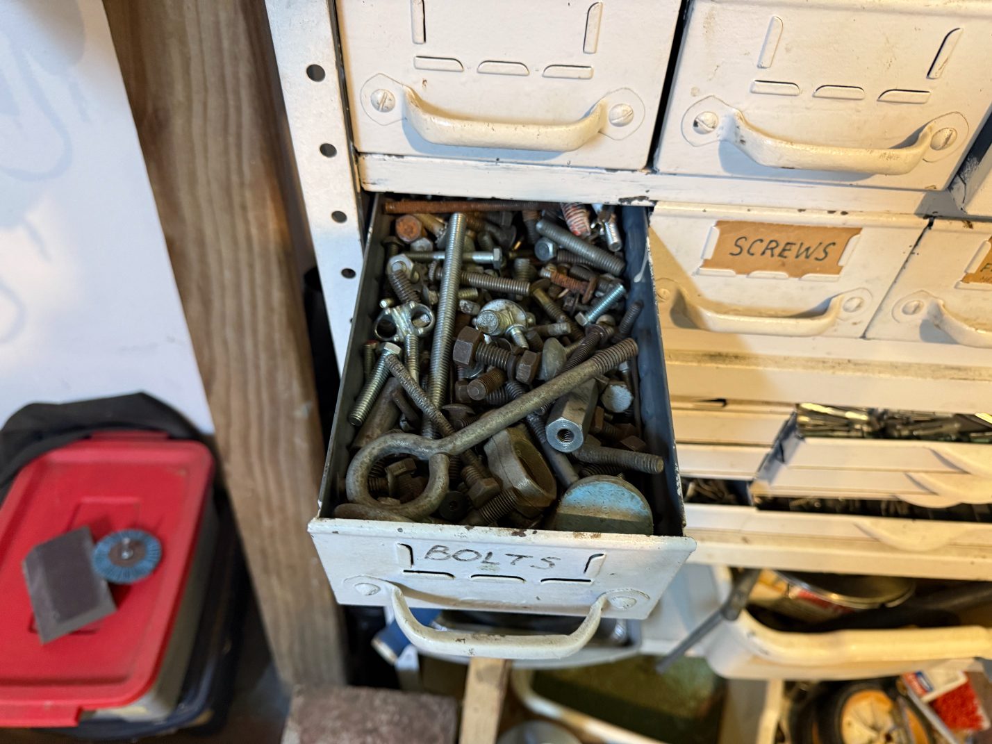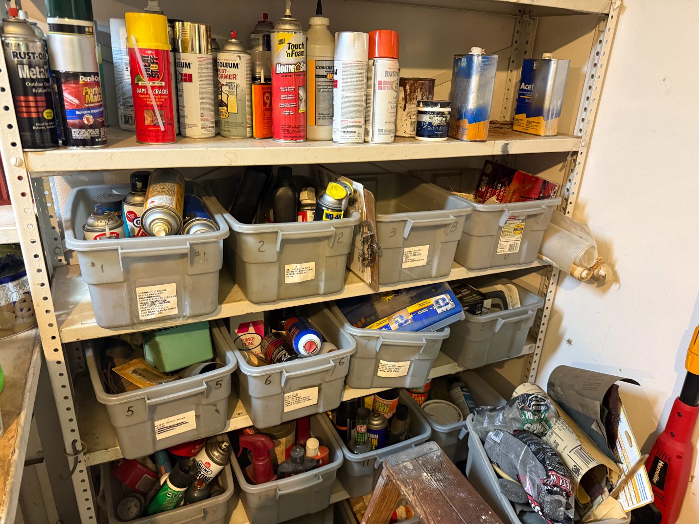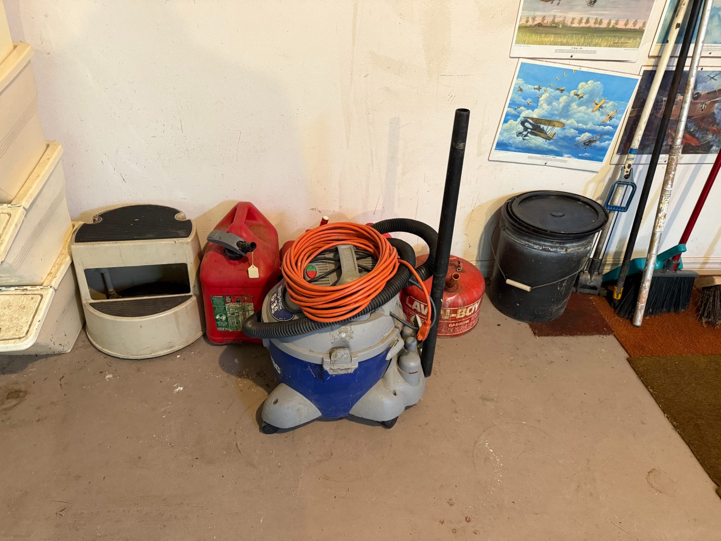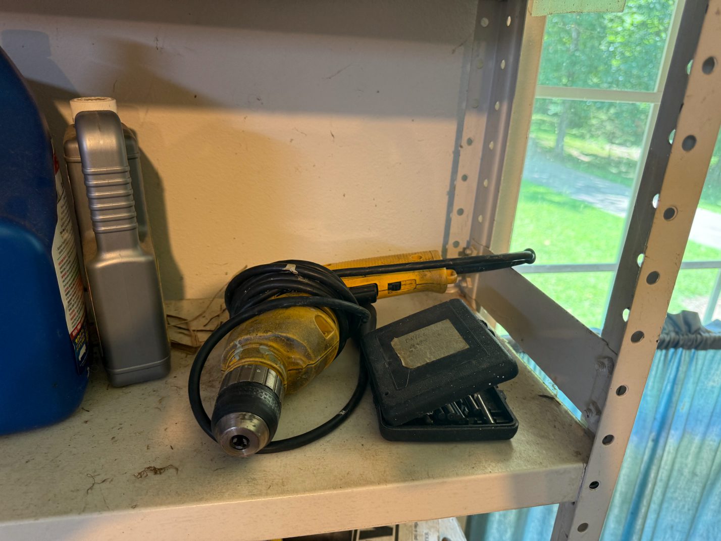 Craftsman Vise – Screwdrivers – Black and Decker Leaf Vacuum – Homelite Limb Saw – Shop Vac – Gas Cans – Files – Chisels – Bolt Bin – Nails – Bolts – DeWalt Drill – Rakes – Shovels – Hack Saws – Cable – Toro Pushmower – Seeder Spreader – Black and Decker Hedger – Ladder – Metal Shelving