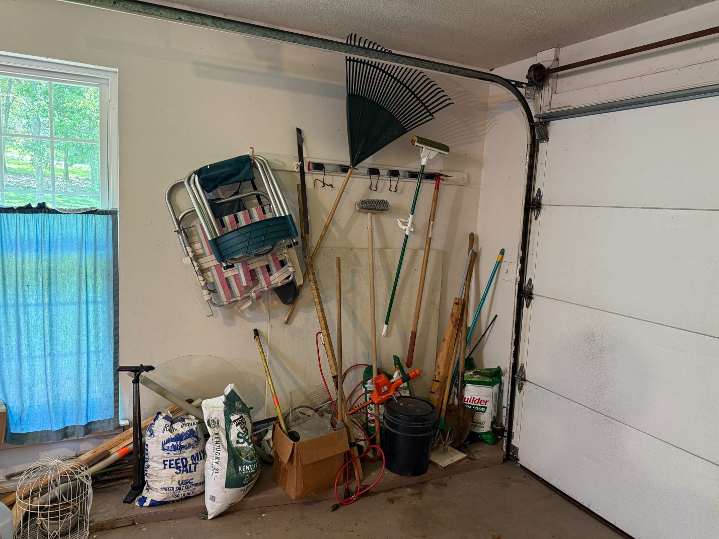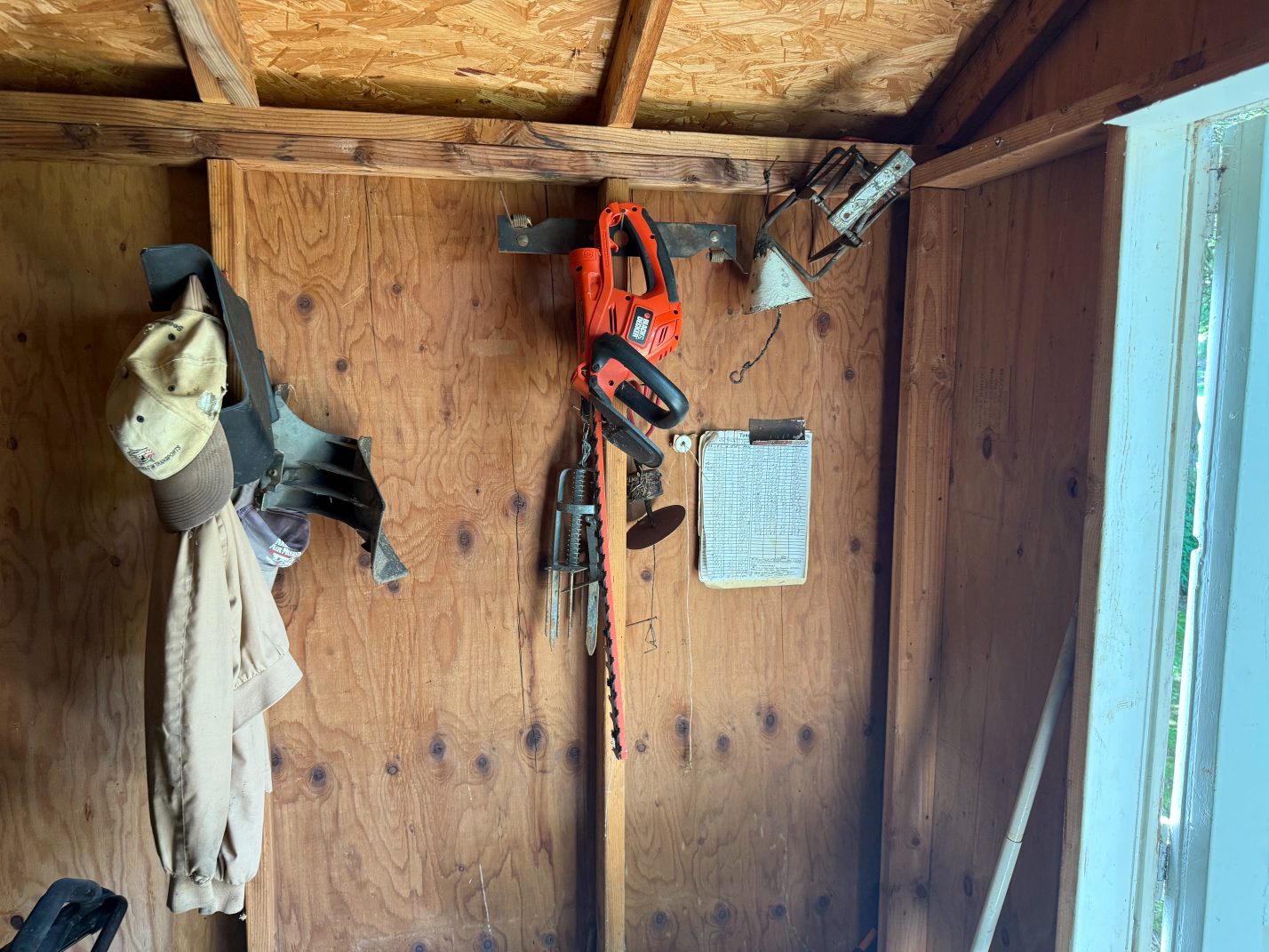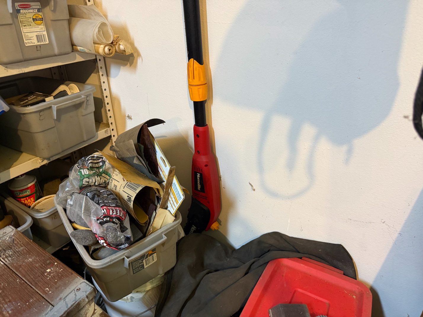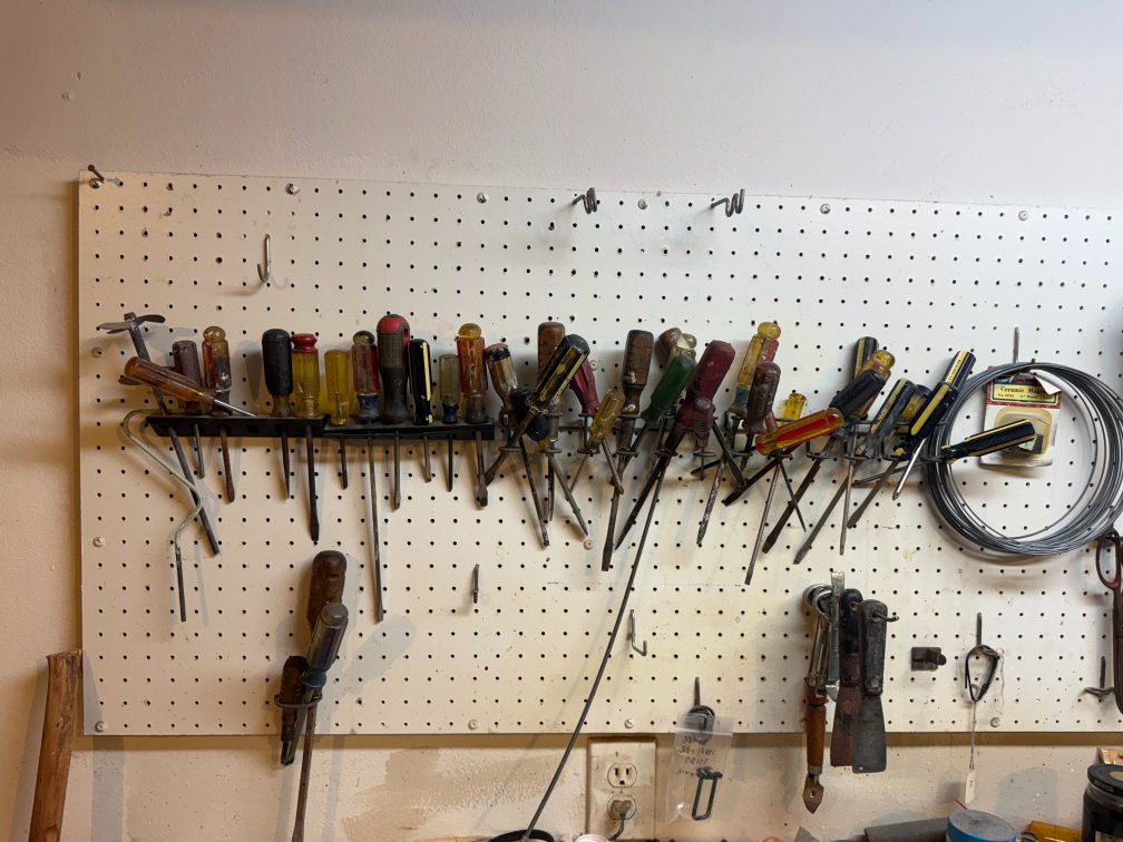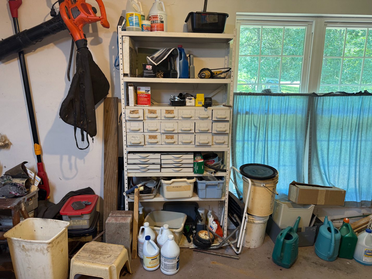 Craftsman Vise – Screwdrivers – Black and Decker Leaf Vacuum – Homelite Limb Saw – Shop Vac – Gas Cans – Files – Chisels – Bolt Bin – Nails – Bolts – DeWalt Drill – Rakes – Shovels – Hack Saws – Cable – Toro Pushmower – Seeder Spreader – Black and Decker Hedger – Ladder – Metal Shelving