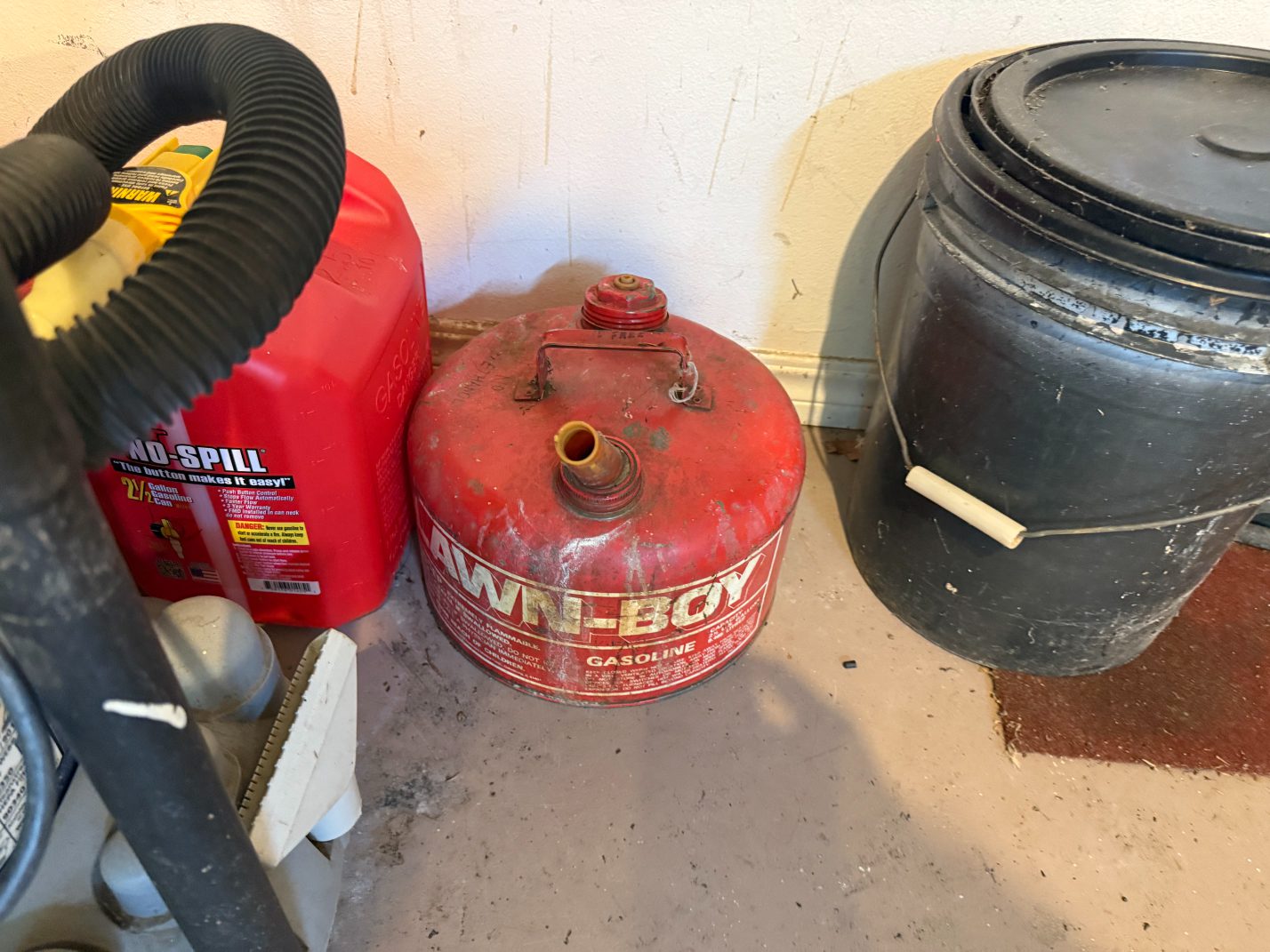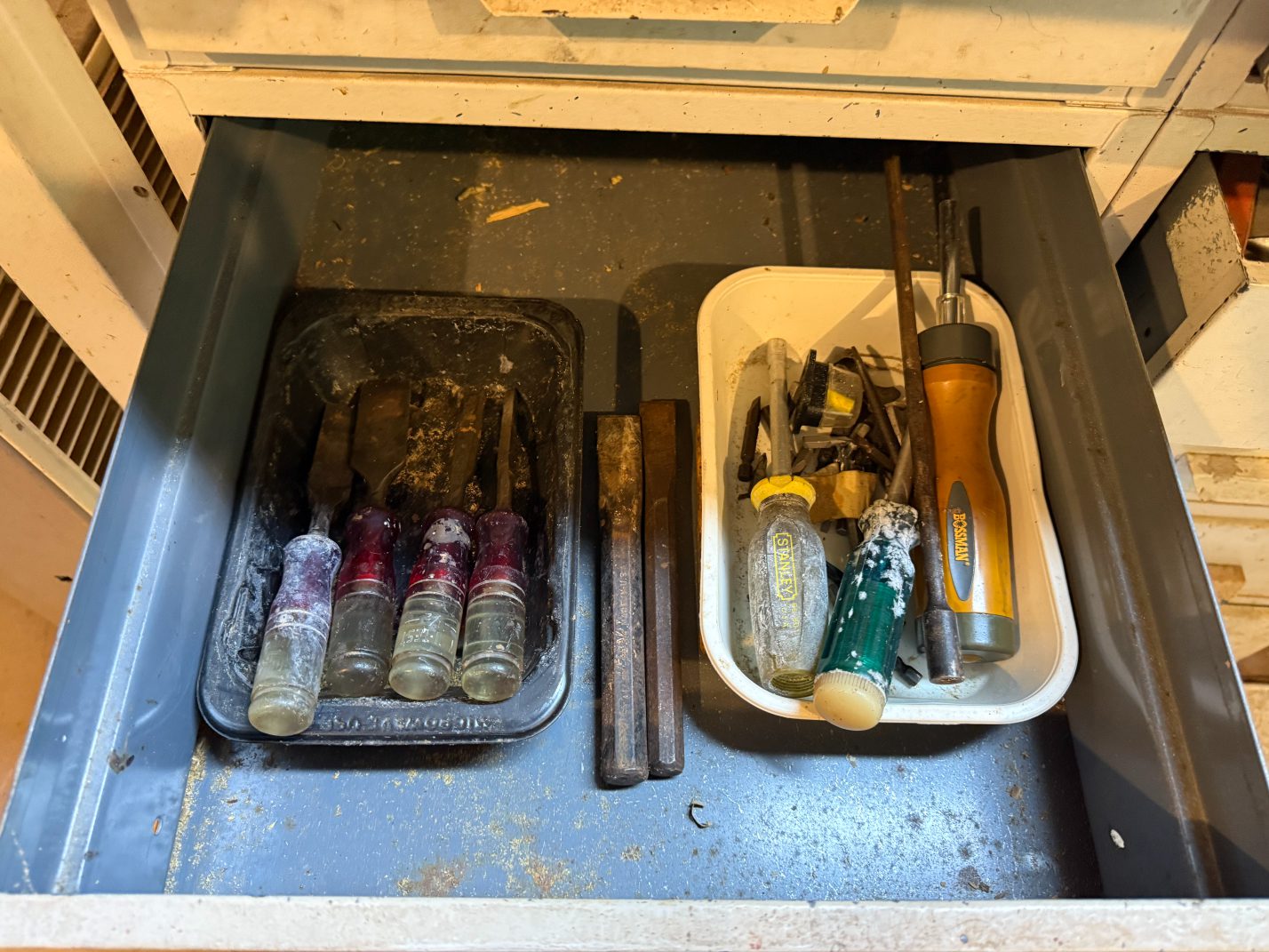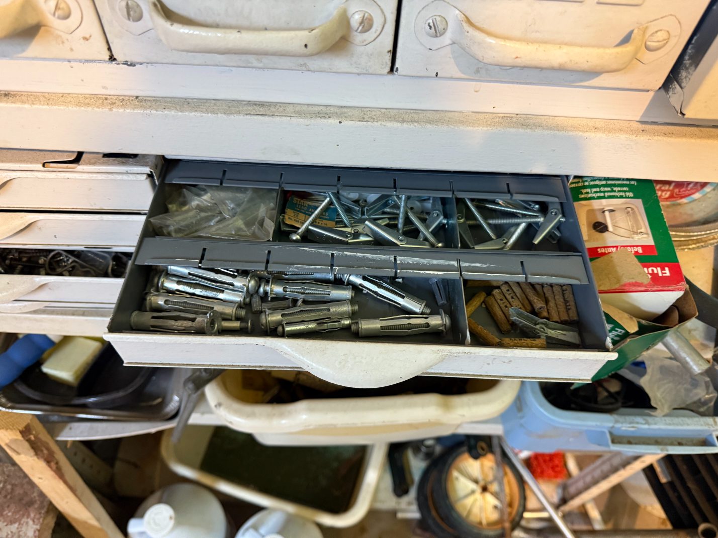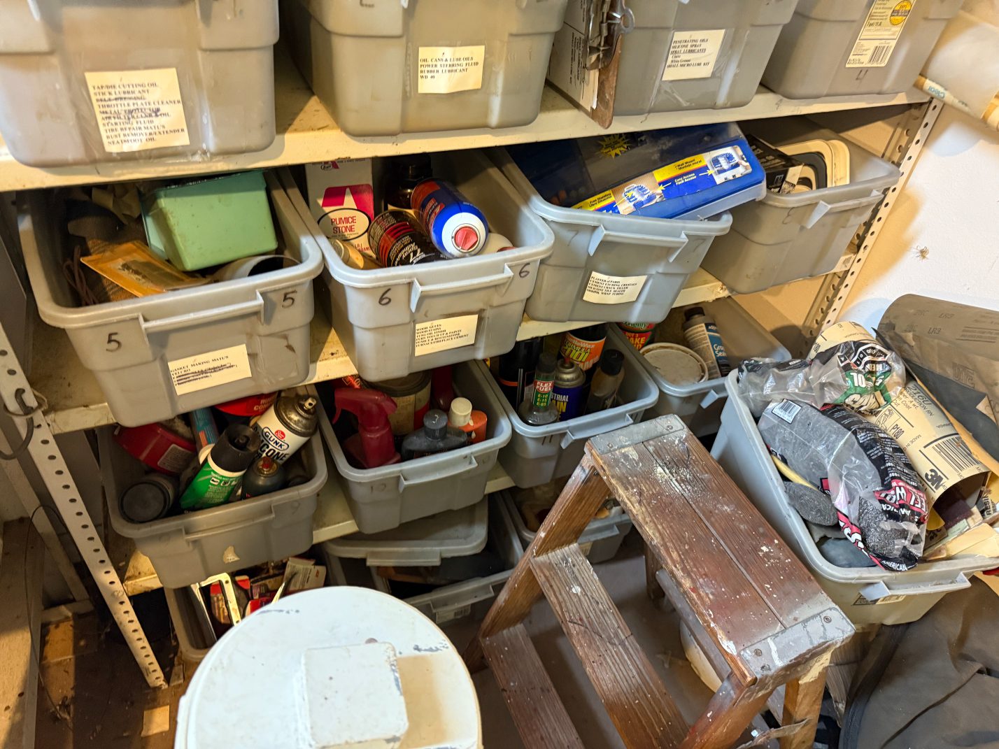 Craftsman Vise – Screwdrivers – Black and Decker Leaf Vacuum – Homelite Limb Saw – Shop Vac – Gas Cans – Files – Chisels – Bolt Bin – Nails – Bolts – DeWalt Drill – Rakes – Shovels – Hack Saws – Cable – Toro Pushmower – Seeder Spreader – Black and Decker Hedger – Ladder – Metal Shelving