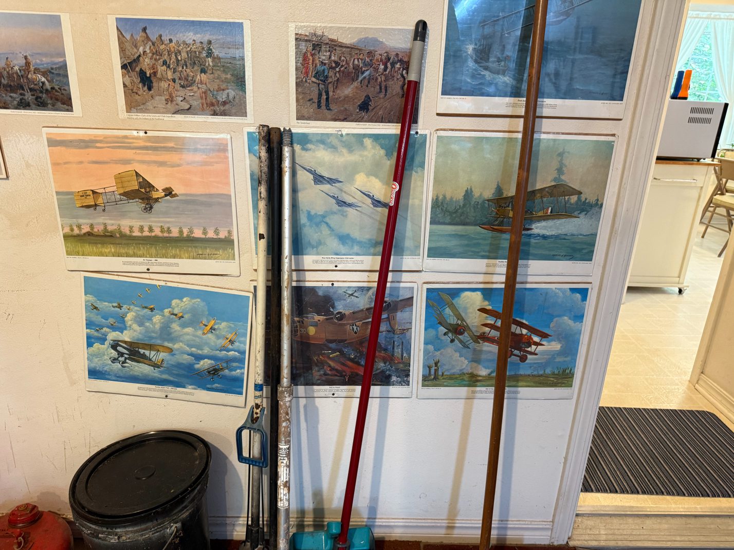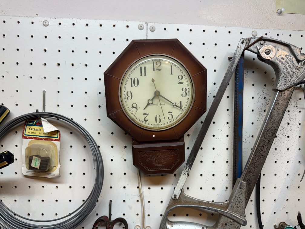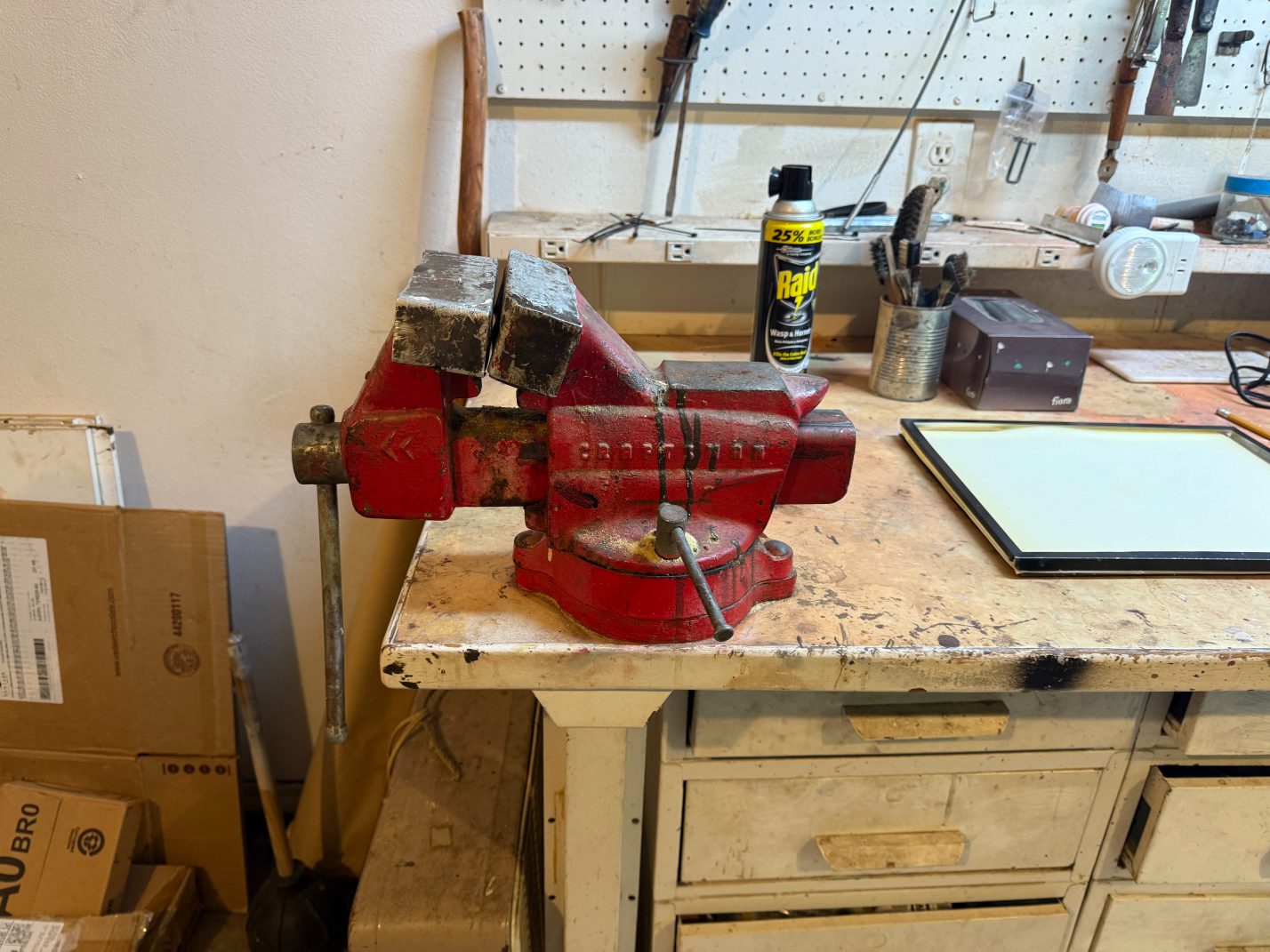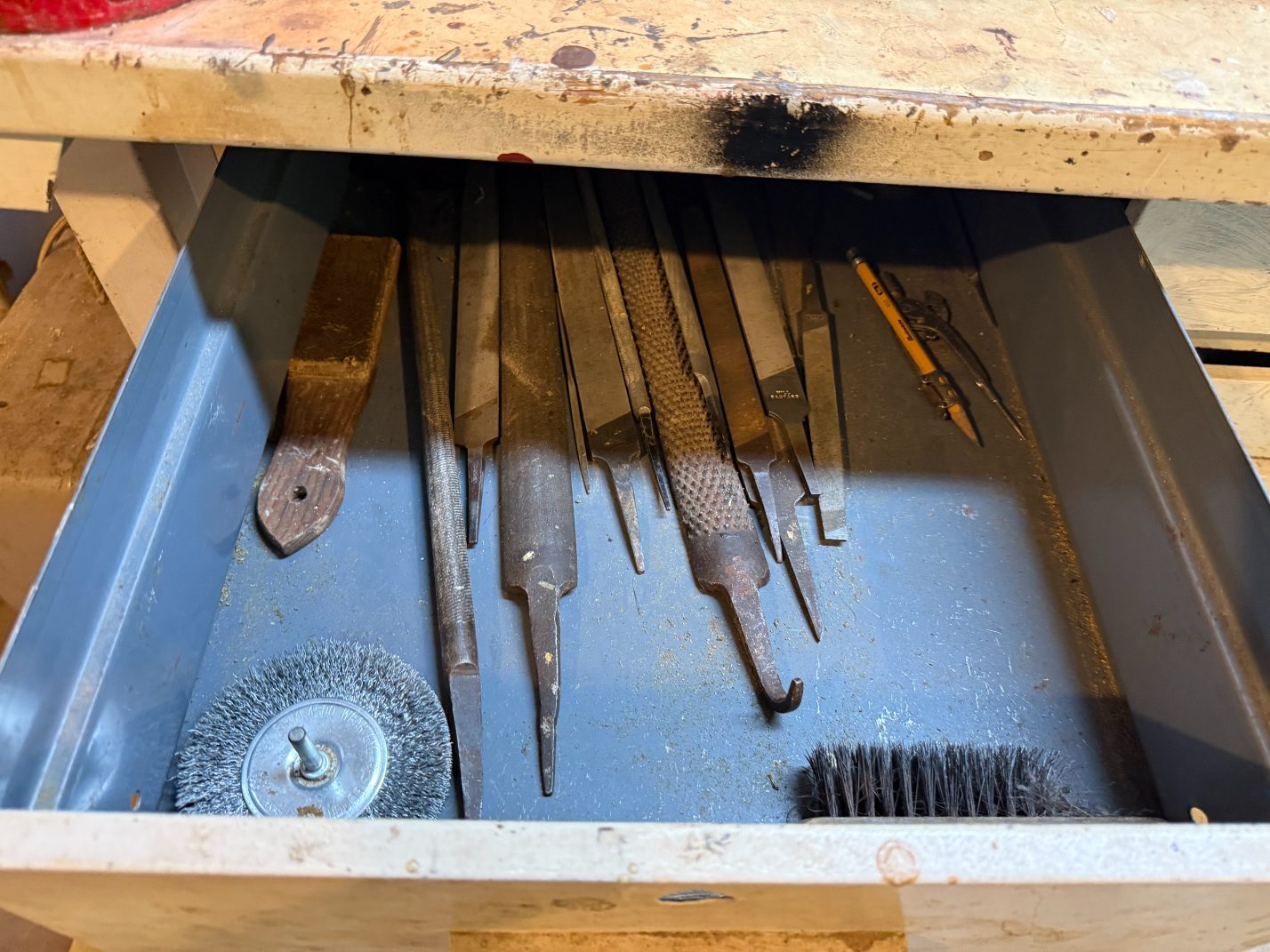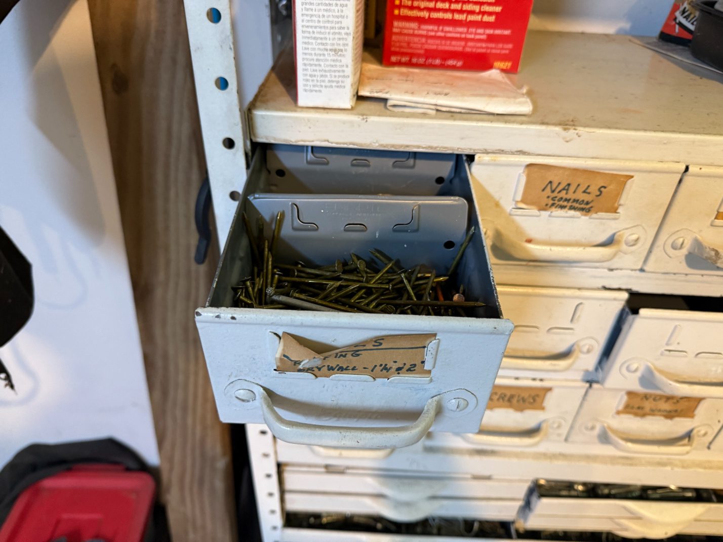 Craftsman Vise – Screwdrivers – Black and Decker Leaf Vacuum – Homelite Limb Saw – Shop Vac – Gas Cans – Files – Chisels – Bolt Bin – Nails – Bolts – DeWalt Drill – Rakes – Shovels – Hack Saws – Cable – Toro Pushmower – Seeder Spreader – Black and Decker Hedger – Ladder – Metal Shelving