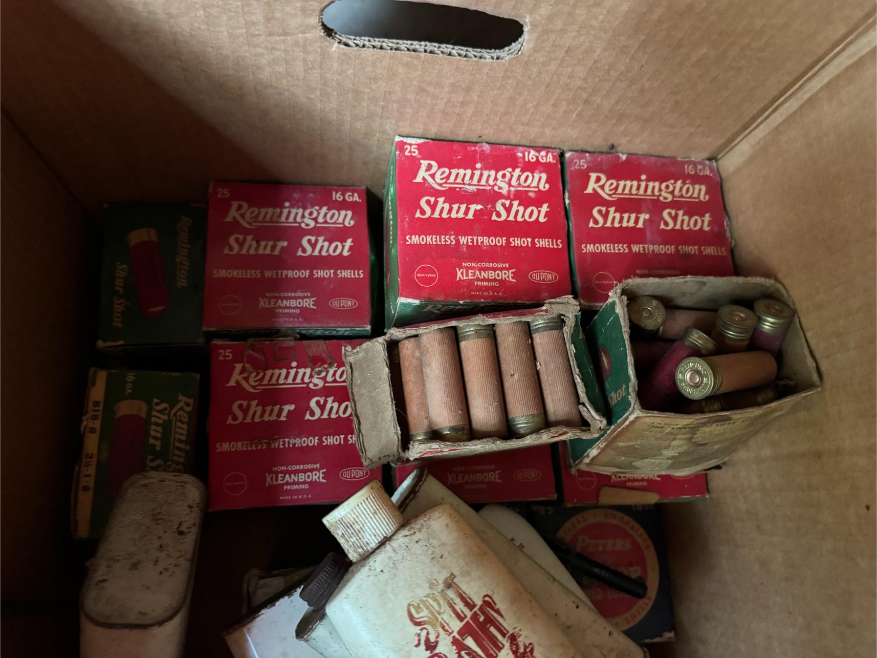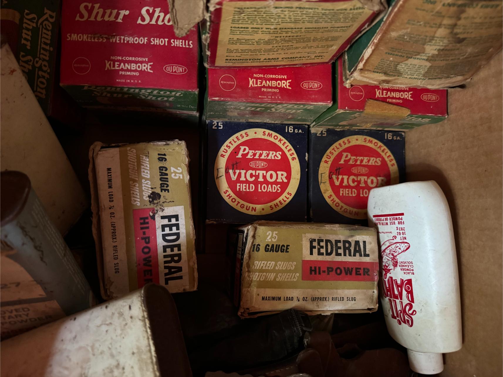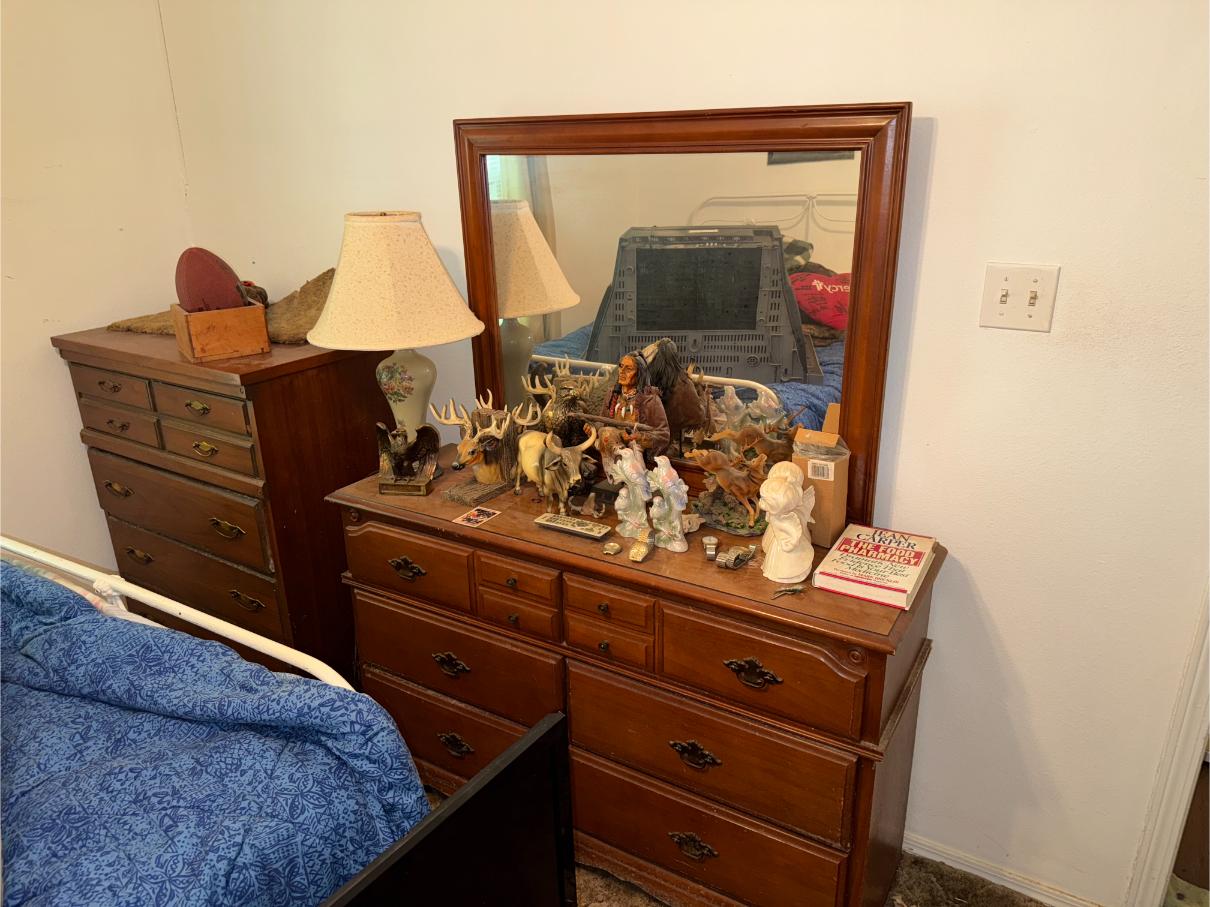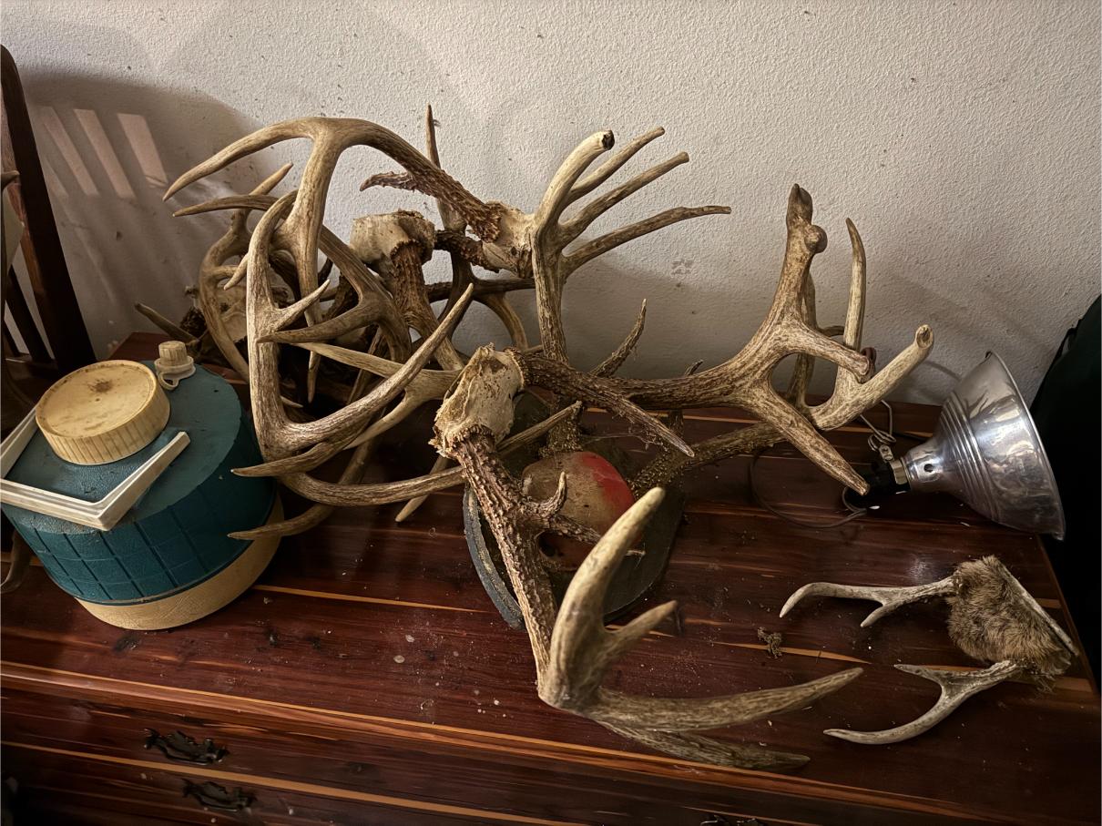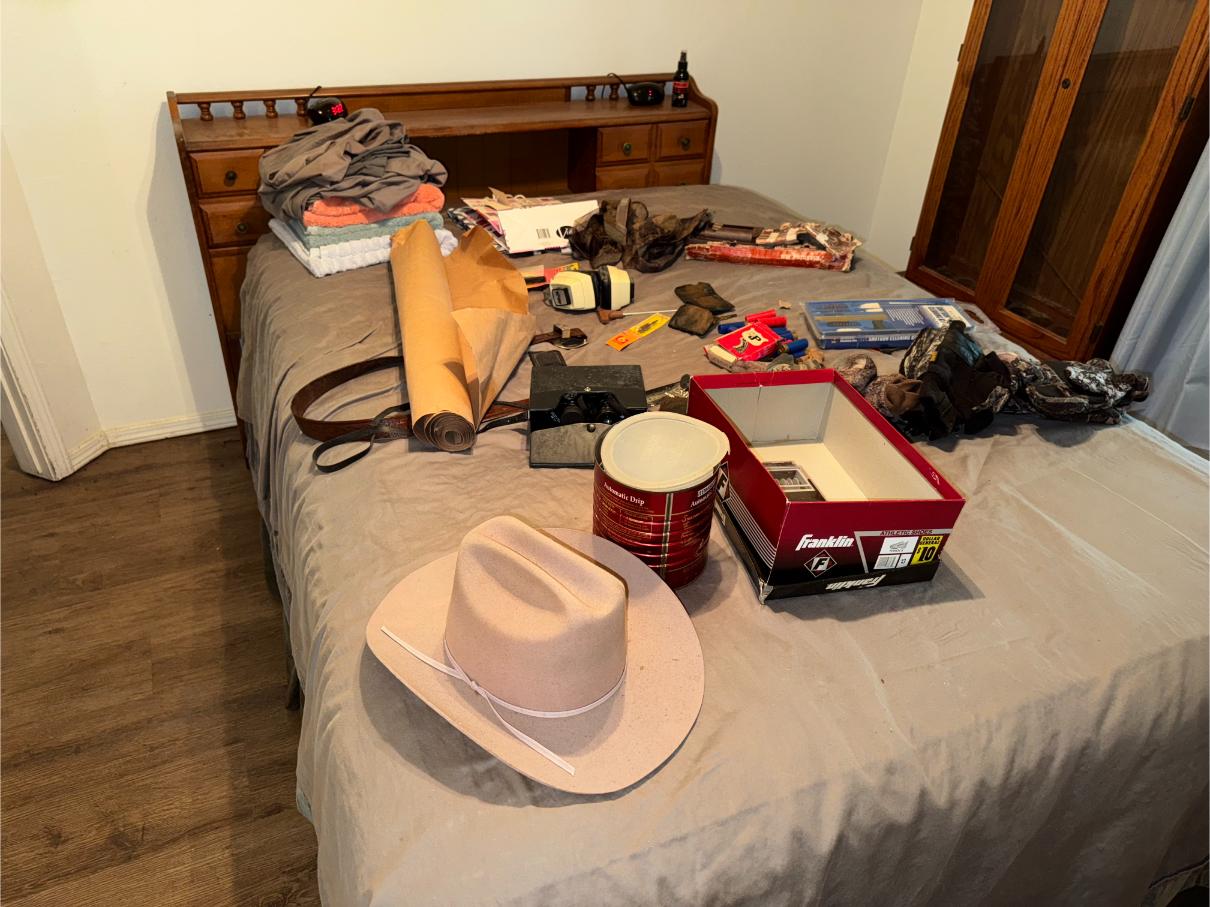 Antiques & Collectibles: Oak Dining Table & Chairs – Oak Ice Box – Regulator Wall Clock – Iron Bed – Maple Queen Size Bed, Dresser & Chest – Mahogany Chest – Tiger Oak Chest – Chairs – Cedar Chest – Pine Corner Cabinet – Hall Tree – Crank Wall Phone – Enamel Pans – Cast Iron Skillets, Corn Bread – Carnival Glass – Pyrex – Milk Glass – Deer Mount – Deer Antlers – Pipe Hawk – Figurines – Spurs – Fan – Tools – Small Cast Iron Stove – Peters & Remington Shot Gun Shells – 1-Man Saw