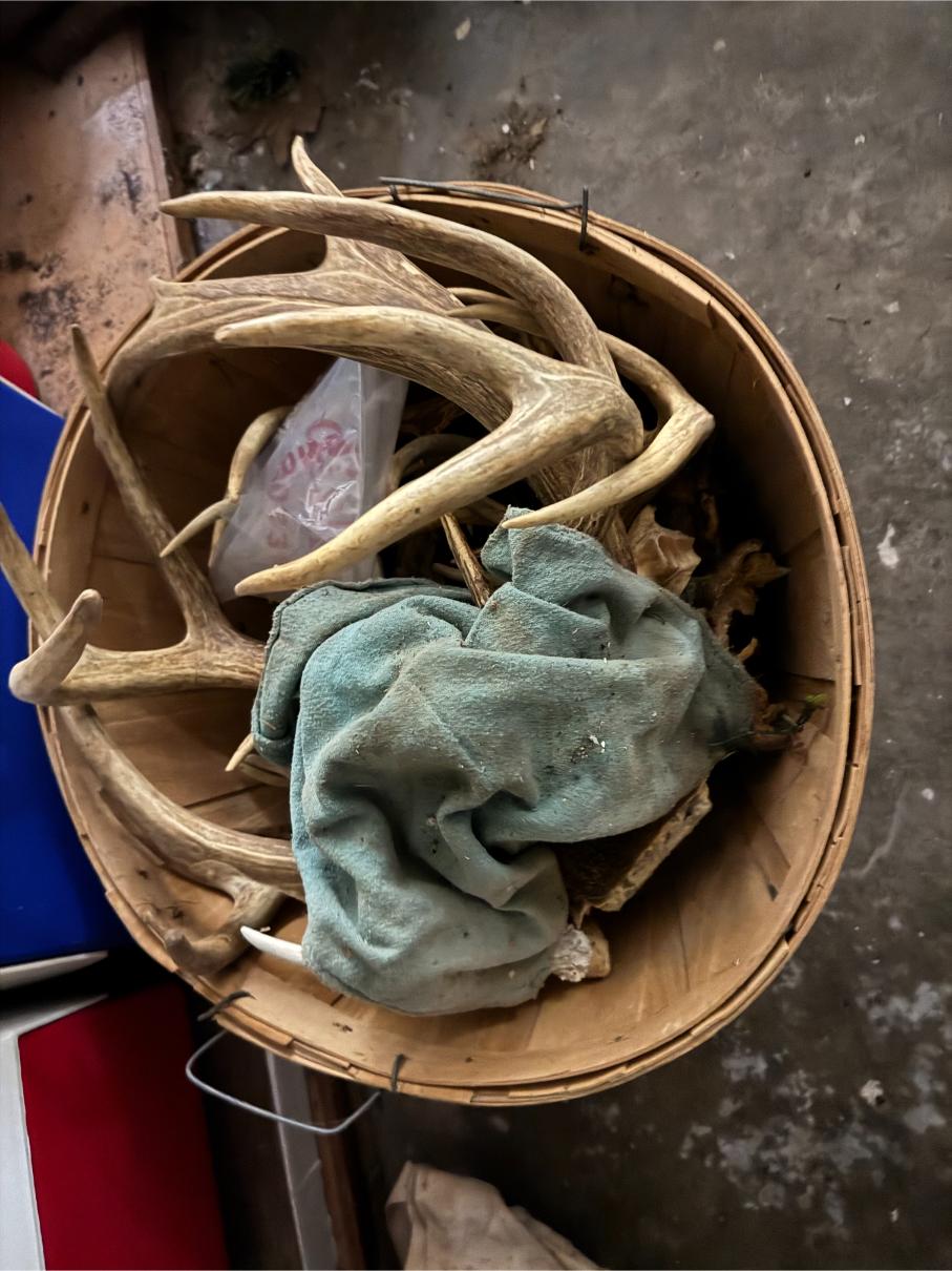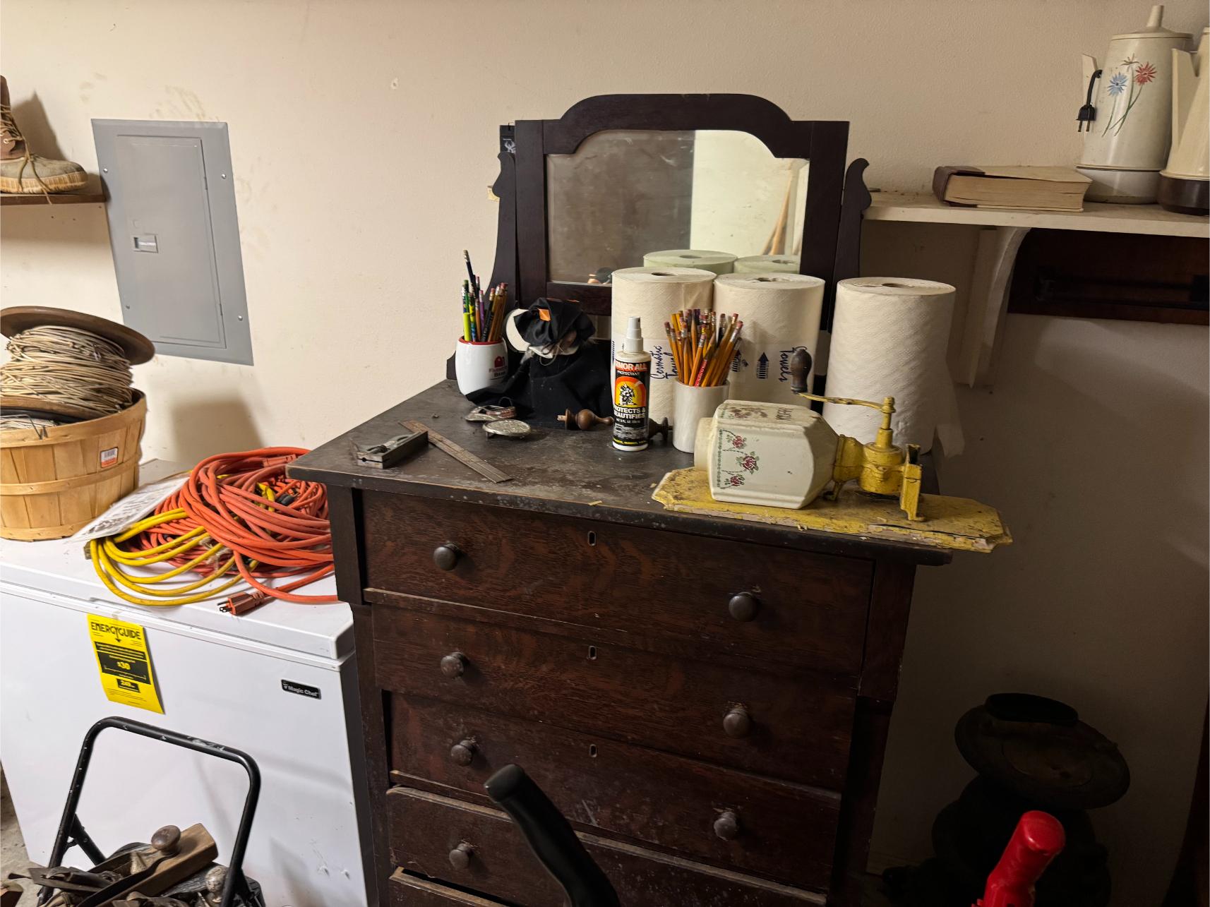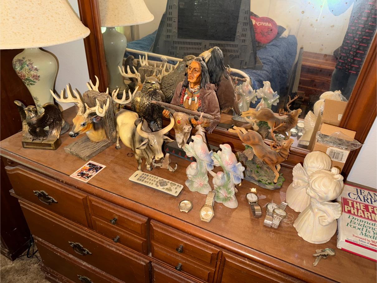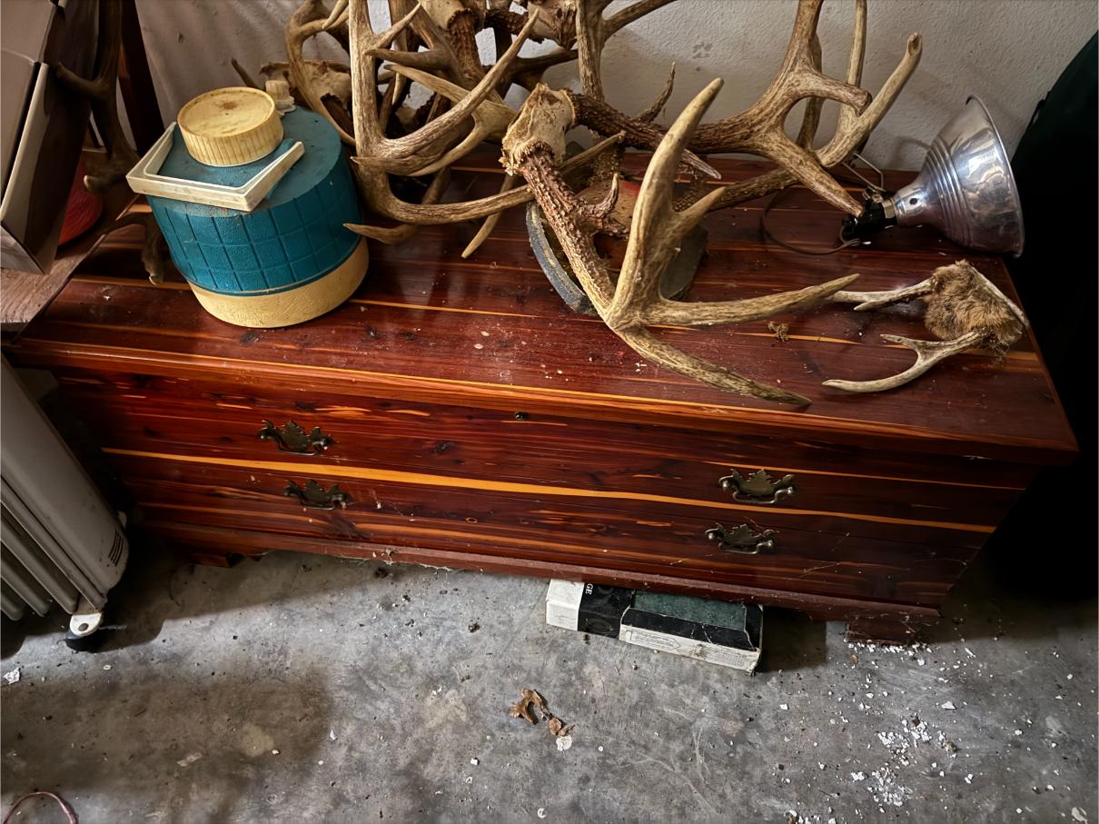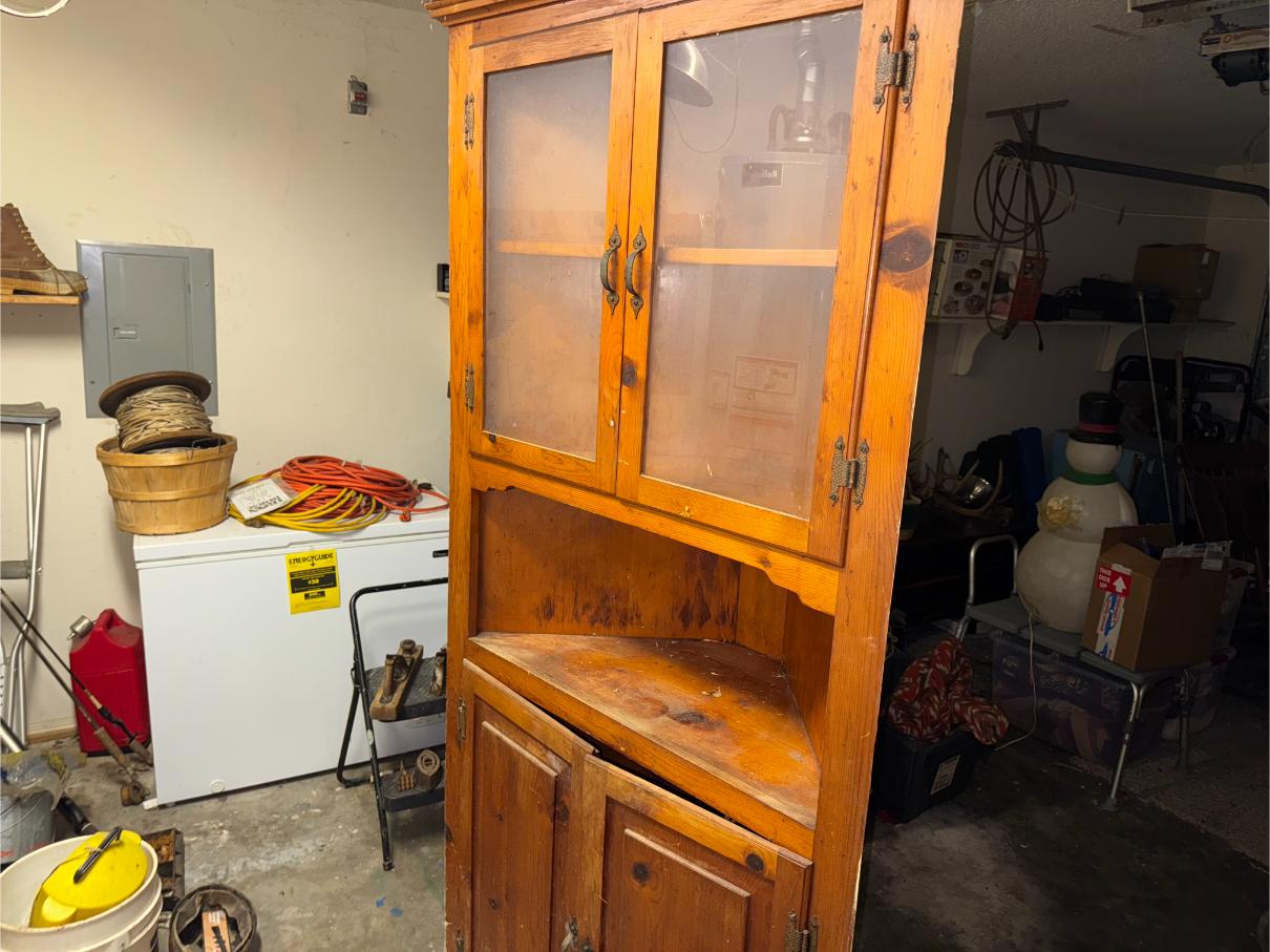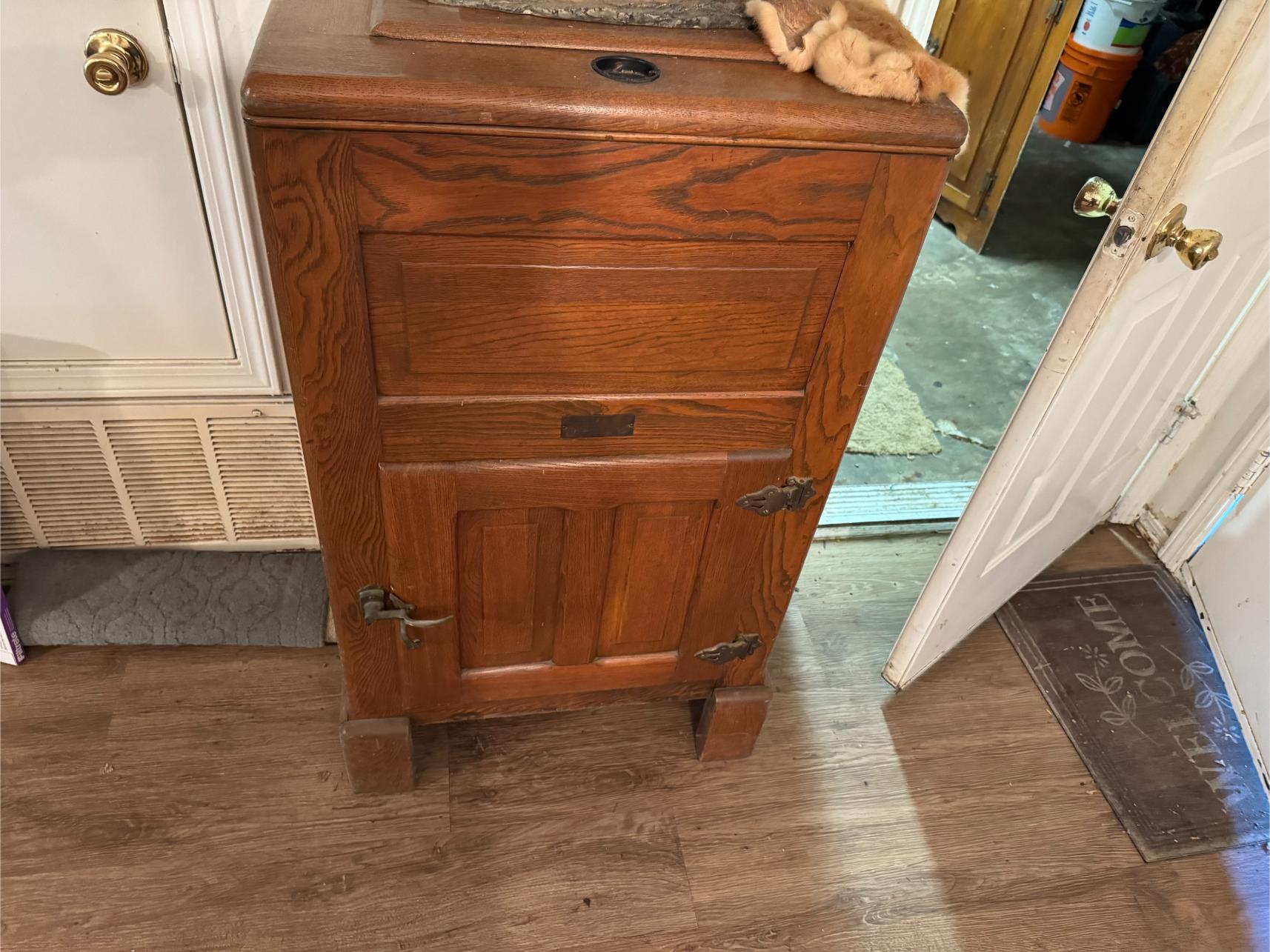 Antiques & Collectibles: Oak Dining Table & Chairs – Oak Ice Box – Regulator Wall Clock – Iron Bed – Maple Queen Size Bed, Dresser & Chest – Mahogany Chest – Tiger Oak Chest – Chairs – Cedar Chest – Pine Corner Cabinet – Hall Tree – Crank Wall Phone – Enamel Pans – Cast Iron Skillets, Corn Bread – Carnival Glass – Pyrex – Milk Glass – Deer Mount – Deer Antlers – Pipe Hawk – Figurines – Spurs – Fan – Tools – Small Cast Iron Stove – Peters & Remington Shot Gun Shells – 1-Man Saw
