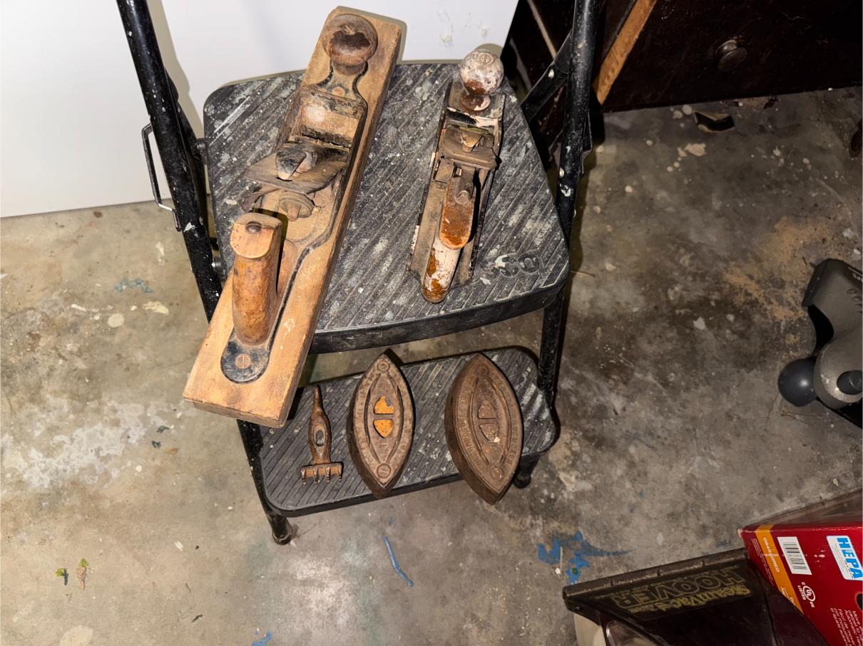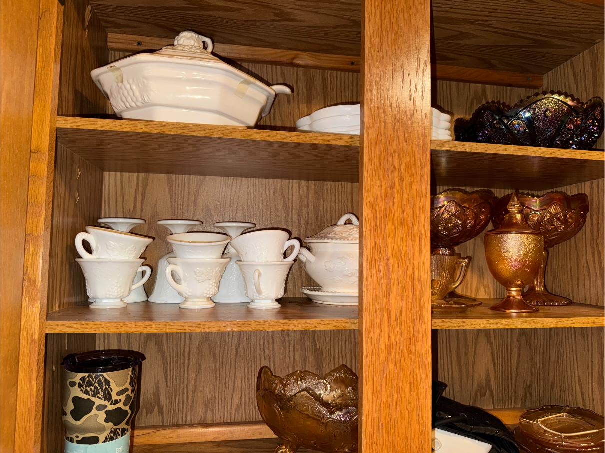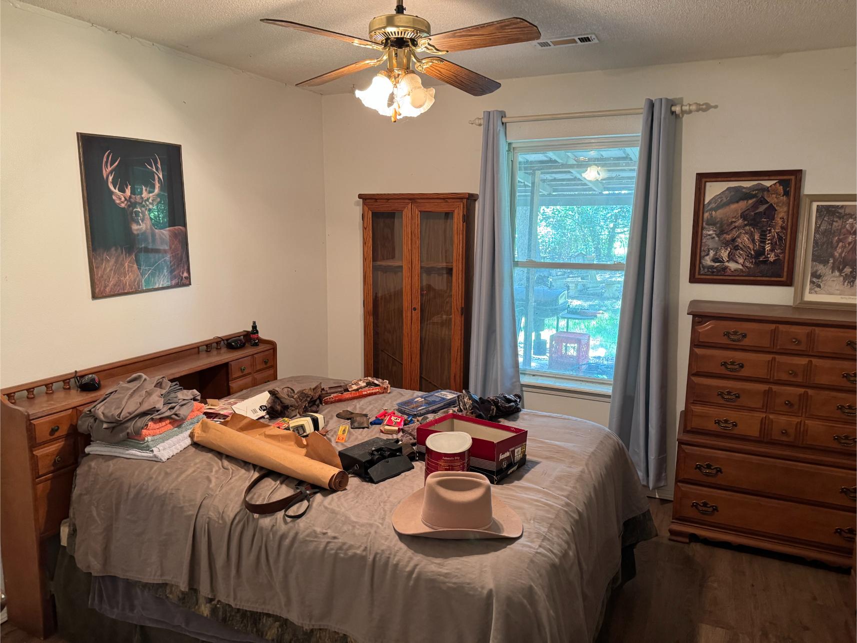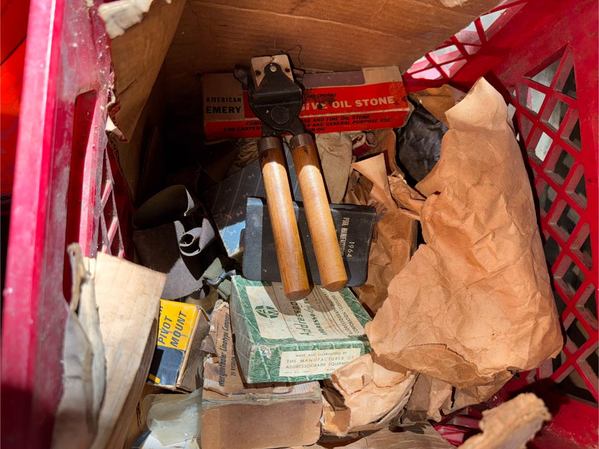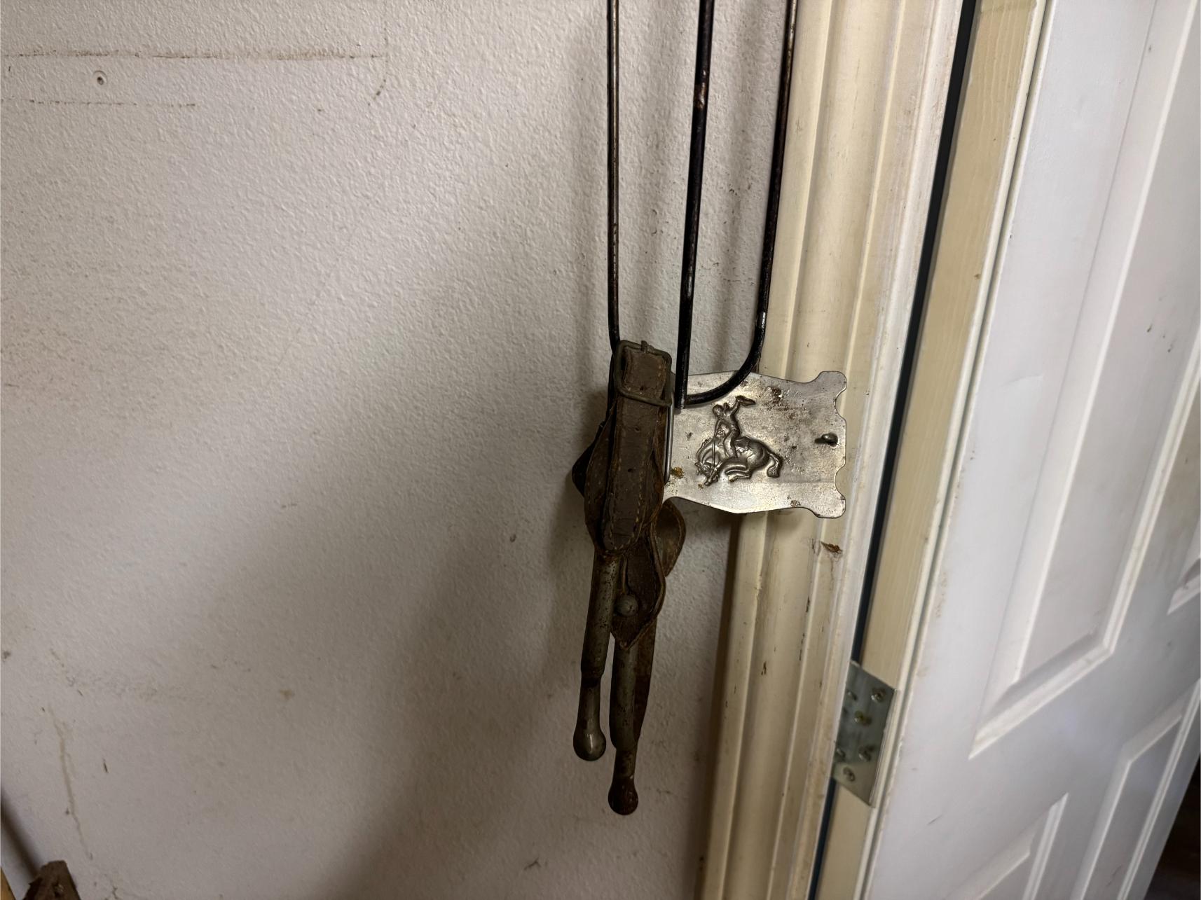 Antiques & Collectibles: Oak Dining Table & Chairs – Oak Ice Box – Regulator Wall Clock – Iron Bed – Maple Queen Size Bed, Dresser & Chest – Mahogany Chest – Tiger Oak Chest – Chairs – Cedar Chest – Pine Corner Cabinet – Hall Tree – Crank Wall Phone – Enamel Pans – Cast Iron Skillets, Corn Bread – Carnival Glass – Pyrex – Milk Glass – Deer Mount – Deer Antlers – Pipe Hawk – Figurines – Spurs – Fan – Tools – Small Cast Iron Stove – Peters & Remington Shot Gun Shells – 1-Man Saw