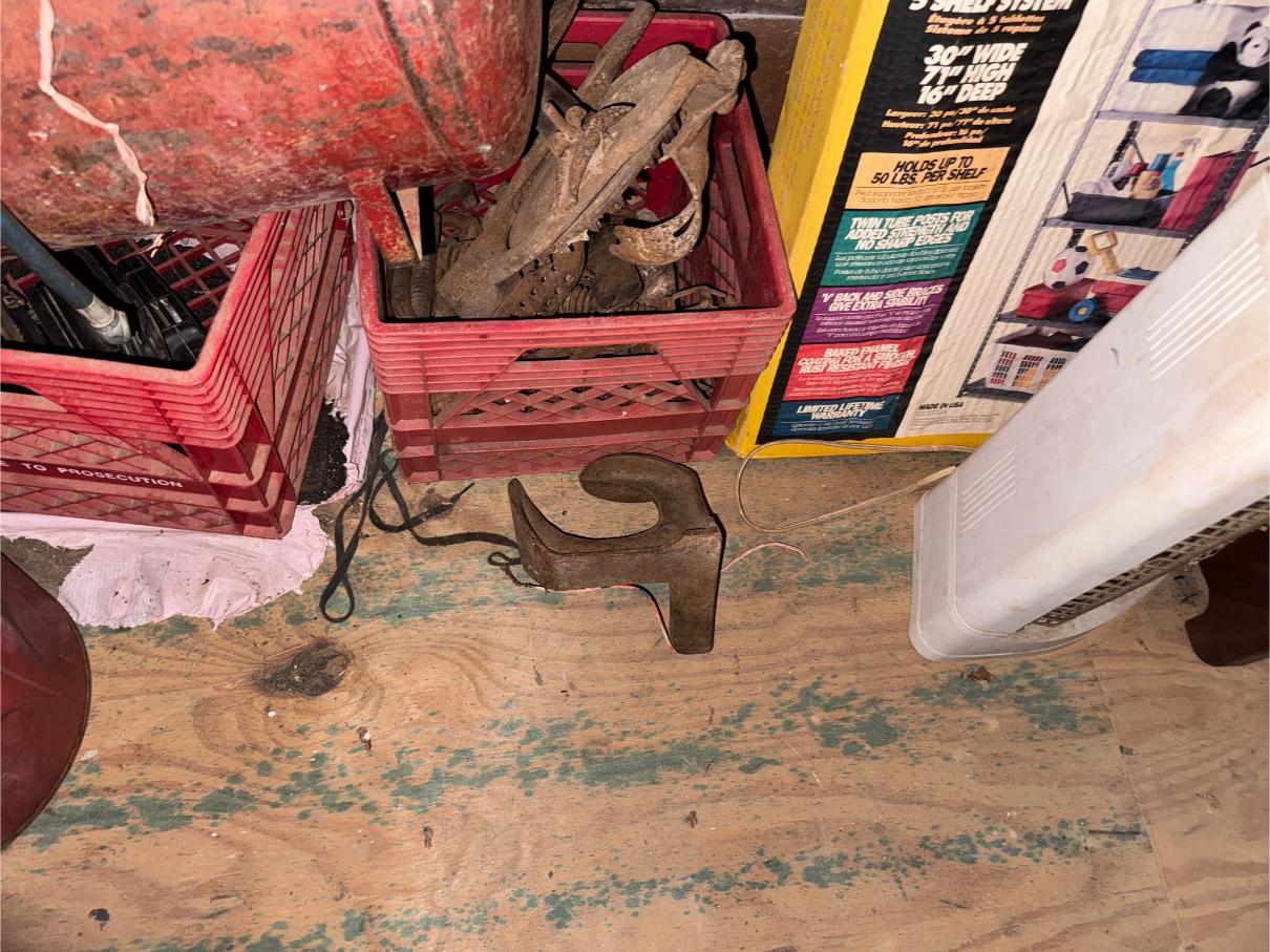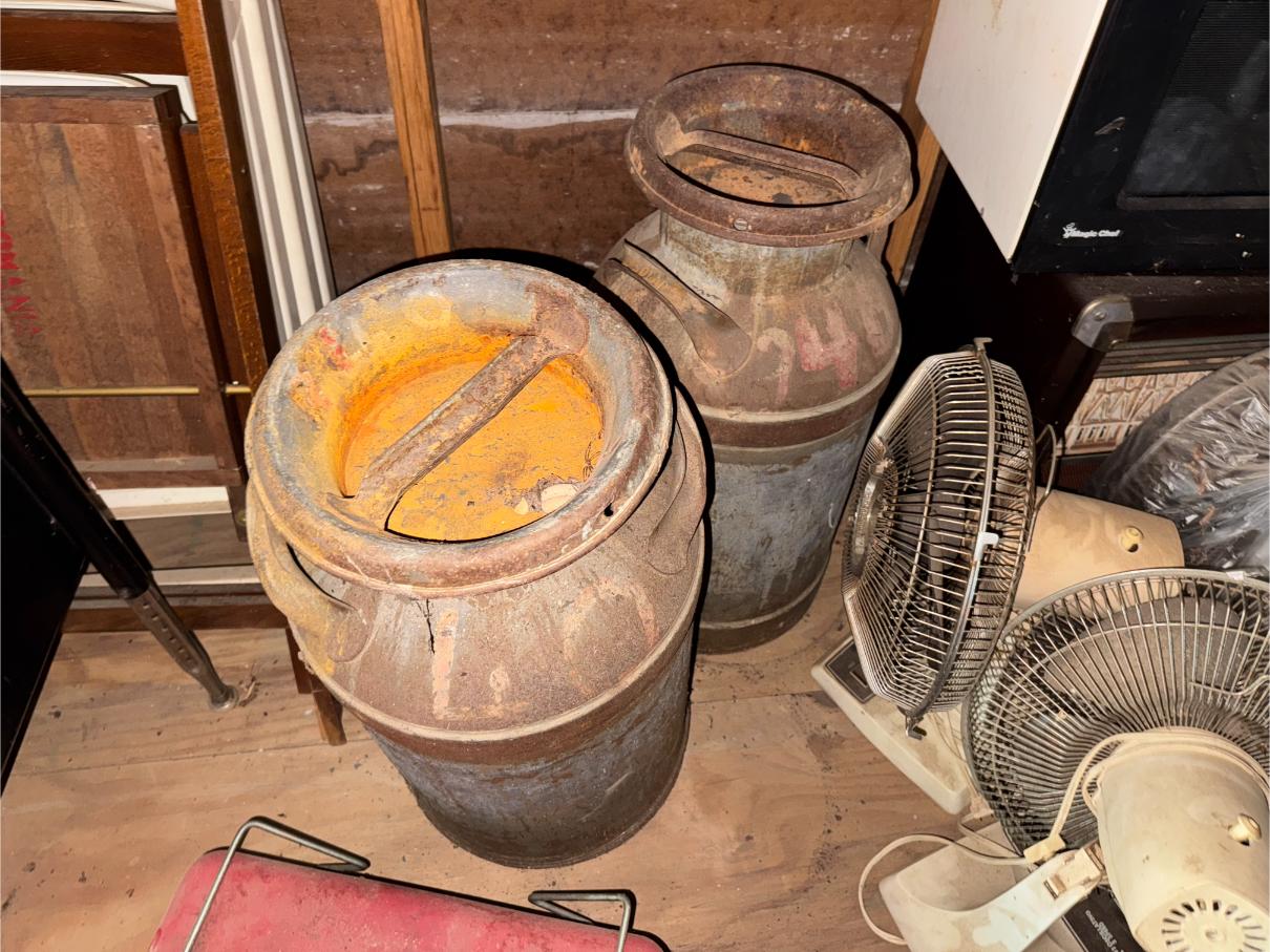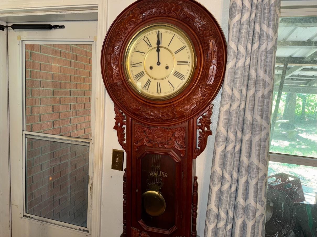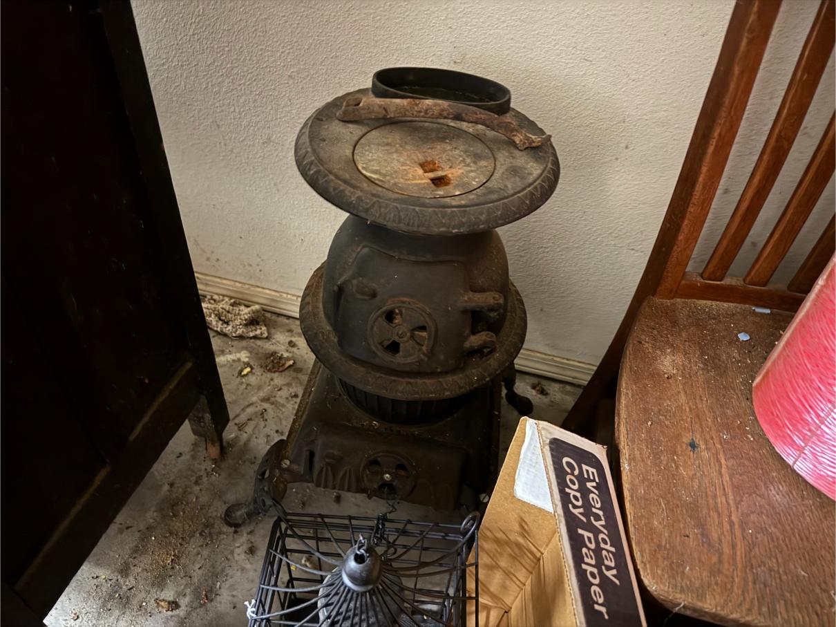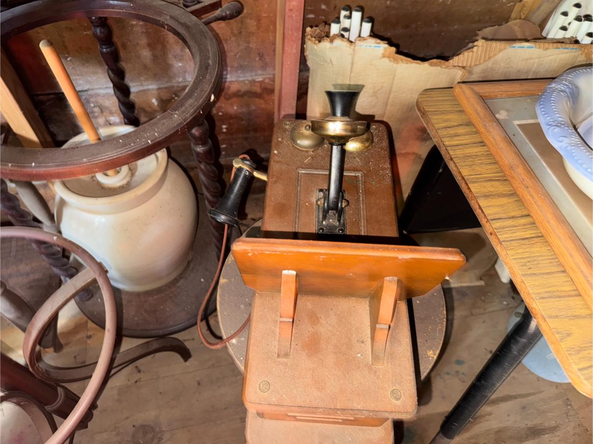 Antiques & Collectibles: Oak Dining Table & Chairs – Oak Ice Box – Regulator Wall Clock – Iron Bed – Maple Queen Size Bed, Dresser & Chest – Mahogany Chest – Tiger Oak Chest – Chairs – Cedar Chest – Pine Corner Cabinet – Hall Tree – Crank Wall Phone – Enamel Pans – Cast Iron Skillets, Corn Bread – Carnival Glass – Pyrex – Milk Glass – Deer Mount – Deer Antlers – Pipe Hawk – Figurines – Spurs – Fan – Tools – Small Cast Iron Stove – Peters & Remington Shot Gun Shells – 1-Man Saw