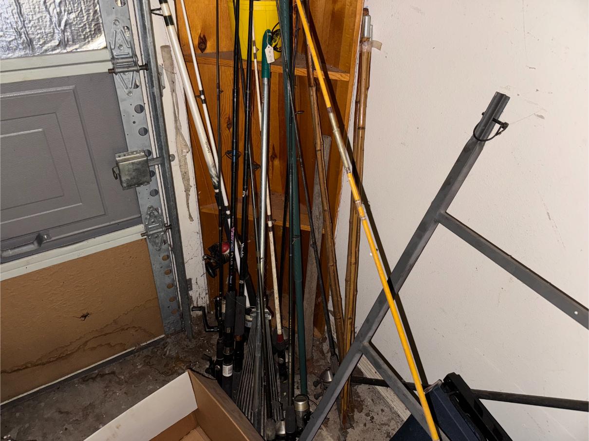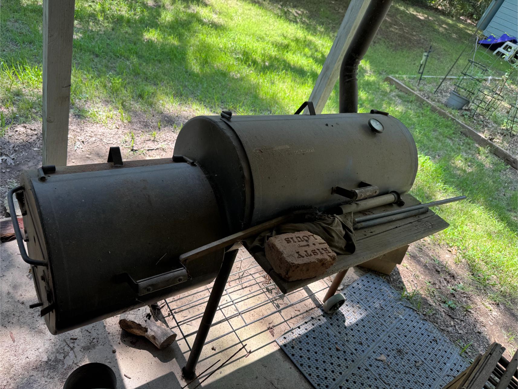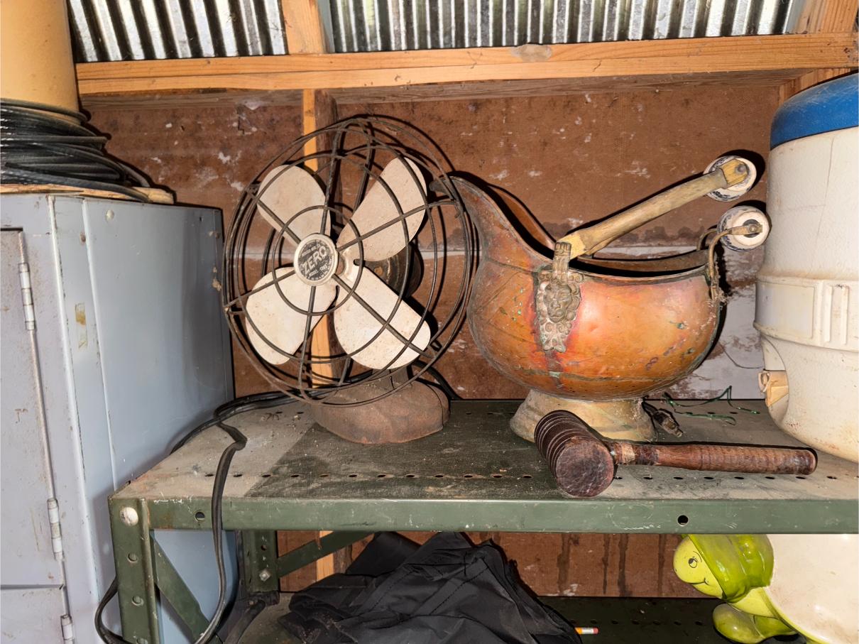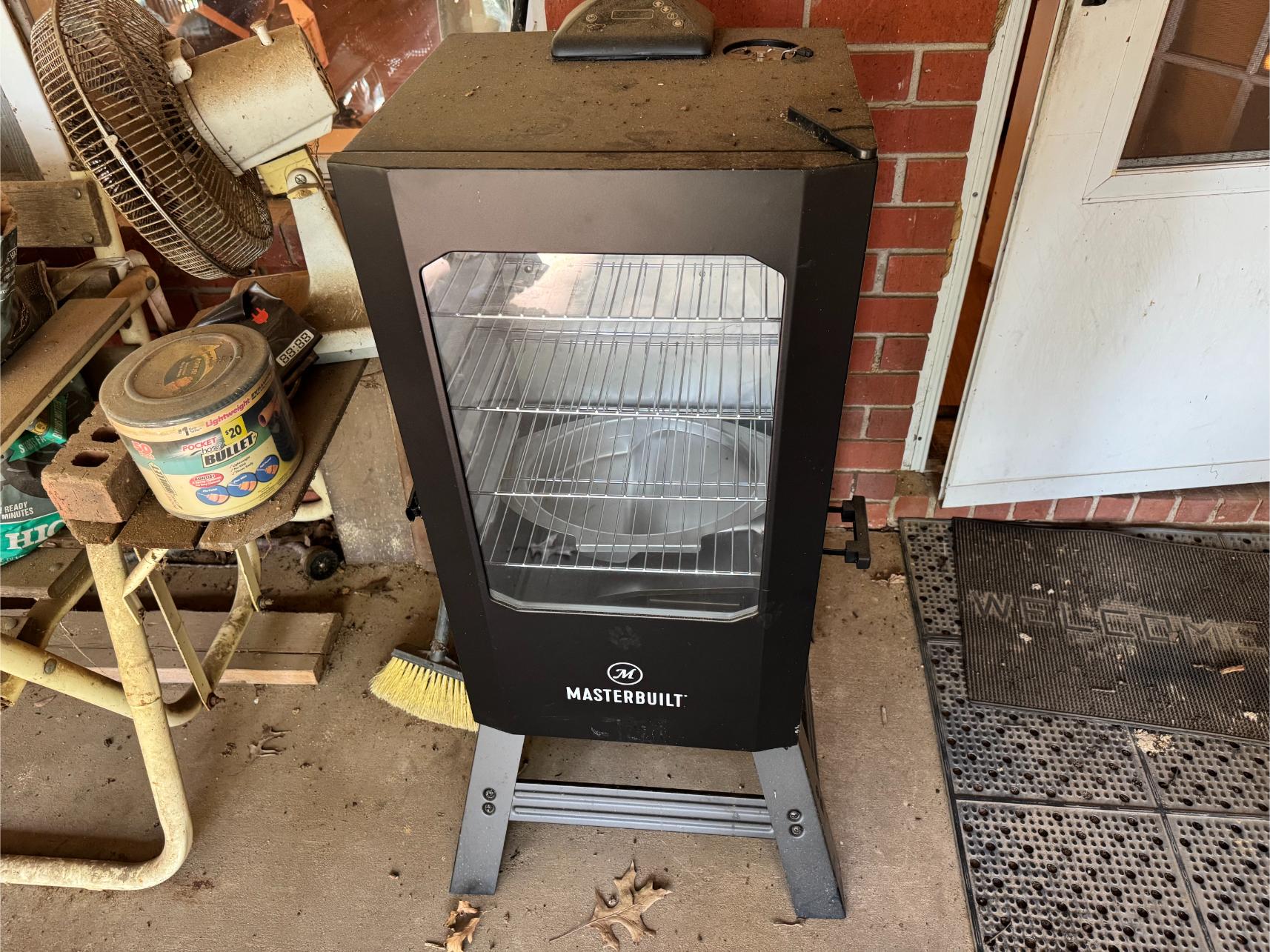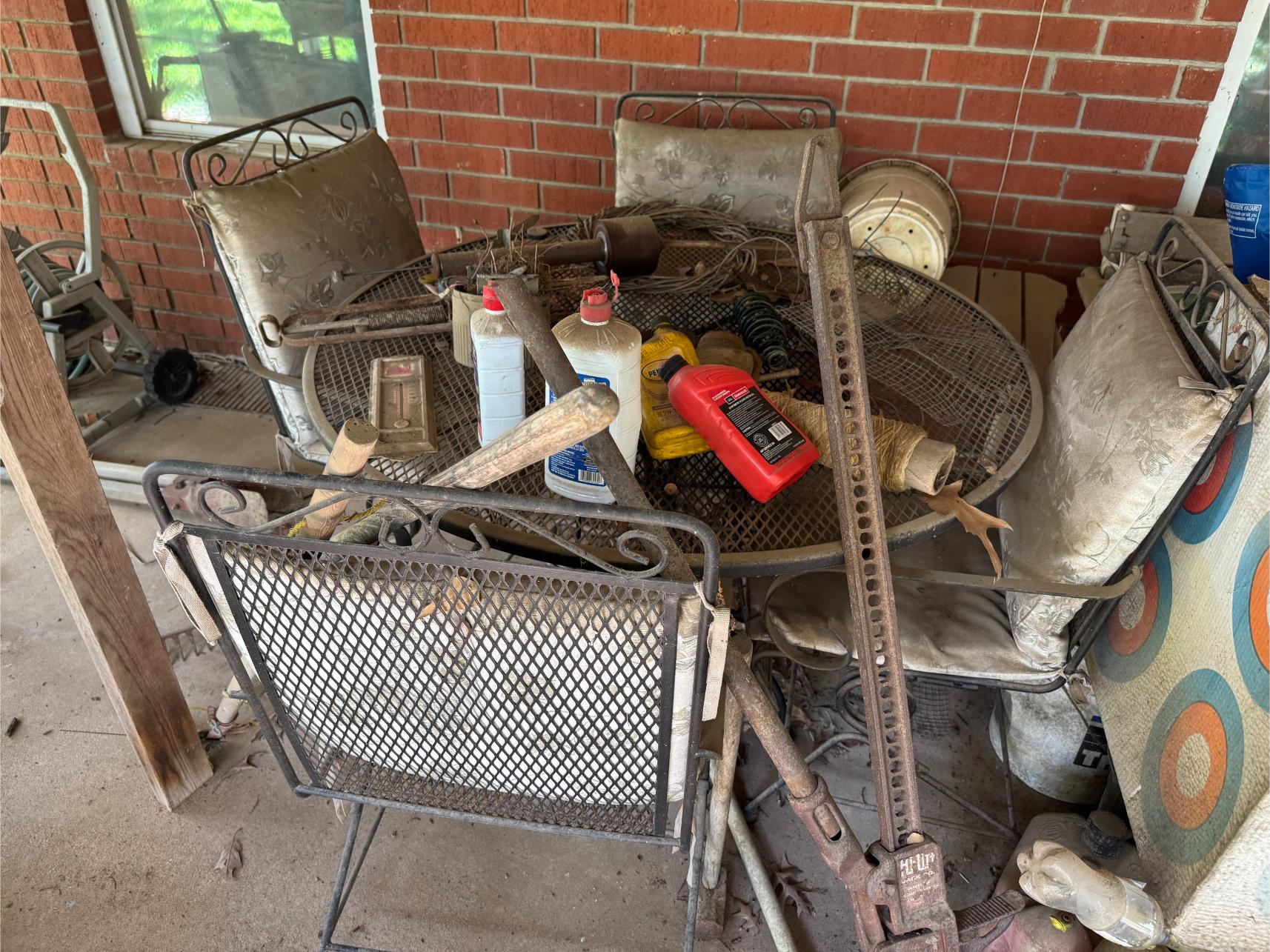 And: Coleman Powermate Generator (New) – Masterbuilt Smoker (New) – Lg Smoker – Metal Lockers – Heaters – Fiberglass Ext Ladder – Alum Ladder – Yard Tools – Hand Tools – Dolly – Chiminea – Wrought Iron Patio Table & Chairs – Picnic Table – Rods & Reels – Boat Oars – Metal Shelves – Coleman Lantern – Feed Trough – Misc Lumber
