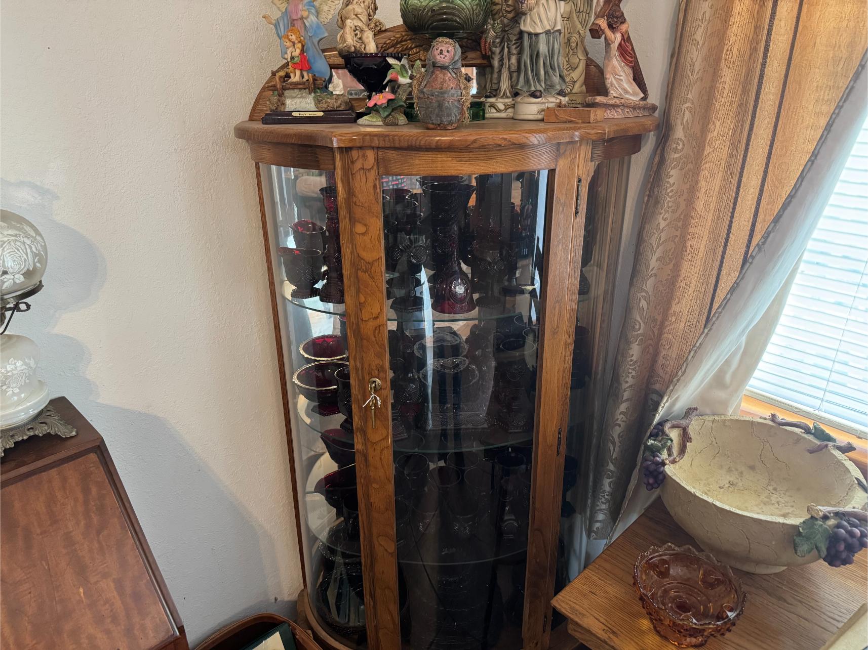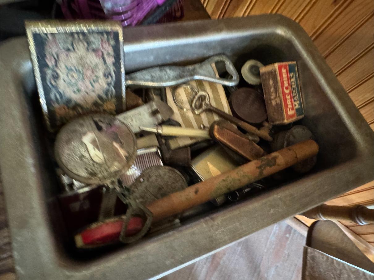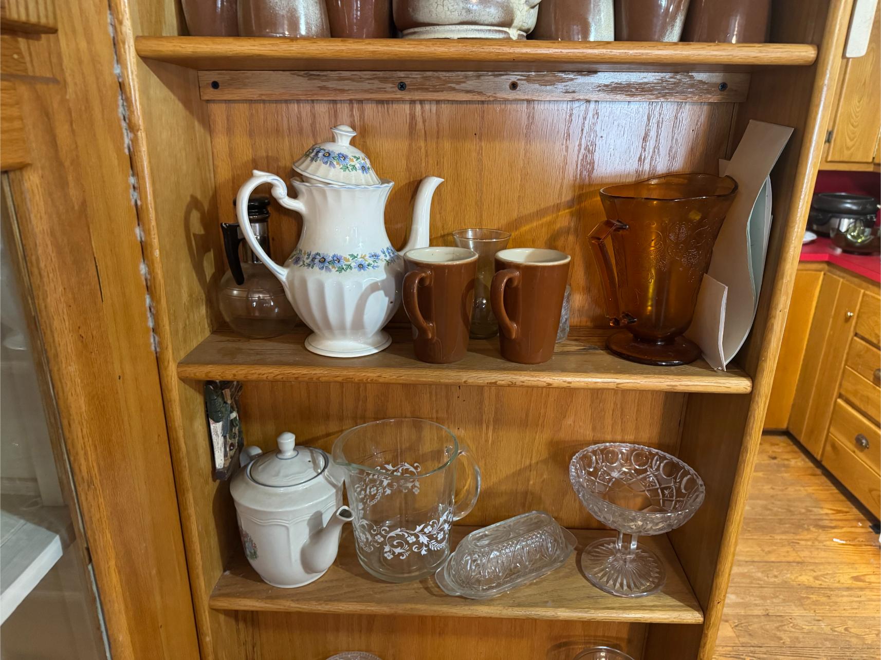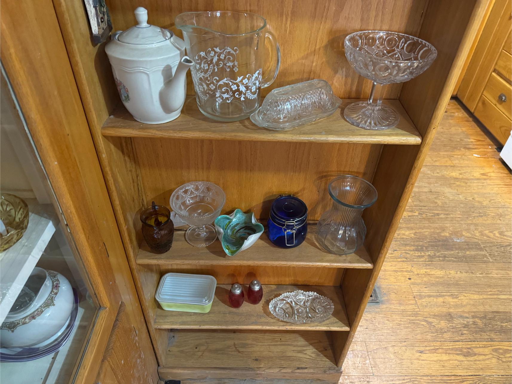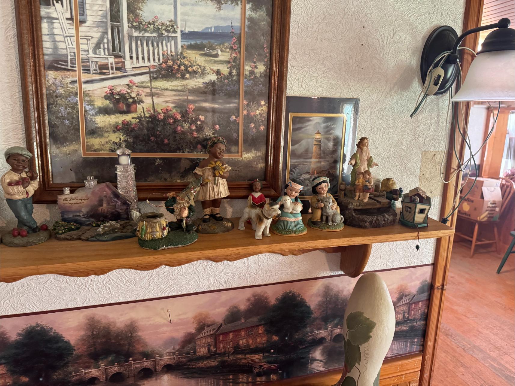 Antiques & Collectibles: Oak Bow Front Hutch – Buffet – Oak Center Tables – Secretarial – Oak Chair – Gossip Bench – Oak Dresser & Chest – Mantle Clock – Cape Cod – Figurines – Cast Iron Skillets & Kettles – #6 Crock – Fire King – Carnival – Corelle – Milk Glass – Cut Glass – Clear Glass – Cartoon Glasses – Cake Plates – Misc Glassware – Enamel Ware – Sad Irons – View Master Junior Projector – Ceramic Christmas Tree – Collector Plates – Marbles – Jewelry – Quilt – Water Heater – Scales – Ice Tongs – Lantern – Bottles