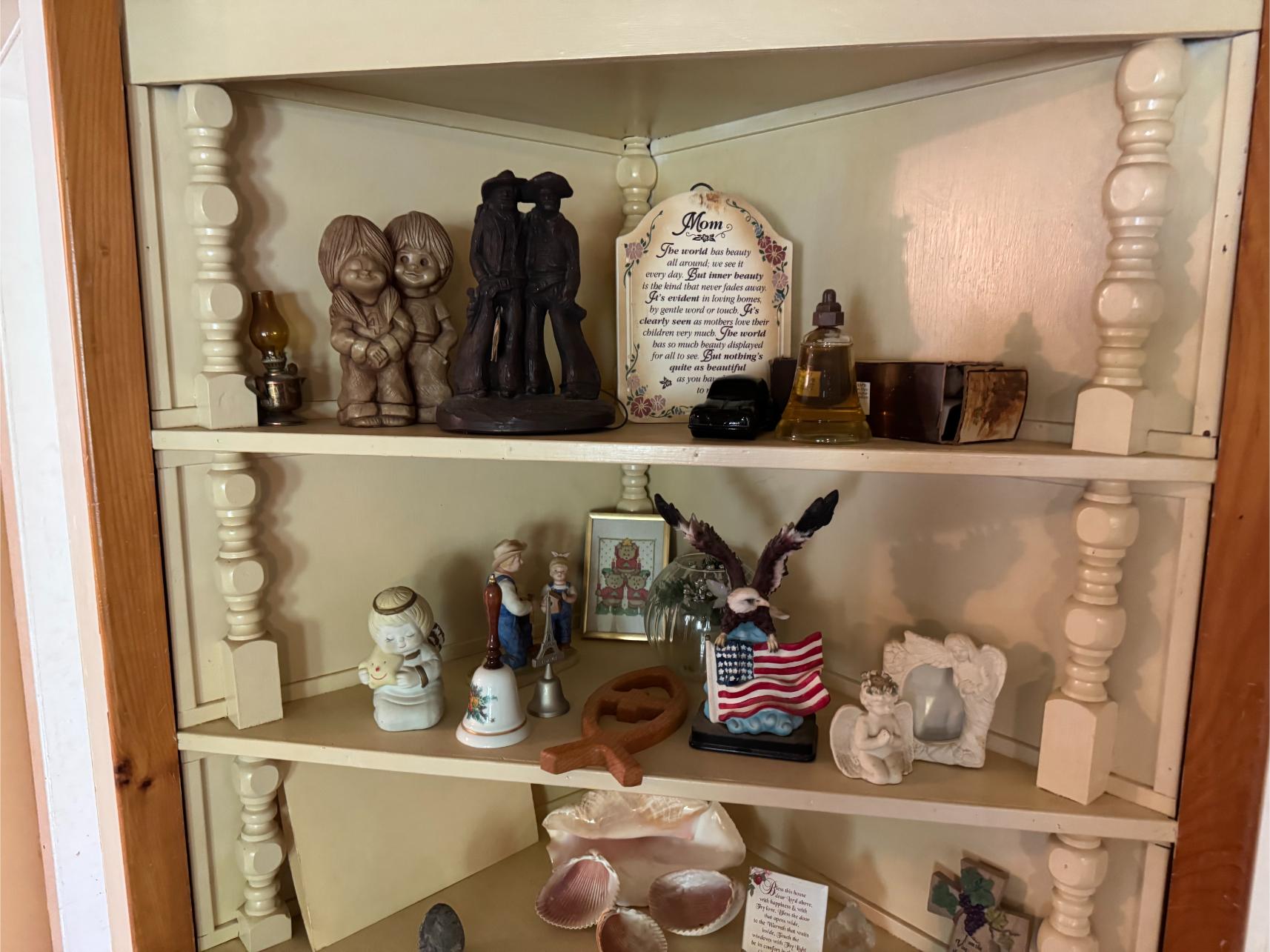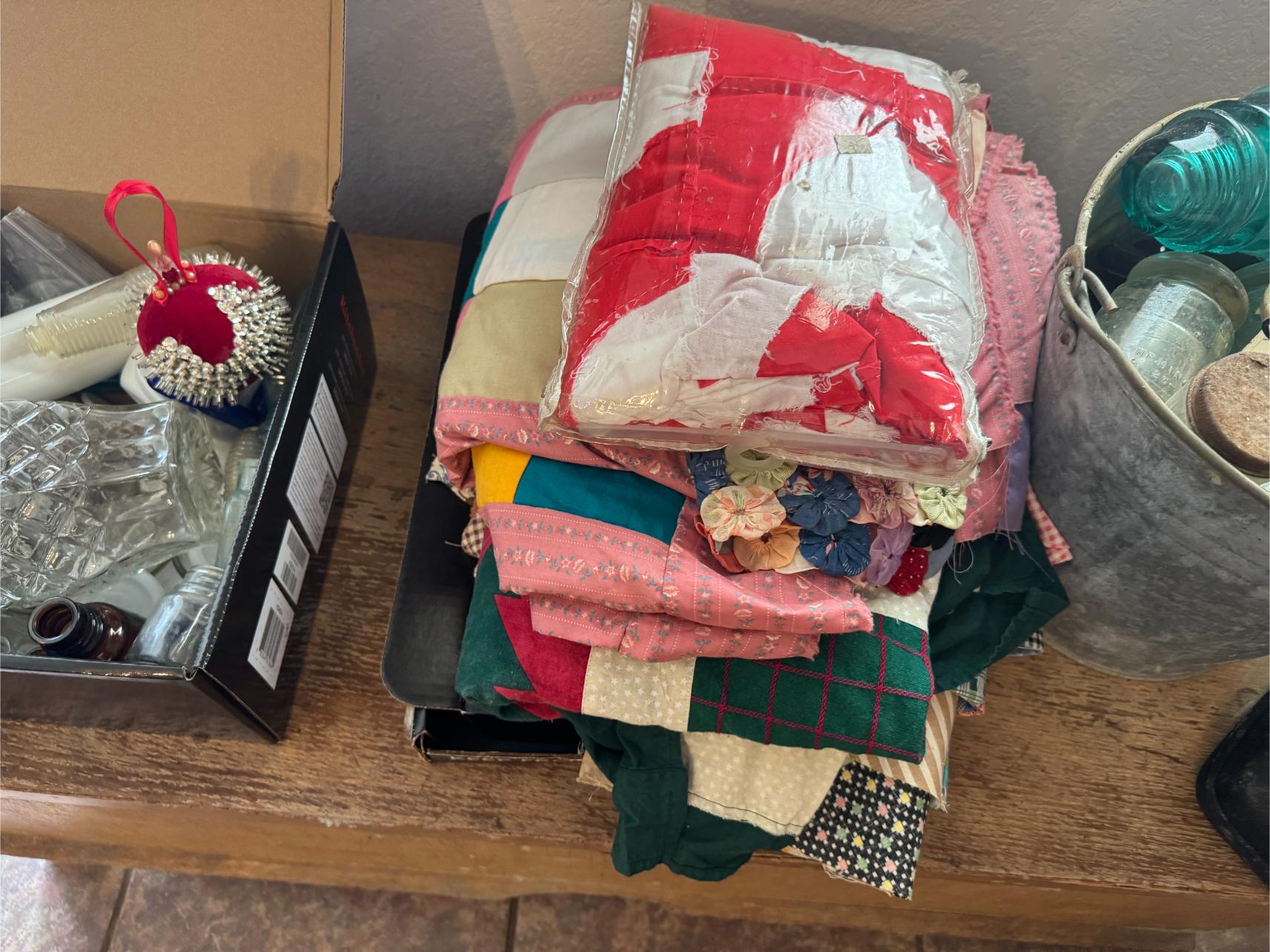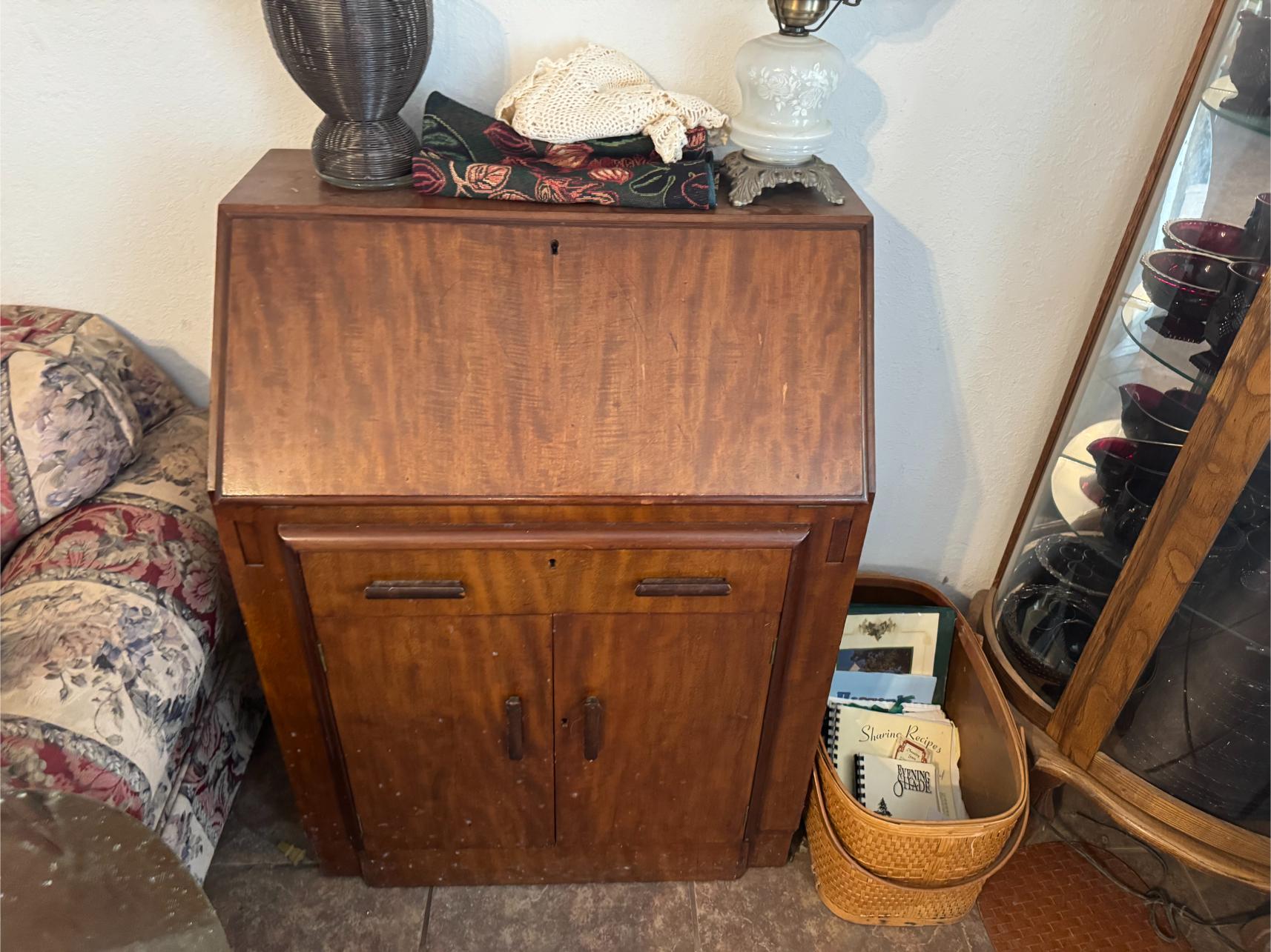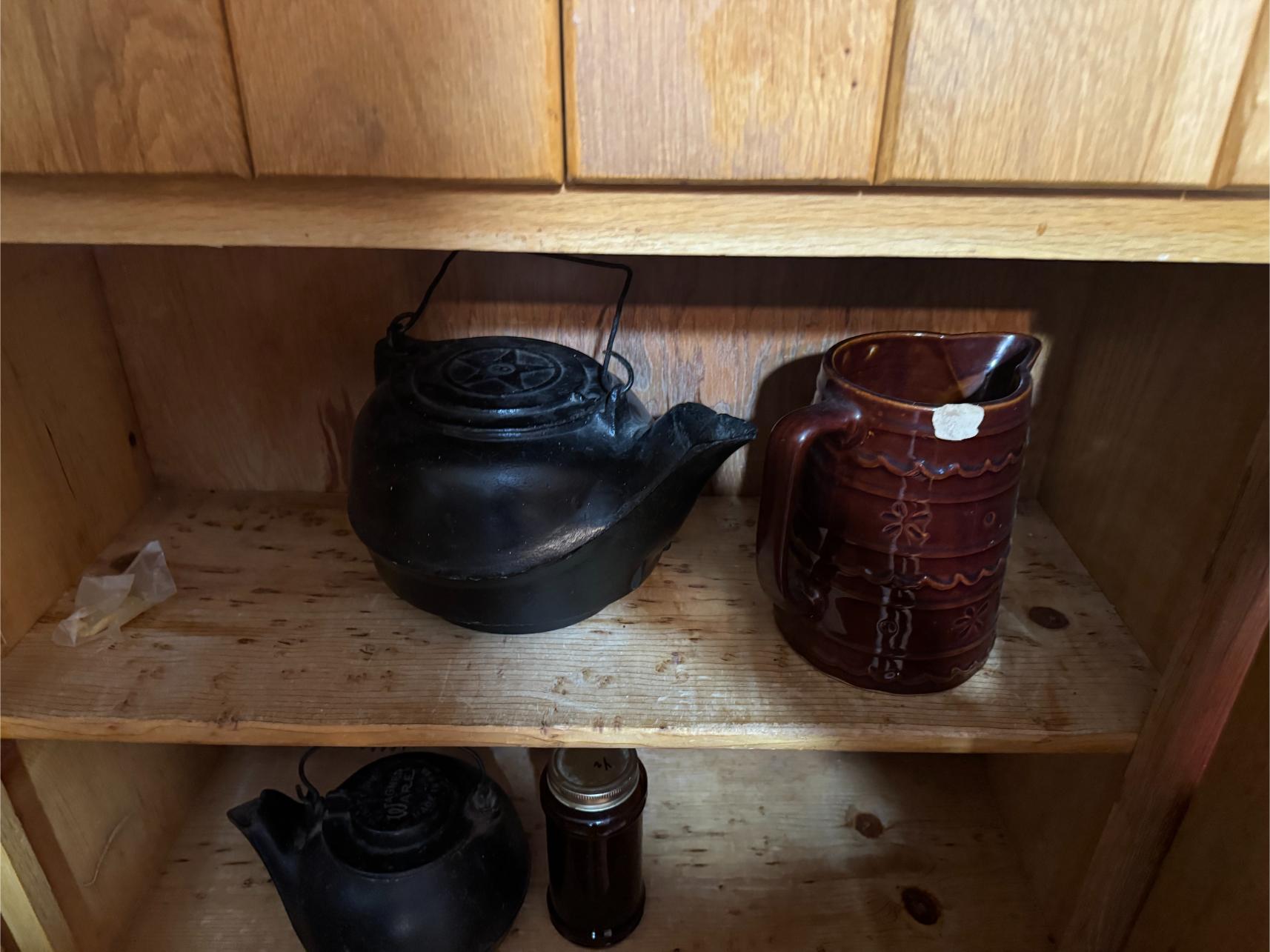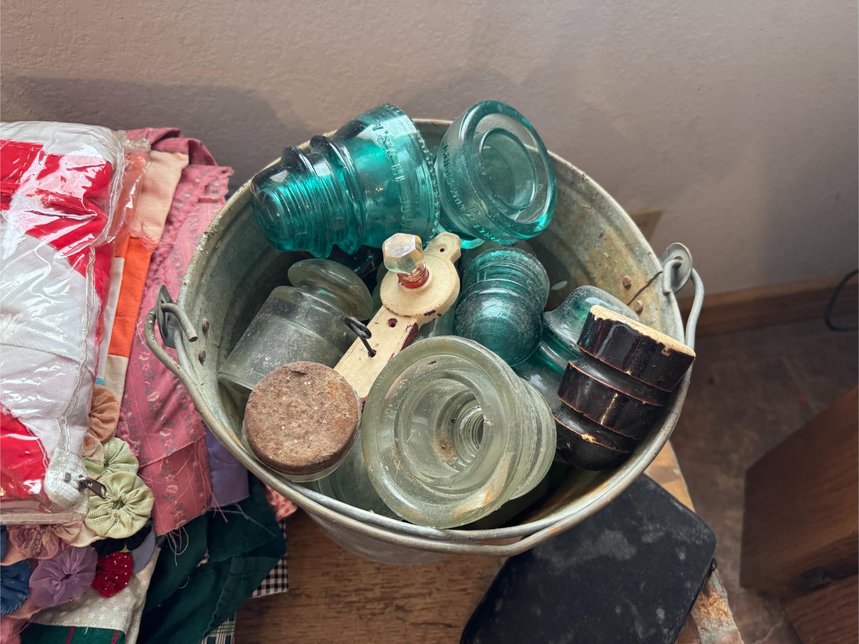 Antiques & Collectibles: Oak Bow Front Hutch – Buffet – Oak Center Tables – Secretarial – Oak Chair – Gossip Bench – Oak Dresser & Chest – Mantle Clock – Cape Cod – Figurines – Cast Iron Skillets & Kettles – #6 Crock – Fire King – Carnival – Corelle – Milk Glass – Cut Glass – Clear Glass – Cartoon Glasses – Cake Plates – Misc Glassware – Enamel Ware – Sad Irons – View Master Junior Projector – Ceramic Christmas Tree – Collector Plates – Marbles – Jewelry – Quilt – Water Heater – Scales – Ice Tongs – Lantern – Bottles