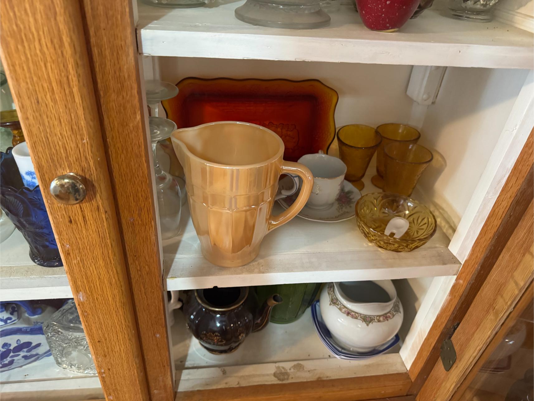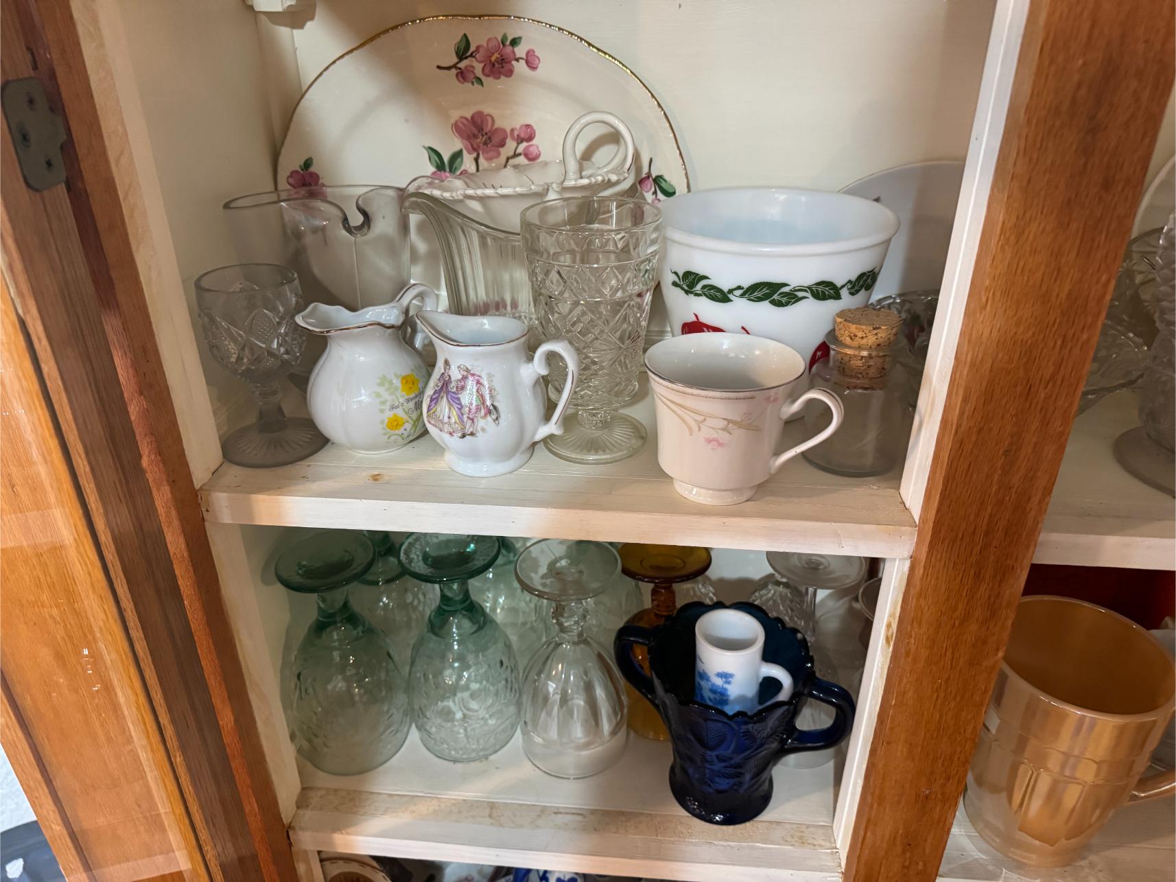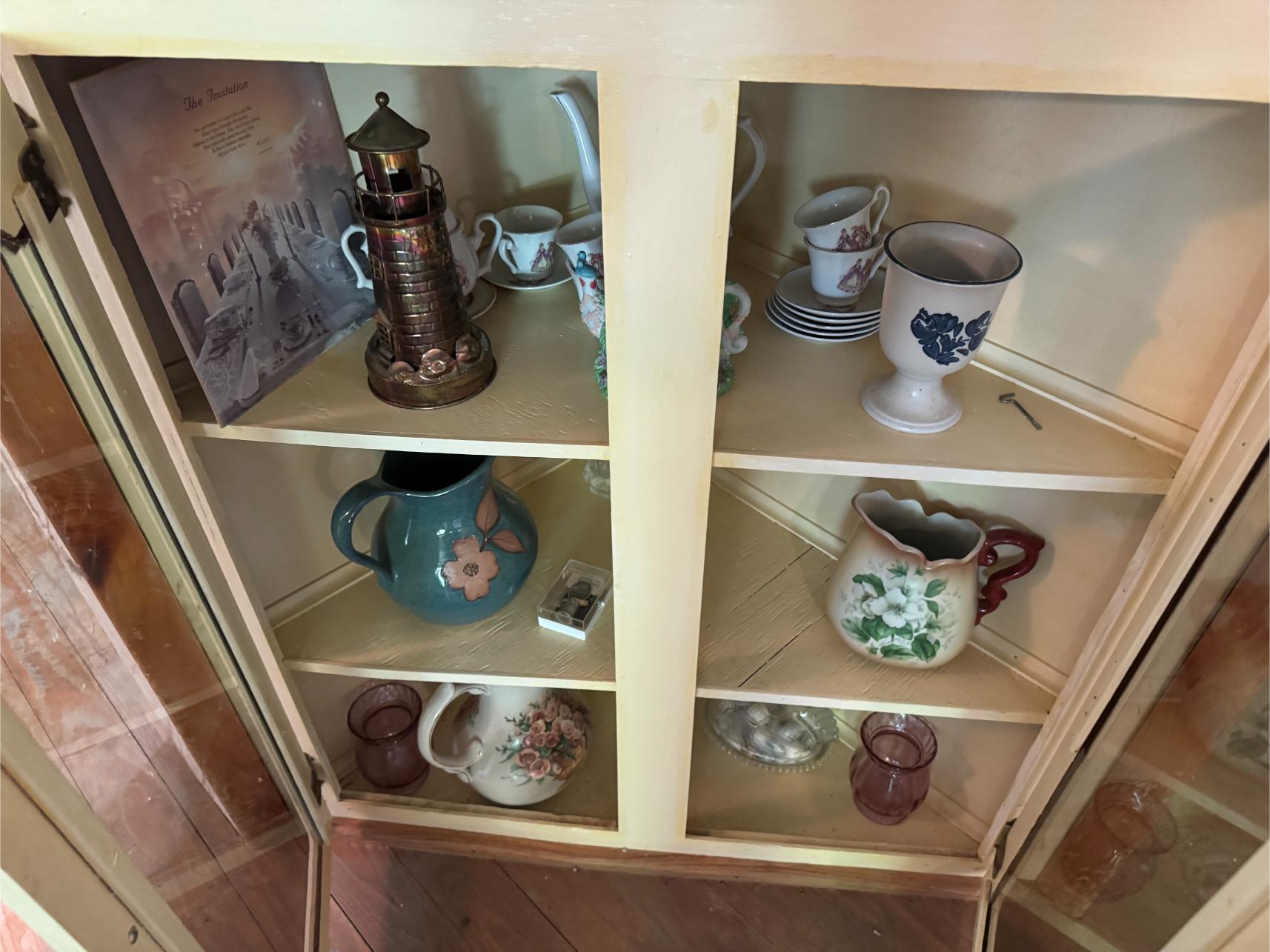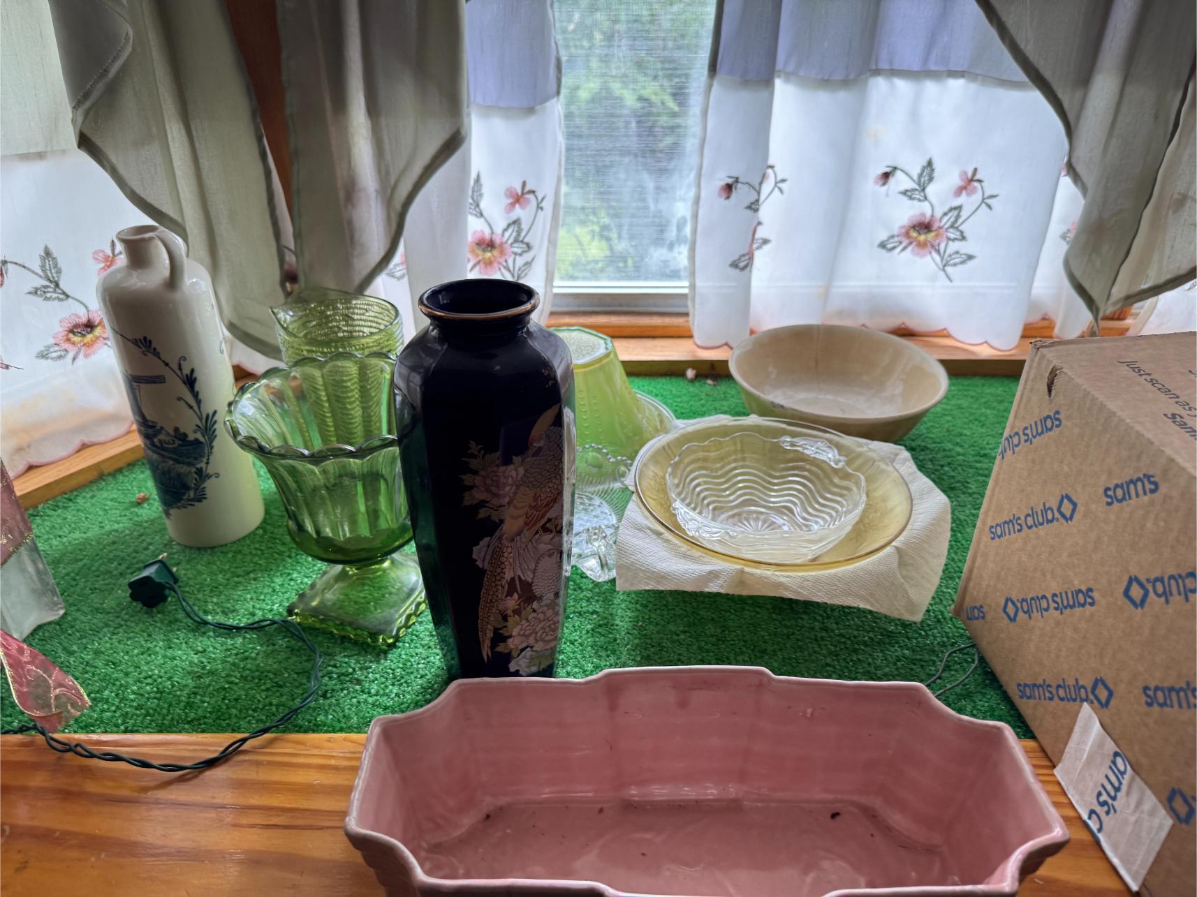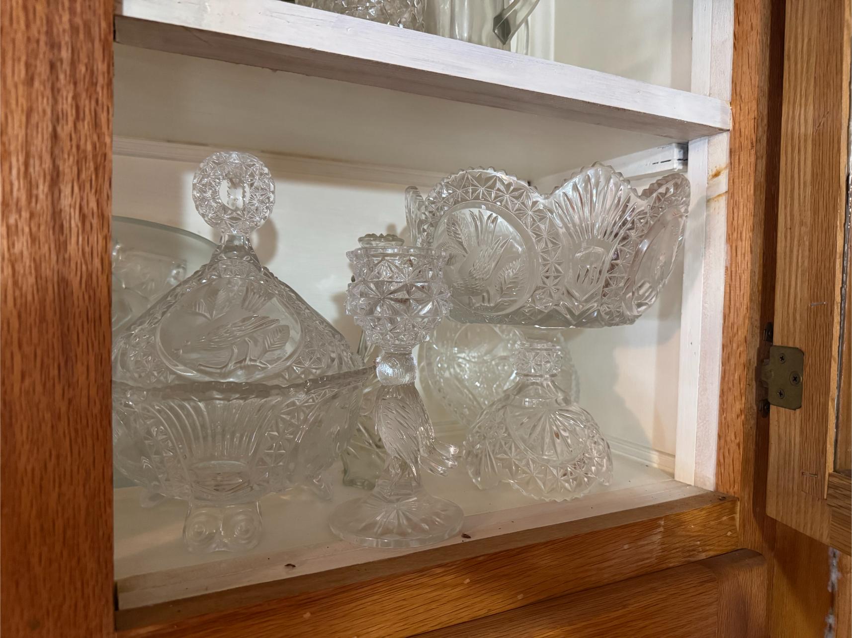 Antiques & Collectibles: Oak Bow Front Hutch – Buffet – Oak Center Tables – Secretarial – Oak Chair – Gossip Bench – Oak Dresser & Chest – Mantle Clock – Cape Cod – Figurines – Cast Iron Skillets & Kettles – #6 Crock – Fire King – Carnival – Corelle – Milk Glass – Cut Glass – Clear Glass – Cartoon Glasses – Cake Plates – Misc Glassware – Enamel Ware – Sad Irons – View Master Junior Projector – Ceramic Christmas Tree – Collector Plates – Marbles – Jewelry – Quilt – Water Heater – Scales – Ice Tongs – Lantern – Bottles