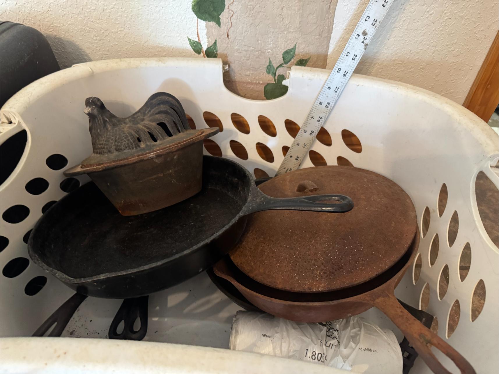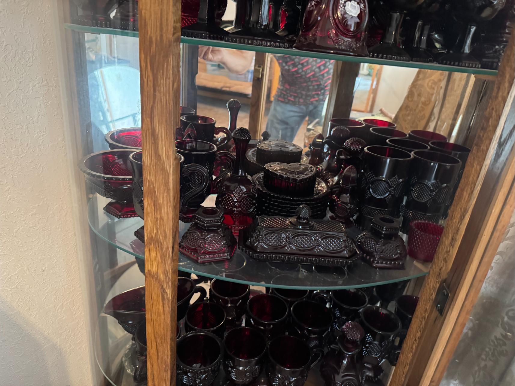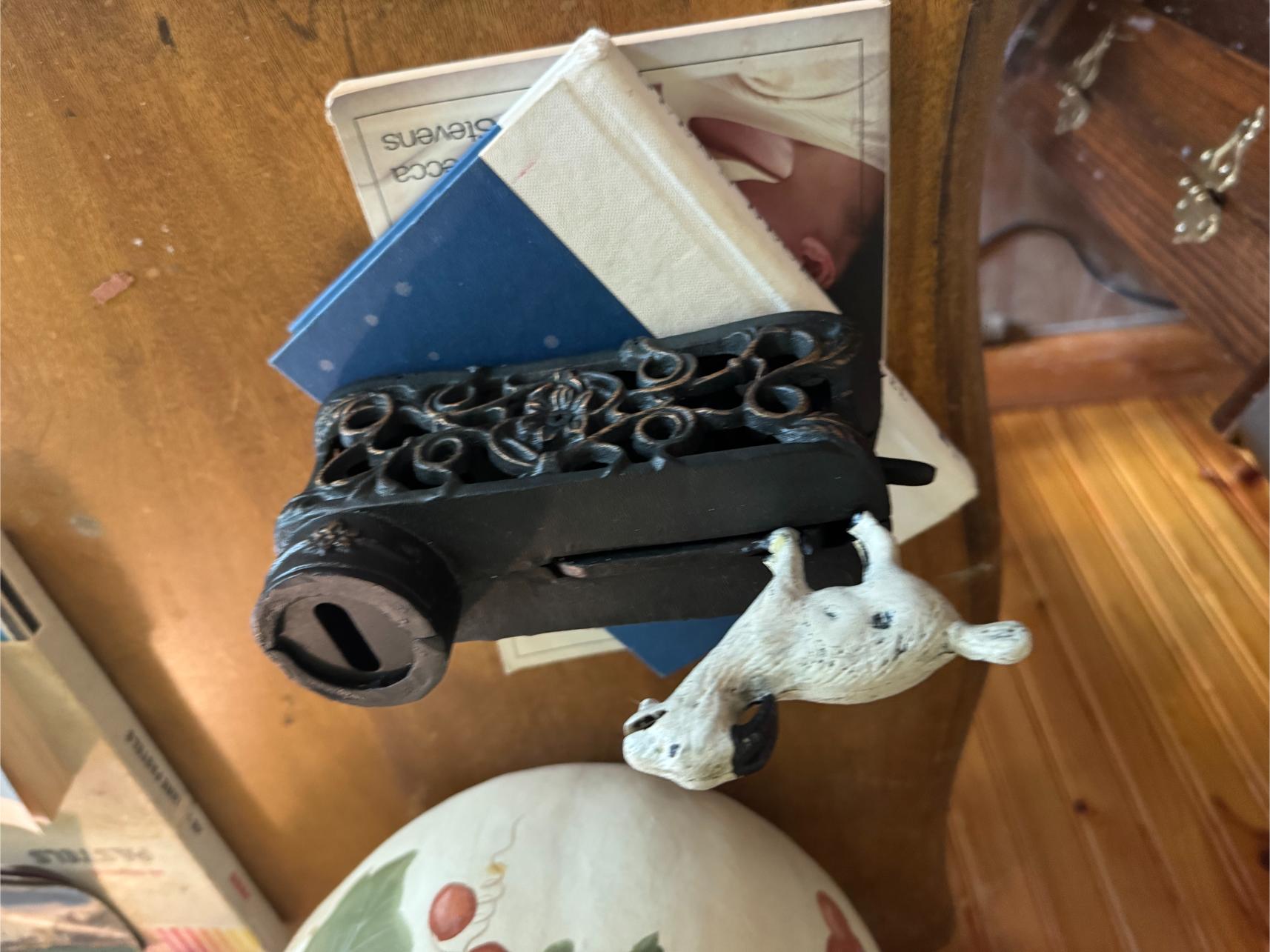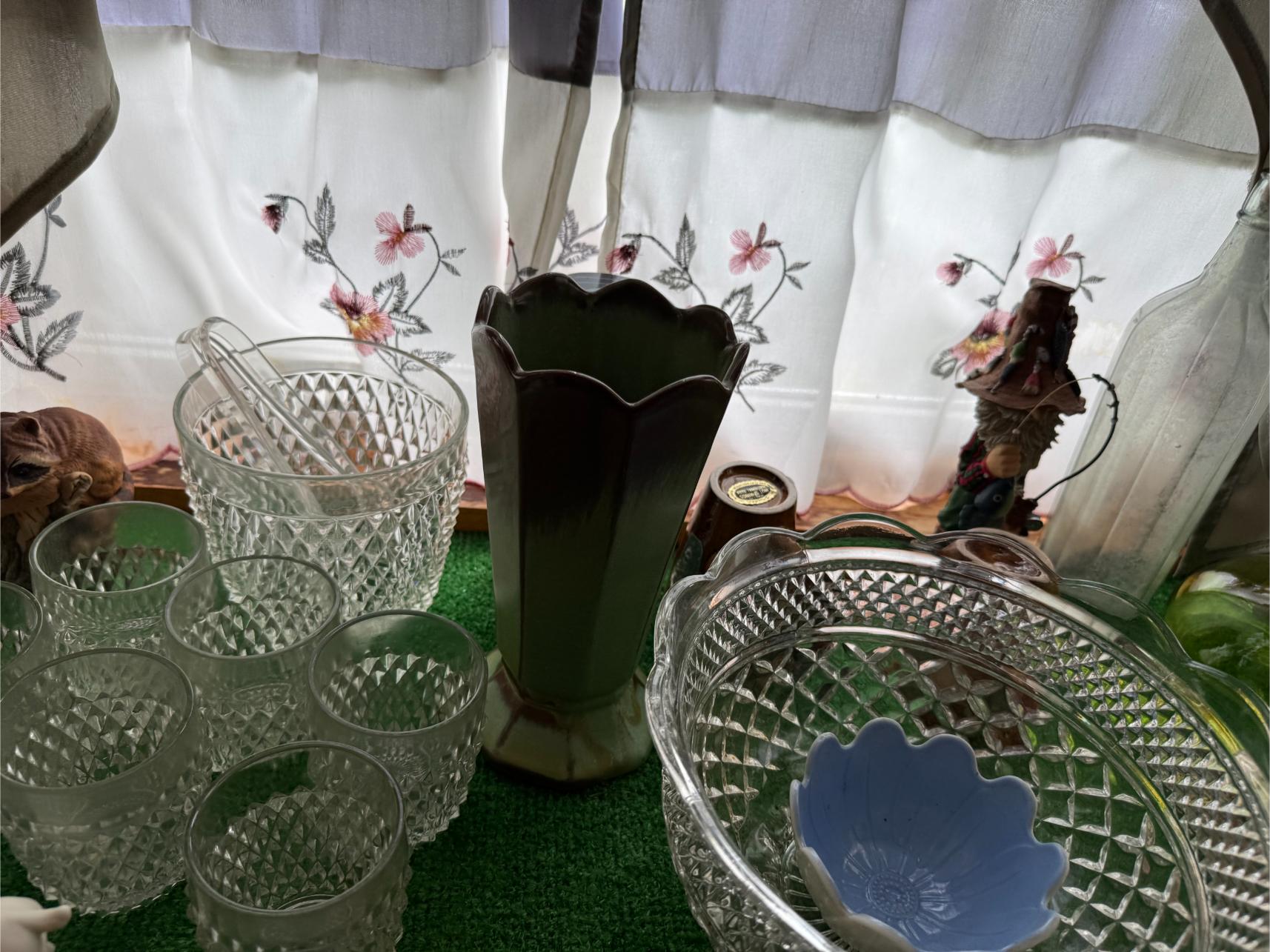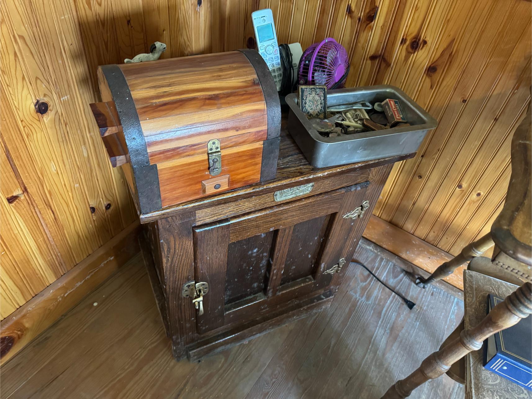 Antiques & Collectibles: Oak Bow Front Hutch – Buffet – Oak Center Tables – Secretarial – Oak Chair – Gossip Bench – Oak Dresser & Chest – Mantle Clock – Cape Cod – Figurines – Cast Iron Skillets & Kettles – #6 Crock – Fire King – Carnival – Corelle – Milk Glass – Cut Glass – Clear Glass – Cartoon Glasses – Cake Plates – Misc Glassware – Enamel Ware – Sad Irons – View Master Junior Projector – Ceramic Christmas Tree – Collector Plates – Marbles – Jewelry – Quilt – Water Heater – Scales – Ice Tongs – Lantern – Bottles