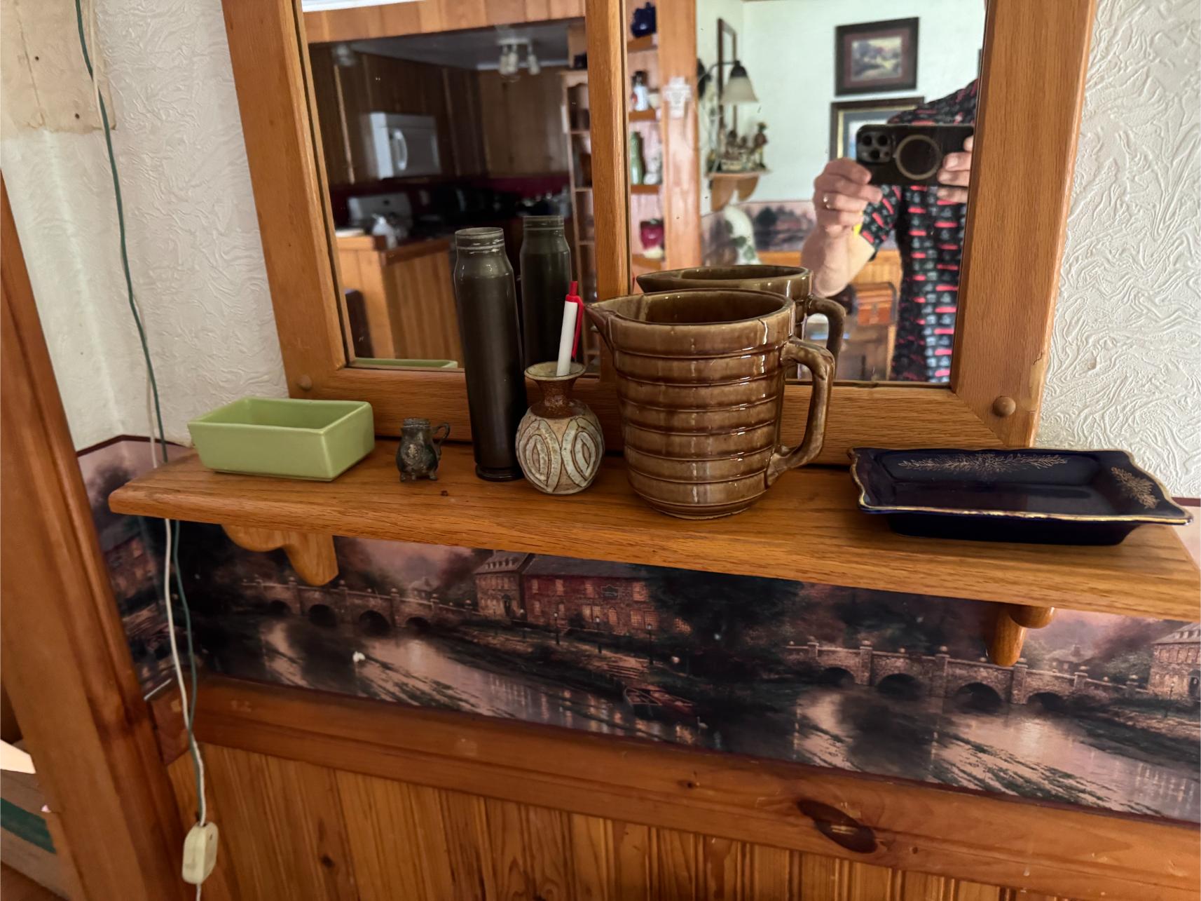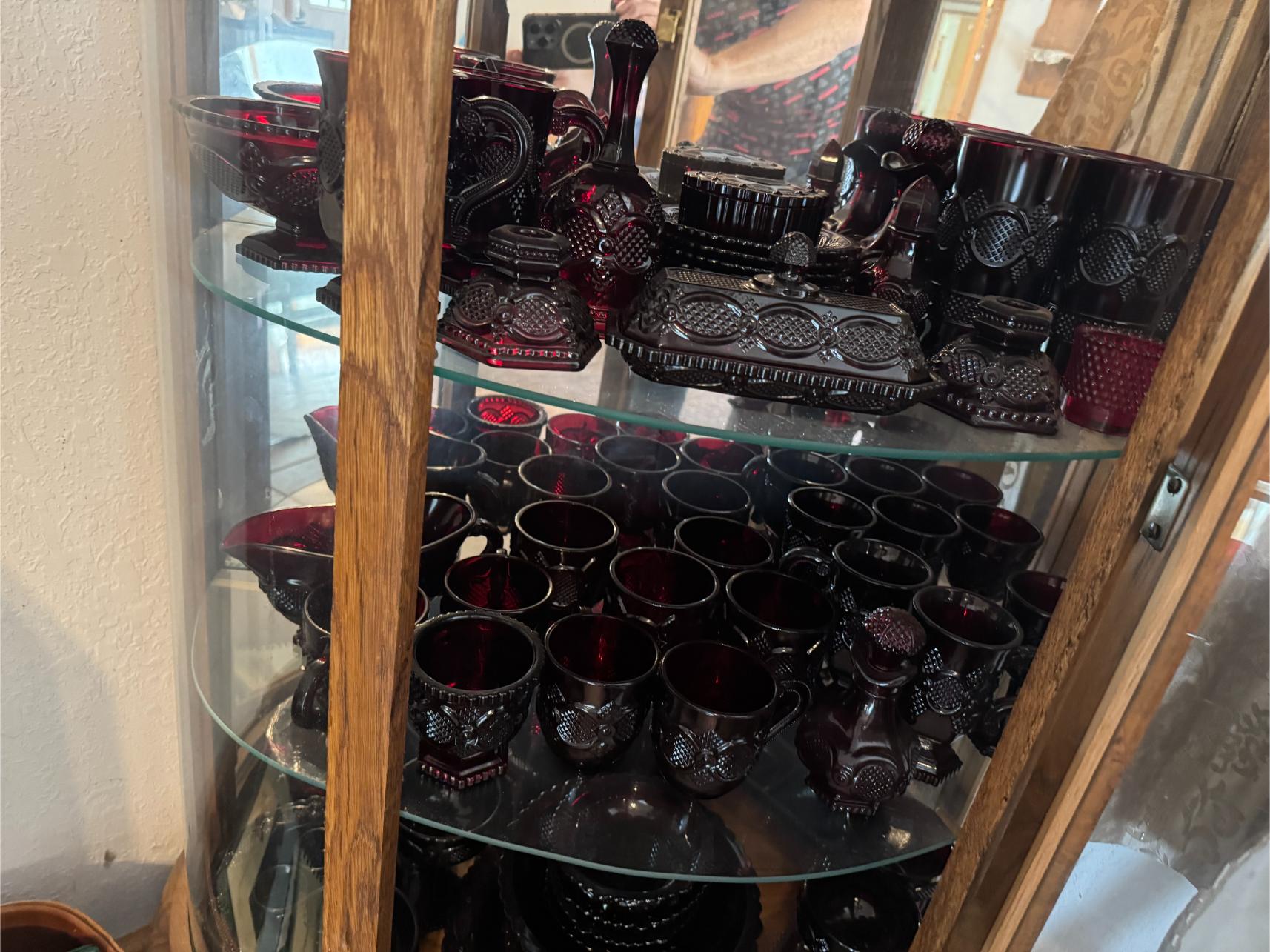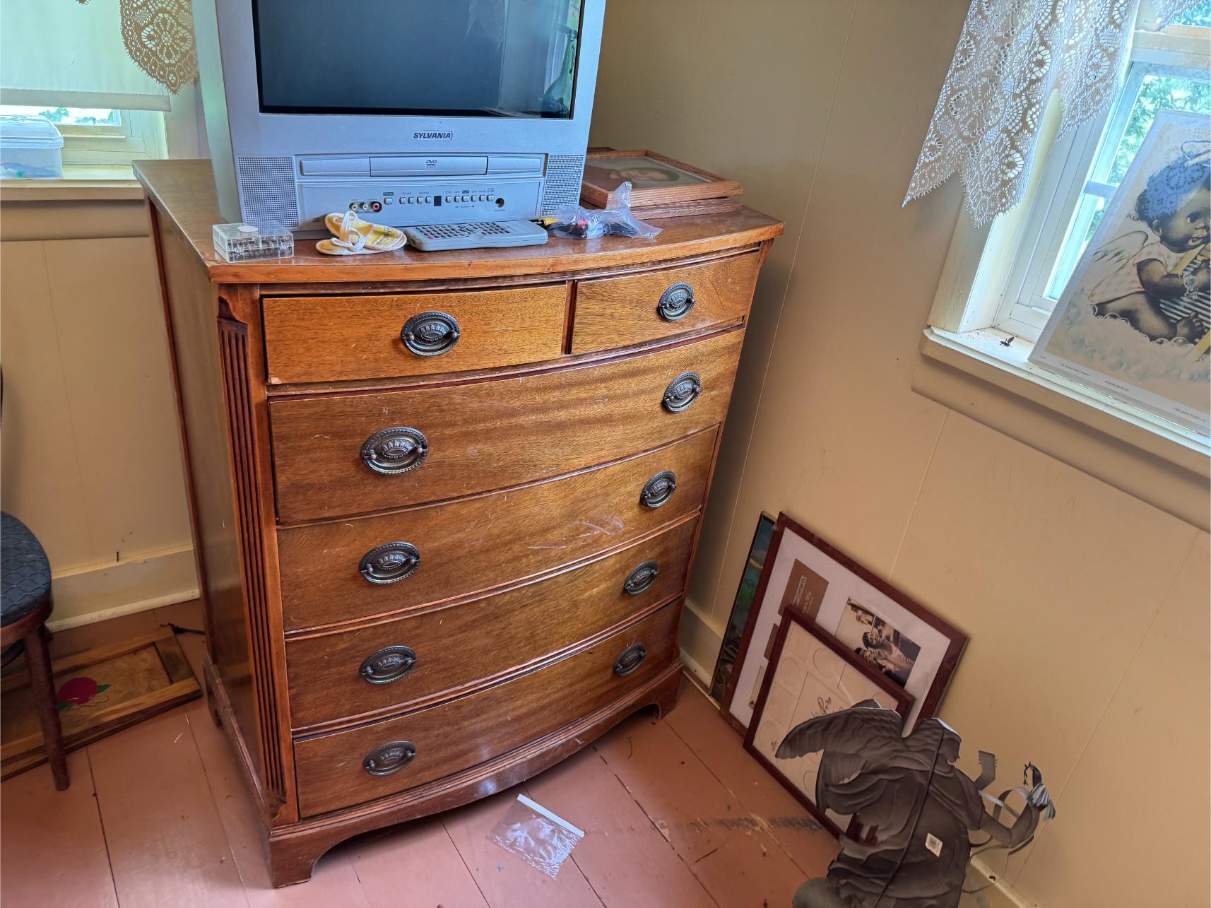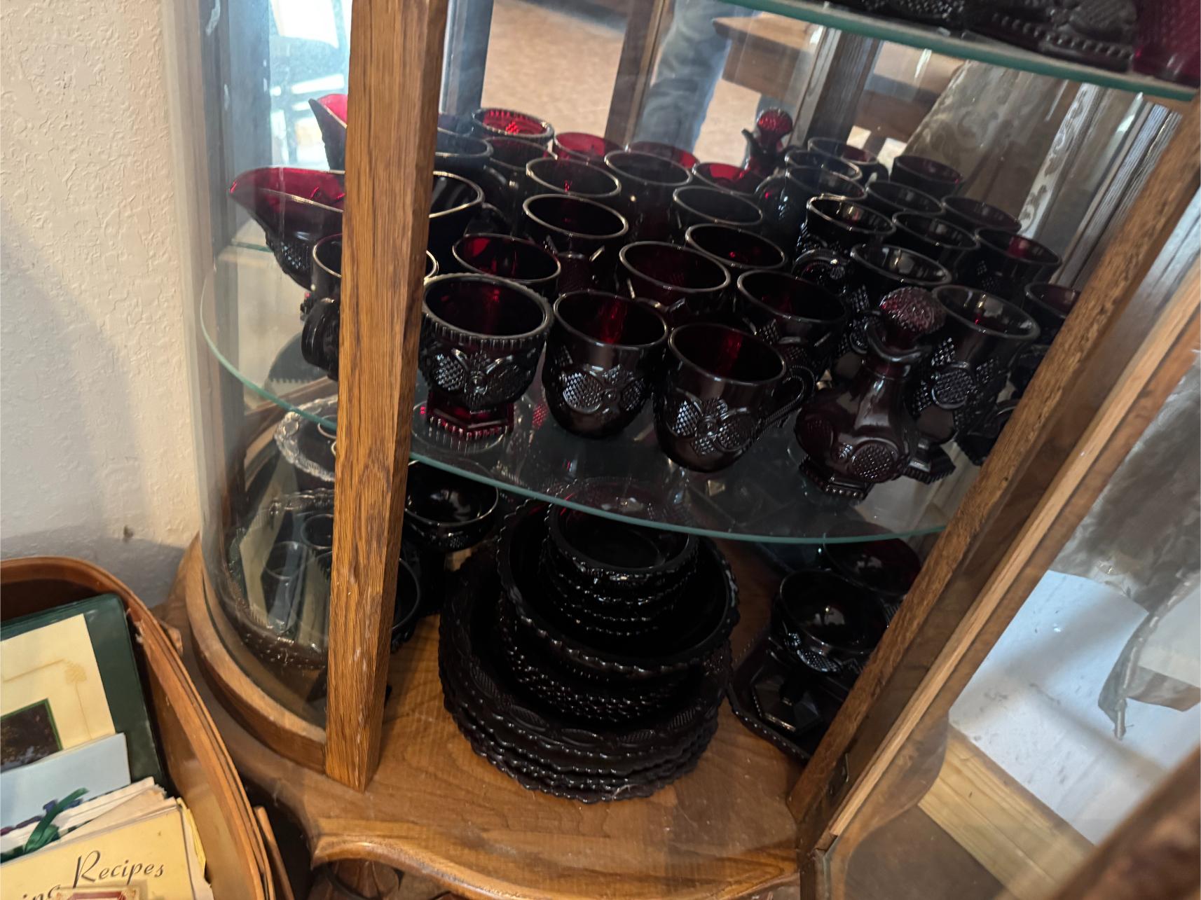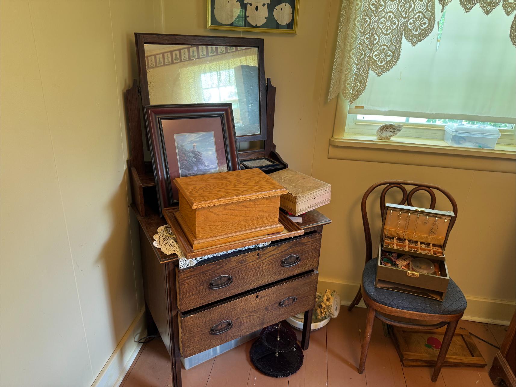 Antiques & Collectibles: Oak Bow Front Hutch – Buffet – Oak Center Tables – Secretarial – Oak Chair – Gossip Bench – Oak Dresser & Chest – Mantle Clock – Cape Cod – Figurines – Cast Iron Skillets & Kettles – #6 Crock – Fire King – Carnival – Corelle – Milk Glass – Cut Glass – Clear Glass – Cartoon Glasses – Cake Plates – Misc Glassware – Enamel Ware – Sad Irons – View Master Junior Projector – Ceramic Christmas Tree – Collector Plates – Marbles – Jewelry – Quilt – Water Heater – Scales – Ice Tongs – Lantern – Bottles