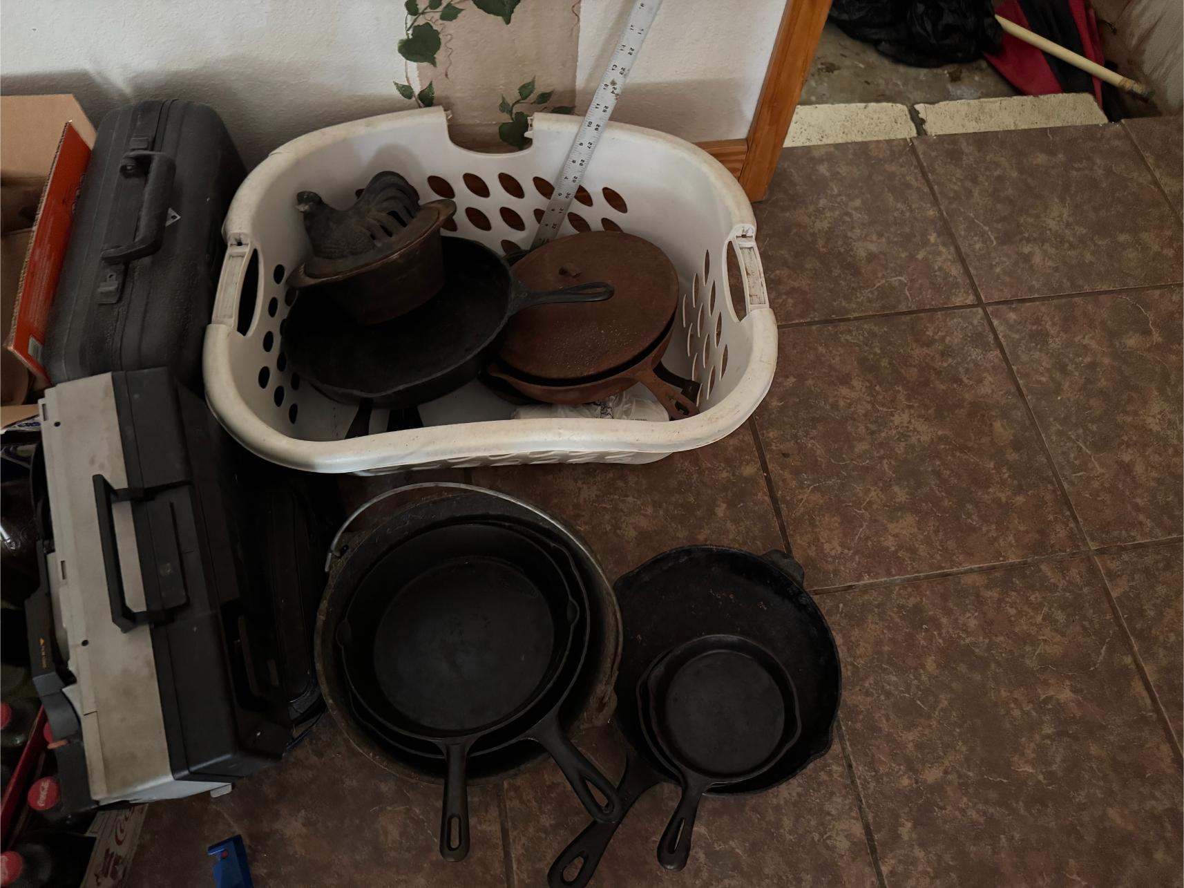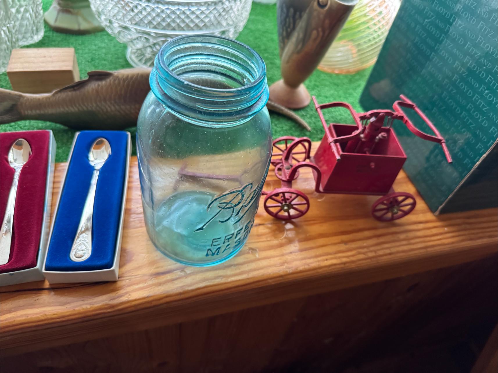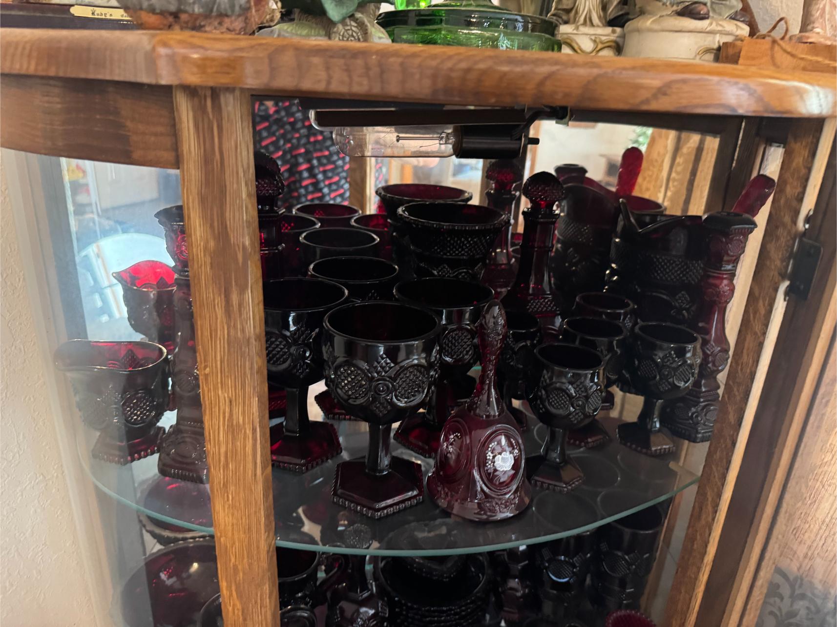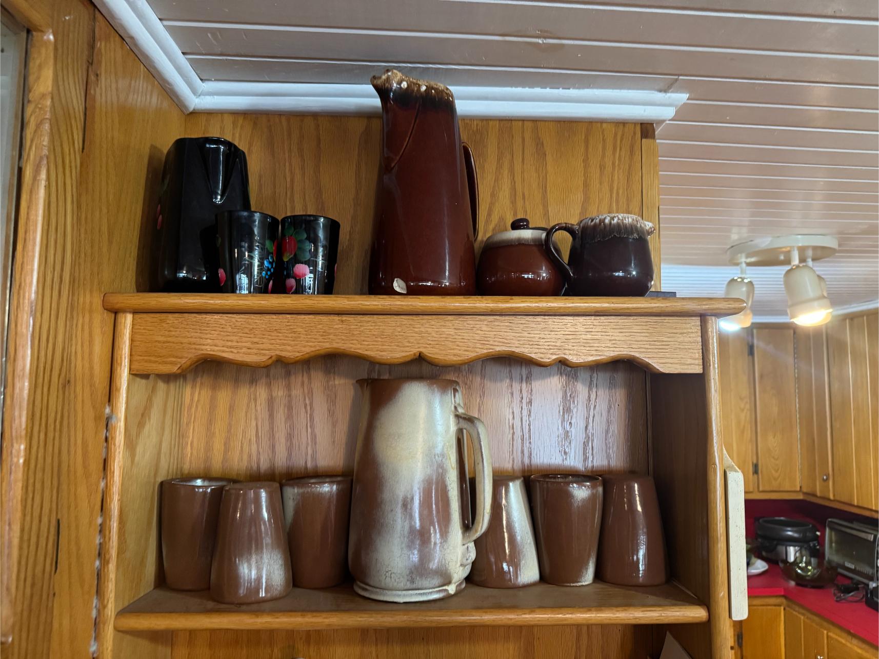 Antiques & Collectibles: Oak Bow Front Hutch – Buffet – Oak Center Tables – Secretarial – Oak Chair – Gossip Bench – Oak Dresser & Chest – Mantle Clock – Cape Cod – Figurines – Cast Iron Skillets & Kettles – #6 Crock – Fire King – Carnival – Corelle – Milk Glass – Cut Glass – Clear Glass – Cartoon Glasses – Cake Plates – Misc Glassware – Enamel Ware – Sad Irons – View Master Junior Projector – Ceramic Christmas Tree – Collector Plates – Marbles – Jewelry – Quilt – Water Heater – Scales – Ice Tongs – Lantern – Bottles
