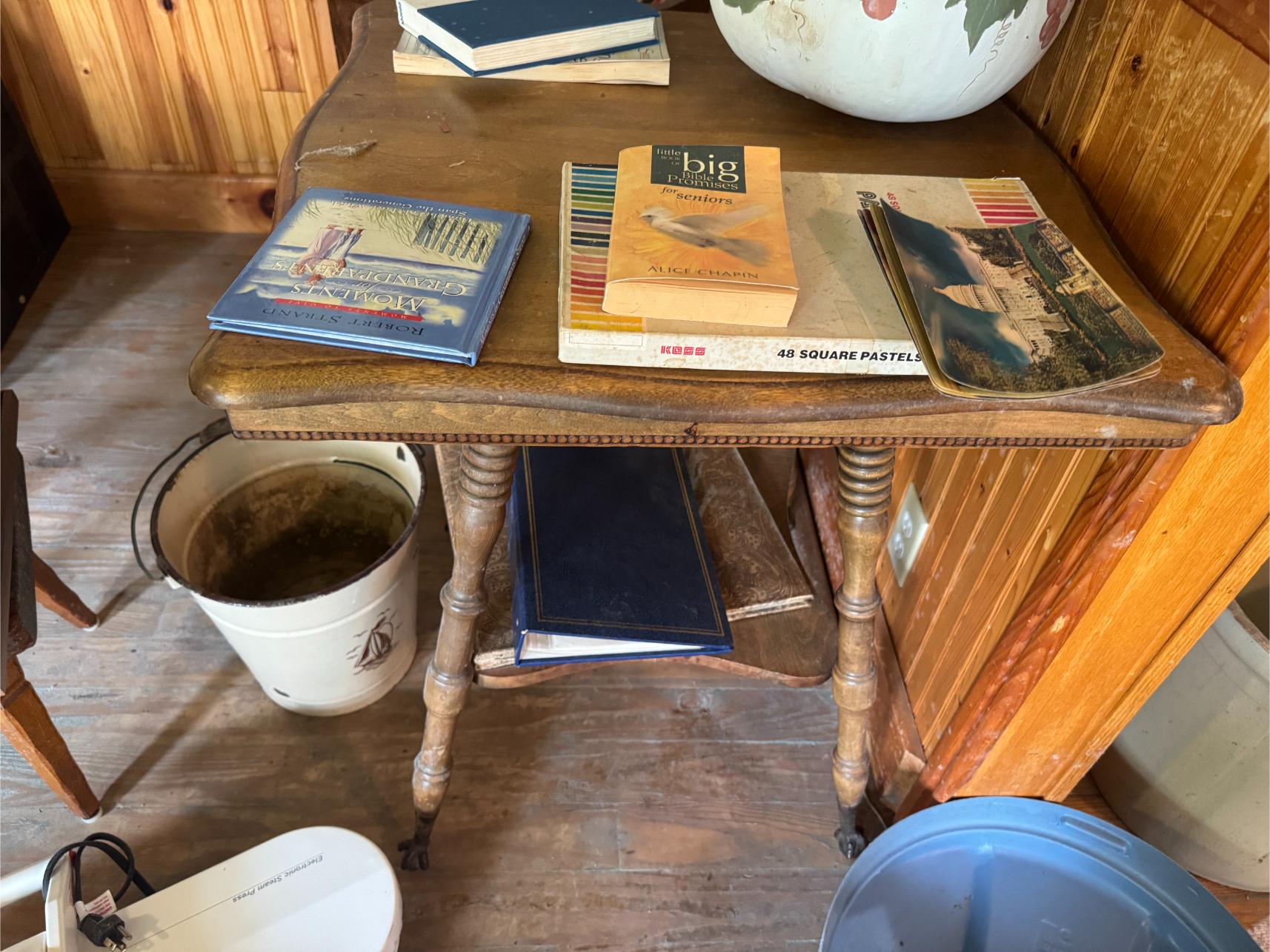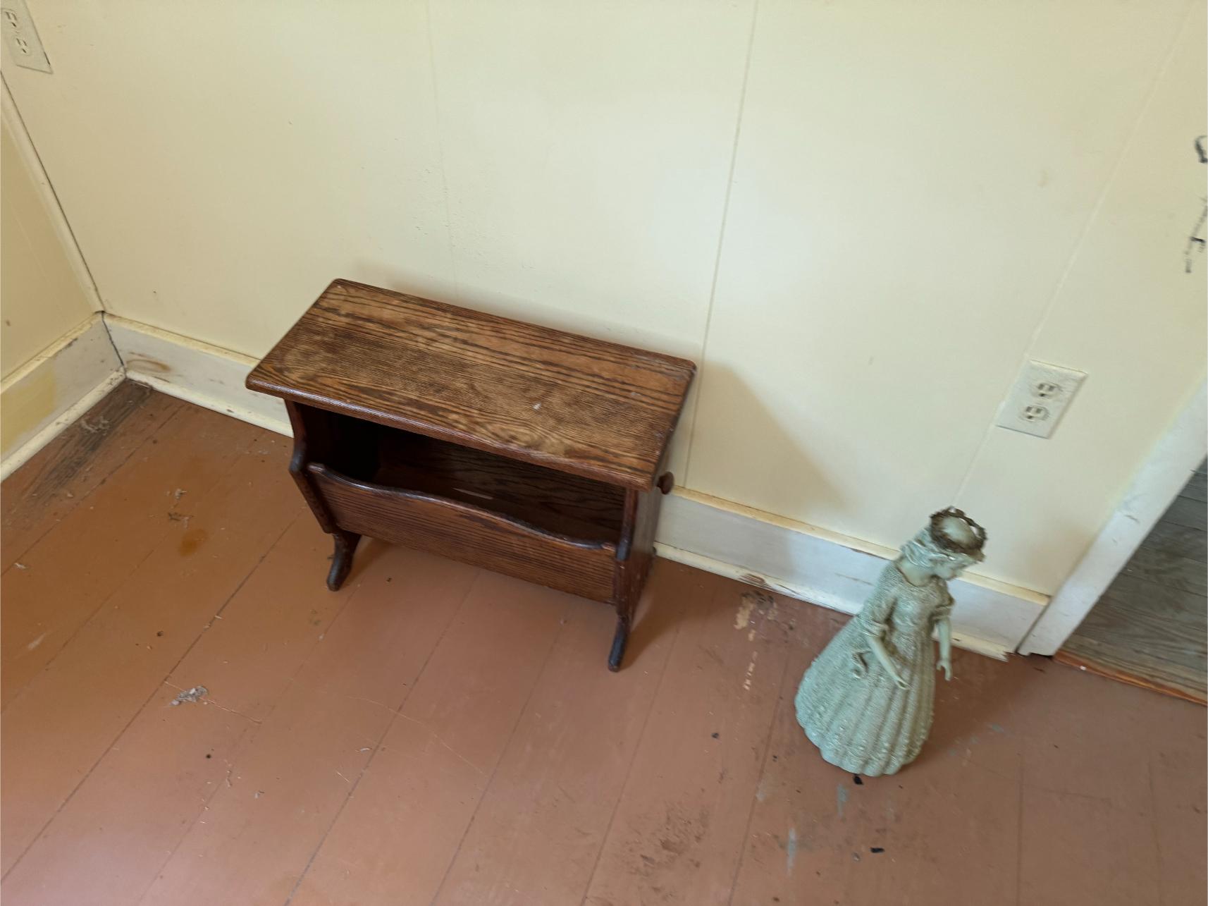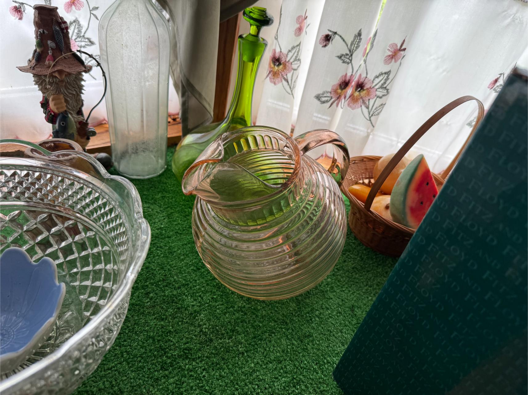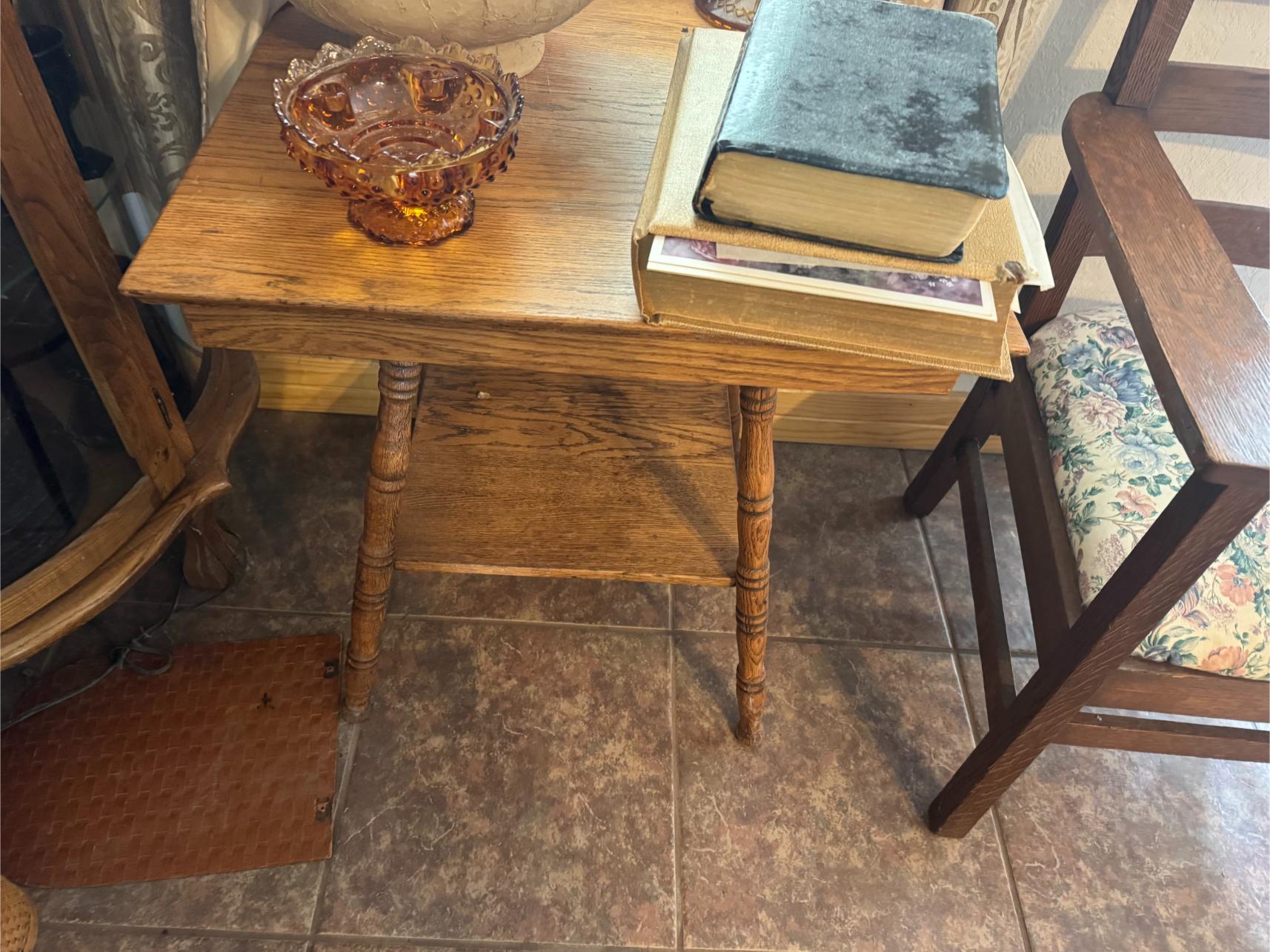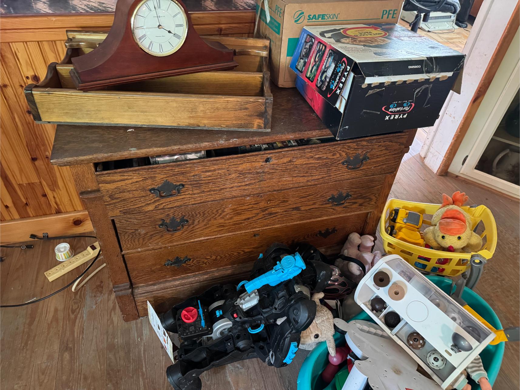 Antiques & Collectibles: Oak Bow Front Hutch – Buffet – Oak Center Tables – Secretarial – Oak Chair – Gossip Bench – Oak Dresser & Chest – Mantle Clock – Cape Cod – Figurines – Cast Iron Skillets & Kettles – #6 Crock – Fire King – Carnival – Corelle – Milk Glass – Cut Glass – Clear Glass – Cartoon Glasses – Cake Plates – Misc Glassware – Enamel Ware – Sad Irons – View Master Junior Projector – Ceramic Christmas Tree – Collector Plates – Marbles – Jewelry – Quilt – Water Heater – Scales – Ice Tongs – Lantern – Bottles