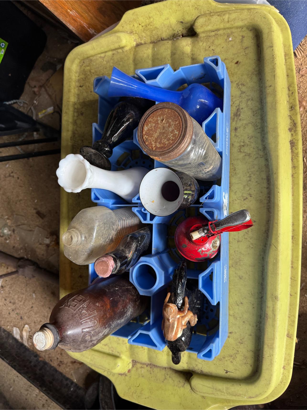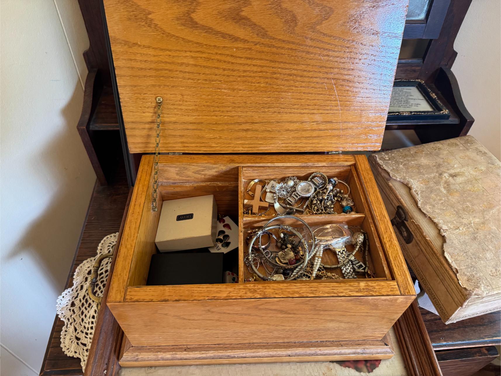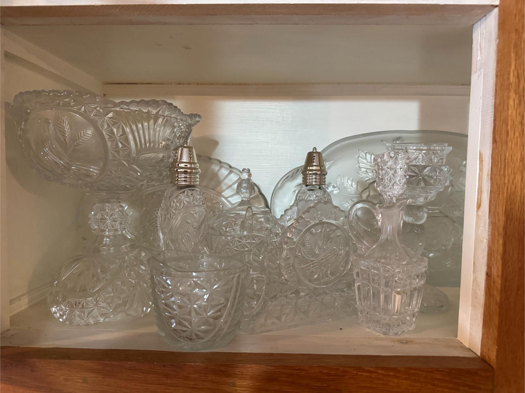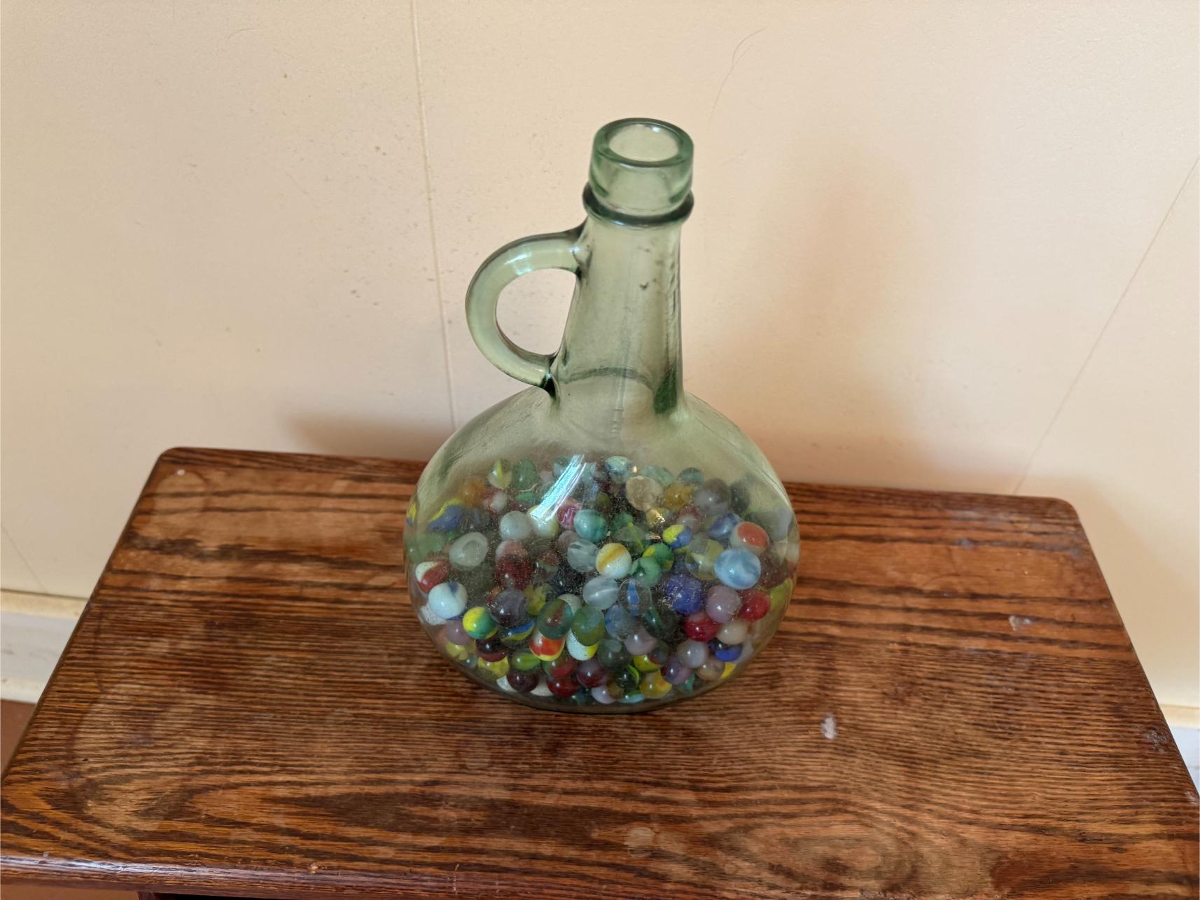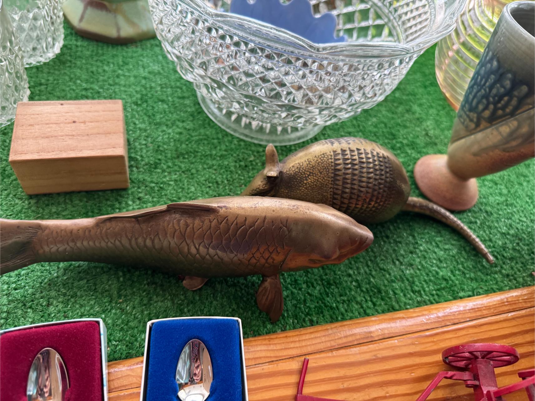 Antiques & Collectibles: Oak Bow Front Hutch – Buffet – Oak Center Tables – Secretarial – Oak Chair – Gossip Bench – Oak Dresser & Chest – Mantle Clock – Cape Cod – Figurines – Cast Iron Skillets & Kettles – #6 Crock – Fire King – Carnival – Corelle – Milk Glass – Cut Glass – Clear Glass – Cartoon Glasses – Cake Plates – Misc Glassware – Enamel Ware – Sad Irons – View Master Junior Projector – Ceramic Christmas Tree – Collector Plates – Marbles – Jewelry – Quilt – Water Heater – Scales – Ice Tongs – Lantern – Bottles