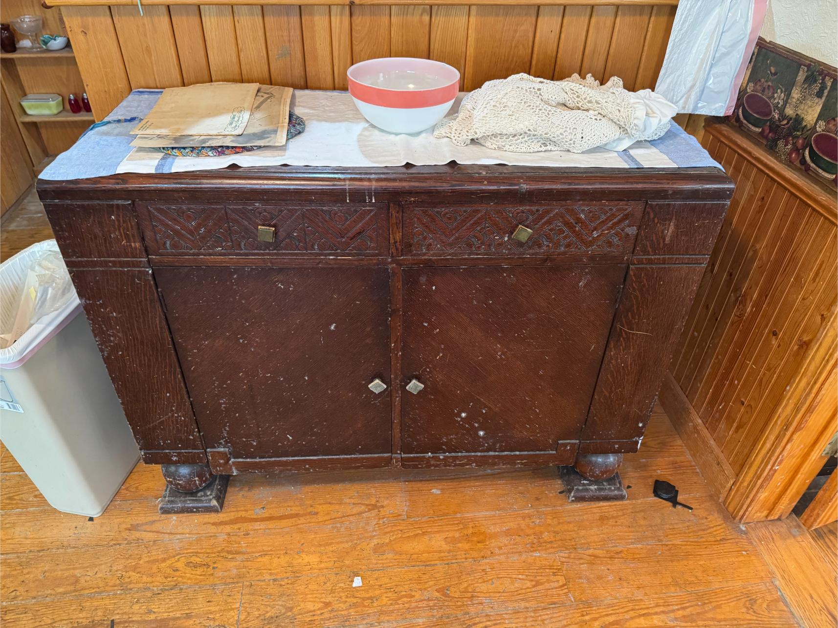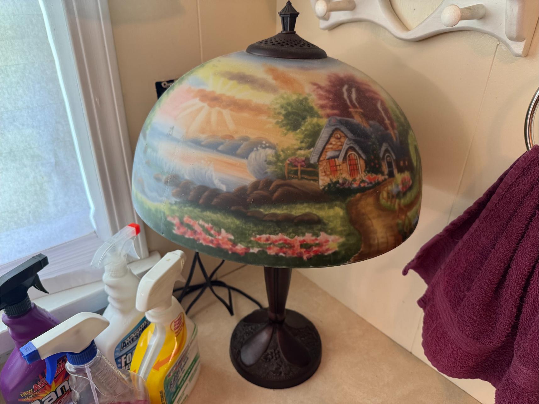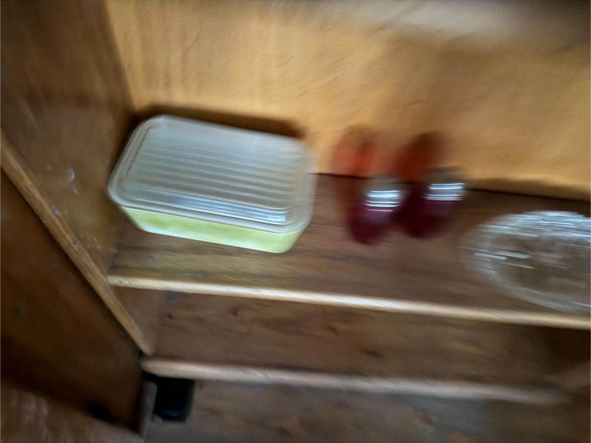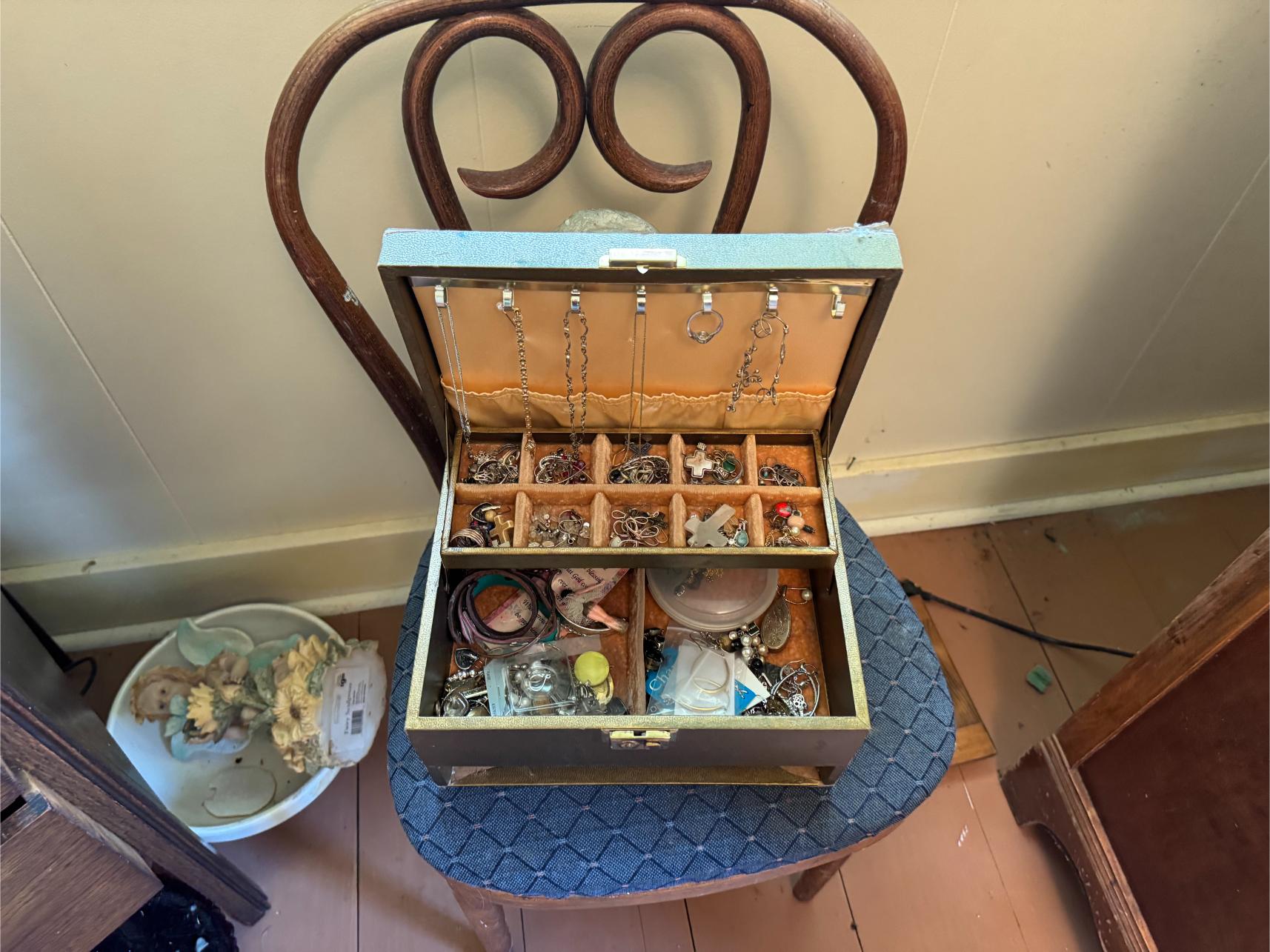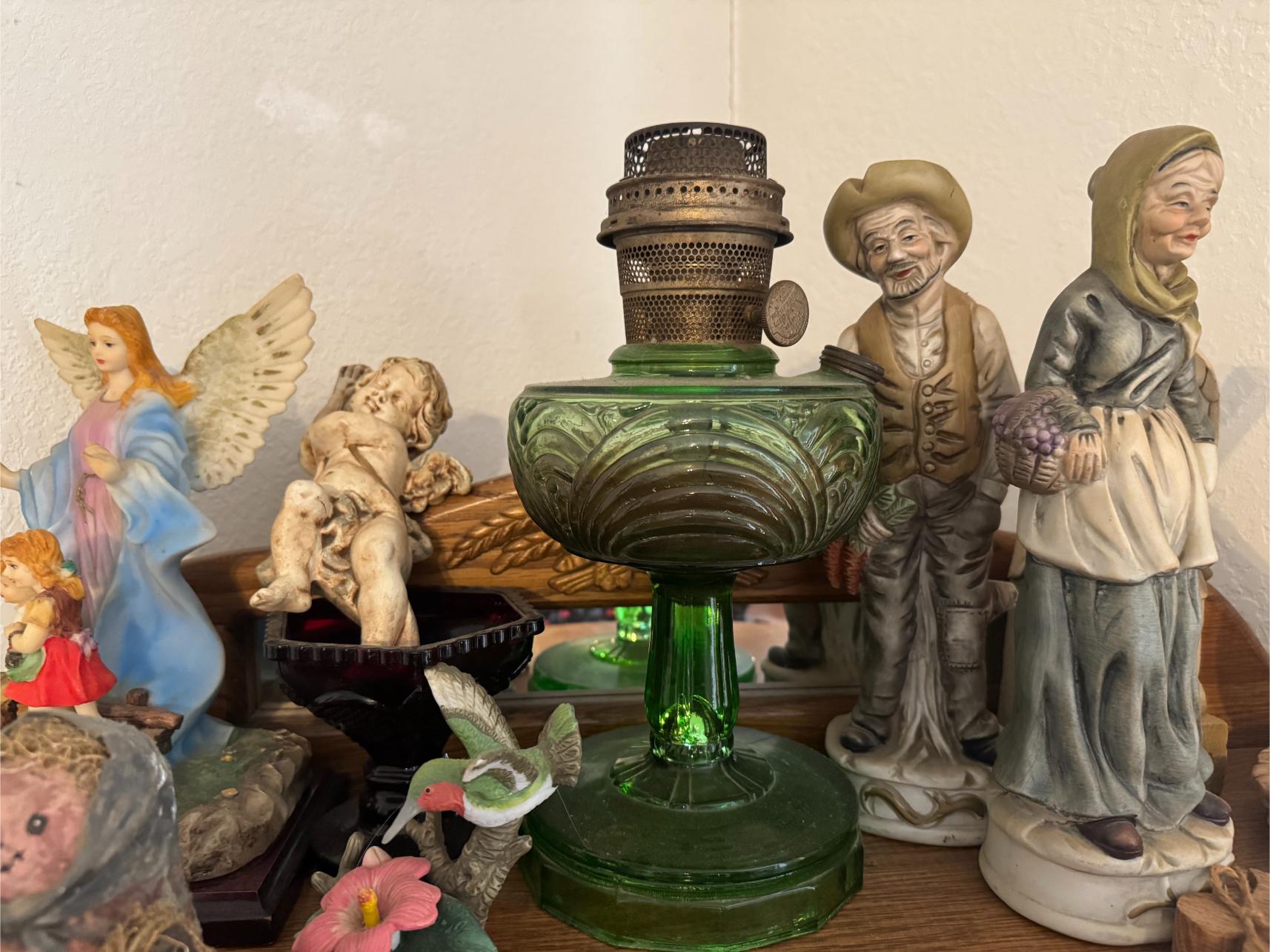 Antiques & Collectibles: Oak Bow Front Hutch – Buffet – Oak Center Tables – Secretarial – Oak Chair – Gossip Bench – Oak Dresser & Chest – Mantle Clock – Cape Cod – Figurines – Cast Iron Skillets & Kettles – #6 Crock – Fire King – Carnival – Corelle – Milk Glass – Cut Glass – Clear Glass – Cartoon Glasses – Cake Plates – Misc Glassware – Enamel Ware – Sad Irons – View Master Junior Projector – Ceramic Christmas Tree – Collector Plates – Marbles – Jewelry – Quilt – Water Heater – Scales – Ice Tongs – Lantern – Bottles