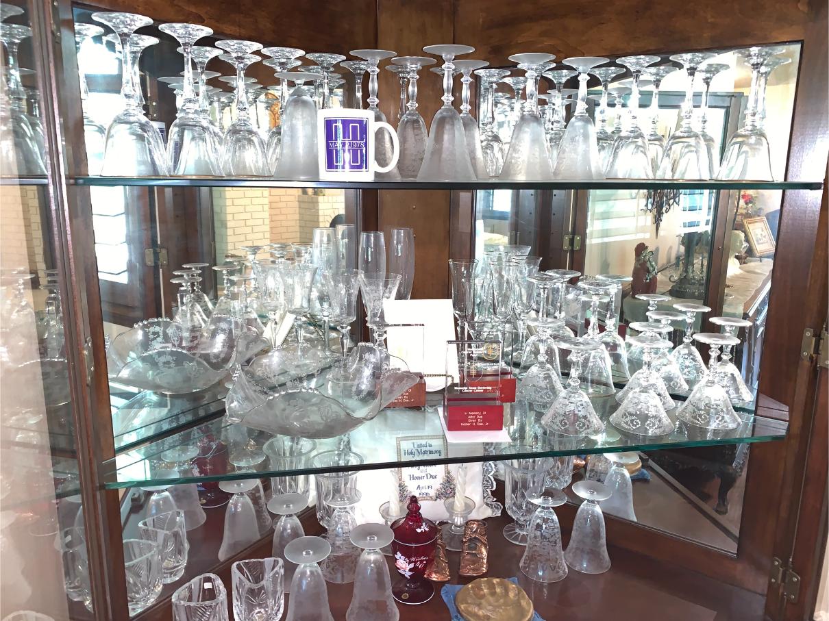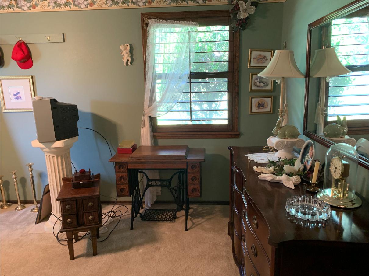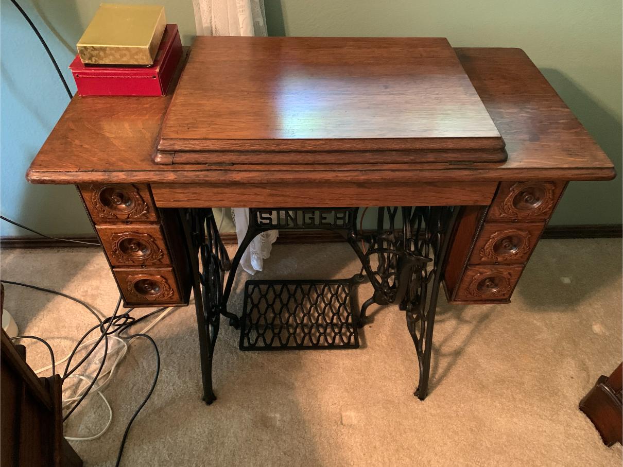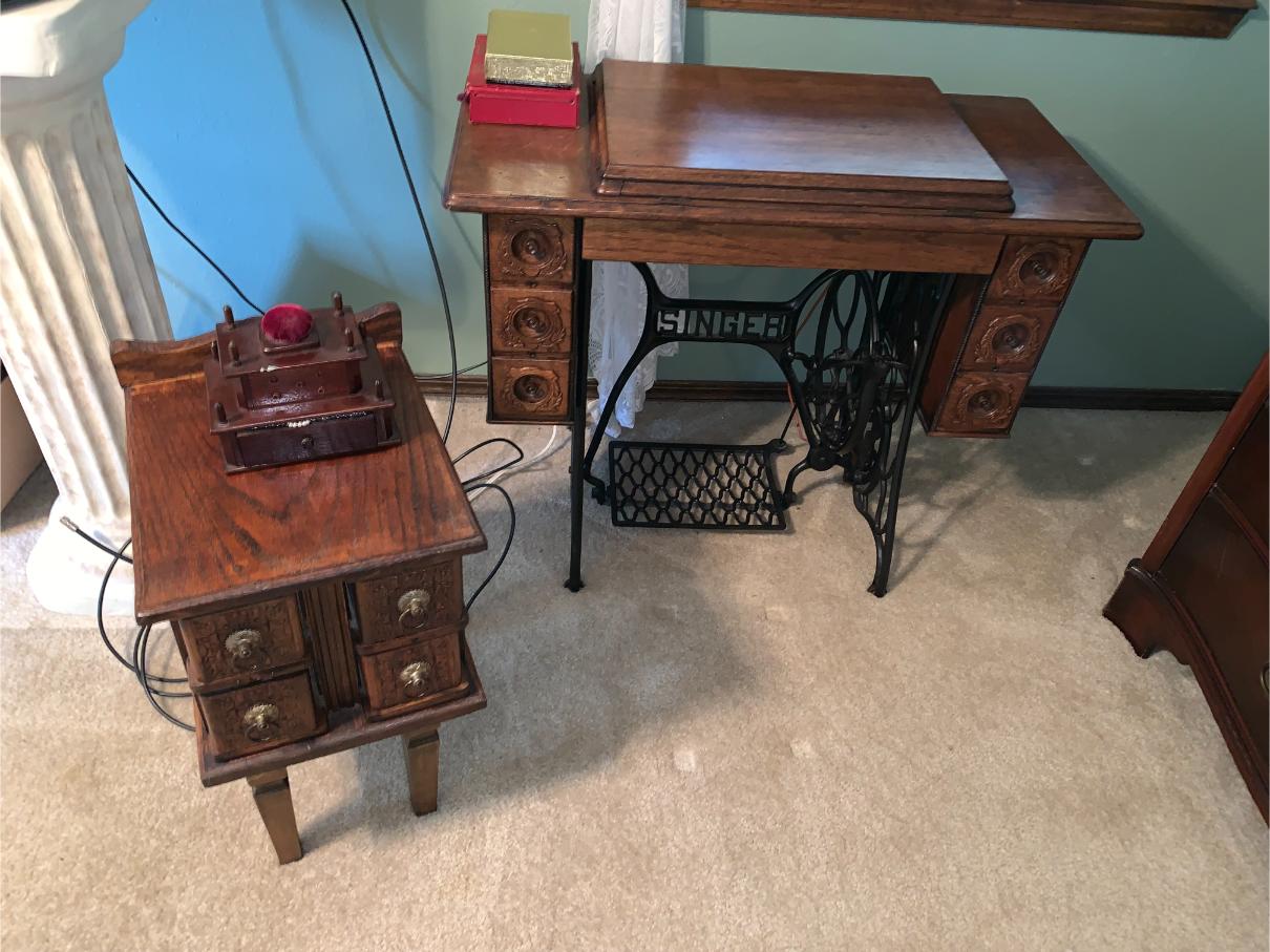 Antiques & Collectibles: Mahogany Buffet – Victrola “The Golden Throat” in Cabinet – Singer Treadle Base Sewing Machine – Sewing Machine Drawer Cabinet (Unique) – Mauthe Wall Clock – Dropleaf Table – Eastlake Chair – Needlepoint Chair – Cedar Chest – Cherry Dresser – Crystal – Etched Glass Stemware – Figurines – Cast Iron Skillet