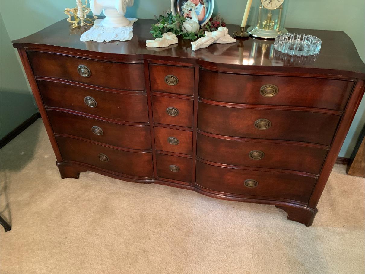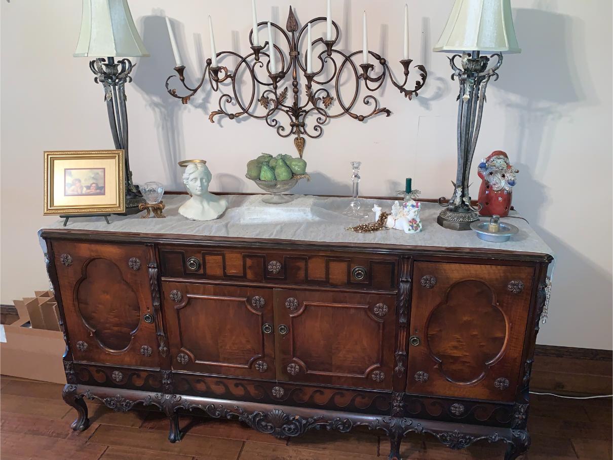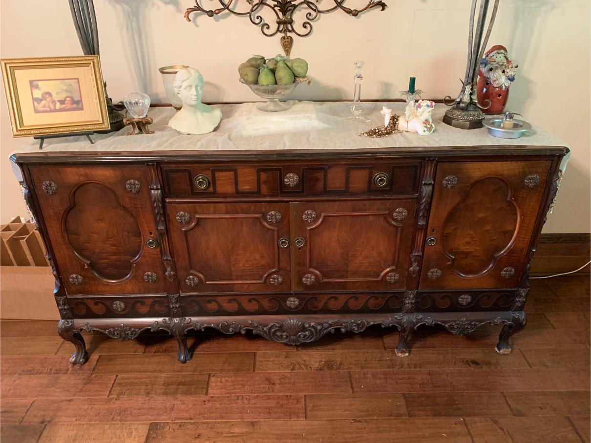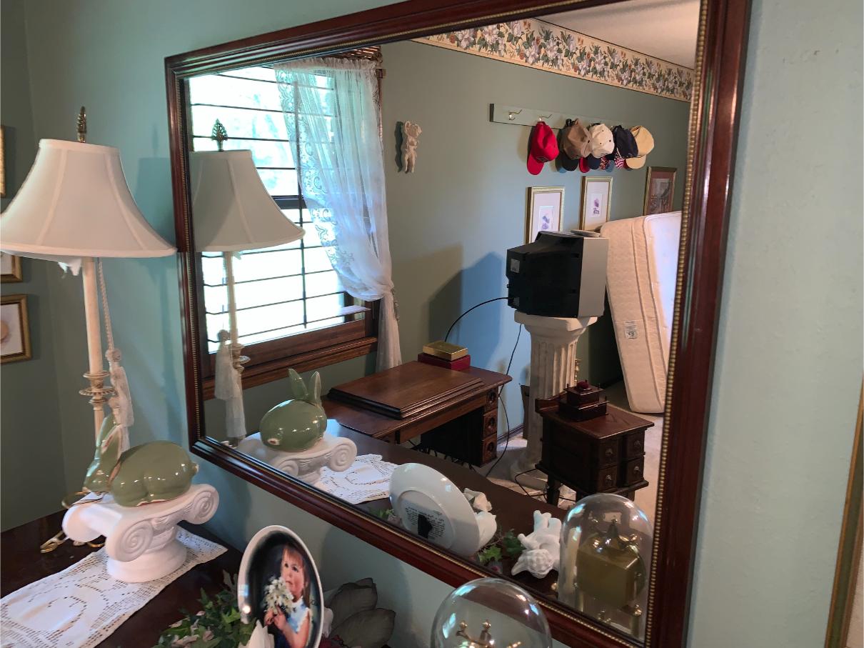 Antiques & Collectibles: Mahogany Buffet – Victrola “The Golden Throat” in Cabinet – Singer Treadle Base Sewing Machine – Sewing Machine Drawer Cabinet (Unique) – Mauthe Wall Clock – Dropleaf Table – Eastlake Chair – Needlepoint Chair – Cedar Chest – Cherry Dresser – Crystal – Etched Glass Stemware – Figurines – Cast Iron Skillet