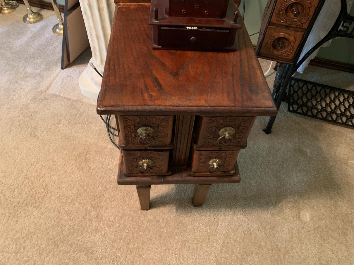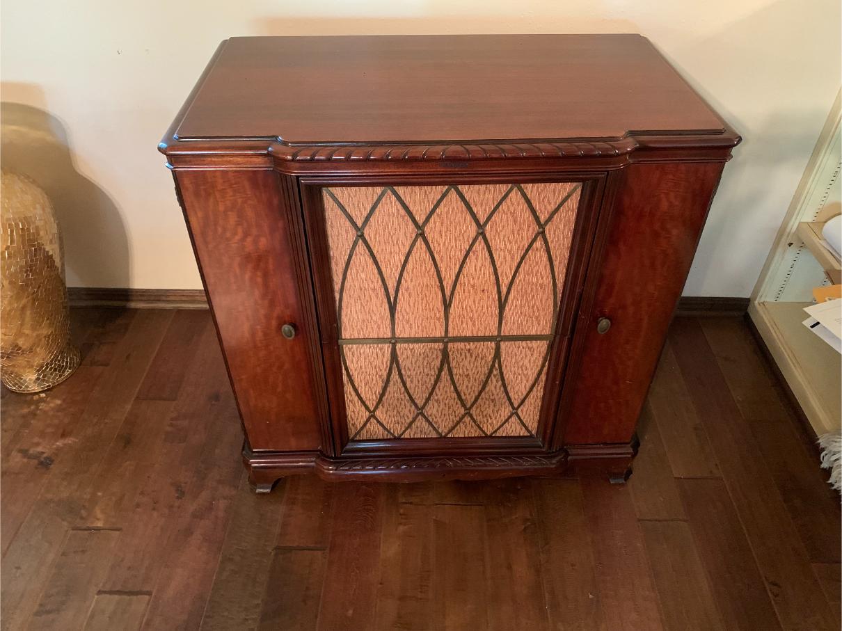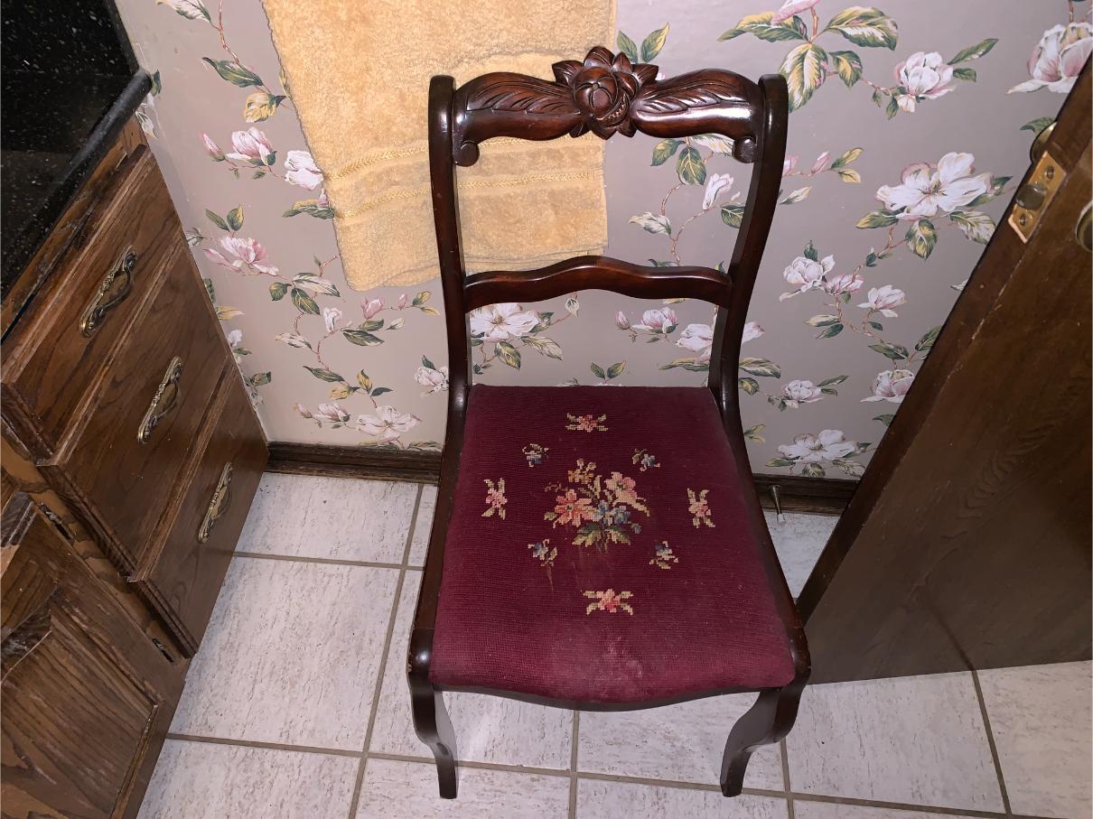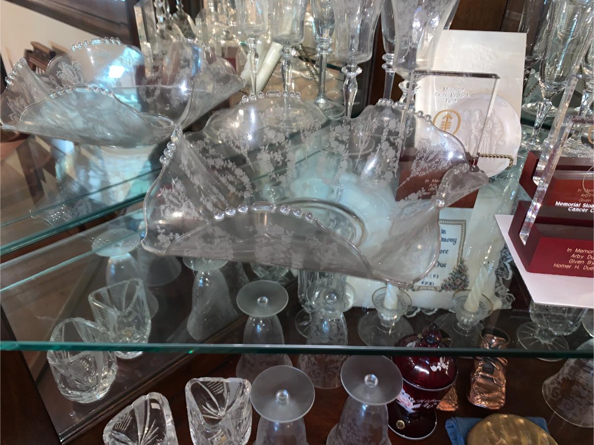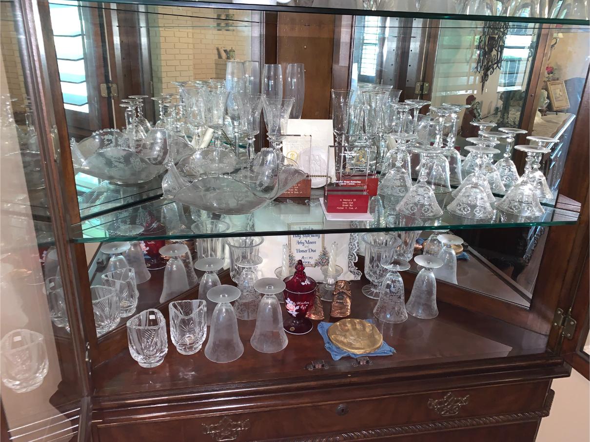Antiques & Collectibles: Mahogany Buffet – Victrola “The Golden Throat” in Cabinet – Singer Treadle Base Sewing Machine – Sewing Machine Drawer Cabinet (Unique) – Mauthe Wall Clock – Dropleaf Table – Eastlake Chair – Needlepoint Chair – Cedar Chest – Cherry Dresser – Crystal – Etched Glass Stemware – Figurines – Cast Iron Skillet