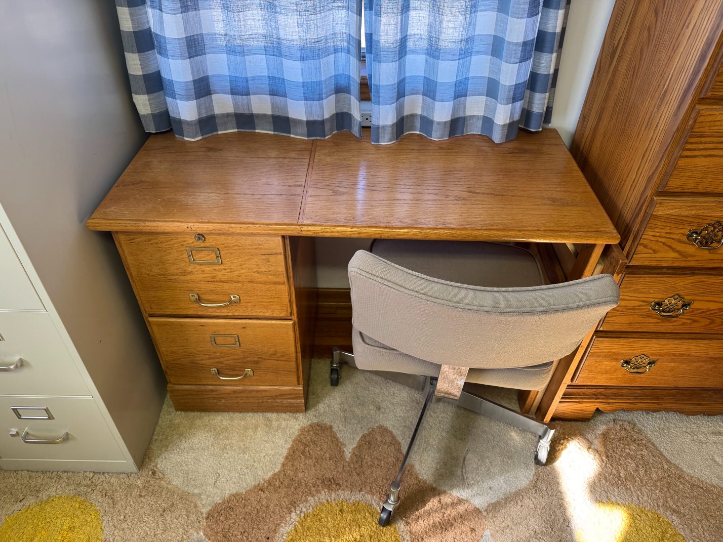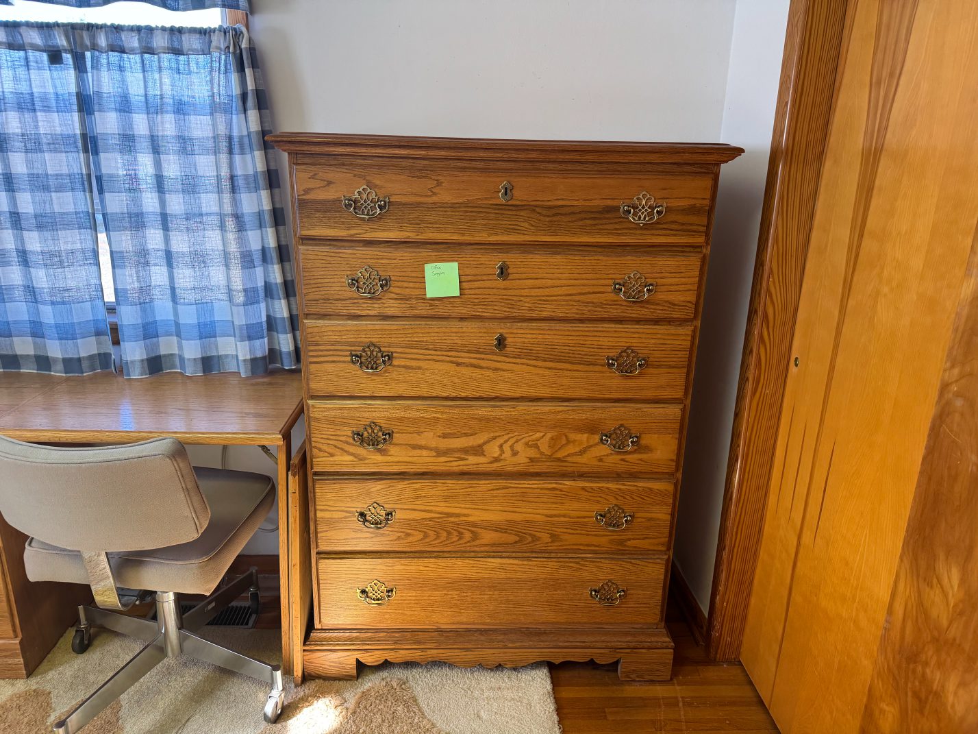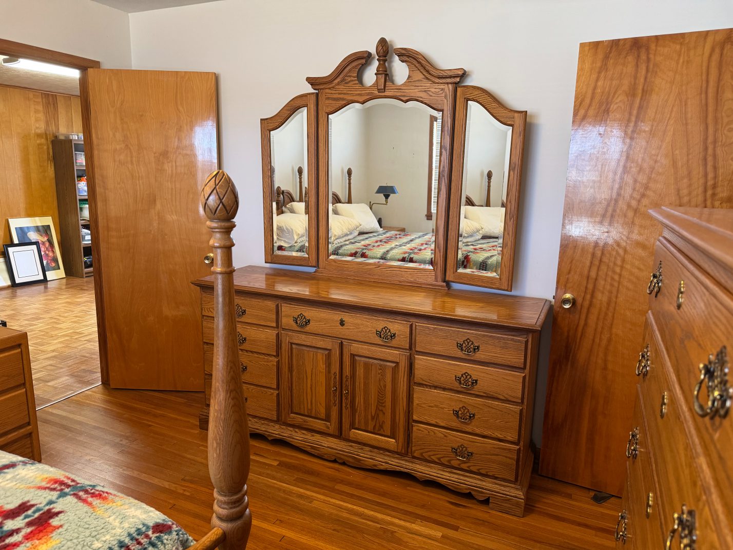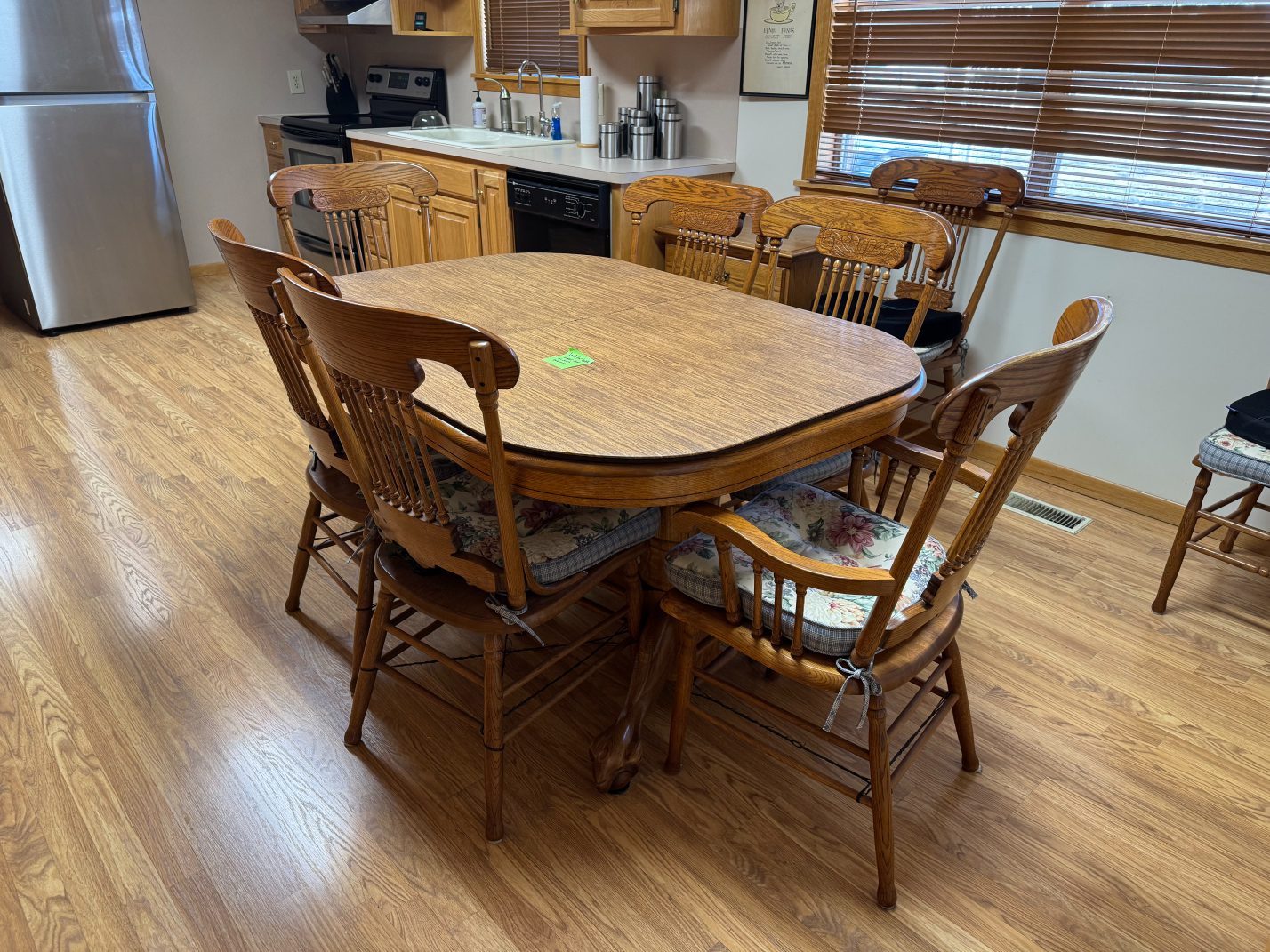 Furniture: Lawyers Bookcases – Sofa – Loveseat – Glider Chair – Coffee Table – Floor Lamps – Samsung TV – Oak Chest Of Drawers – Oak Desk – Filing Cabinets – Oak Nightstands – Kitchen Table With 8 Chairs – Dresser – Queen Size Bed – Full-Size Bed – Lamps – Bookshelves – Gun Rack – Stools – Card Table