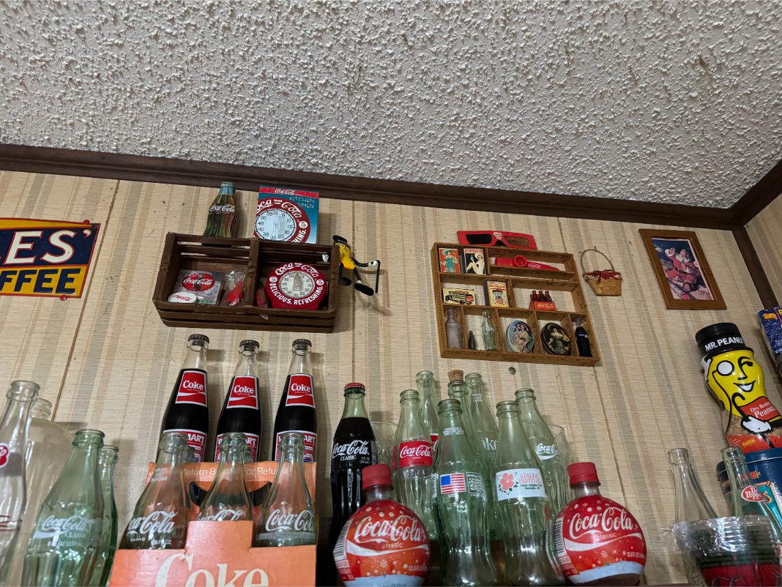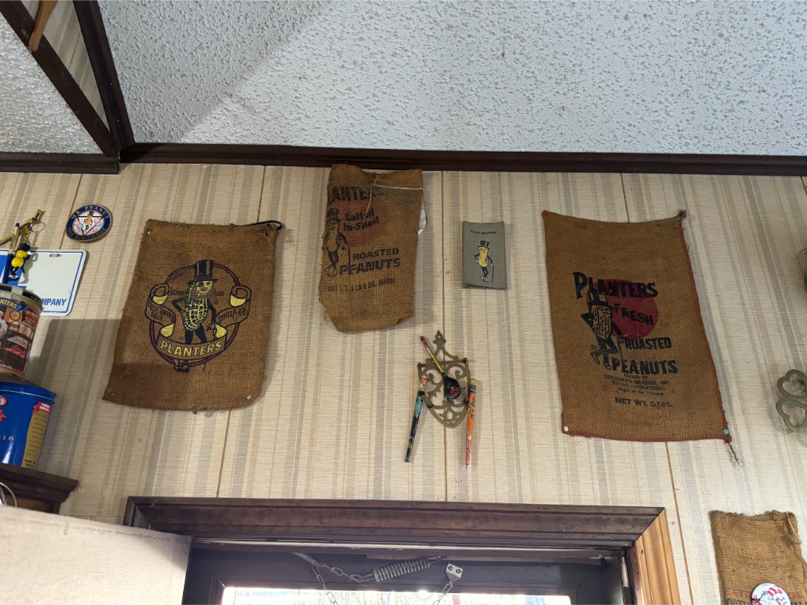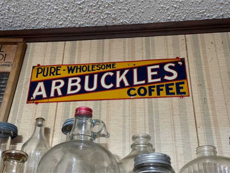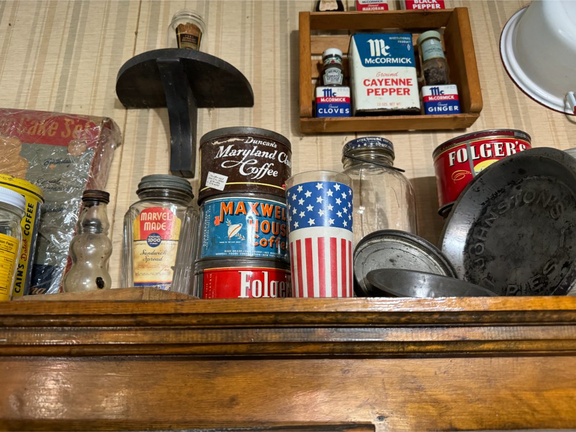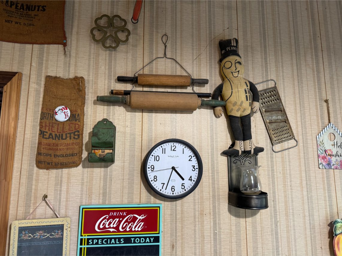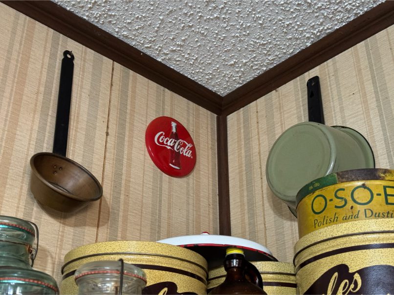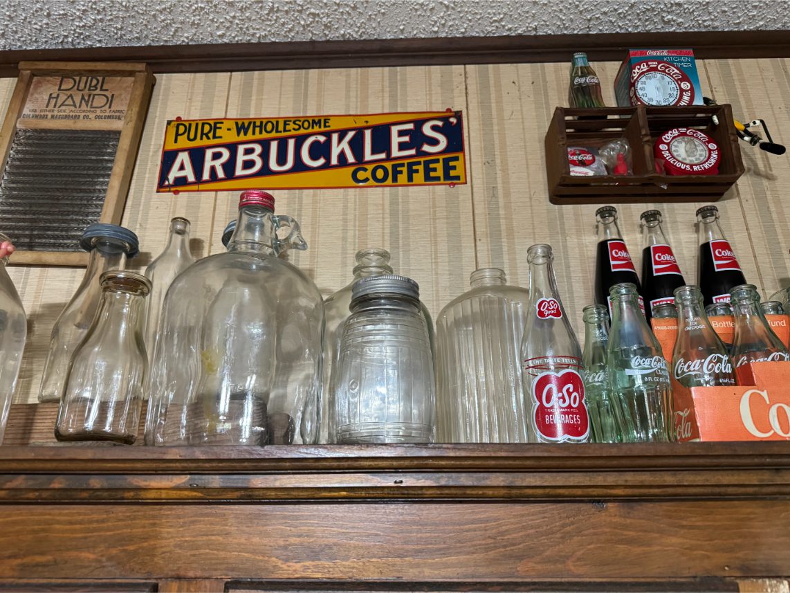 Antiques/Collectibles: Planters Peanuts – Tins – Coca-Cola Advertising – Arbuckles Coffee Sign – Rub Boards – Jars – Glass Bottles – Enamel – Coffee Cans – Peanut Jars – Radios – Planters Peanuts Salt/Pepper Shakers – Glass Rolling Pins – Hen on Nest – Kerosine Lamps – Fire Extinguisher – Typewriter Trays – Snuff Jars – Cigar Boxes – Quilts – Cast Iron Bell – Galvanized Tubs
