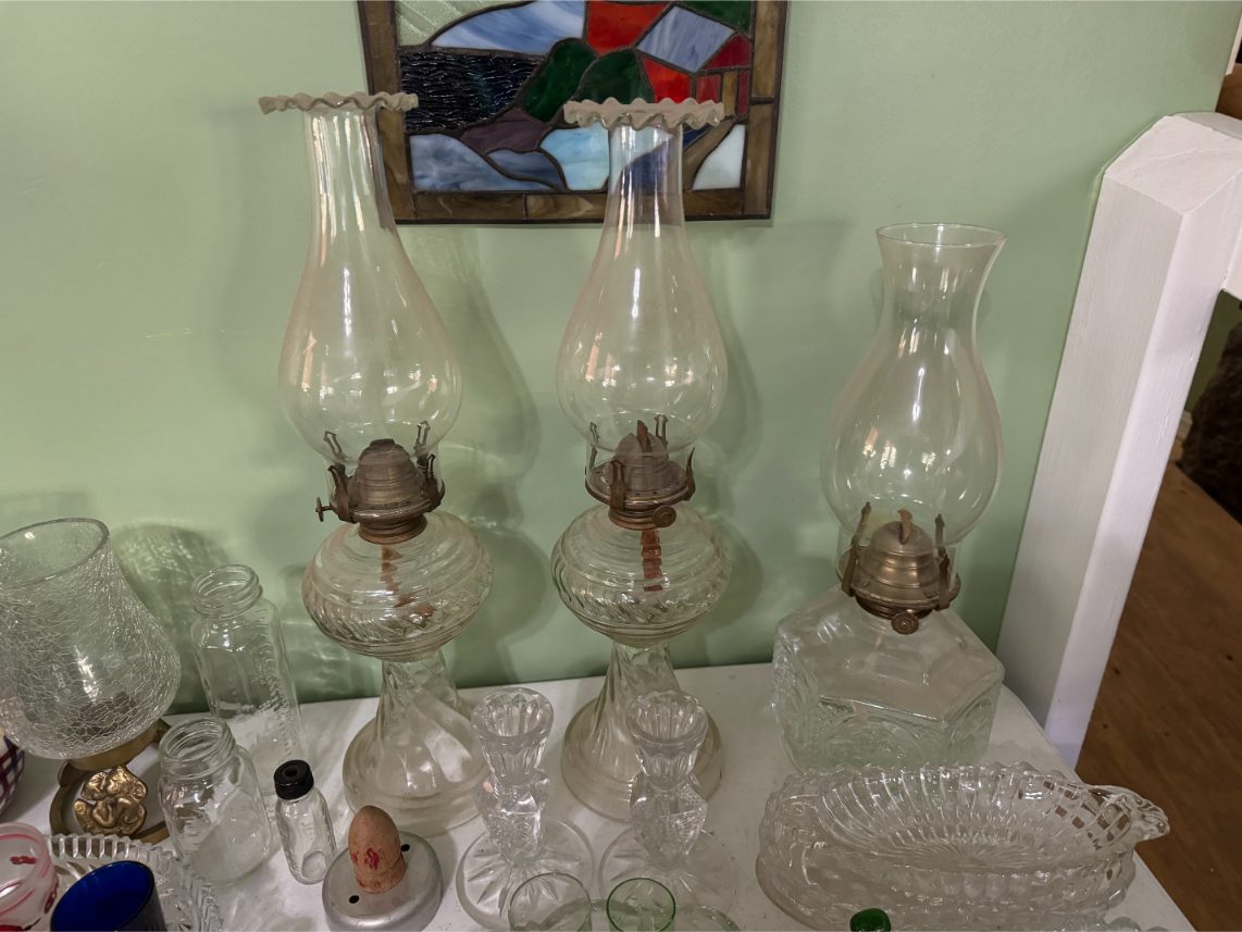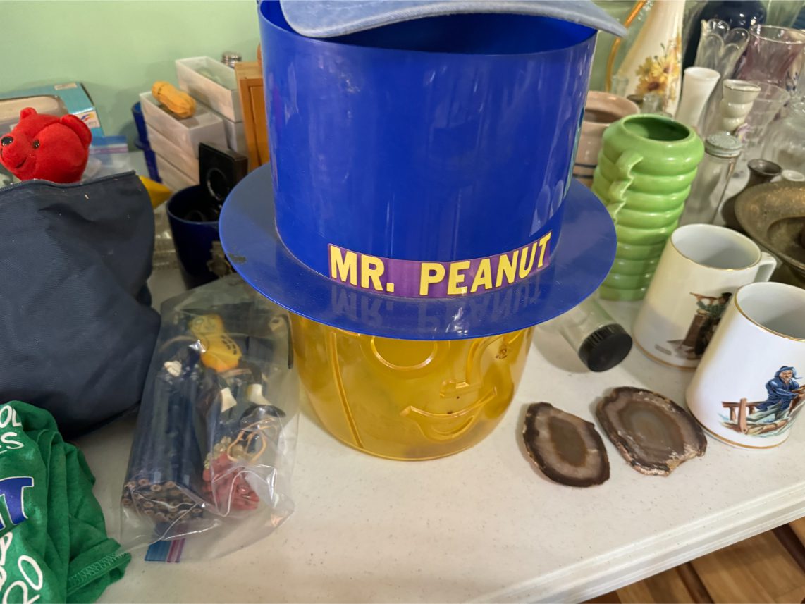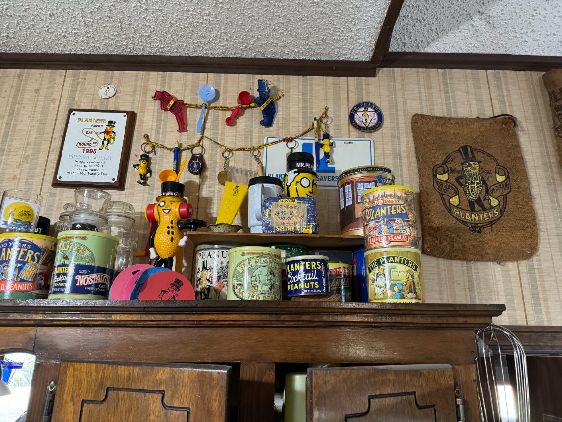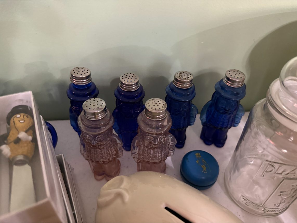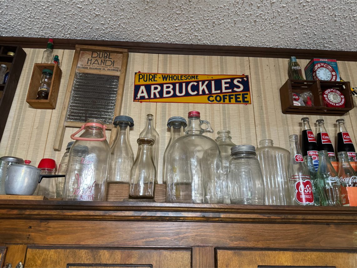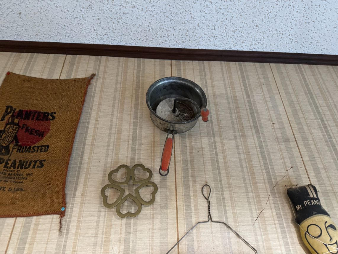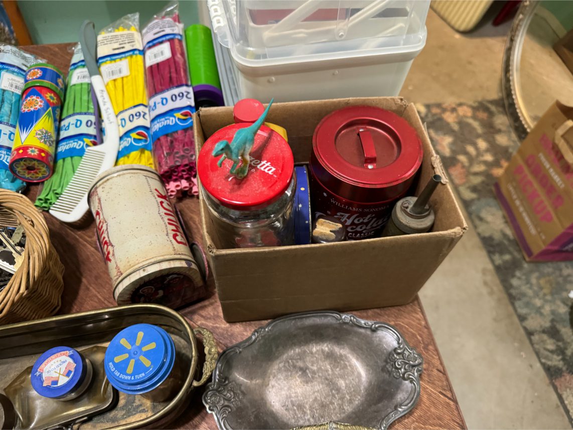 Antiques/Collectibles: Planters Peanuts – Tins – Coca-Cola Advertising – Arbuckles Coffee Sign – Rub Boards – Jars – Glass Bottles – Enamel – Coffee Cans – Peanut Jars – Radios – Planters Peanuts Salt/Pepper Shakers – Glass Rolling Pins – Hen on Nest – Kerosine Lamps – Fire Extinguisher – Typewriter Trays – Snuff Jars – Cigar Boxes – Quilts – Cast Iron Bell – Galvanized Tubs
