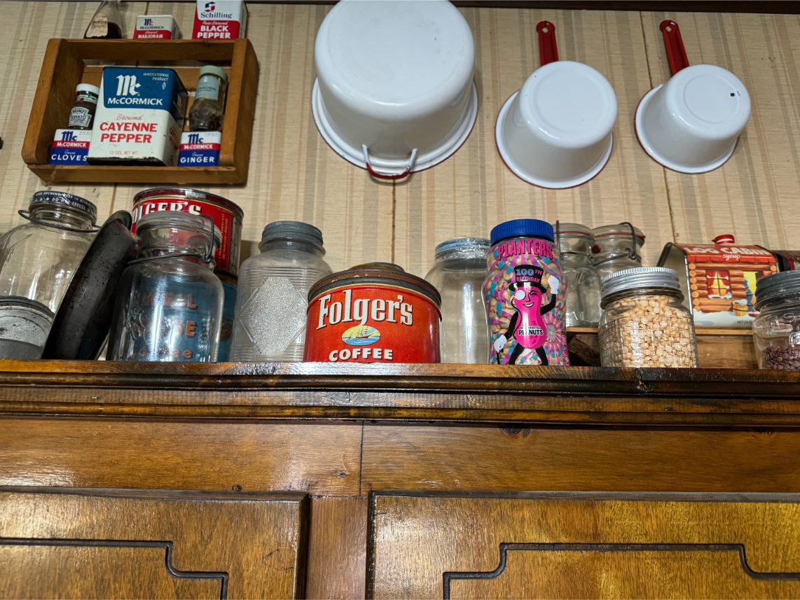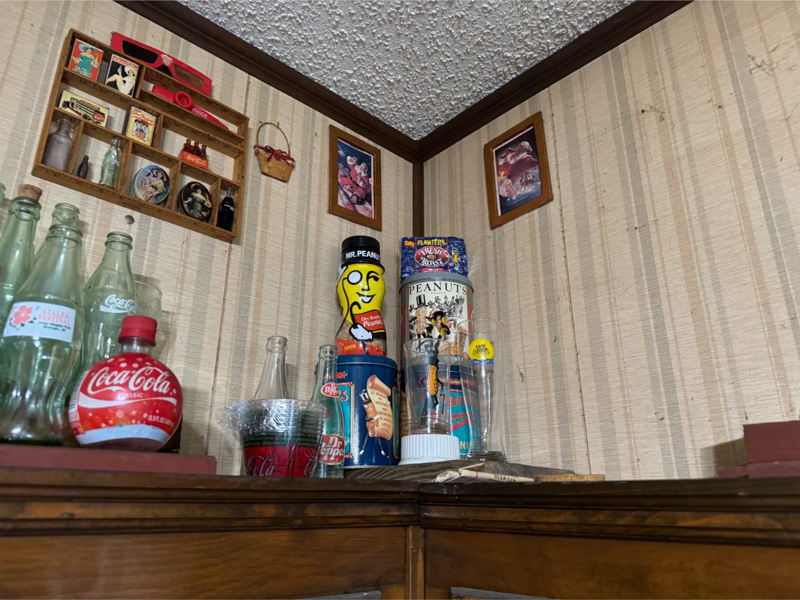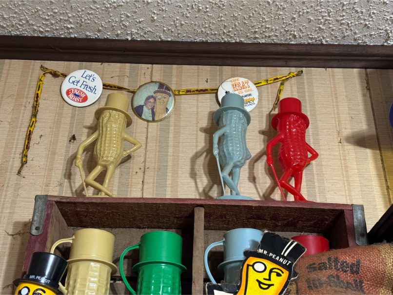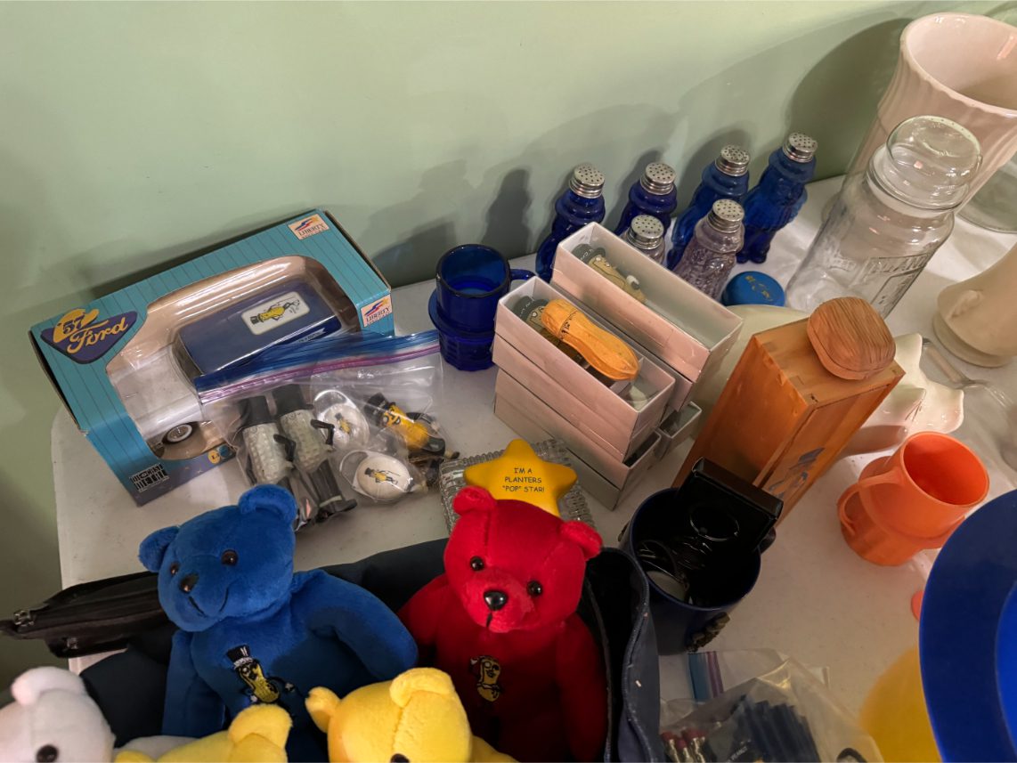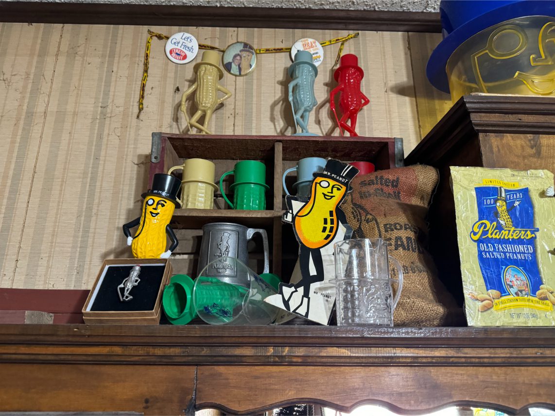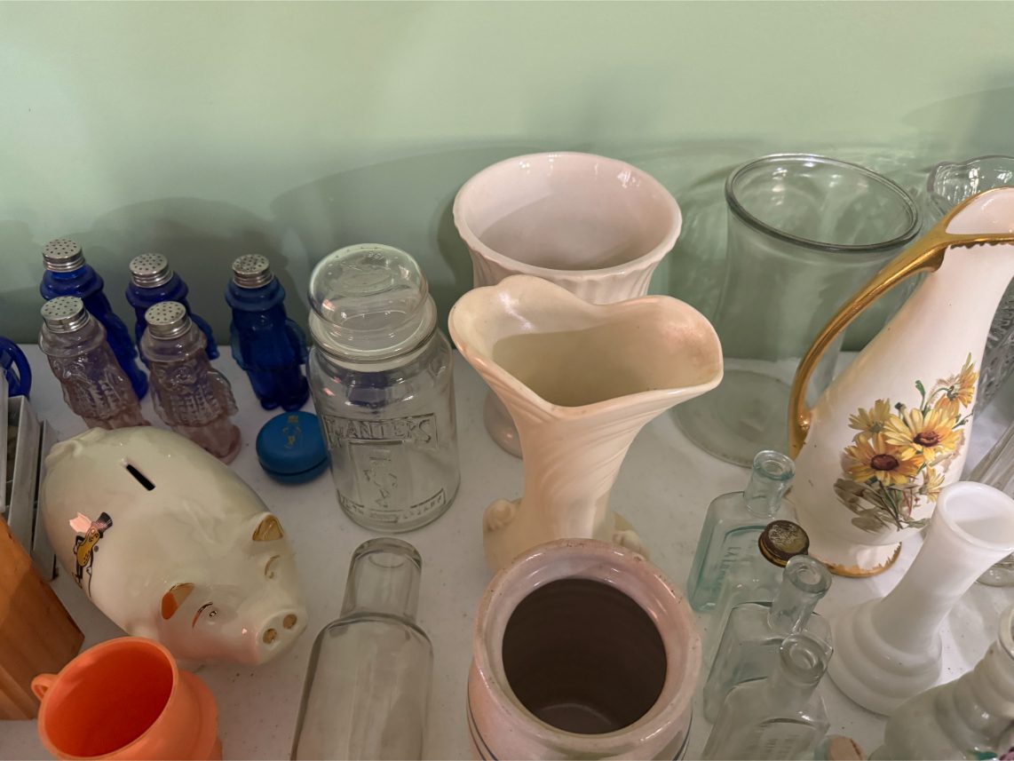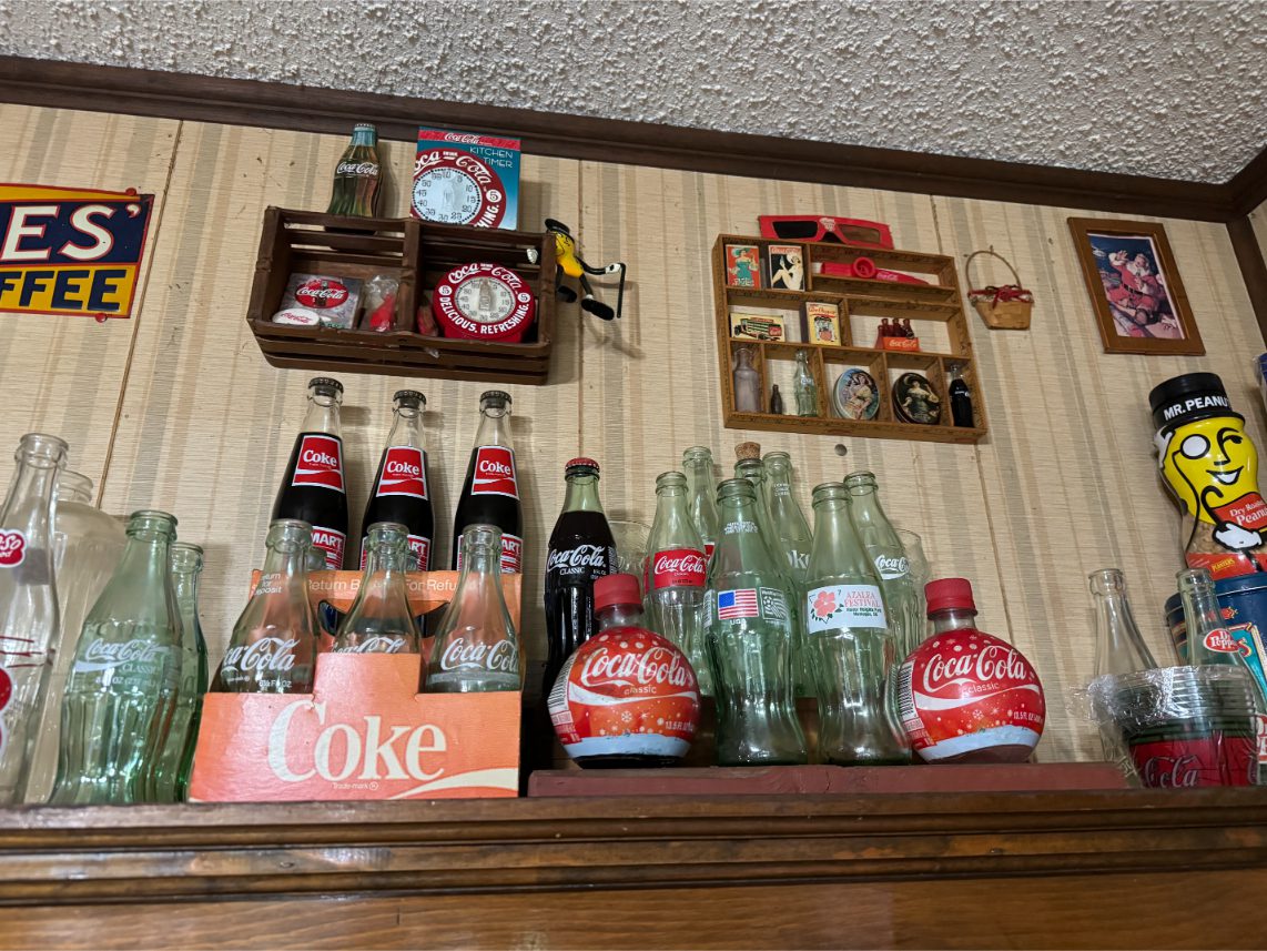 Antiques/Collectibles: Planters Peanuts – Tins – Coca-Cola Advertising – Arbuckles Coffee Sign – Rub Boards – Jars – Glass Bottles – Enamel – Coffee Cans – Peanut Jars – Radios – Planters Peanuts Salt/Pepper Shakers – Glass Rolling Pins – Hen on Nest – Kerosine Lamps – Fire Extinguisher – Typewriter Trays – Snuff Jars – Cigar Boxes – Quilts – Cast Iron Bell – Galvanized Tubs