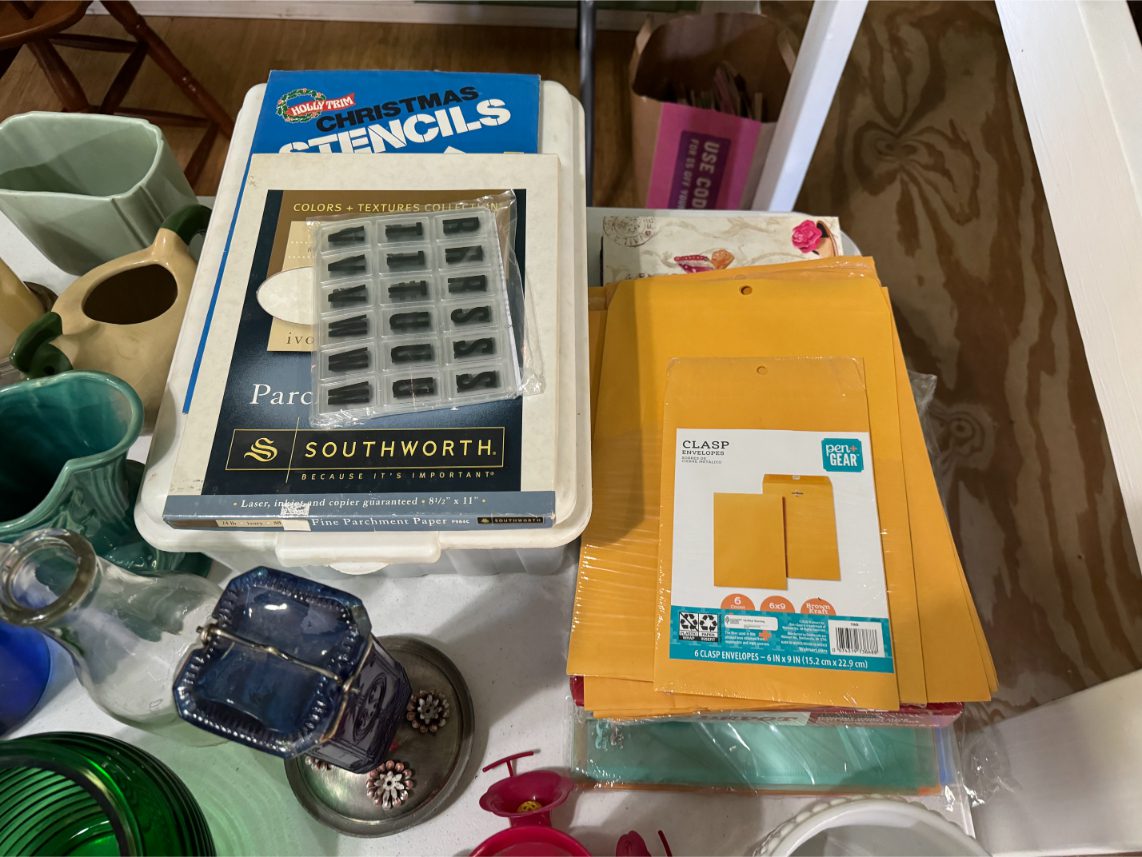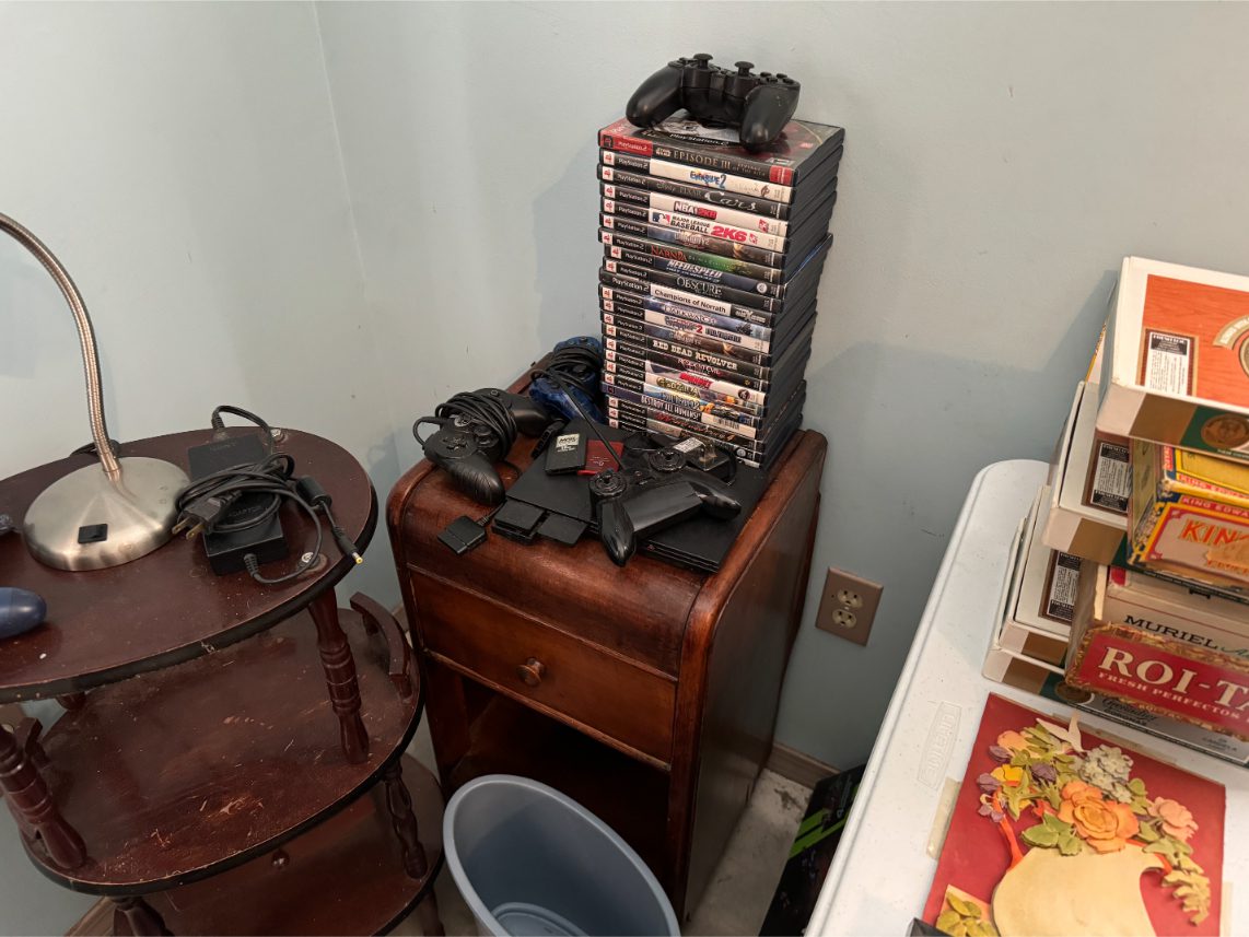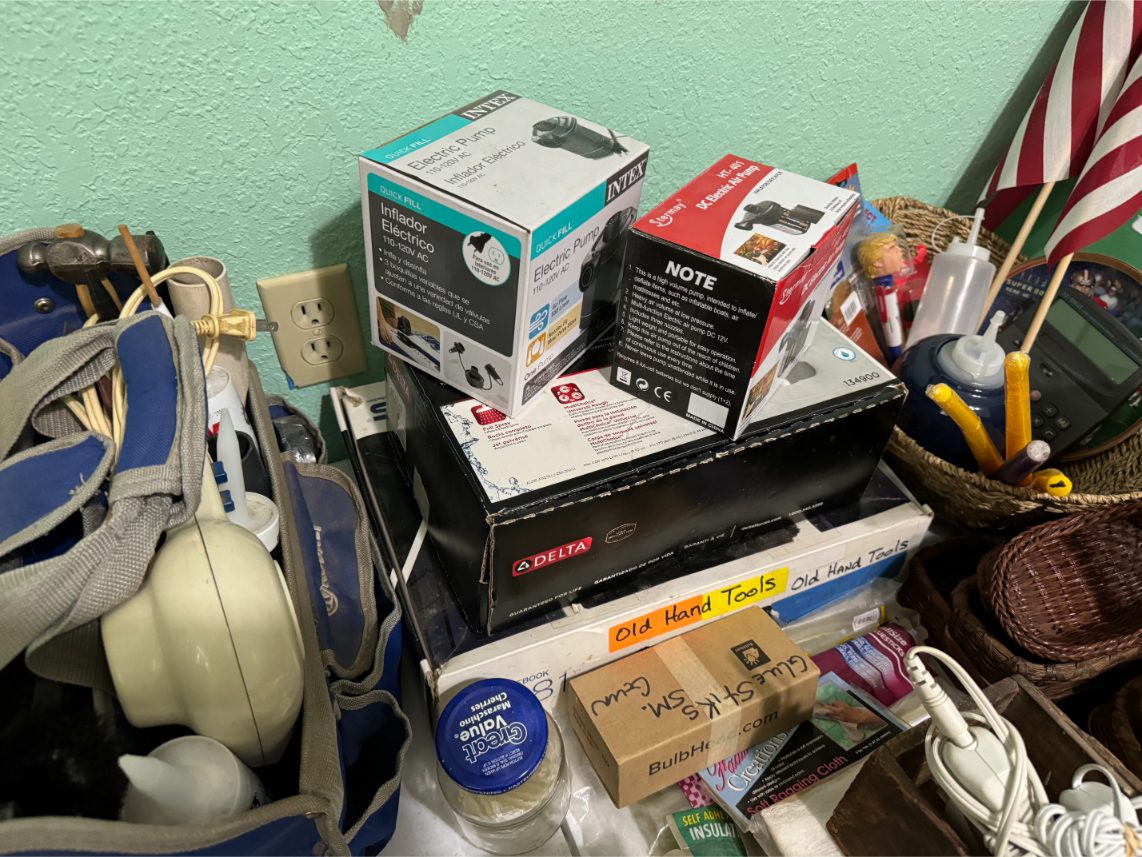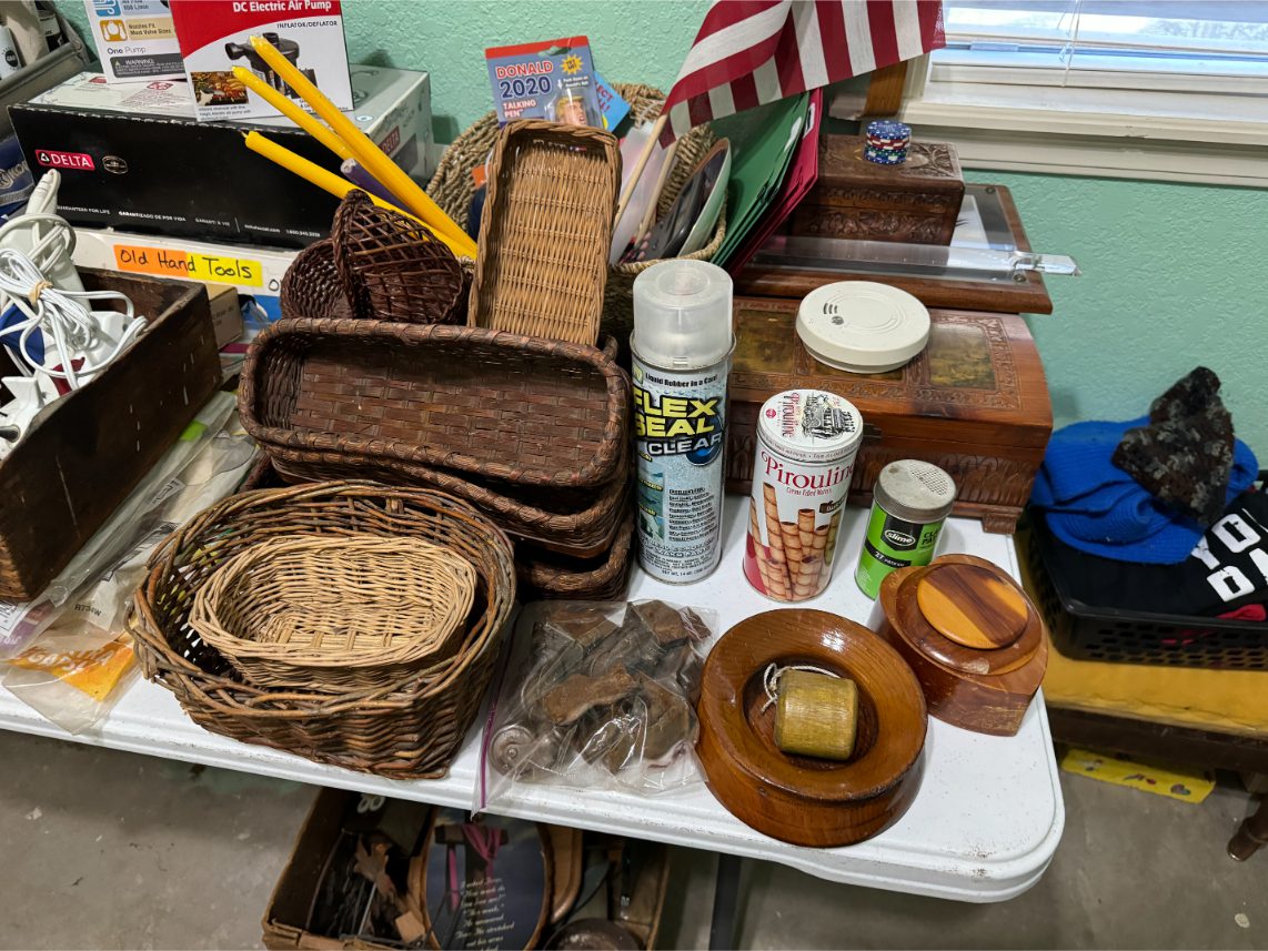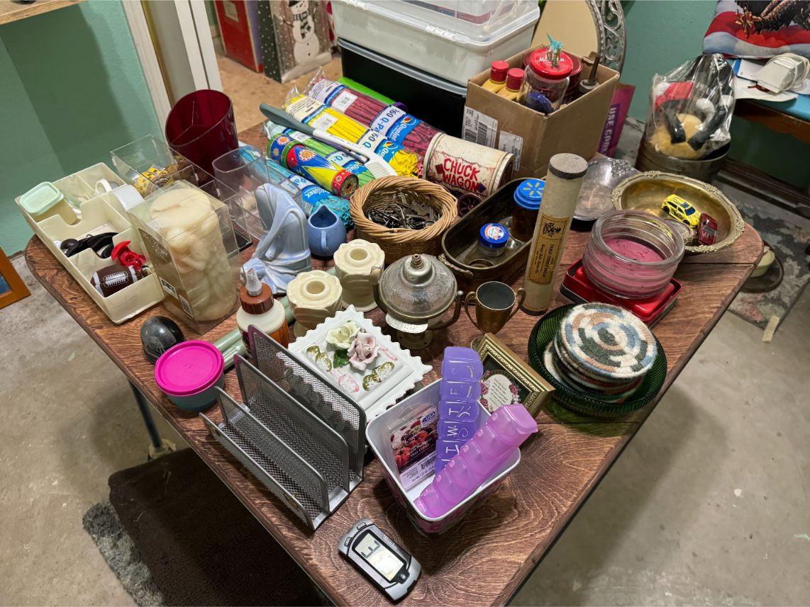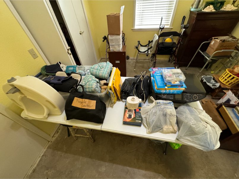 Household Items: Microwave – Kitchen Utensils – Kitchen Appliances – Pots/Pans – Bread Maker – Pitchers – Bowls – Tupperware – Glassware – VHS Tapes – Books – Pictures – Paintings – Sony Stereo – Vases – Clear Glass – Jewelry – Samsung TV – Whirlpool Washer – Whirlpool Dryer – Linens – Sewing Supplies – Record Player – Filing Cabinet – Medical Equipment – Playstation 2 and Games – Baskets – Mirrors – Electric Wheelchair