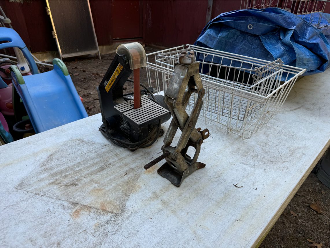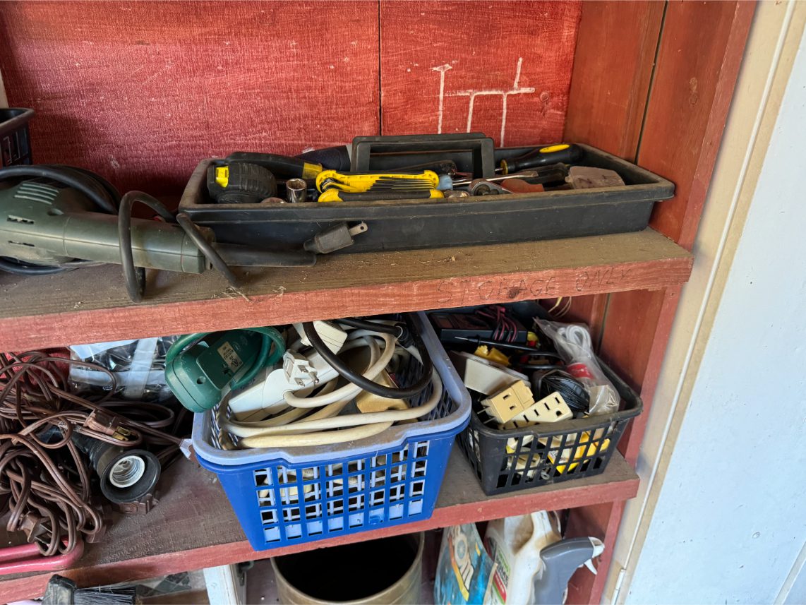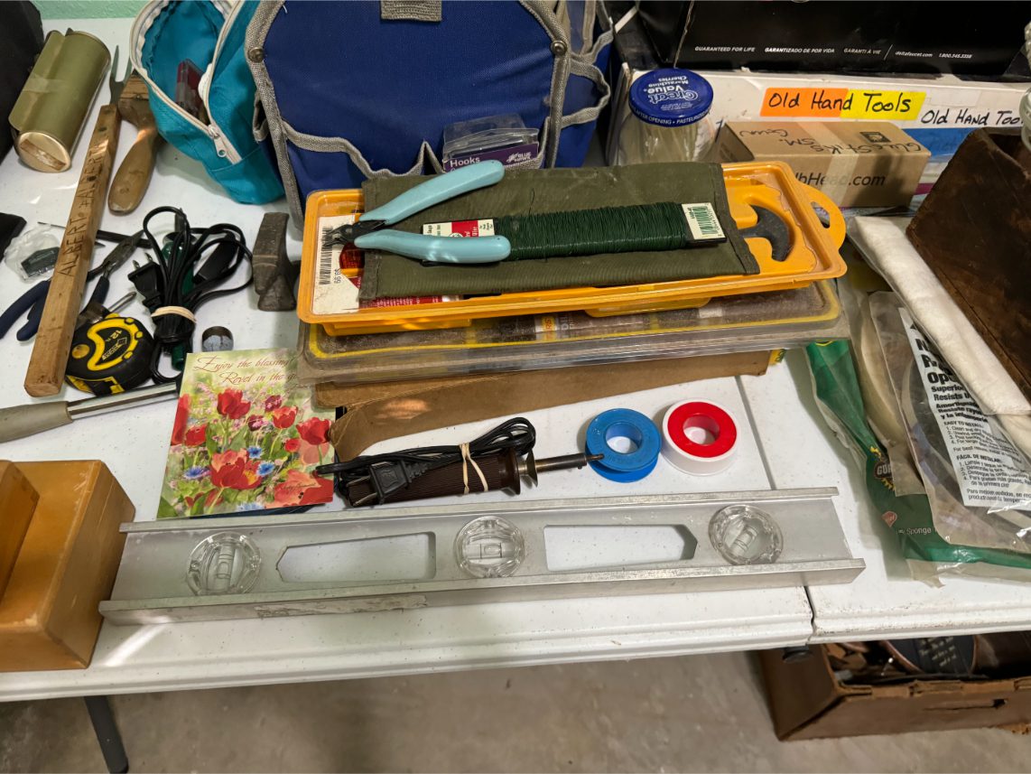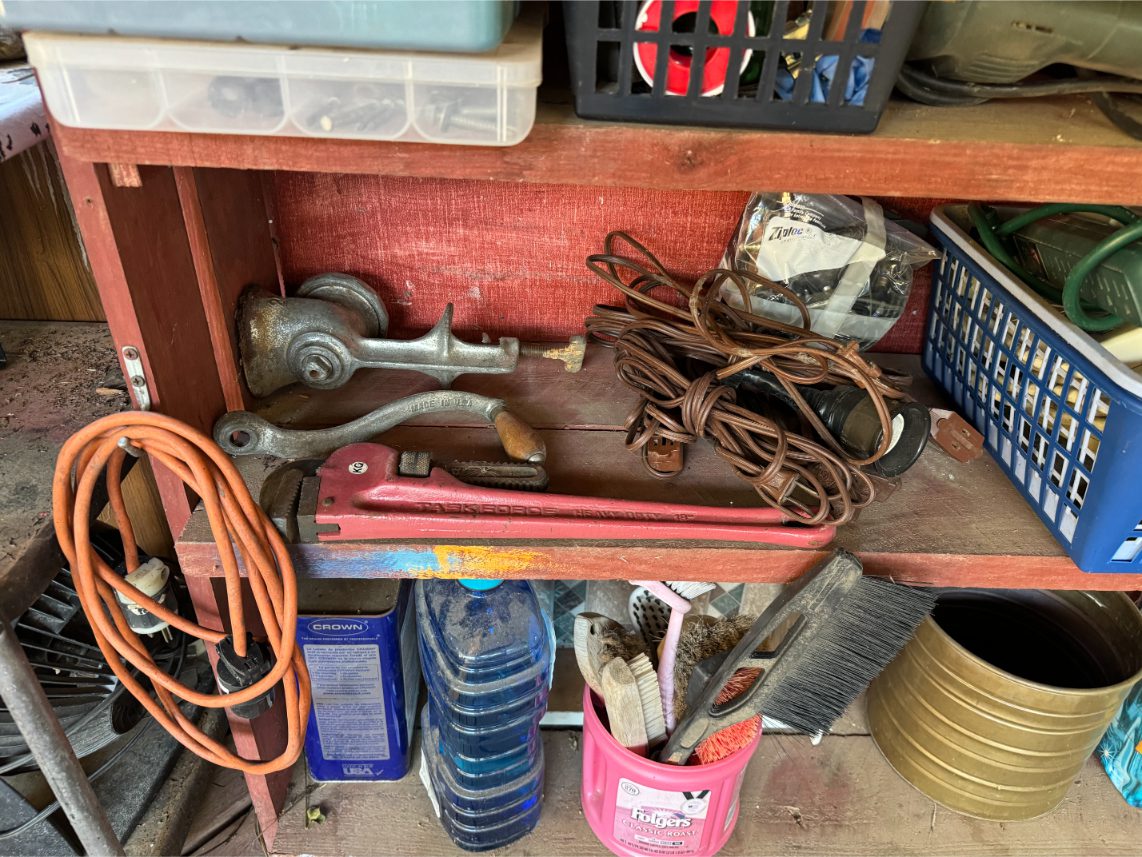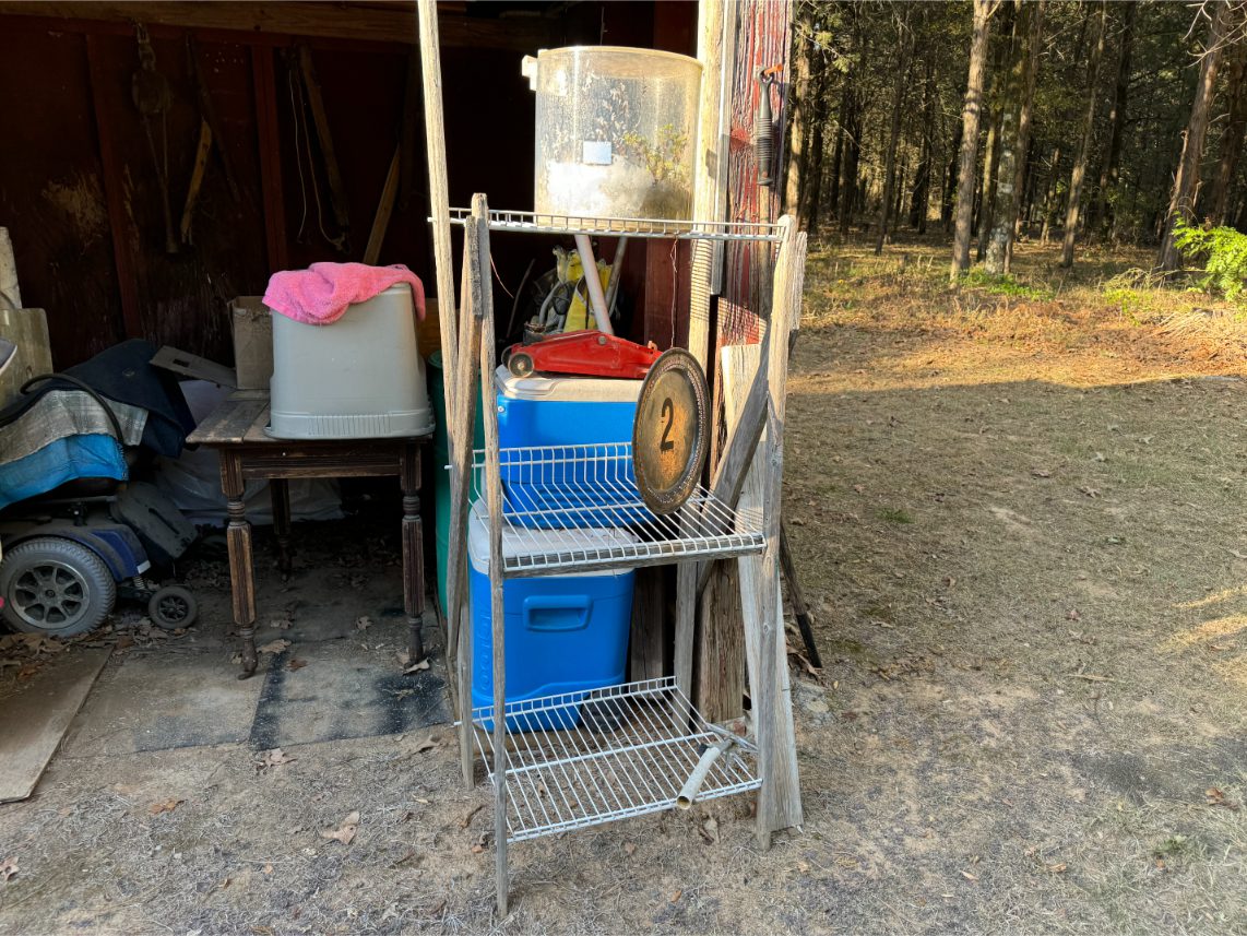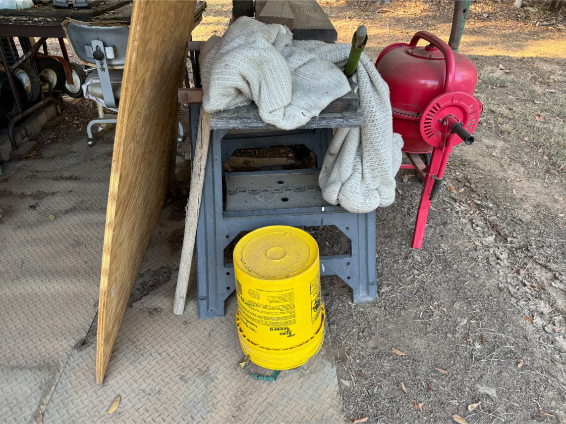 Shop Items: Fishing Rods and Reels – Hand Tools – Power Tools – Yard Tools – Smoker – Extension Cords – Bolt Bins – Belt Sander – Jacks – Wire Baskets – Coolers – Cot – Poulan Chainsaw – A-Frame – Dollies – Stainless Sink W/ Table – Metal Shelving – Cement Mixer – Floor Jacks – Saw Horses – Ladders
