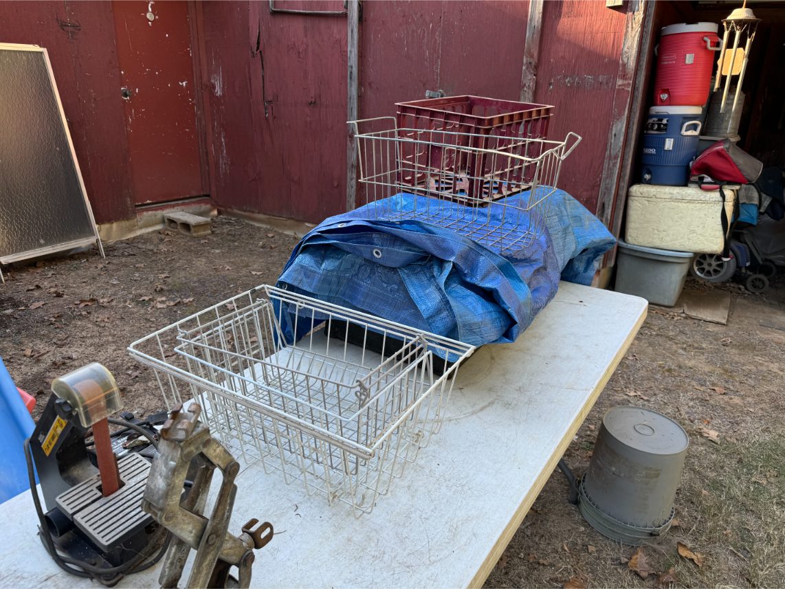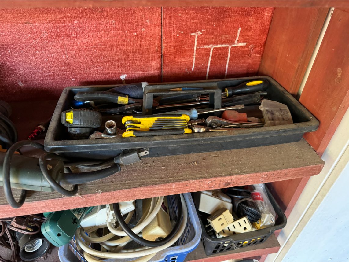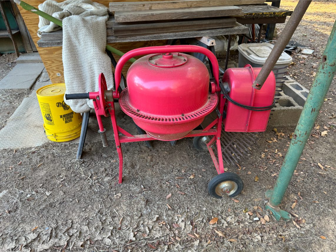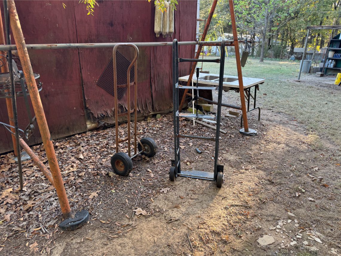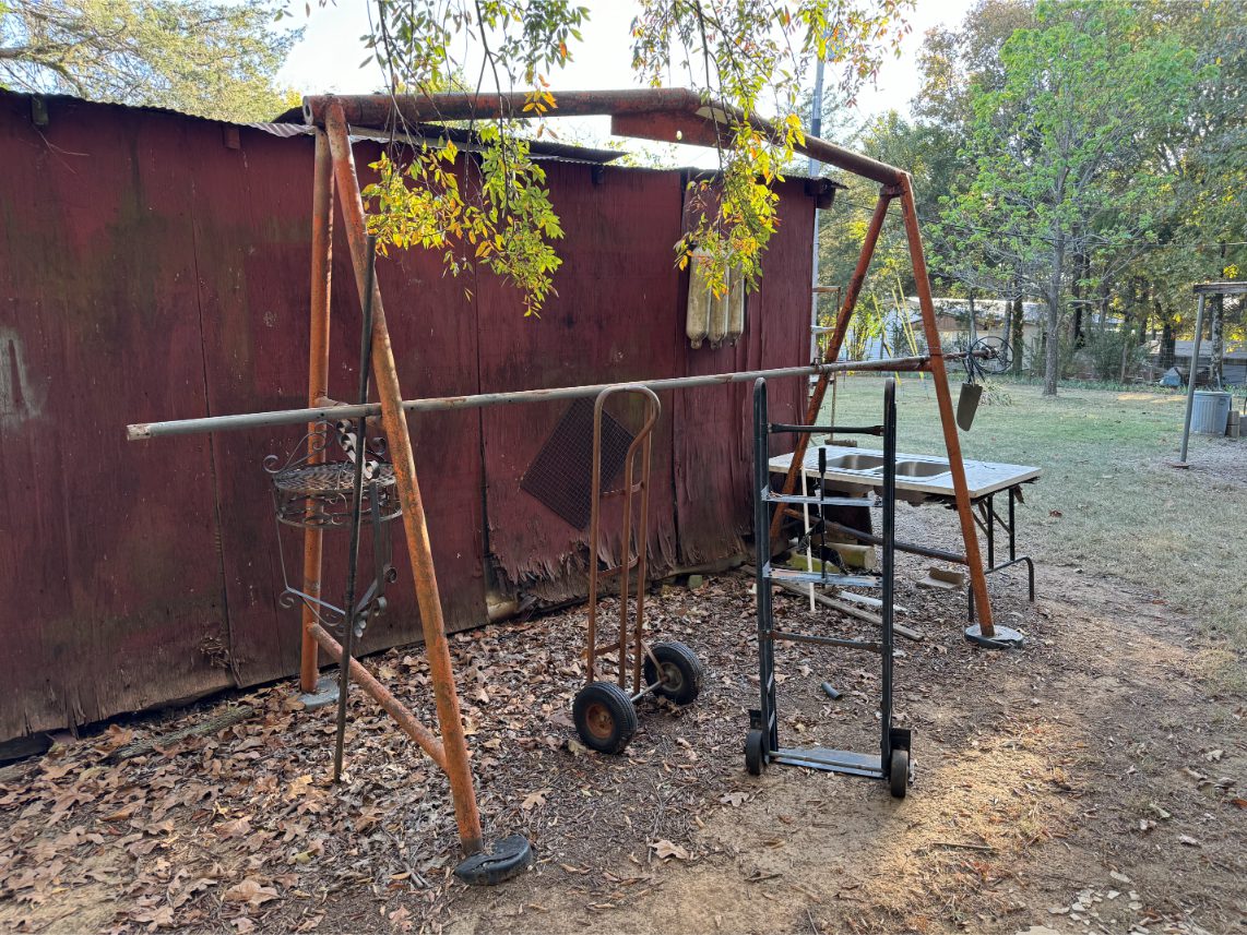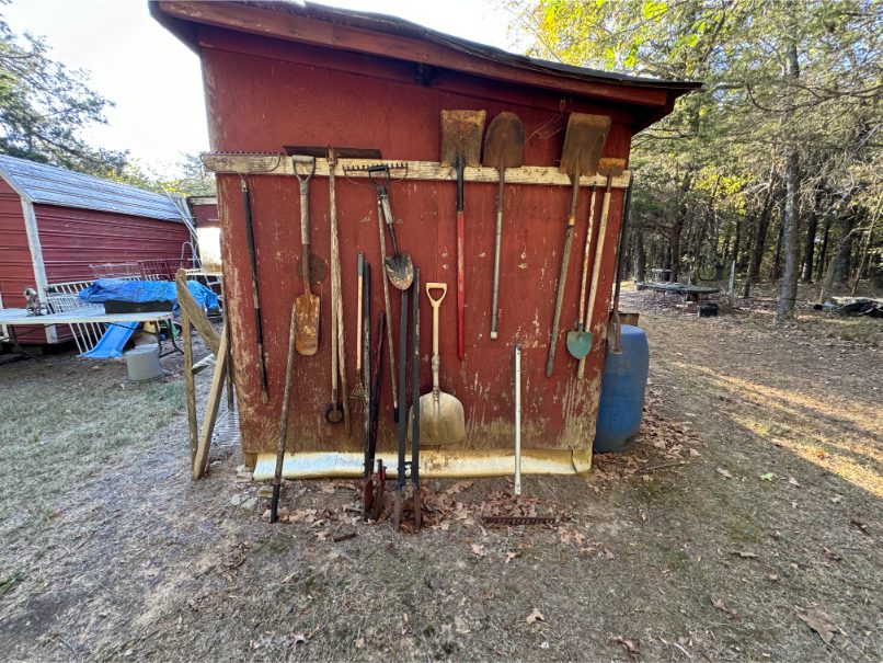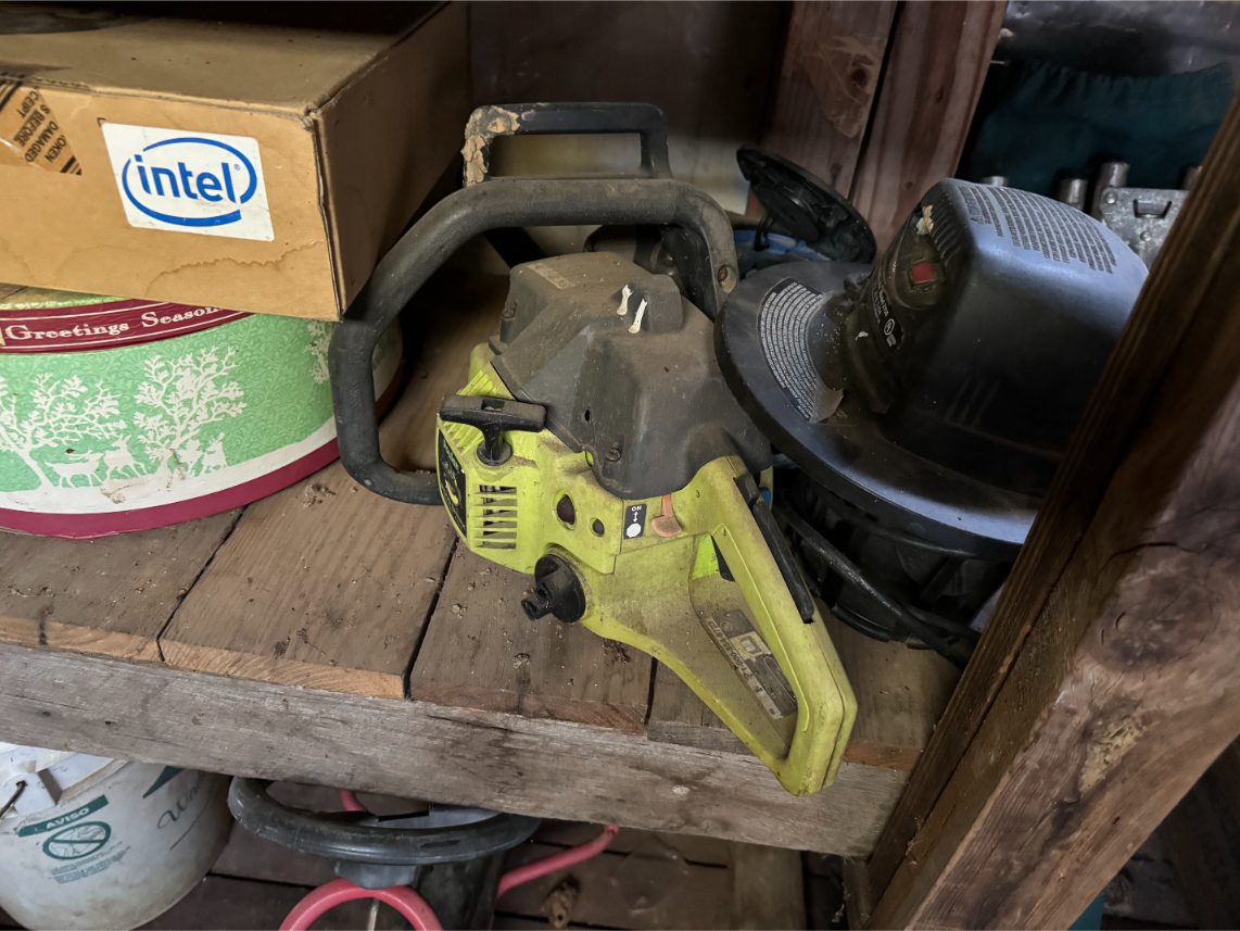 Shop Items: Fishing Rods and Reels – Hand Tools – Power Tools – Yard Tools – Smoker – Extension Cords – Bolt Bins – Belt Sander – Jacks – Wire Baskets – Coolers – Cot – Poulan Chainsaw – A-Frame – Dollies – Stainless Sink W/ Table – Metal Shelving – Cement Mixer – Floor Jacks – Saw Horses – Ladders