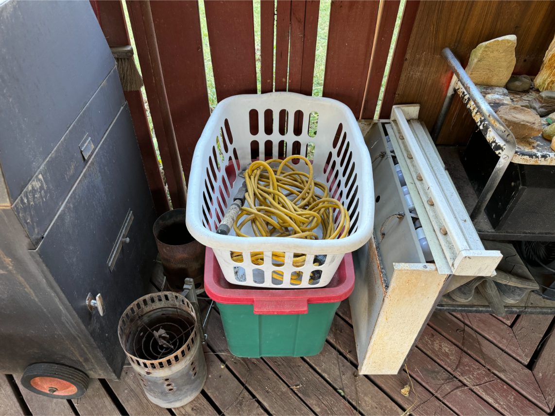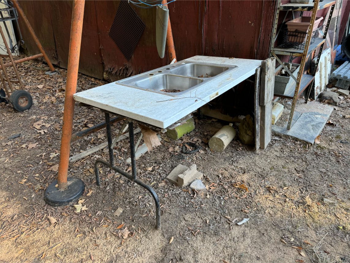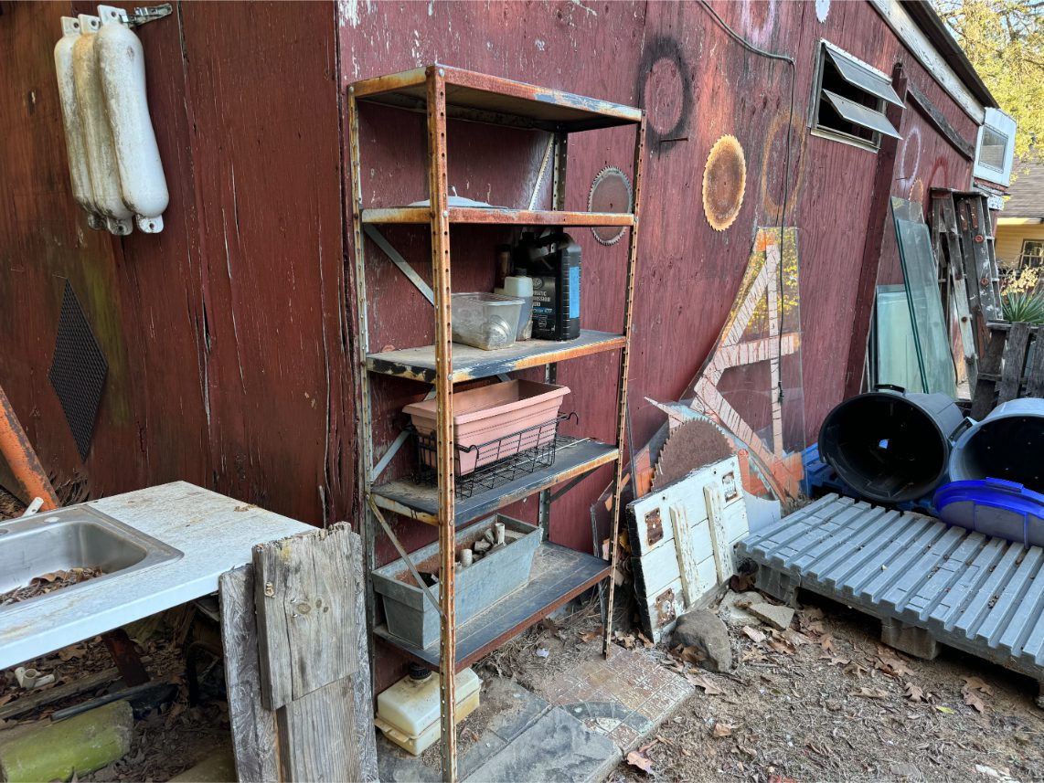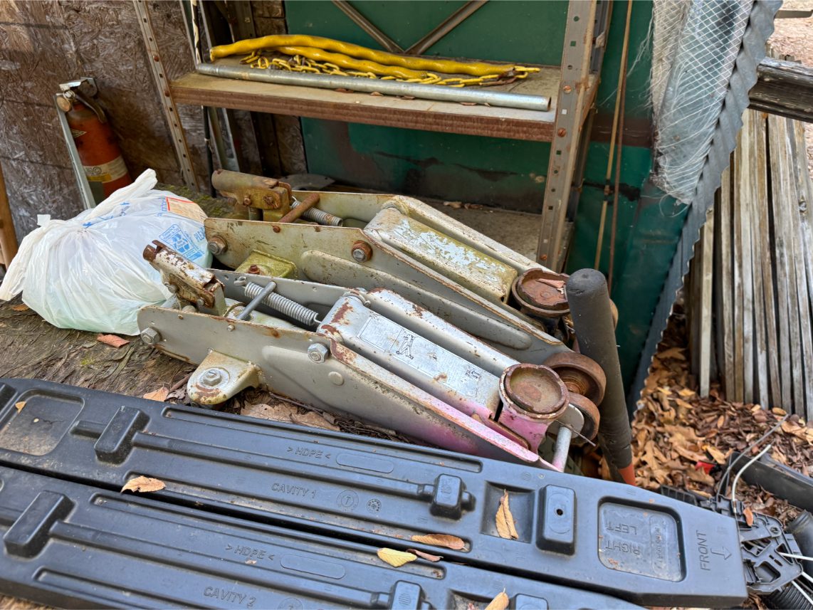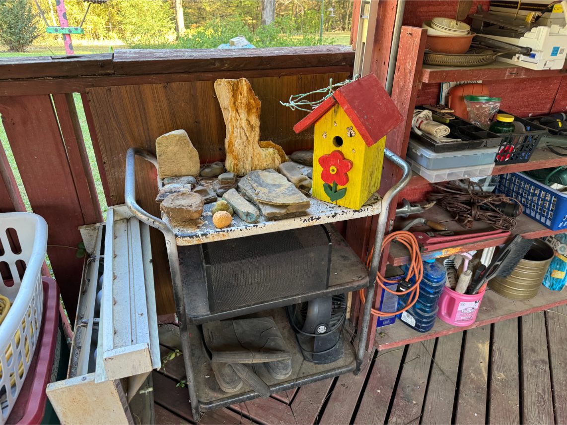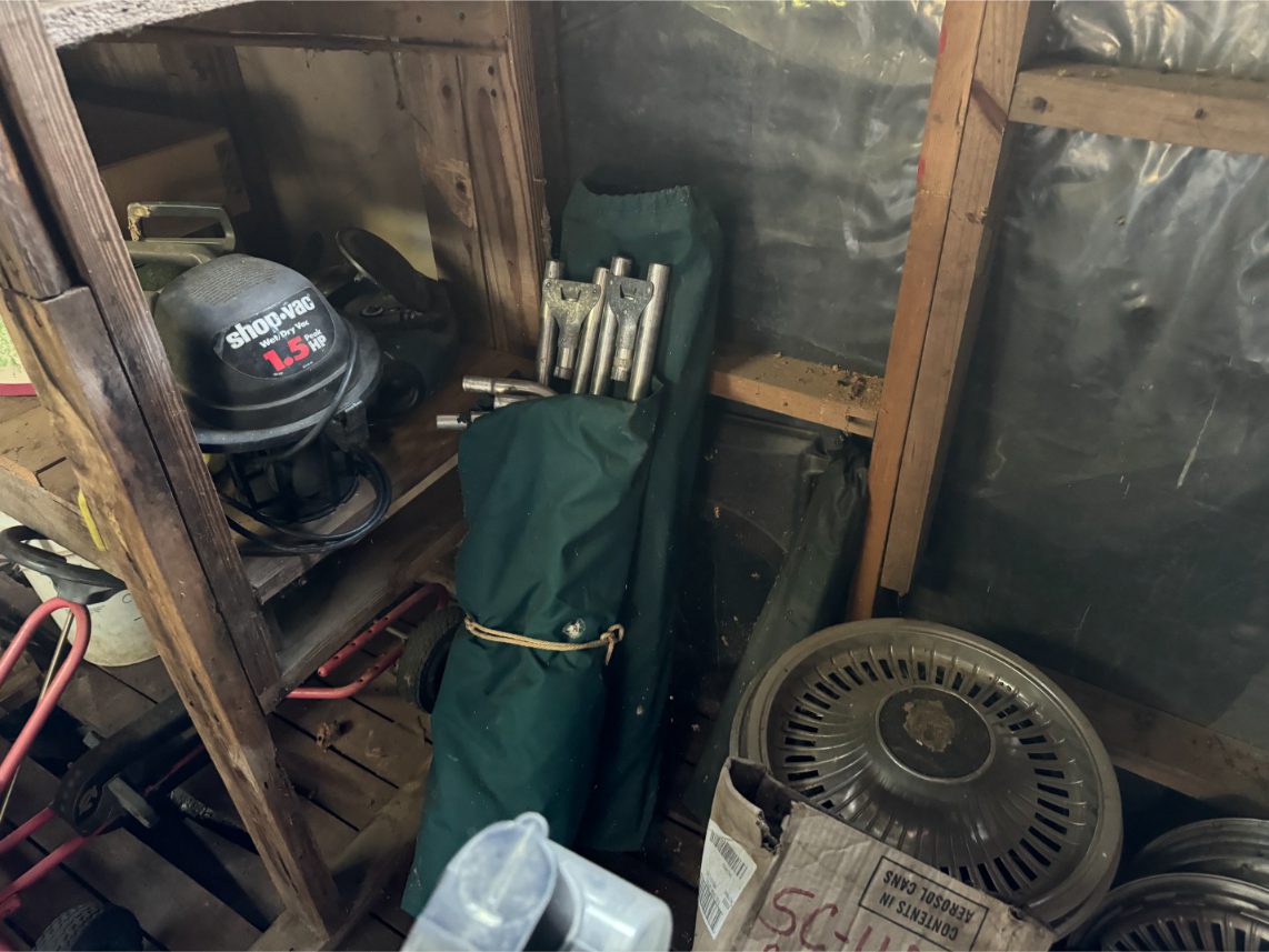 Shop Items: Fishing Rods and Reels – Hand Tools – Power Tools – Yard Tools – Smoker – Extension Cords – Bolt Bins – Belt Sander – Jacks – Wire Baskets – Coolers – Cot – Poulan Chainsaw – A-Frame – Dollies – Stainless Sink W/ Table – Metal Shelving – Cement Mixer – Floor Jacks – Saw Horses – Ladders