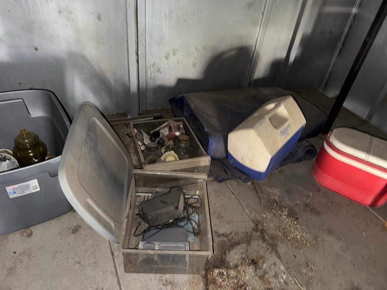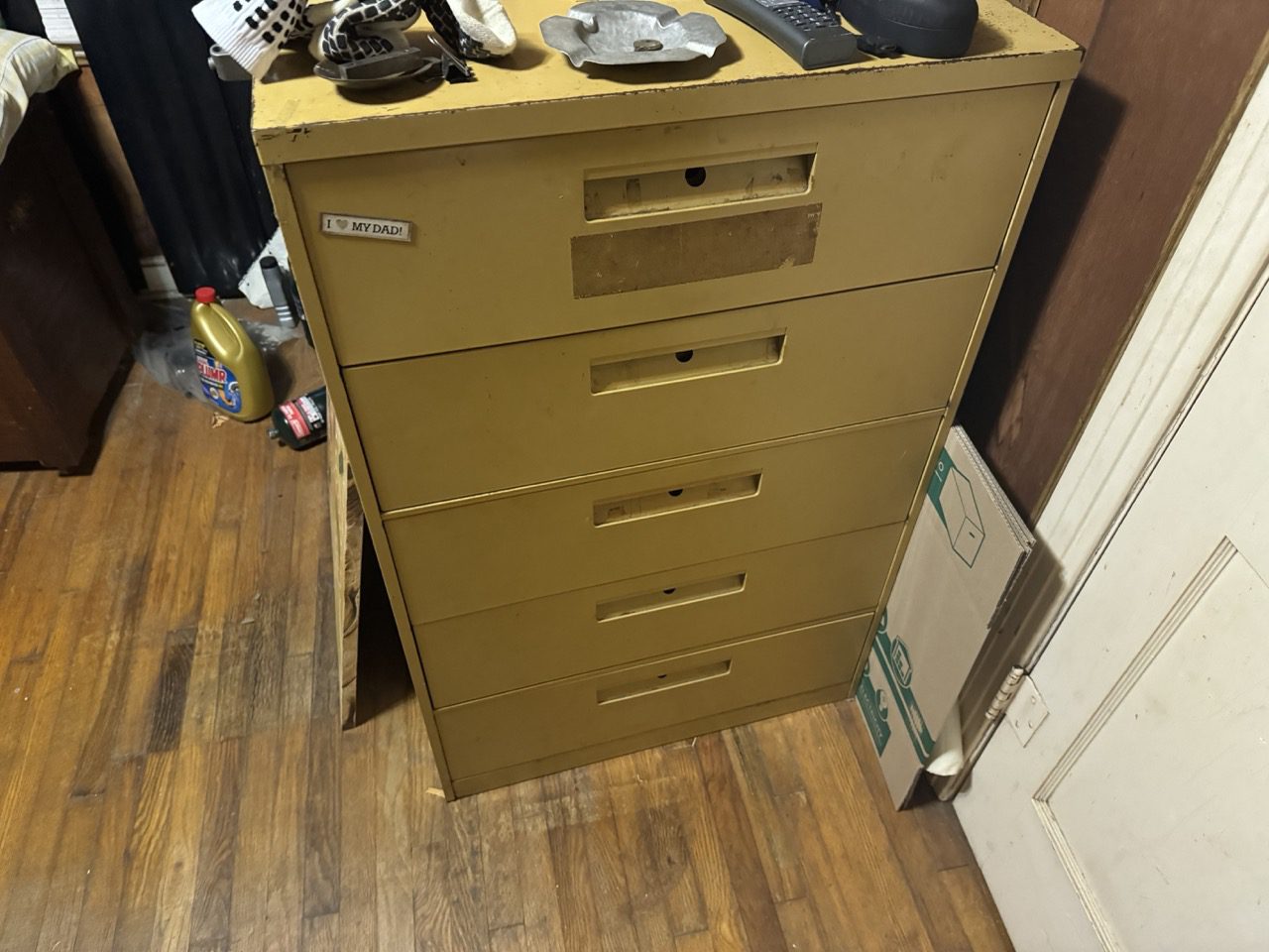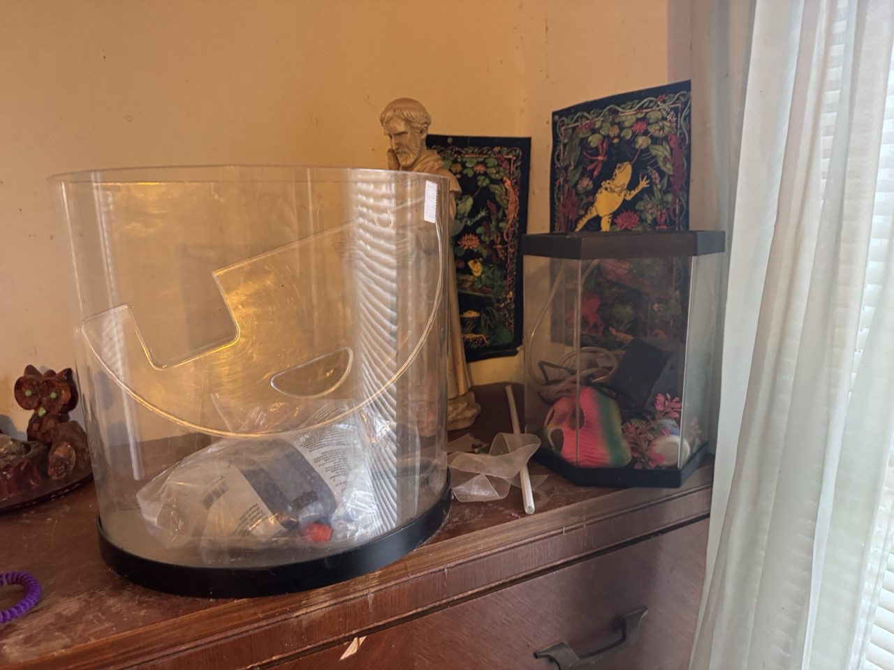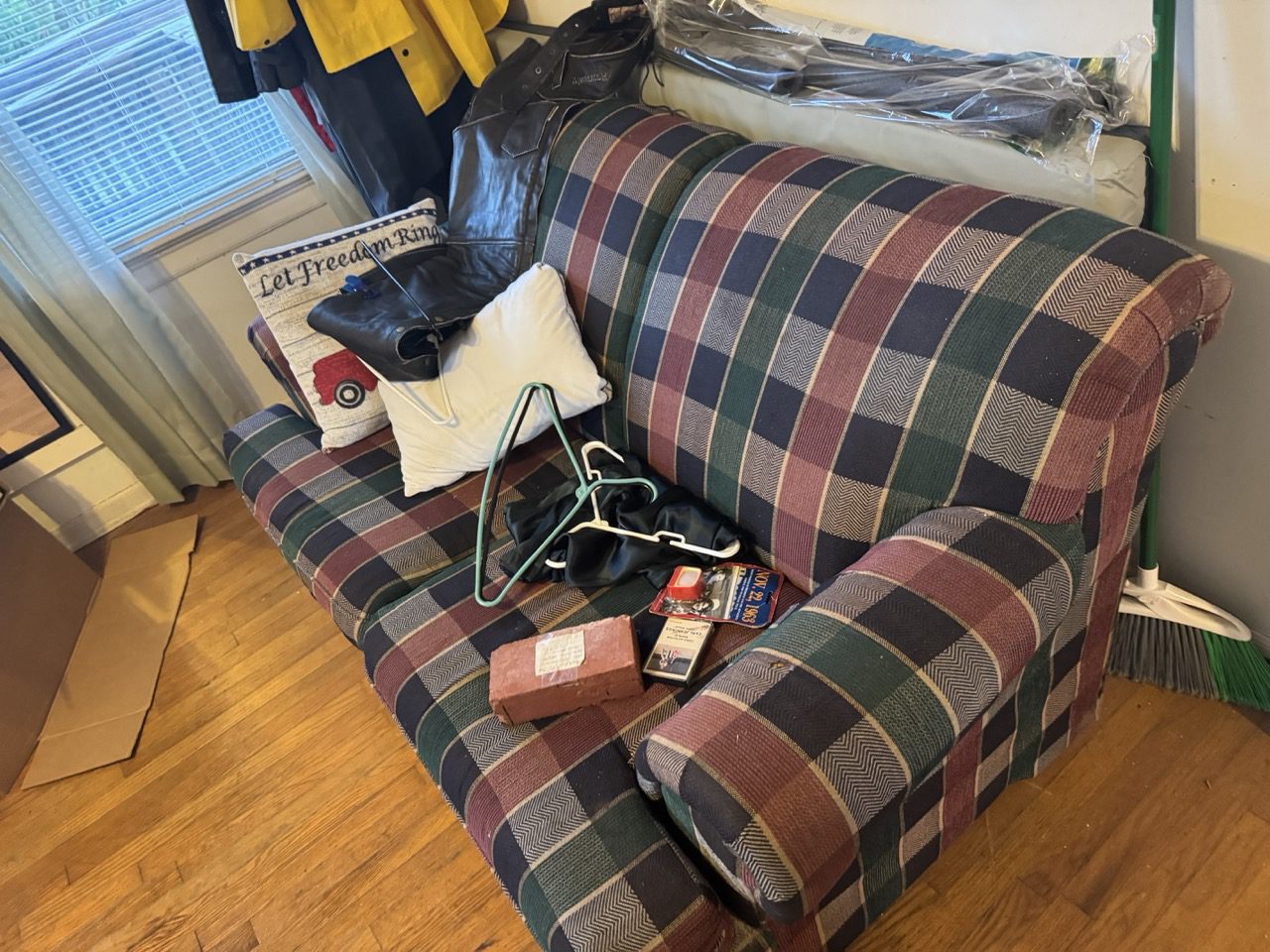 Household Items: Washer & Dryer – Refrigerator – File Cabinet – R/A Table – Marble Top Table – End Table – Rocking Chair – Plastic Organizers – Plaid Sofa – Chest of Drawers – Telescope – Dresser – Aquarium – Scales – Leather Coats – Oak Chest – Microwave – Glass Computer Desk – Glassware – Silverware