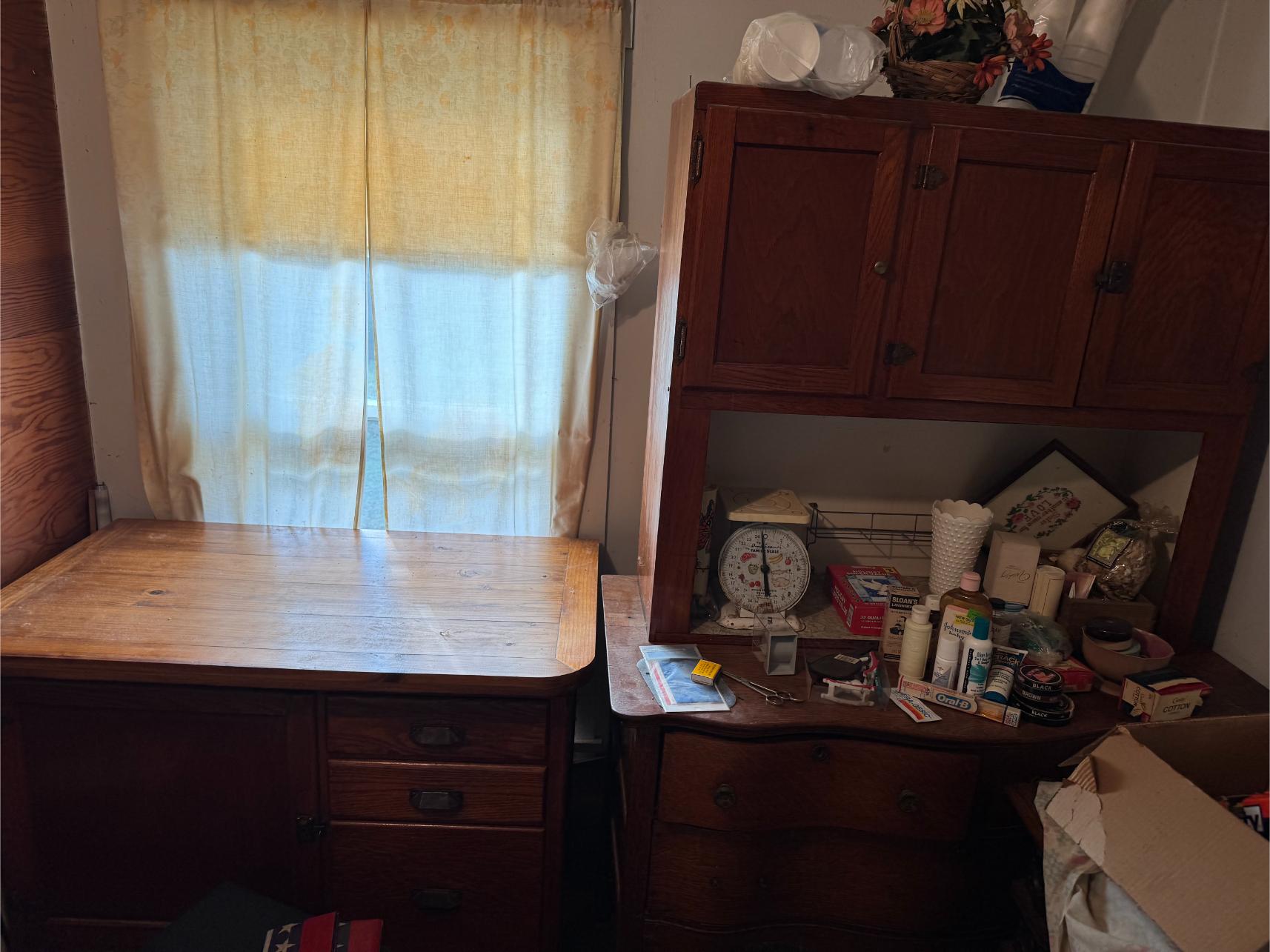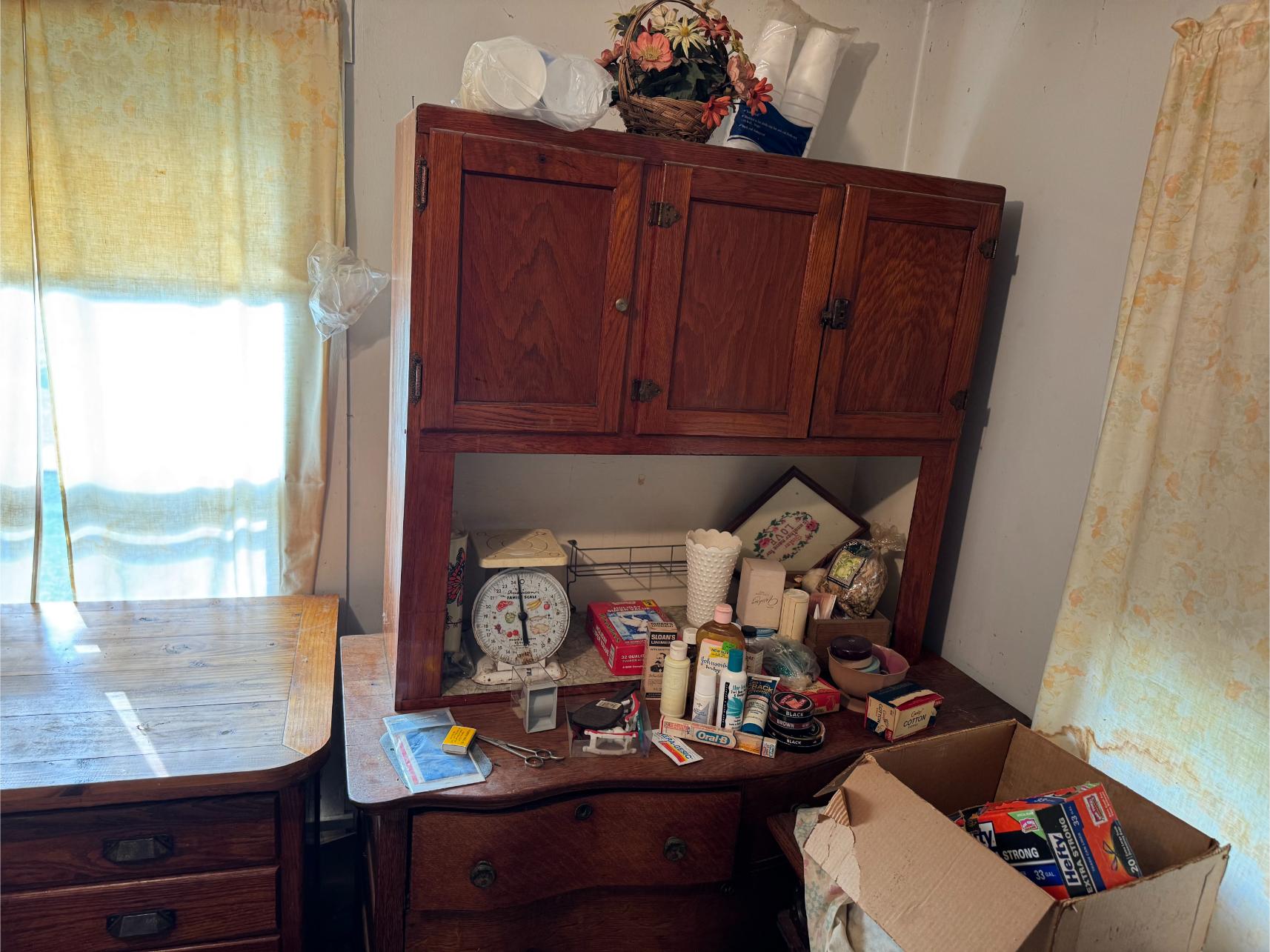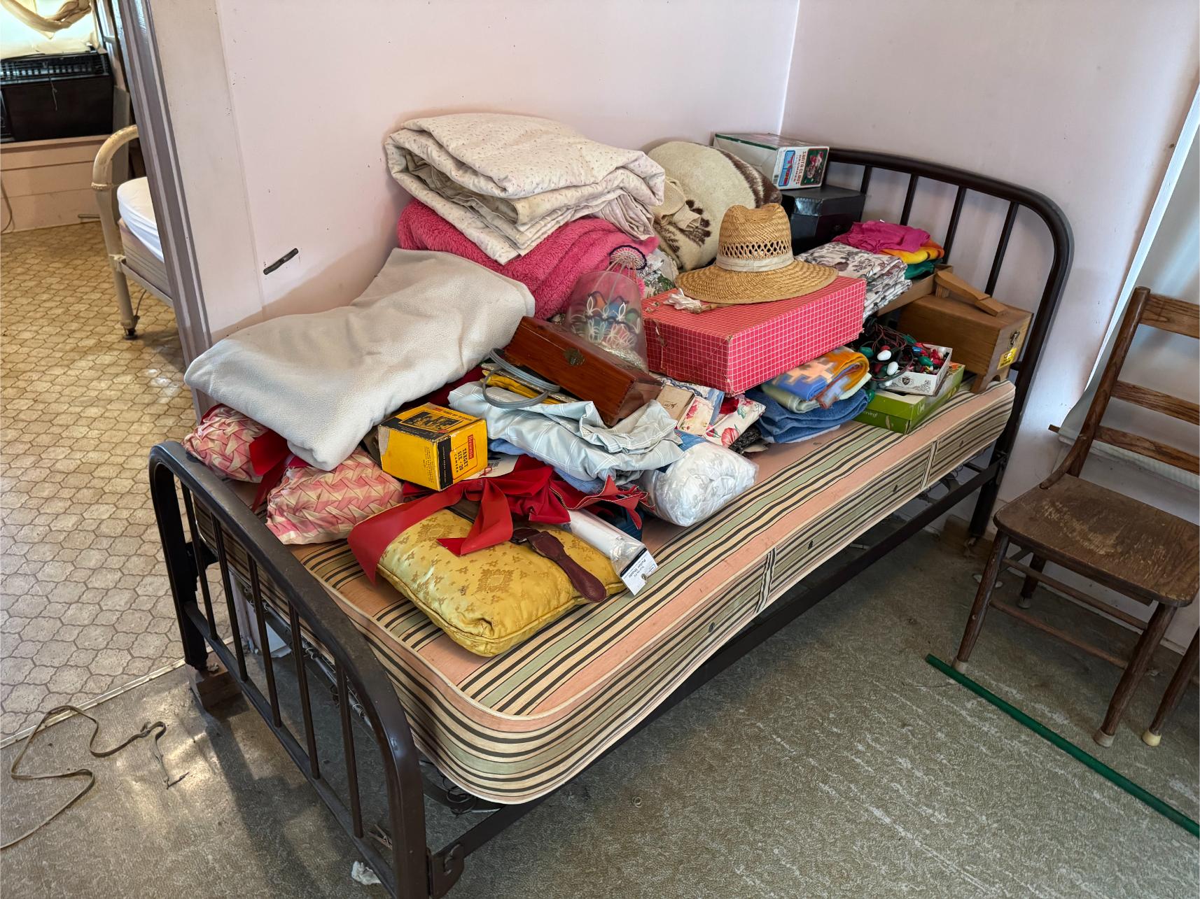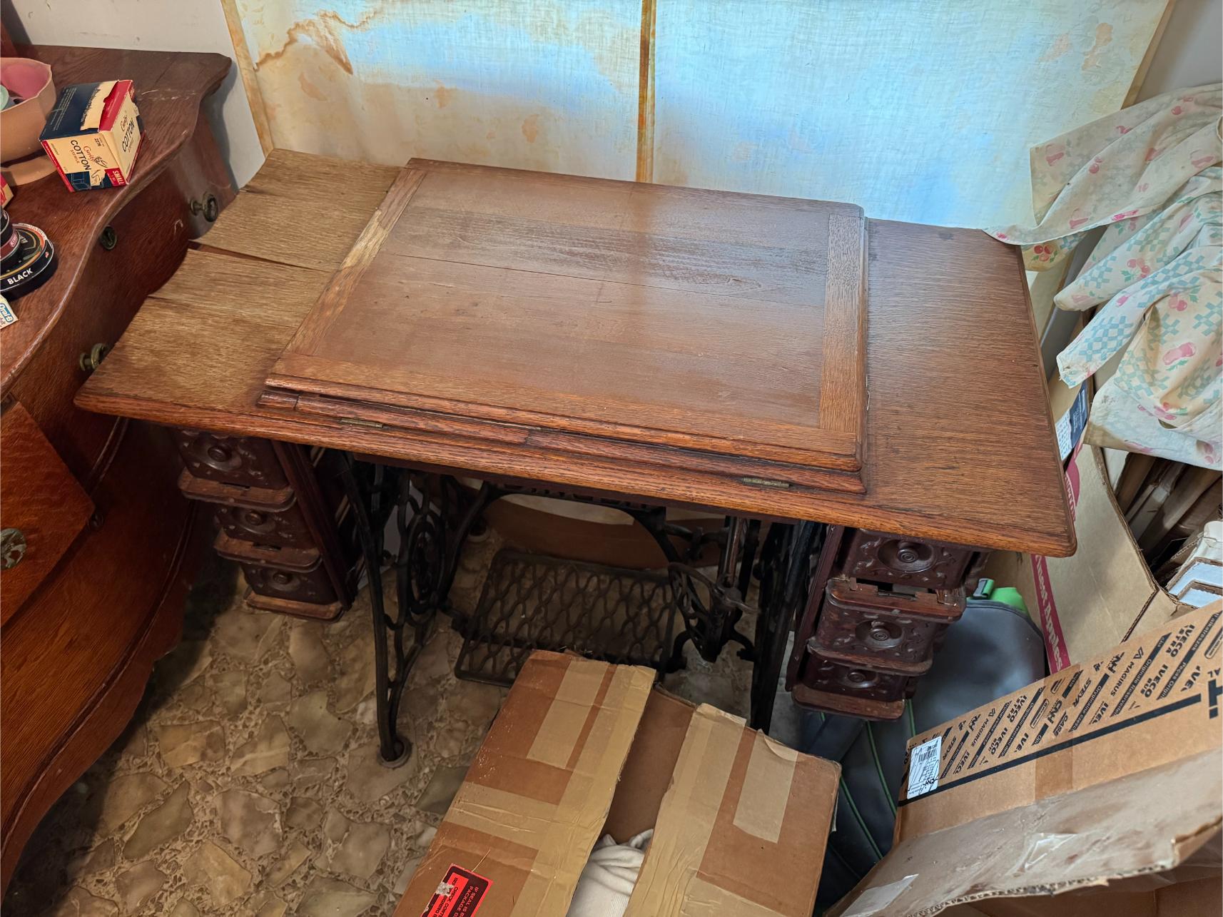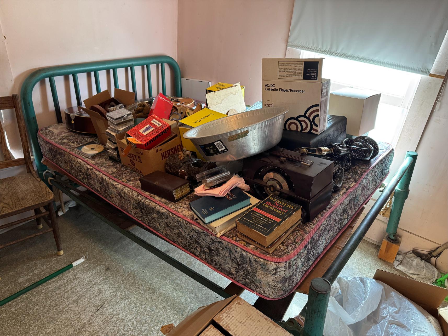 Antiques & Collectibles:Â Chrome Dinette & Chairs – Oak Kitchen Cabinet – Cherry End Table – Oak Chairs – Occasional Chairs – (3) Iron Beds – Metal Bed – Oak Serpentine Front Dresser – Dresser & Chest – Mahogany Dresser – Oak Wardrobe – Shelf – Concert Turn Table (in case) – Silvertone Mandolin – Zenith Radio – Singer Treadle Sewing Machine – Pipes – Razor Straps – Lamps – Kerosene Lamp – Cookie Jar – Pyrex – Melmac Dishes – Figurines – Crock – Stone Bowl – Iron Skillets – Cream Cans – Stetson Hat w/Box – Linens, Crochet – Clock – Big Ben Alarm Clocks – Wringer Washer – Galv Tub & Buckets – Grinding Stone on Stand – Wood Wagon Bows – The Harrand Company Organ – Saddles, Harness – Carpenter’s Box – Small Anvil – 2-Man Saws – Nail Keg – Hand Tools – Single Trees – Cotton Scales – Cow Bells – Well Pulleys – Vintage GamesÂ