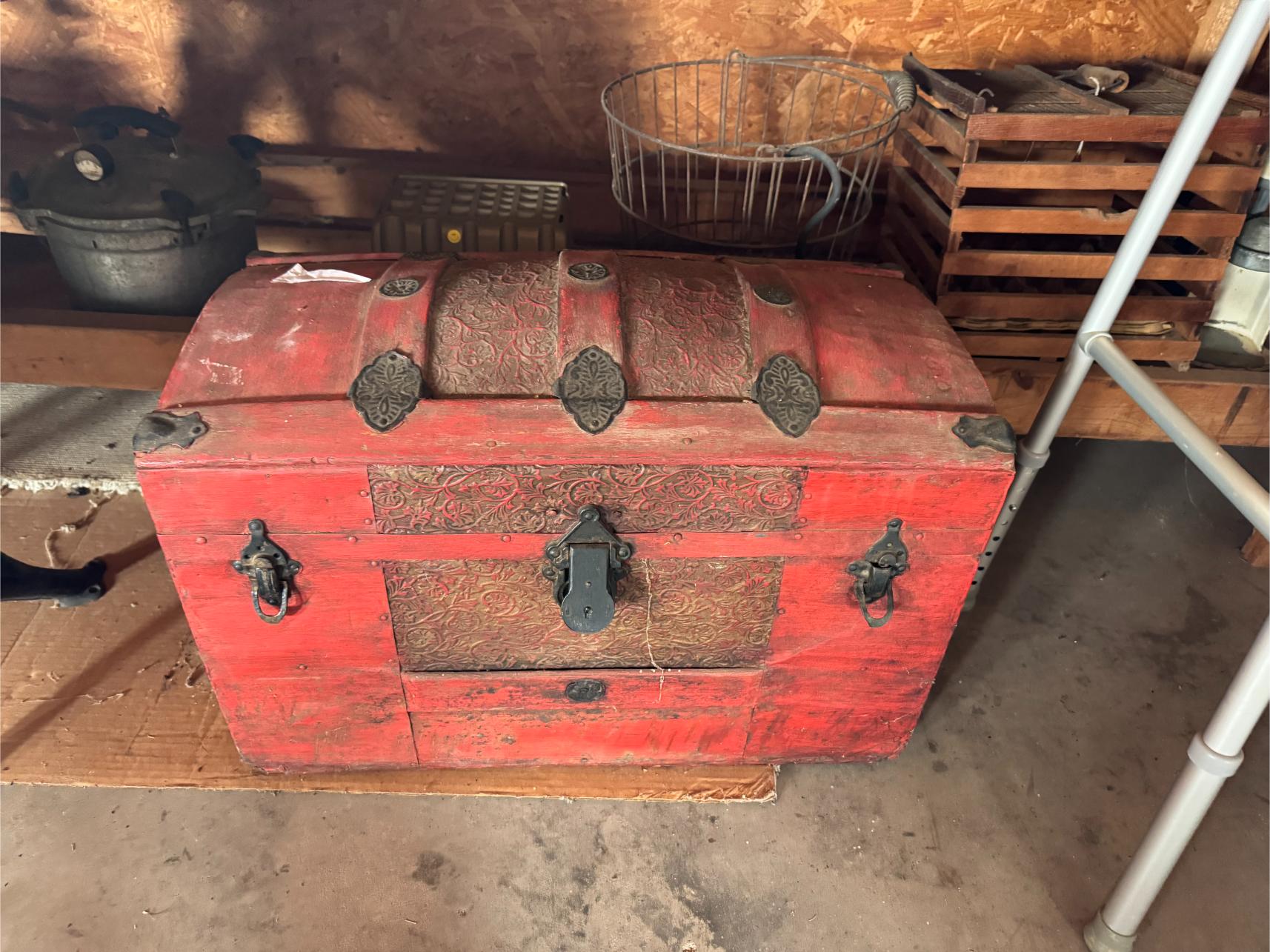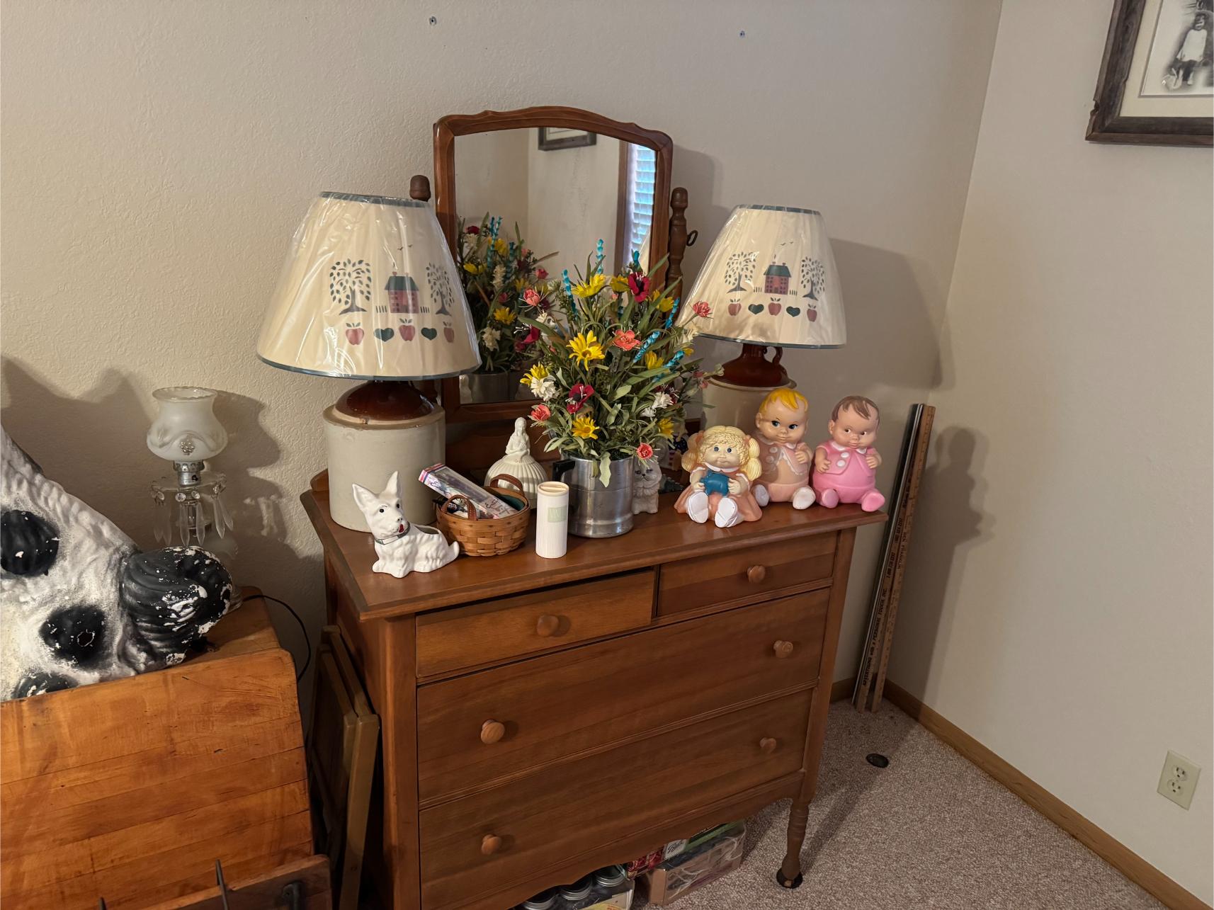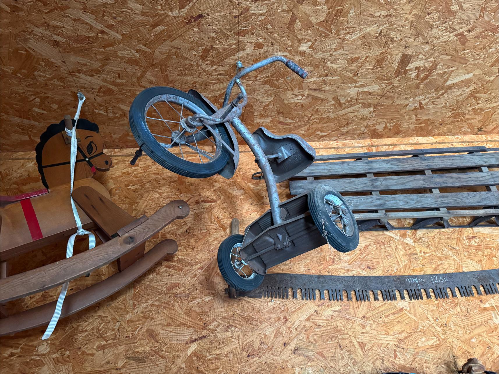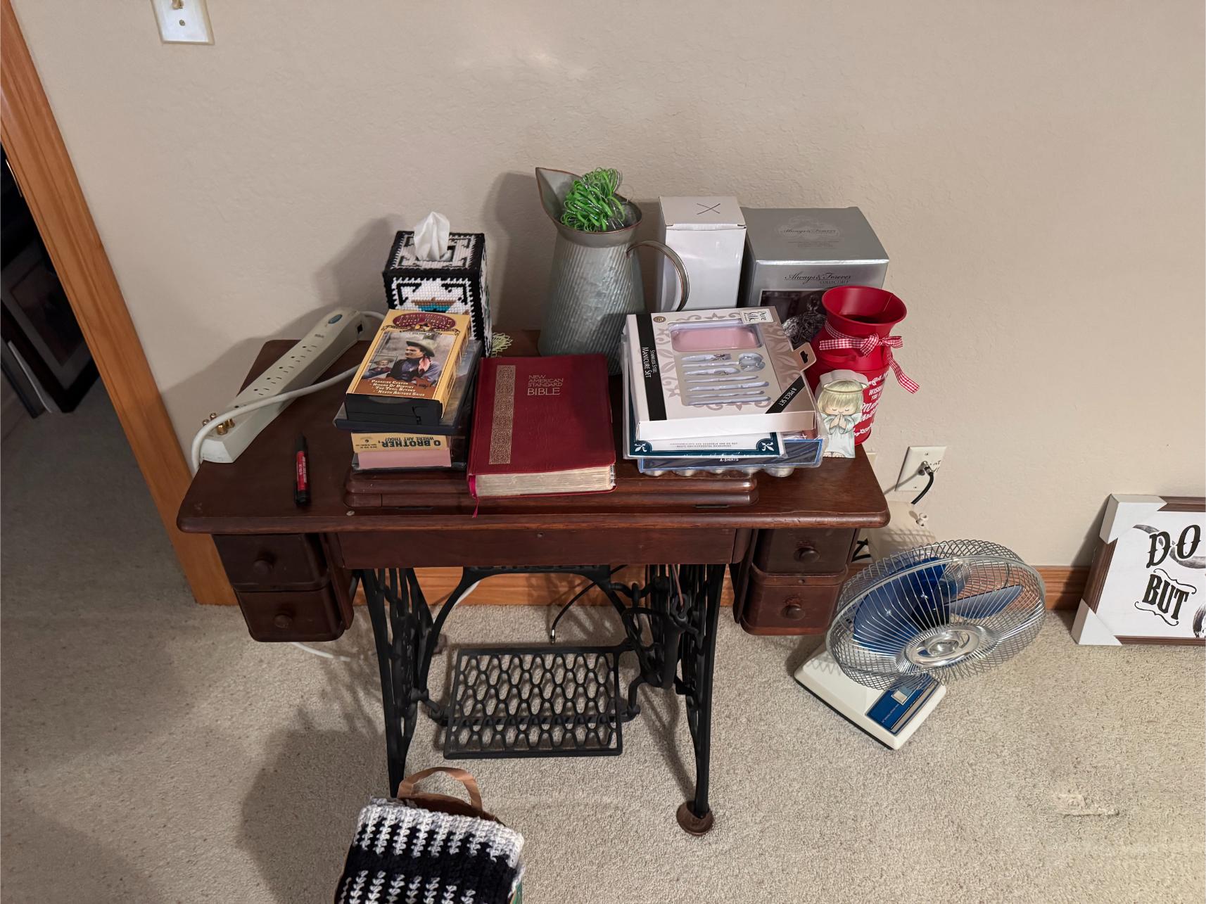Antiques & Collectibles:Â Oak Kitchen Cabinet – Oak Table & 6 Ladder Back Chairs – Pie Safe – Oak Washstand – Oak Curio – Center Table – Produce Cart – Acme Ice Cream Freezer – Rockers – School Desk – 6′ Showcase – Enamel Cook Stove – Iron Bed – Oak Dresser – Treadle Sewing Machine – Camel Back & Sq Trunks – Lane Cedar Chest – Wrought Iron Tables & Chairs – Oak High Chair – Glass & Wood Churns – #4 Churn – #3, #5 & #10 Crocks – Crock Bowls – Stoneware Bowls & Cookie Jar – McCoy & Hull Pottery – Fire King Bowls & Cups – Green Tea Glasses – Snuff Glasses – Green Oatmeal Dishes – Carnival Glass – Franciscan Desert Rose Dishes – Tom & Jerry Bowl & Cups – Milk Glass – Wexford – Head Vases – Glass Baskets – Scottie Dog Collection – S&P Collection – Refrigerator Dishes – Cast Iron Skillets – Medicine Bottles – Enamel Coffee Pot – Glass Paper Weights – Marbles – Egg Scale – Fans – Purses – Pictures – Costume Jewelry – Sewing Box – Longaberger Basket – Thermometers – Kerosene Lamps – Aladdin Lamps – Butter Molds – Rope Box – Post Cards – Tin Toys – Barbie & Cabbage Patch Dolls – Stigler Drug Co Cash Register & Stand – Crank Telephone – Lanterns – Rub Boards – Wagon Hub – Mannequin – Sad Irons – Rocking Horse – Tricycles – Wood Chicken Coop – Chicken Feeder – Push Garden Plows – Coke Box – Iron Wheels – Egg Basket & Crate – Well Pulley – Ice Tongs – Painted Saw Blades – 2-Man Saws – Cow Skulls – Walking Sticks – Cow Bells – Iron Wash Pot – Metal Lawn Chairs – Corn Sheller & Box – Cream Cans – Water Pump – Tractor Seats – Whiskey Barrels – Cotton Scales – Hames – Platform Scales – Purina Scale – RR Crossing Sign & Light – Metal Tindle Feed Sign – Dekalb Seed Dealer Sign – Texas Cattleman Sign – Cast Iron Bells – Telephone Booth