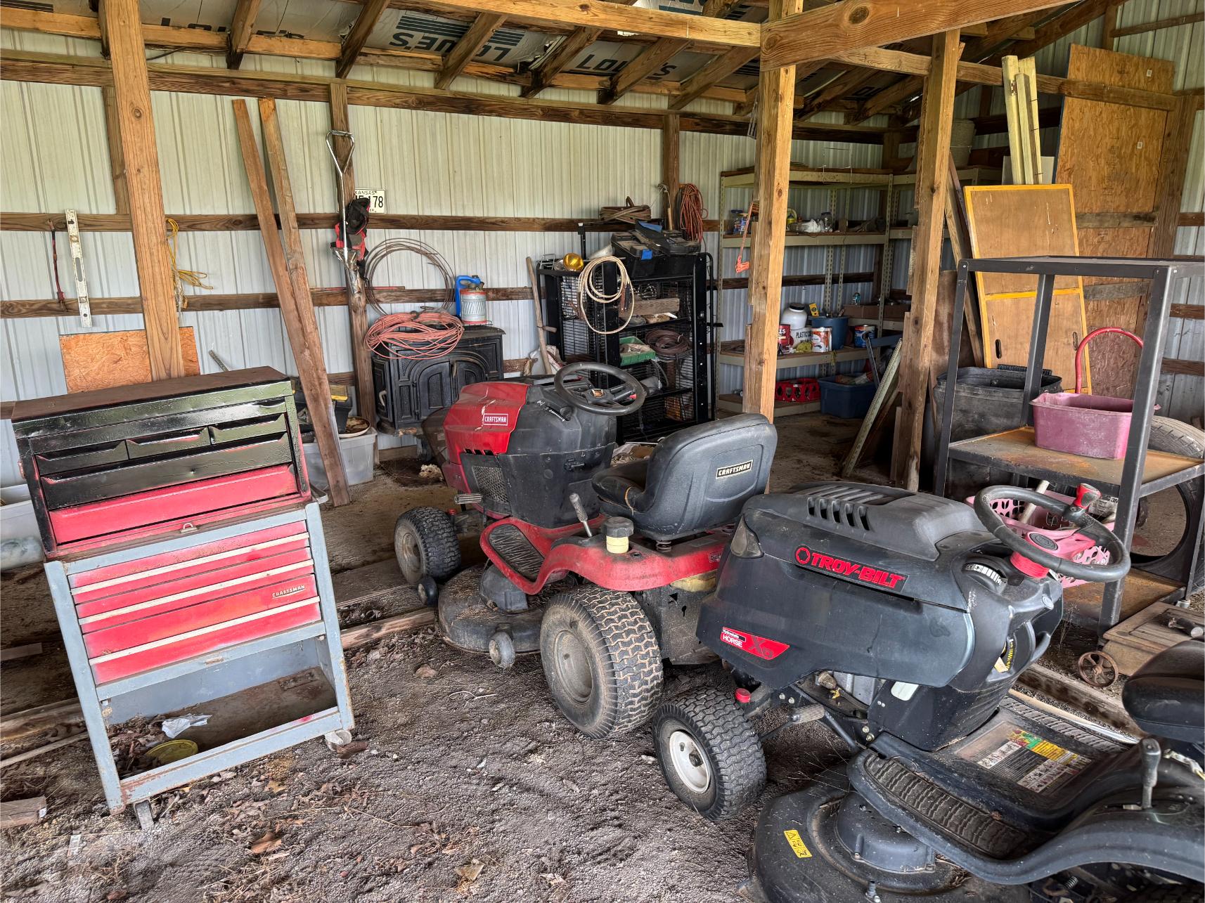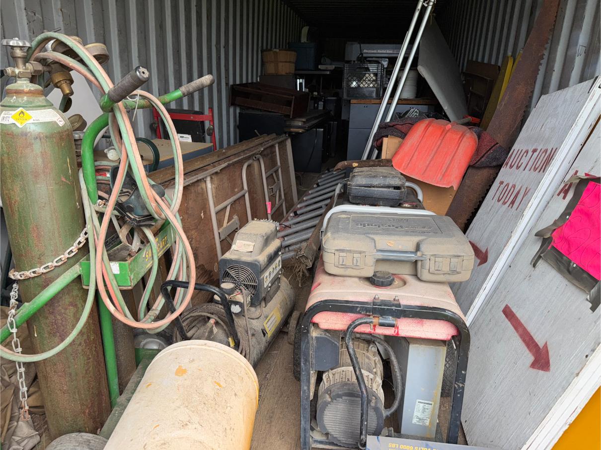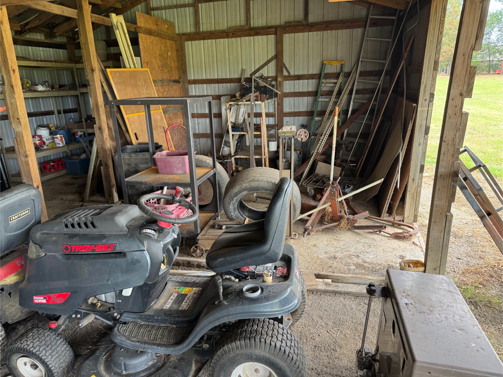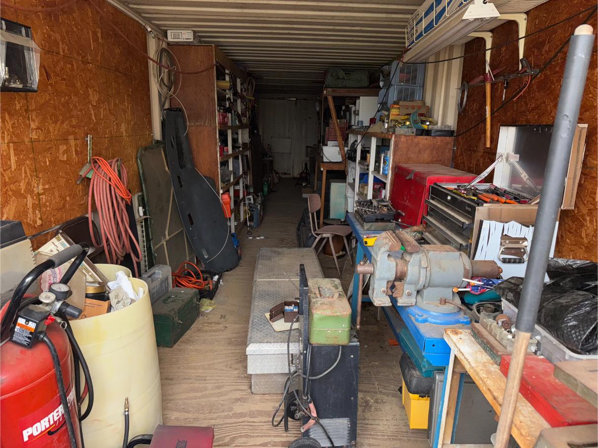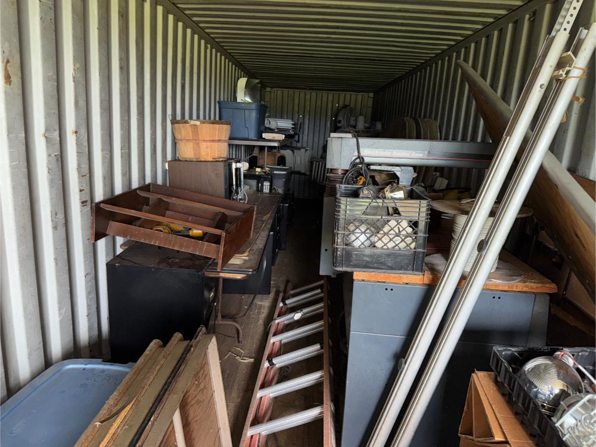 Shop Items & More:Â (2) 40′ Metal Shipping Containers – 16′ Portable Building on Trailer – Sheet Metal – Metal Pipe – Pipe Stand – Troy Bilt Riding Mower – Craftsman 46″ Riding Mower – 5,000 Watt Generator – Miller Welder – Acetylene Bottles, Torches & Cart – Platform Scales – Appx 15 Rolls of Barbed Wire – 100’s T-Posts – Galv Gates – Wire Panels – Romex Wire – Metal Ramps – Alum Ramps – (4) Job Boxes – Roll Around Toolboxes – Diamond Plate Toolboxes – 8,000 Winch – Engine Hoist – Miter Saw – Circular Saw – Craftsman Radial Arm Saw – Scaffolding – Shop Fan – (3) Buddy Heaters – Air Compressor – Drill Press – Bench Vise – Battery Charger – (3) 45 Watt Solar Panel Kits – Alum & Fiberglass Ext Ladders – Hand Tools – Bolt Bins- Dollys – Lumber – Metal Shelves – Propane Tank – Tires & Wheels – Metal Locker – Boat Seats – Security Lights – LED Lights – Camping Supplies – Hunting Clothes, Blinds