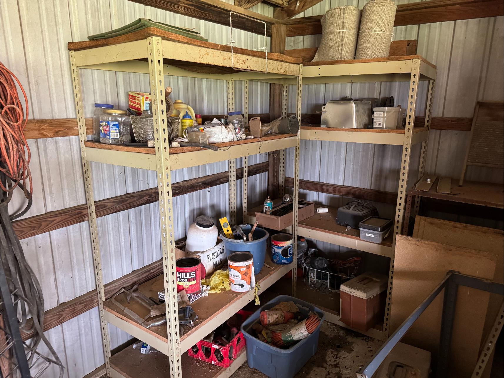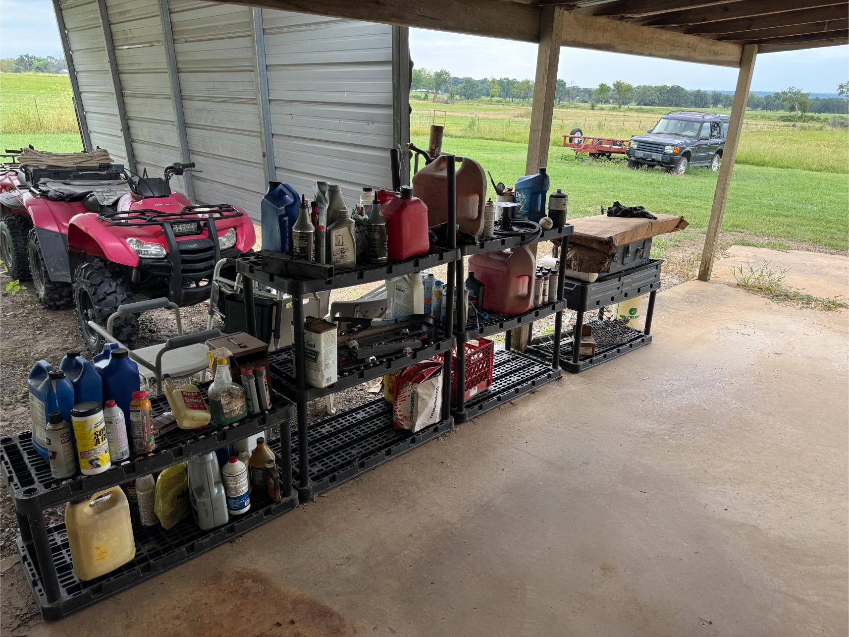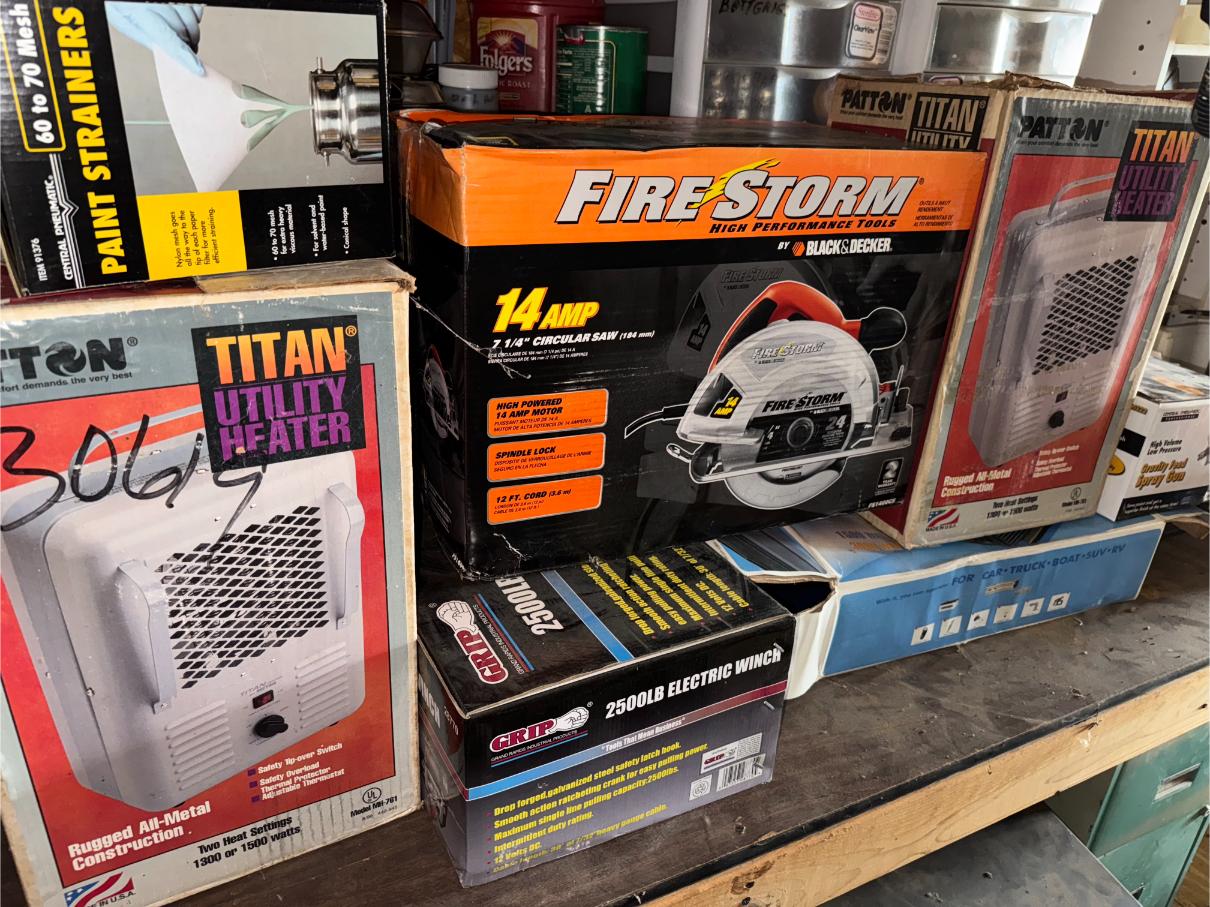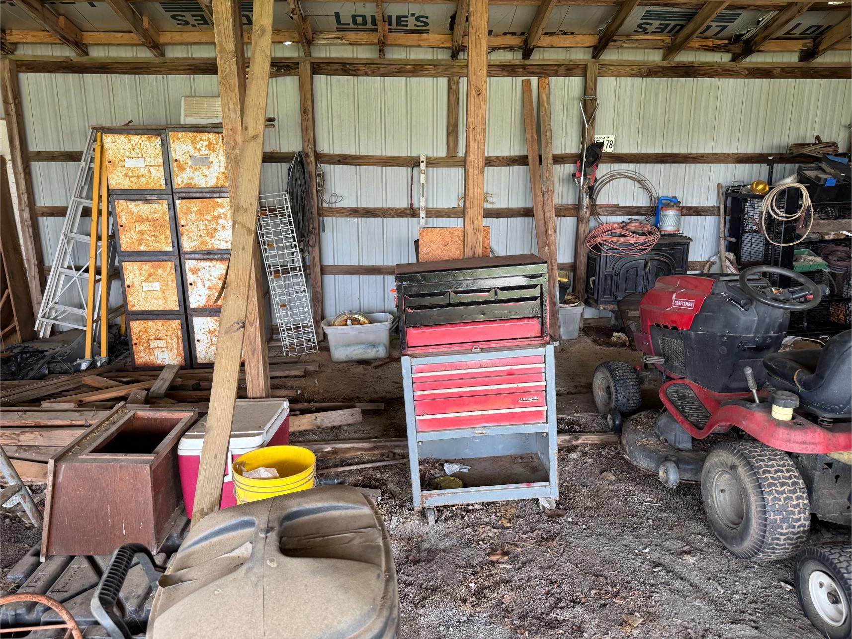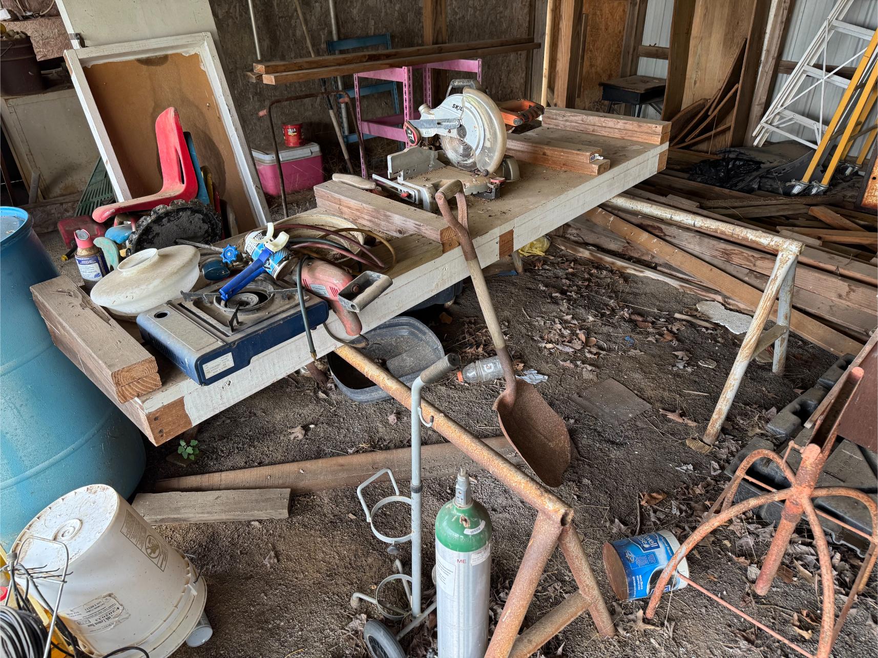 Shop Items & More:Â (2) 40′ Metal Shipping Containers – 16′ Portable Building on Trailer – Sheet Metal – Metal Pipe – Pipe Stand – Troy Bilt Riding Mower – Craftsman 46″ Riding Mower – 5,000 Watt Generator – Miller Welder – Acetylene Bottles, Torches & Cart – Platform Scales – Appx 15 Rolls of Barbed Wire – 100’s T-Posts – Galv Gates – Wire Panels – Romex Wire – Metal Ramps – Alum Ramps – (4) Job Boxes – Roll Around Toolboxes – Diamond Plate Toolboxes – 8,000 Winch – Engine Hoist – Miter Saw – Circular Saw – Craftsman Radial Arm Saw – Scaffolding – Shop Fan – (3) Buddy Heaters – Air Compressor – Drill Press – Bench Vise – Battery Charger – (3) 45 Watt Solar Panel Kits – Alum & Fiberglass Ext Ladders – Hand Tools – Bolt Bins- Dollys – Lumber – Metal Shelves – Propane Tank – Tires & Wheels – Metal Locker – Boat Seats – Security Lights – LED Lights – Camping Supplies – Hunting Clothes, Blinds