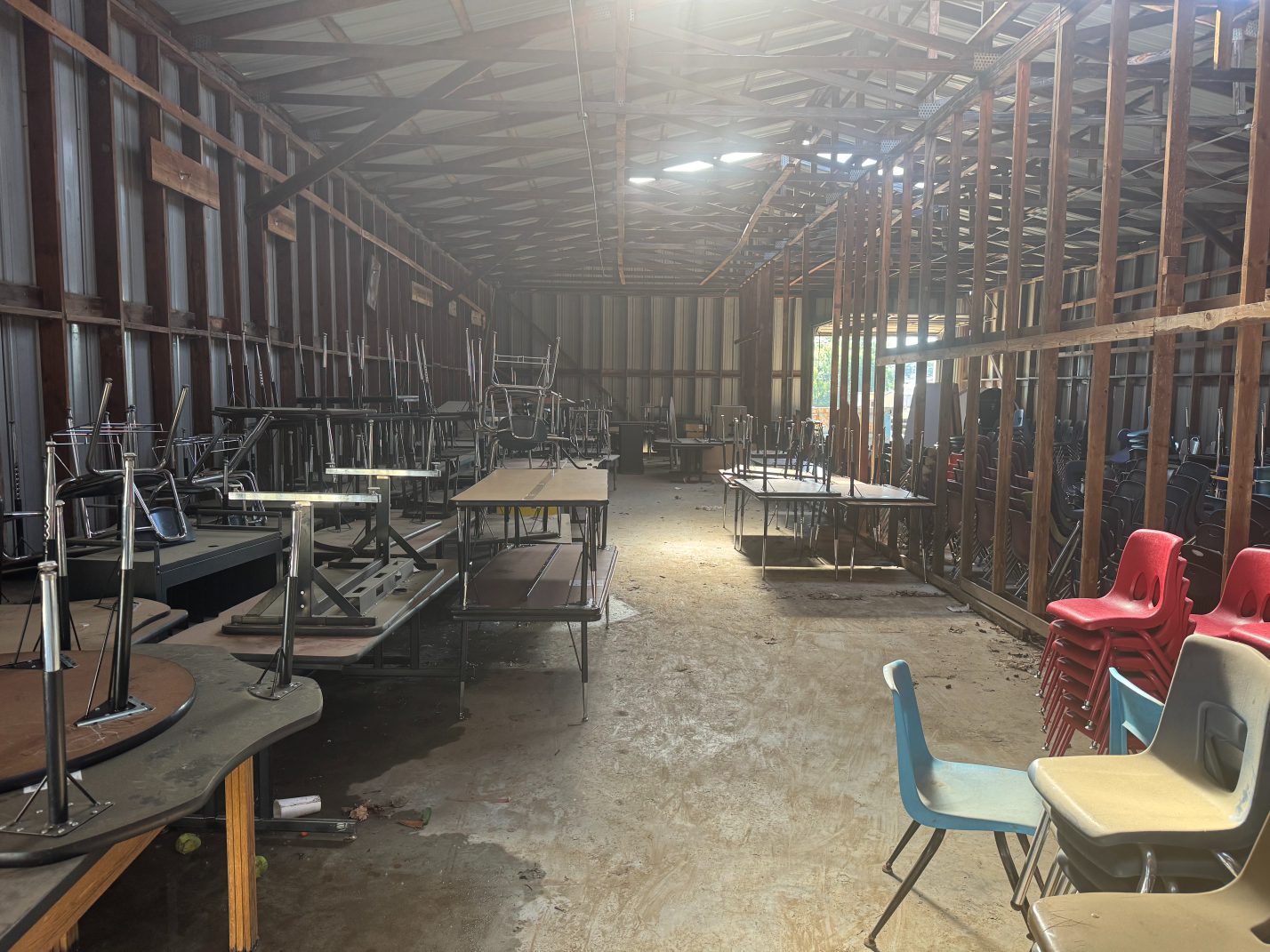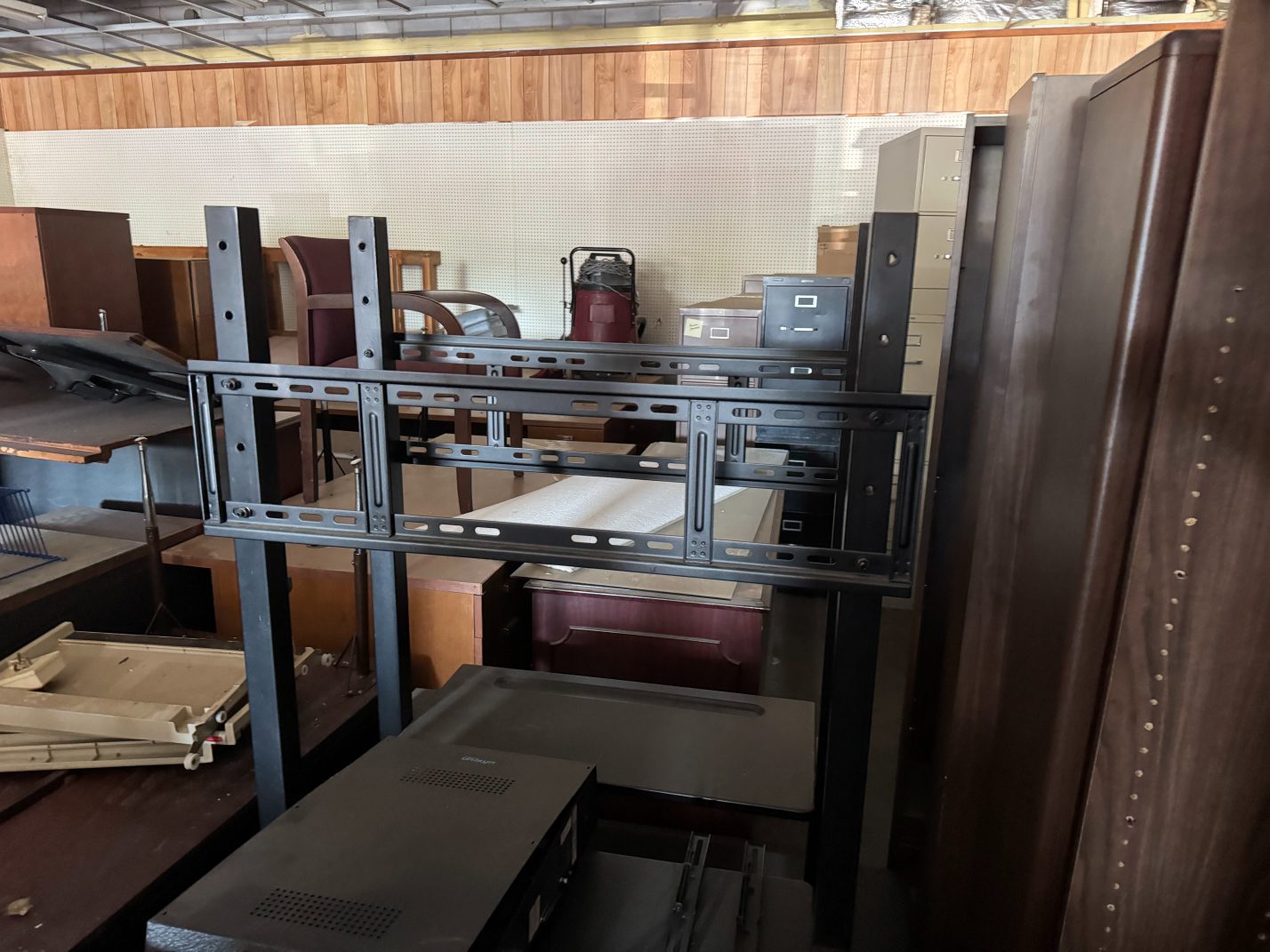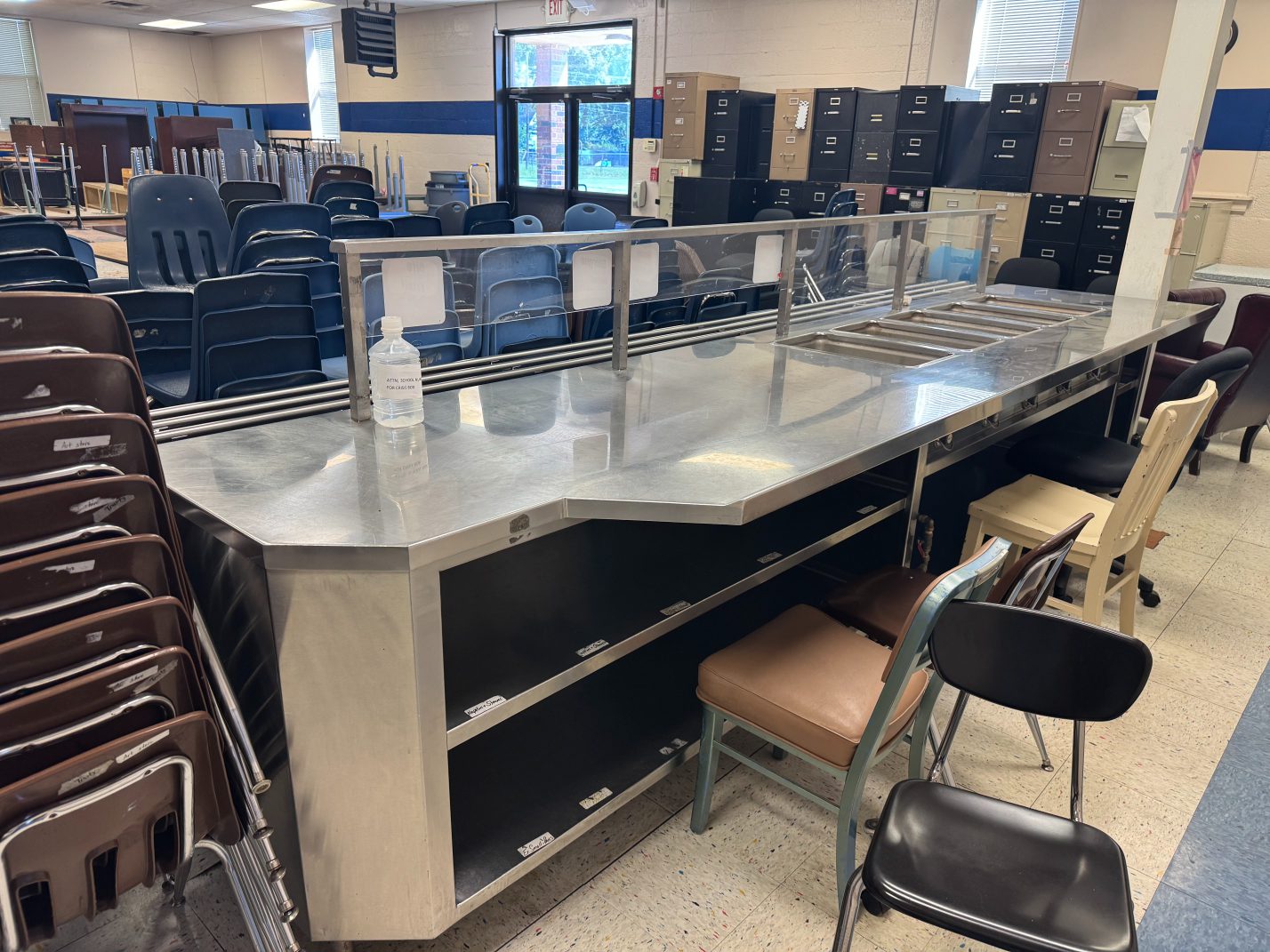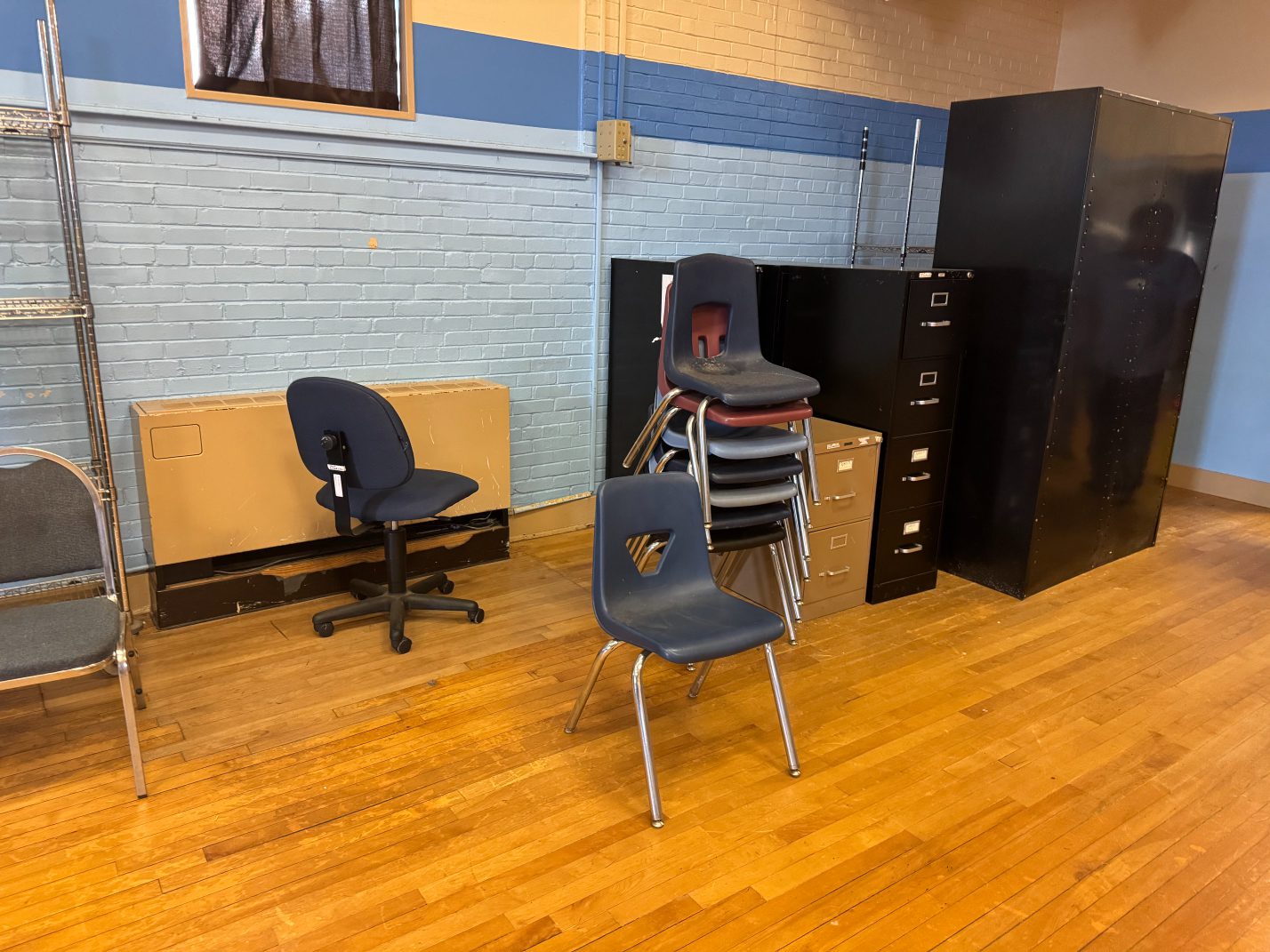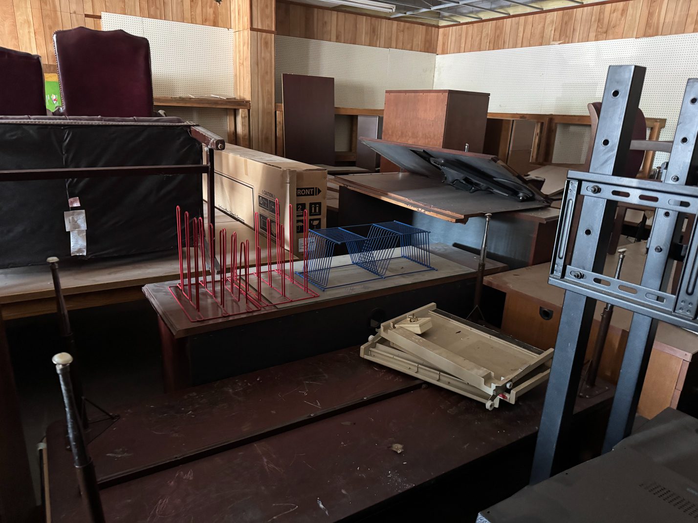 12′ Buffet Bar – True SS 2-Door Refrigerator – (2) USA Range 6-Burner Gas Stoves – 3-Vat SS Sink – SS Dishwashing Table w/Disposal – SS Table w/Pot Rack & Can Opener – SS Tables – Cafeteria Tables – Desks – Chairs – Metal Shelves – Electronics (Computers, Printers, Projectors) – Metal & Rubbermaid Cabinets – File Cabinets – Roll Around Shelves – Portable Stairs – Tables